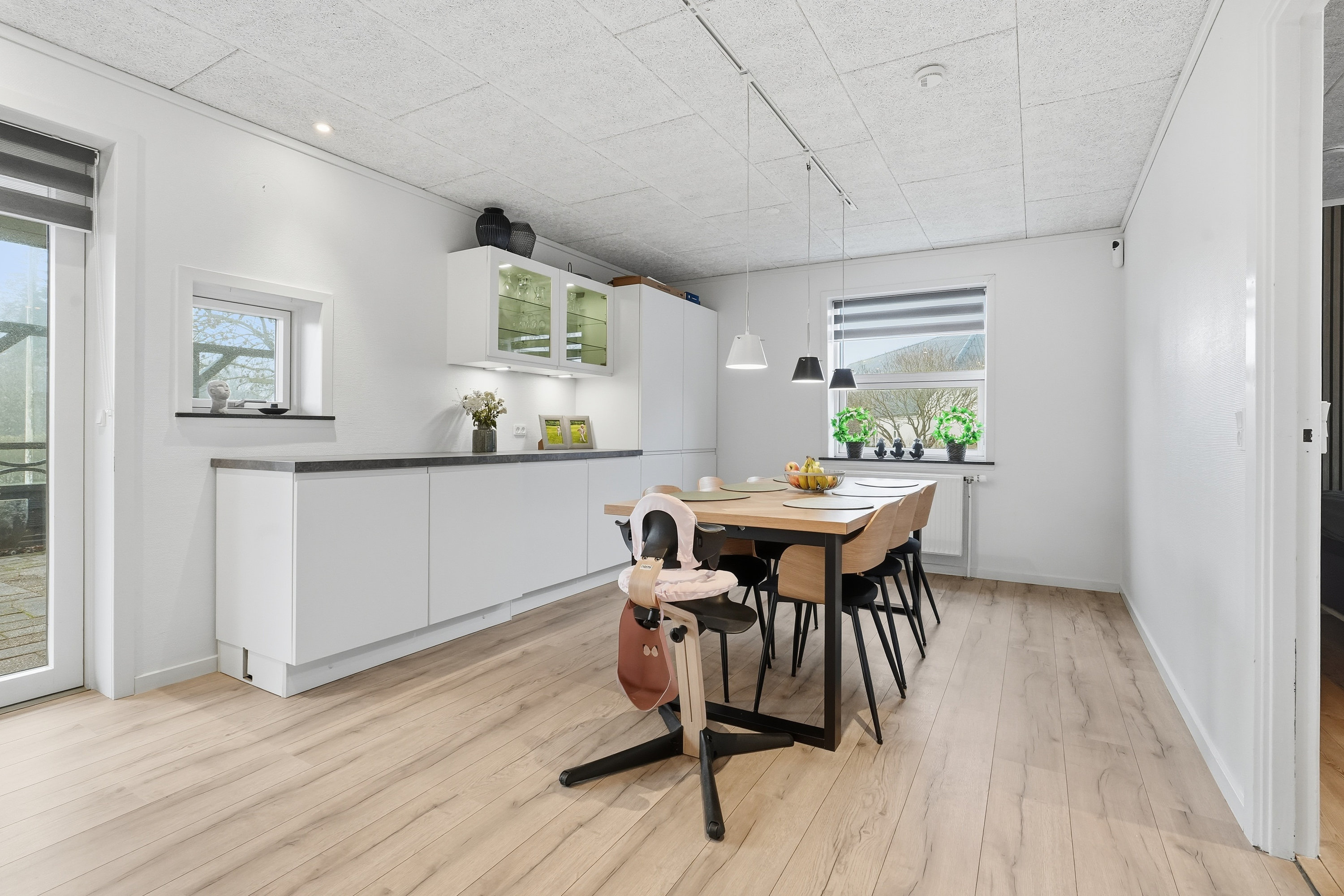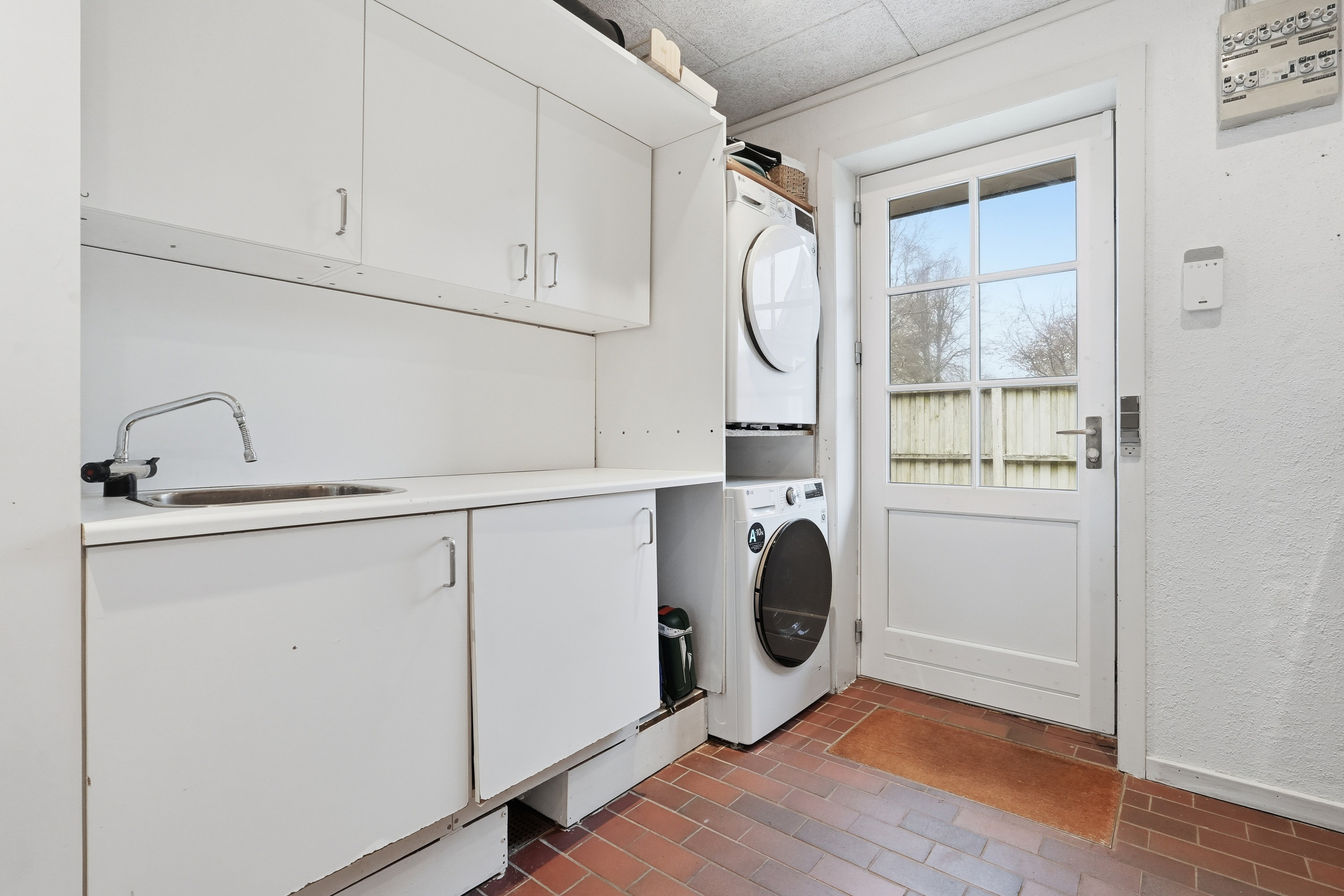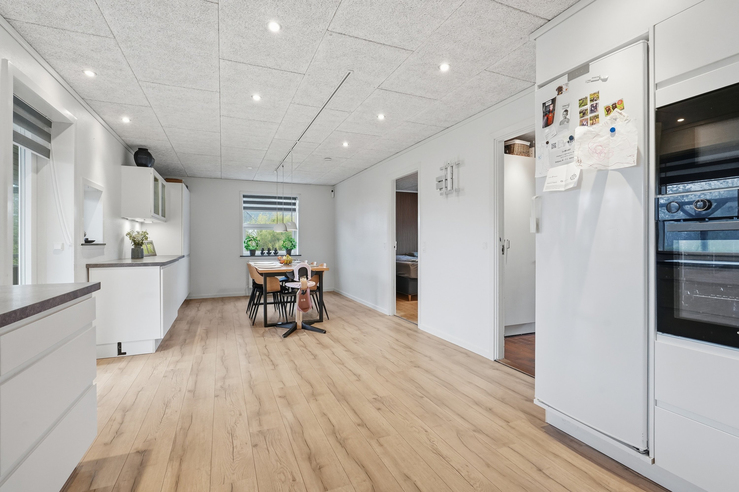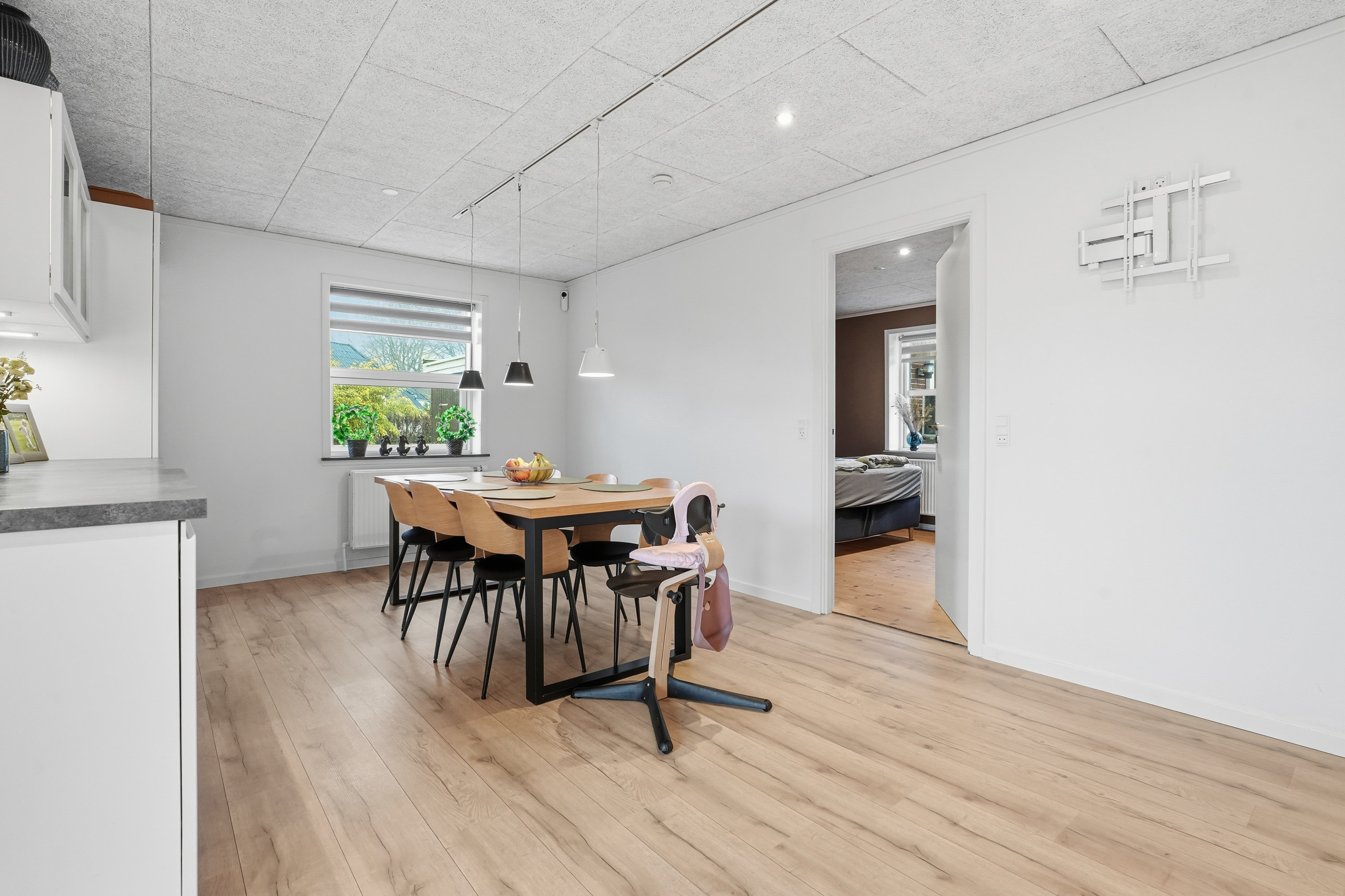 Indenfor træder du ind i et praktisk bryggers, som fungerer som den naturlige hverdagsentré med god plads til opbevaring. Herfra finder man også et godt badeværelse, som er velholdt i original stand. Villaens ”hjerterum” er uden tvivl det åbne køkken/alrum, som er udstyret med moderne troldtektlofter og plads til at hele familien kan samles. Herfra har du direkte udgang til den solrige terrasse, hvilket giver en glidende overgang mellem inde- og udeliv. Fra alrummet er der ligeledes et stort og rummeligt soveværelse. En god afdeling afskærmet fra resten af hjemmet.