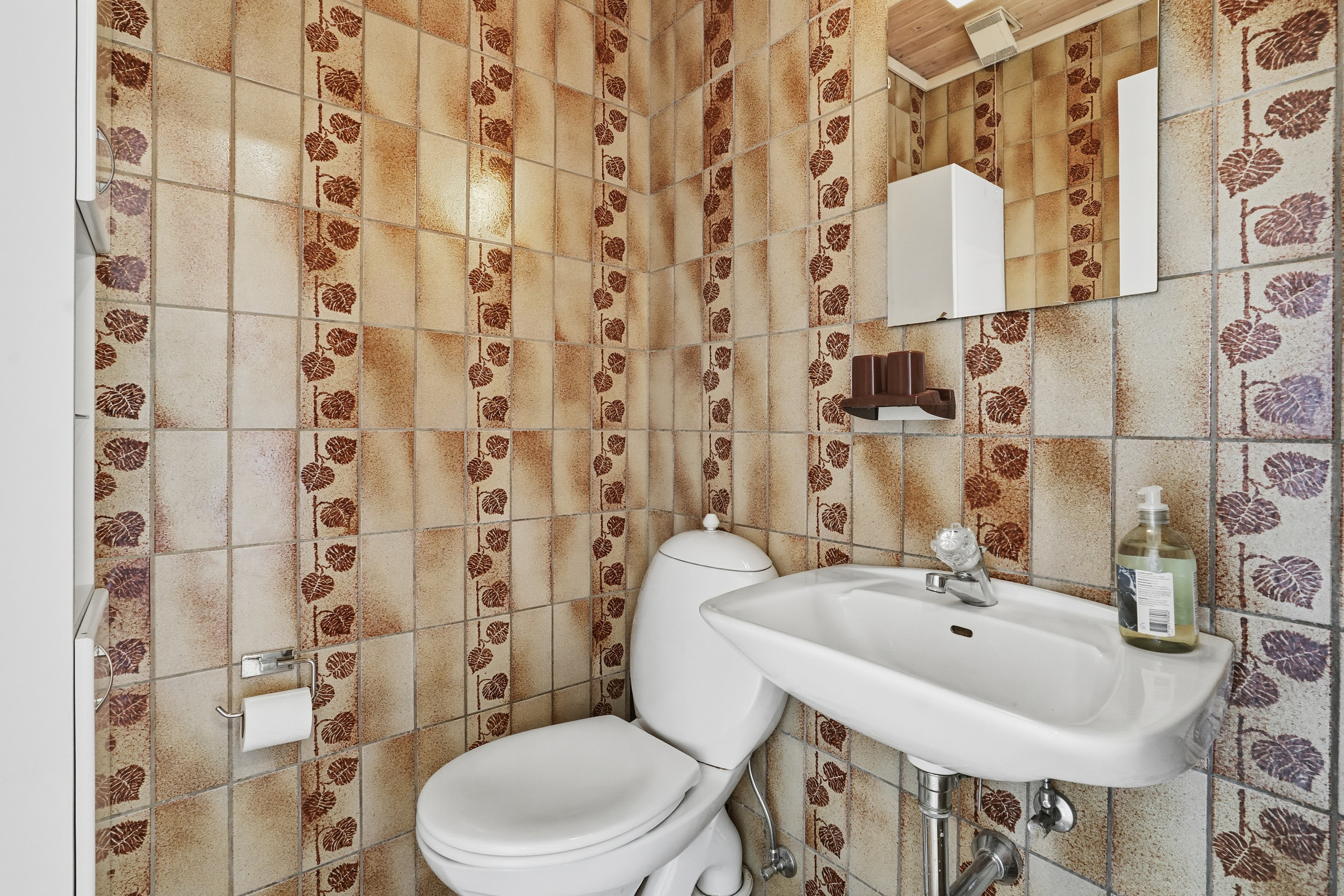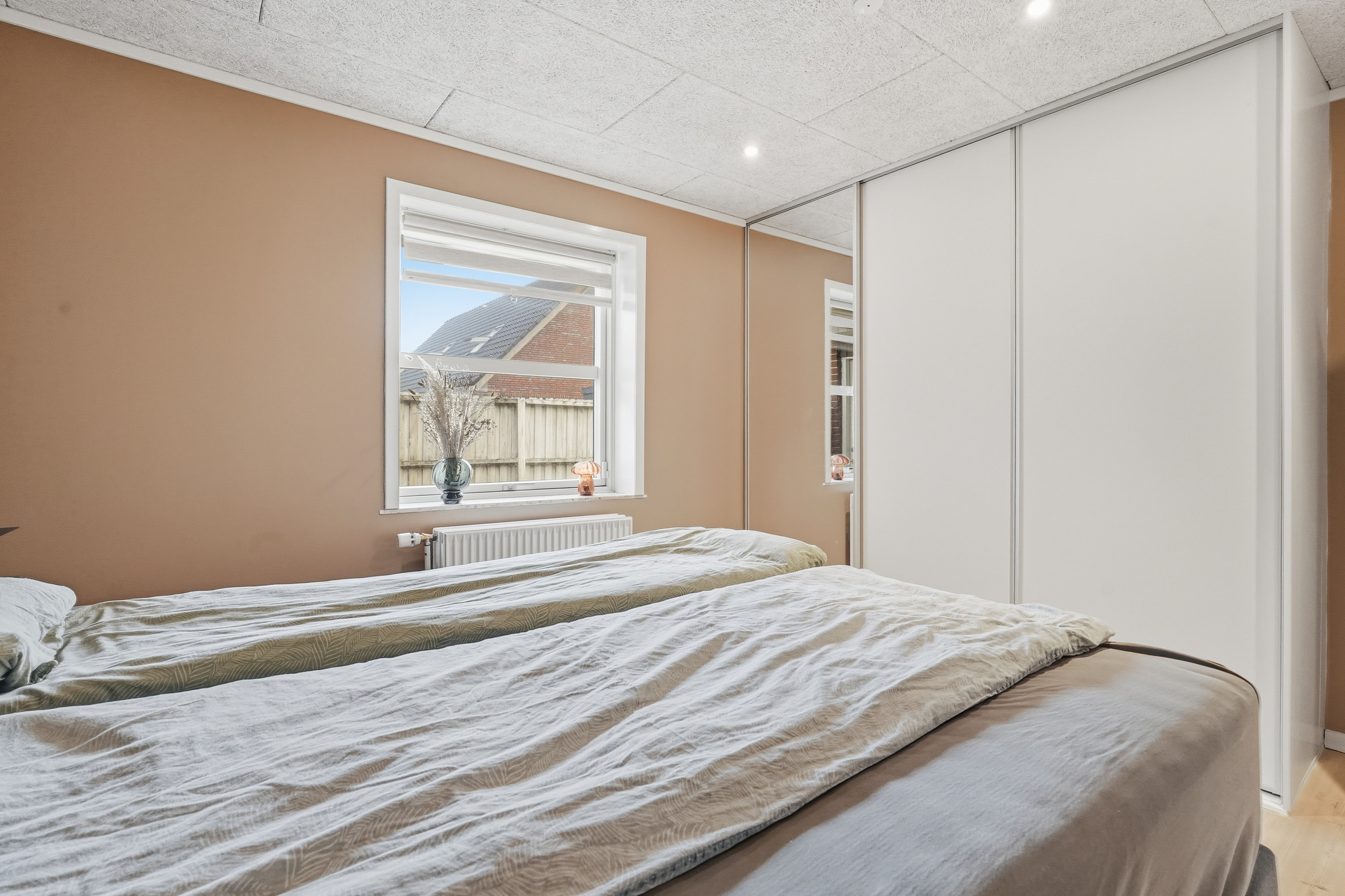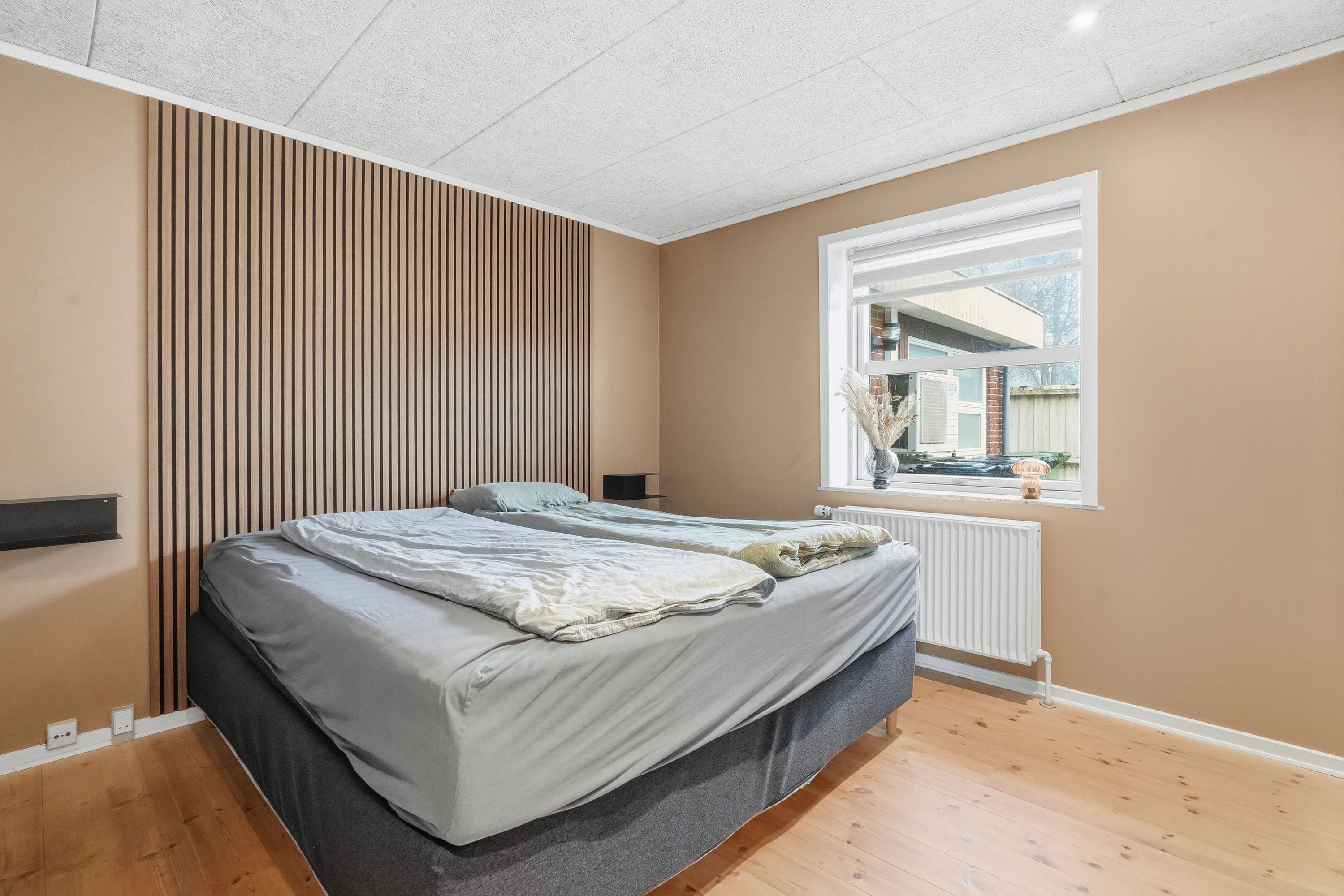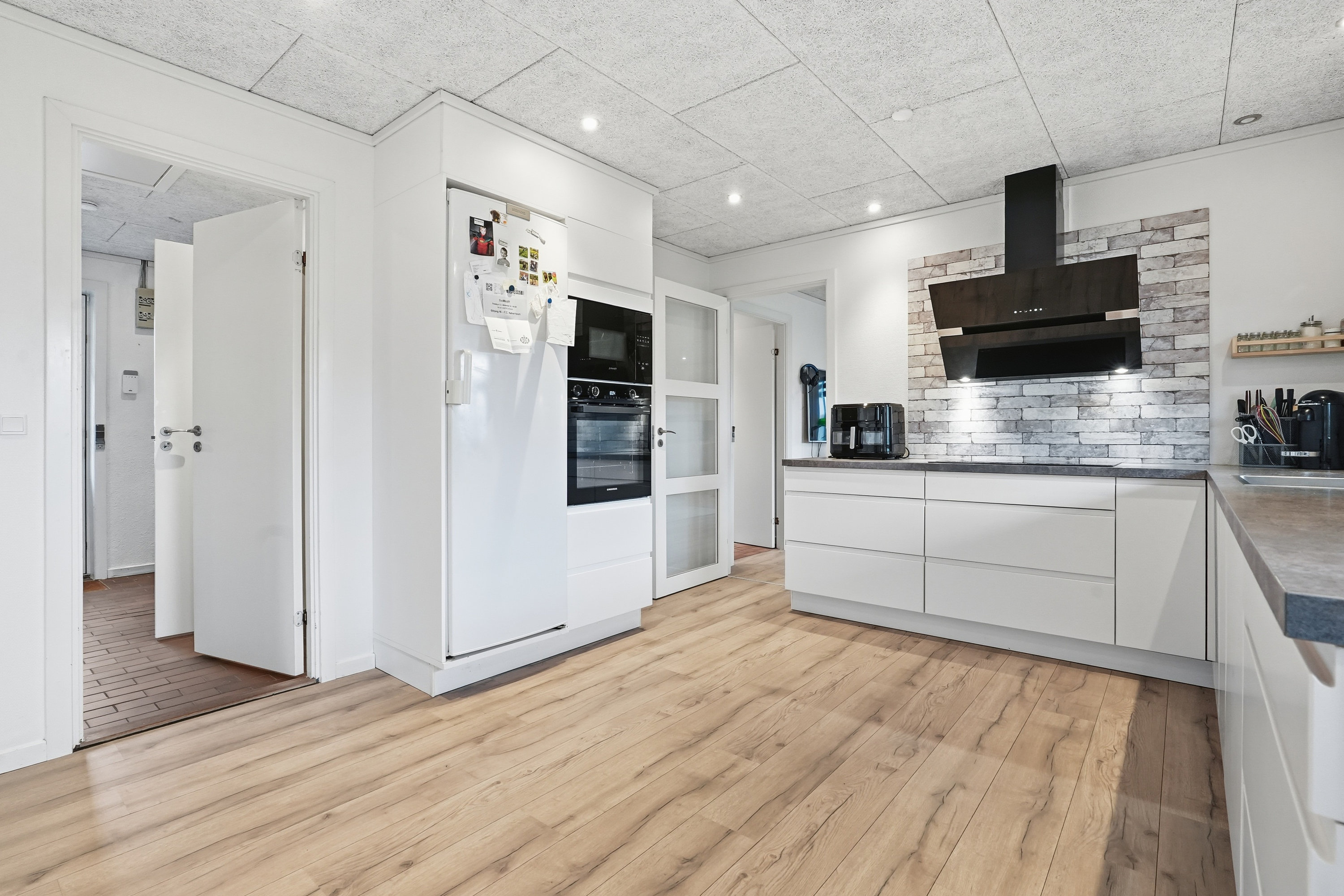 Indenfor træder du ind i et praktisk bryggers, som fungerer som den naturlige hverdagsentré med god plads til opbevaring. Herfra finder man også et godt badeværelse, som er velholdt i original stand. Villaens ”hjerterum” er uden tvivl det åbne køkken/alrum, som er udstyret med moderne troldtektlofter og plads til at hele familien kan samles. Herfra har du direkte udgang til den solrige terrasse, hvilket giver en glidende overgang mellem inde- og udeliv. Fra alrummet er der ligeledes et stort og rummeligt soveværelse. En god afdeling afskærmet fra resten af hjemmet.