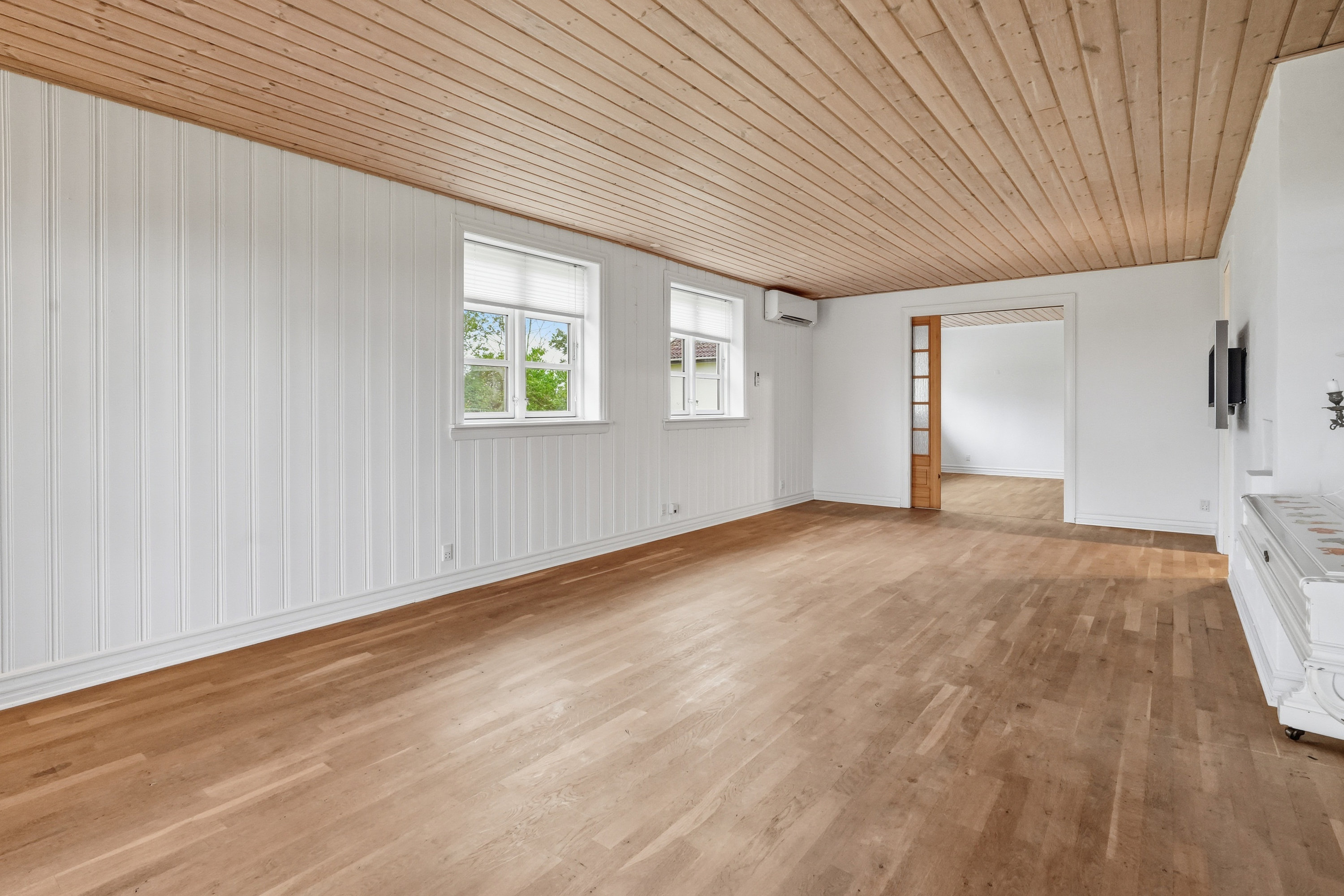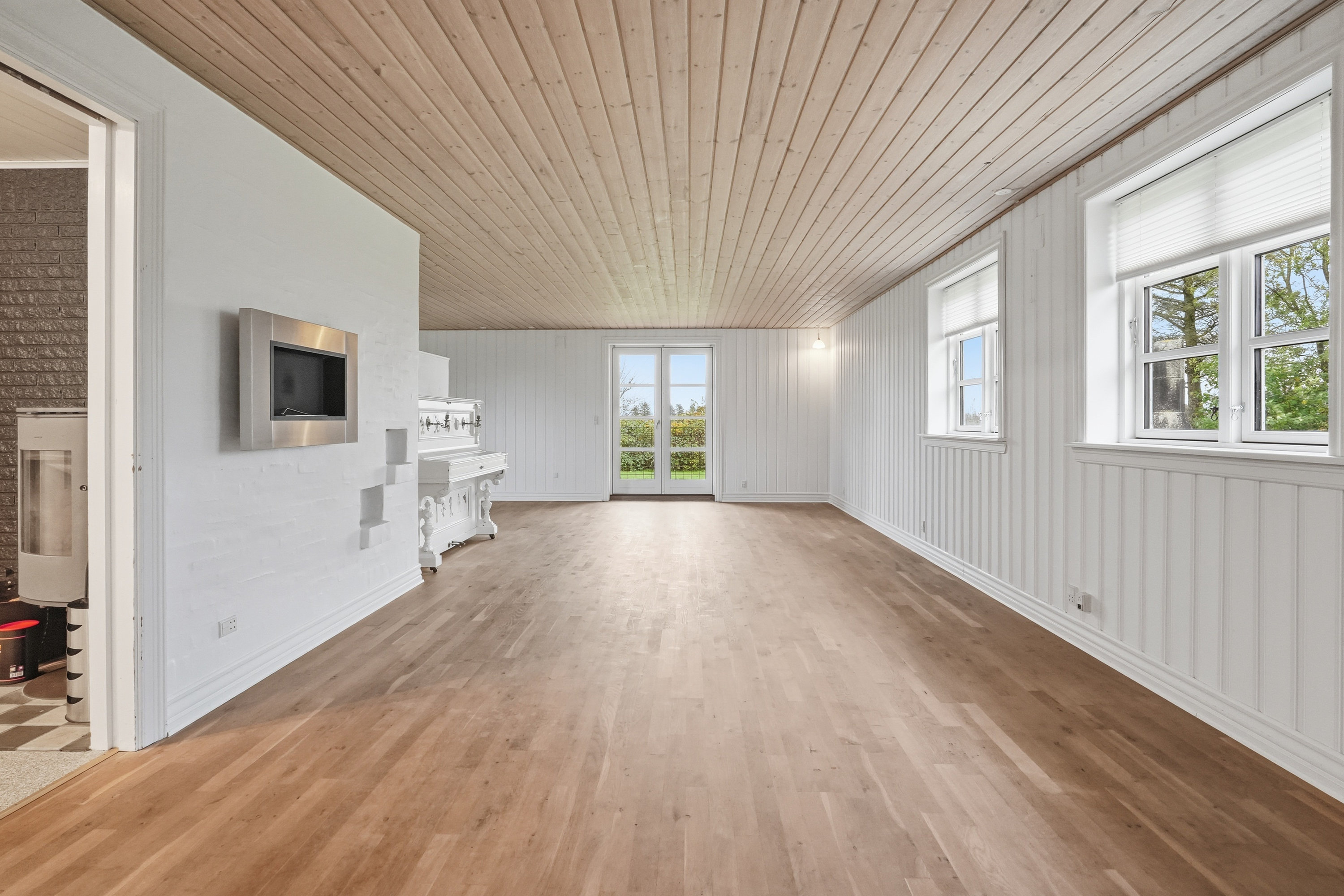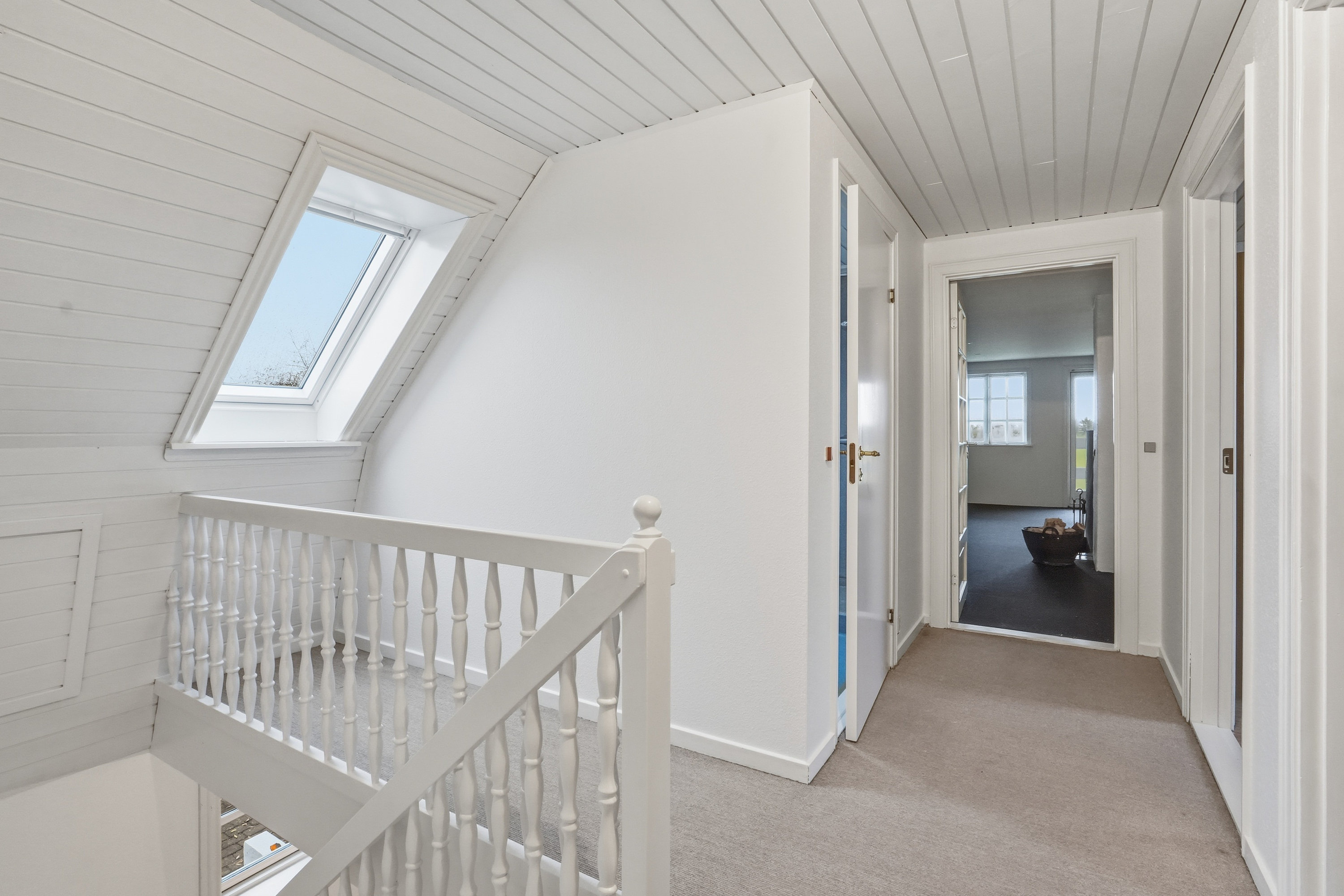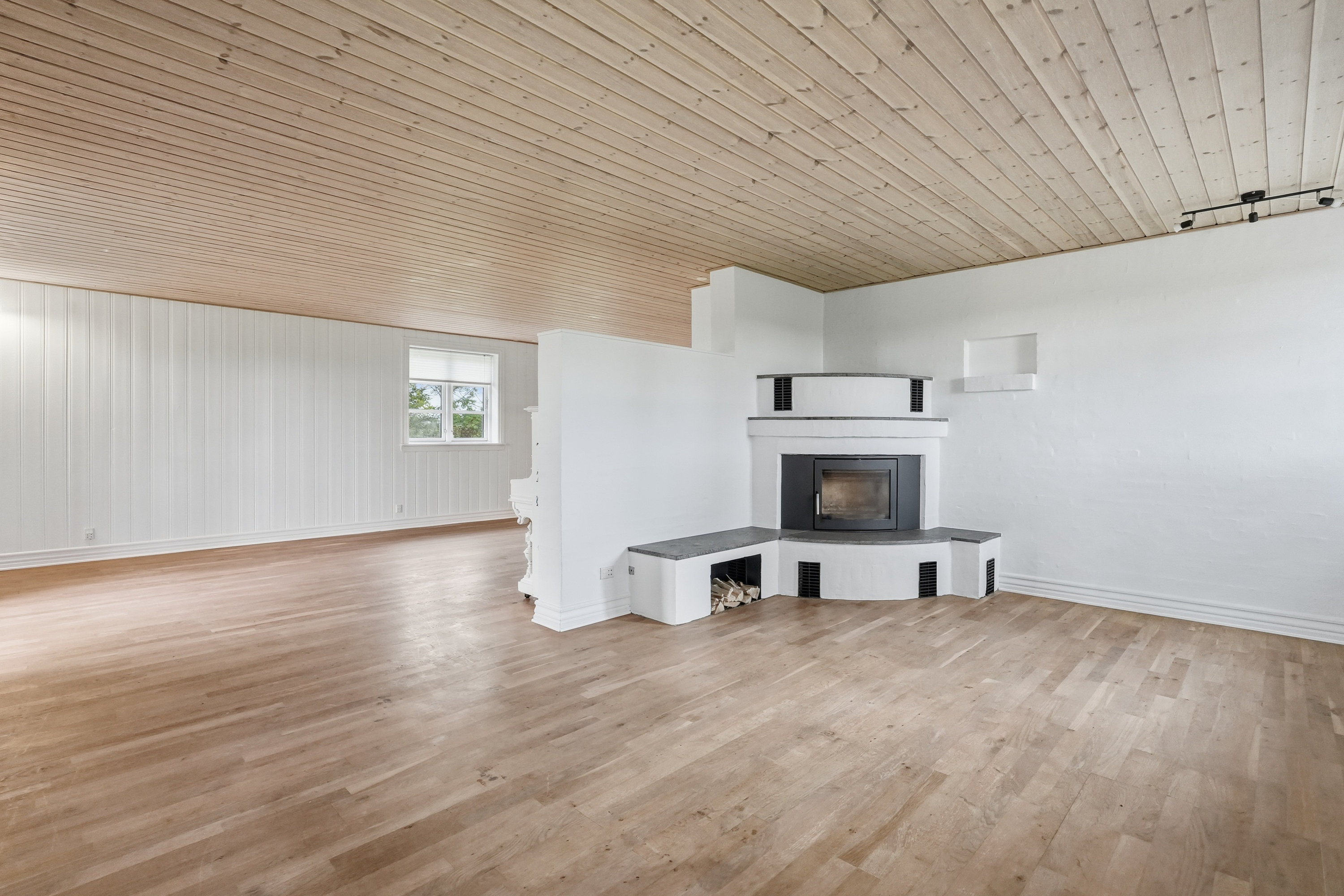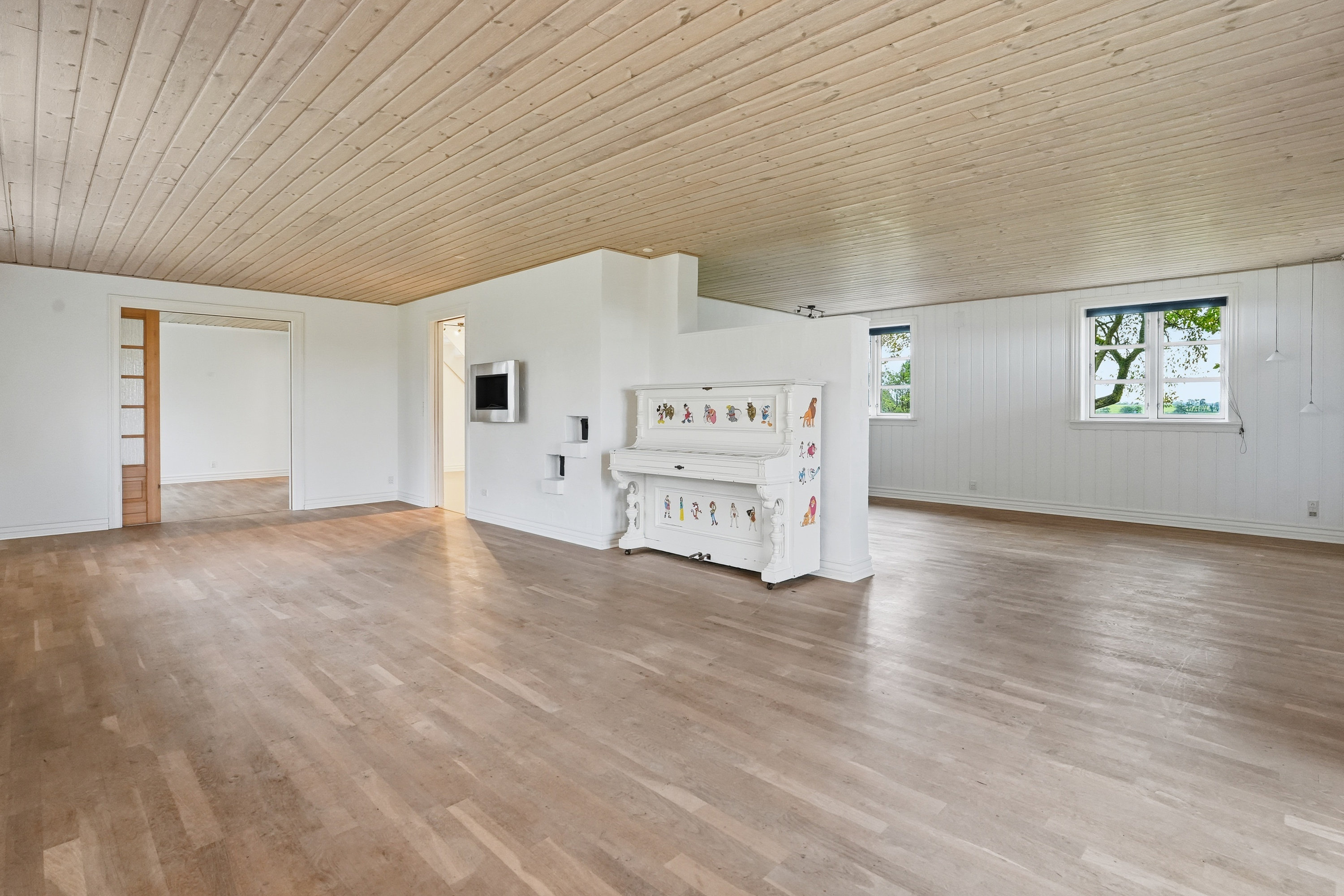 På førstesalen finder man hele fire værelser – tre børneværelser og et soveværelse – samt et lyst badeværelse med bruseniche. Dertil kommer en stor opholdsstue eller aktivitetsrum, der giver plads til leg, lektier eller afslapning – oplagt som teenagerafdeling eller til festlige sammenkomster.