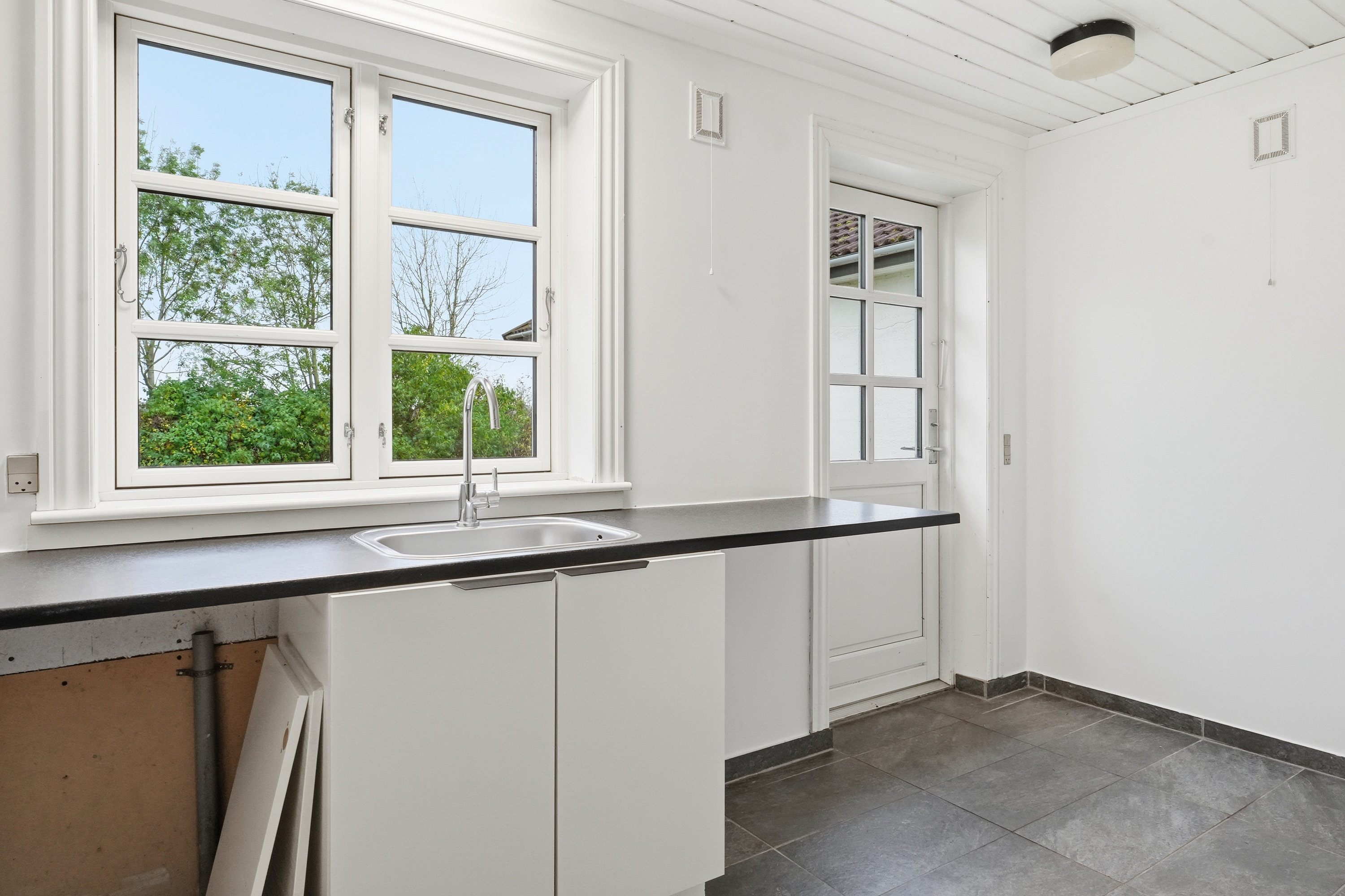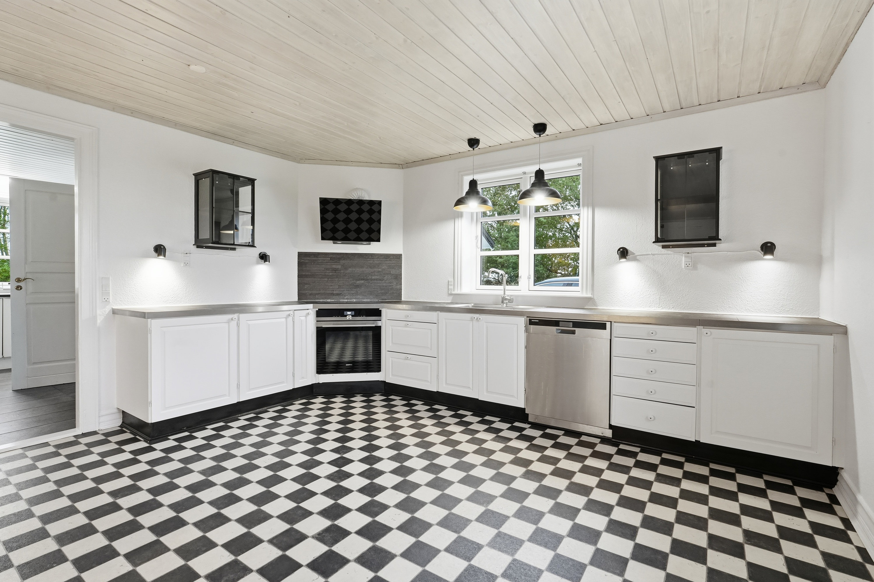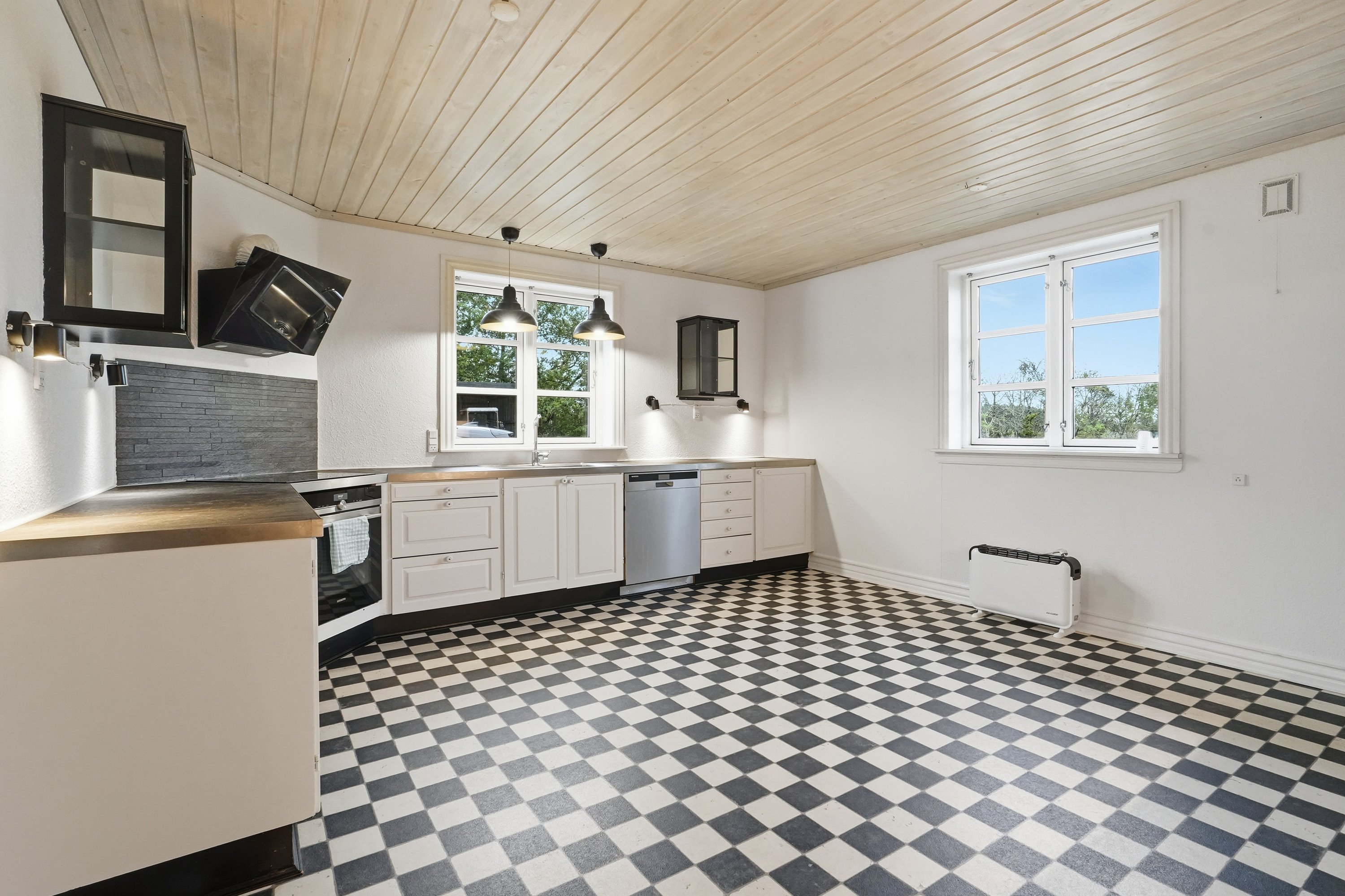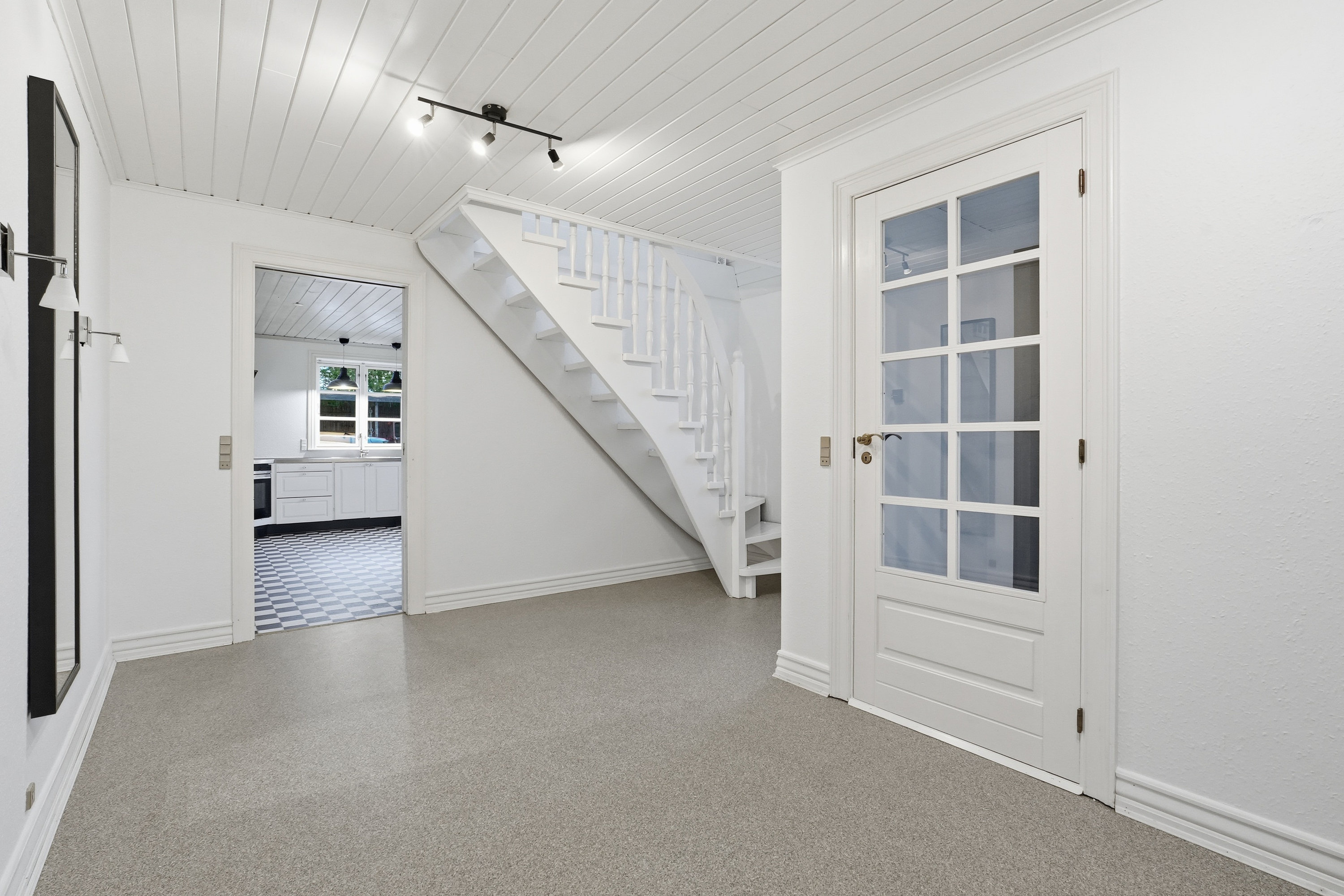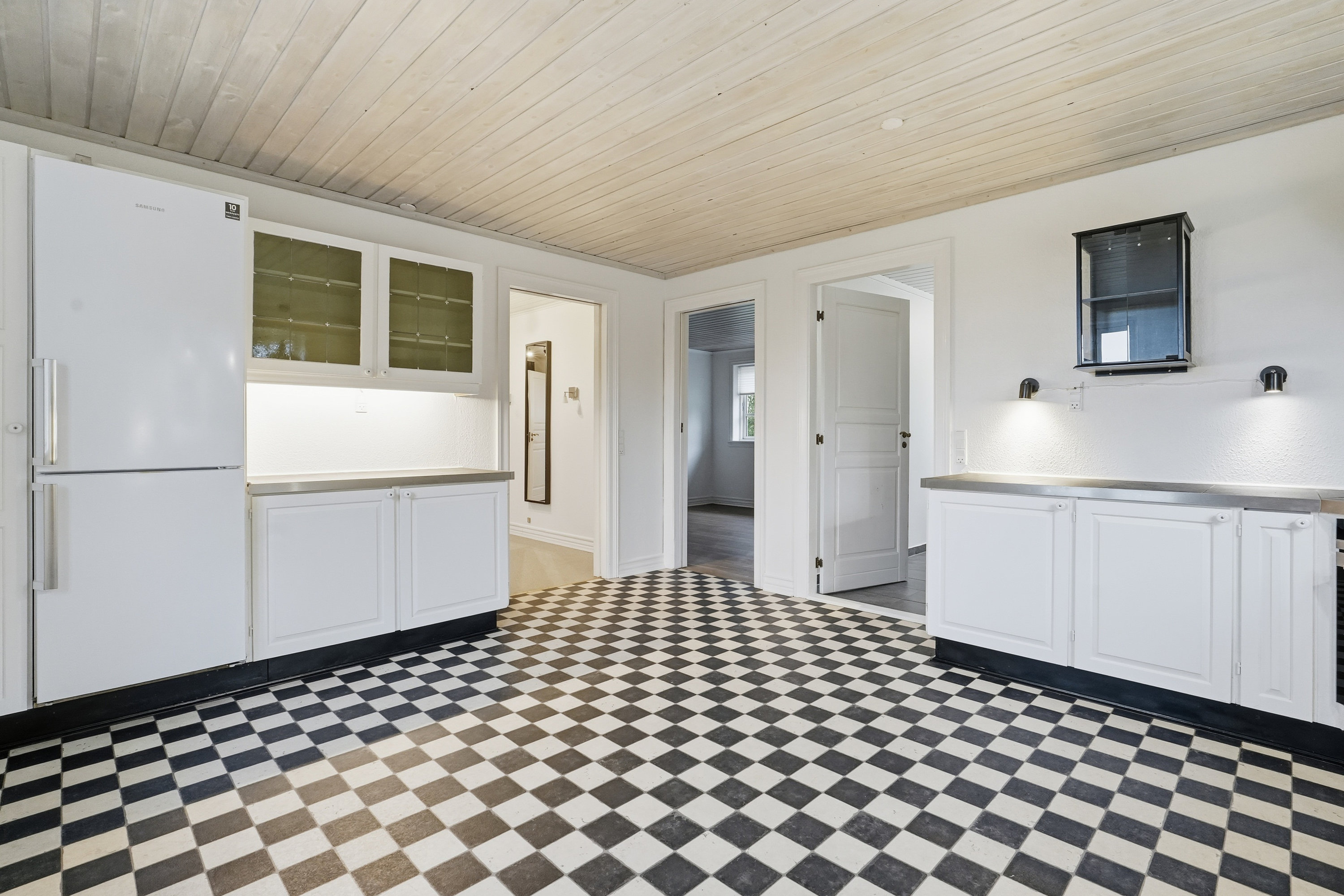 Villaen byder på en god og funktionel planløsning uden spildplads. Indvendigt finder man et rummeligt bryggers, med plads til opbevaring og hverdagens gøremål. Herfra er der adgang til et disponibelt rum/viktualierum, som giver ekstra opbevaringsmuligheder. Køkkenet fremstår lyst og tidløst med god bordplads og mange skabe – og fra vinduerne kan du nyde udsigten til gårdspladsen og det åbne landskab.