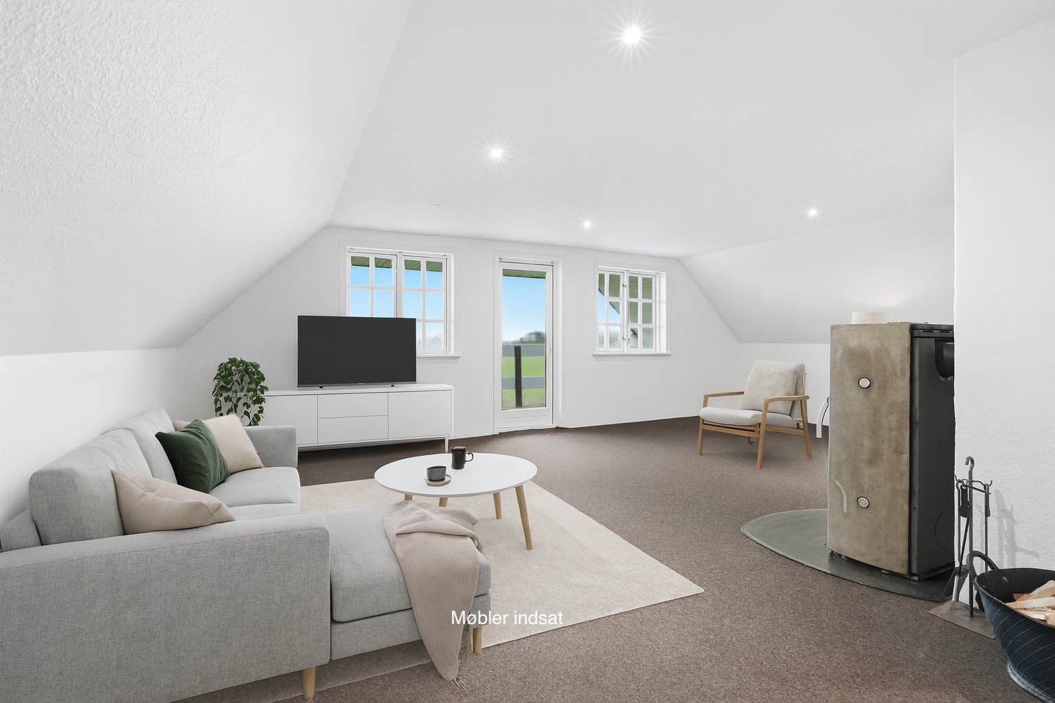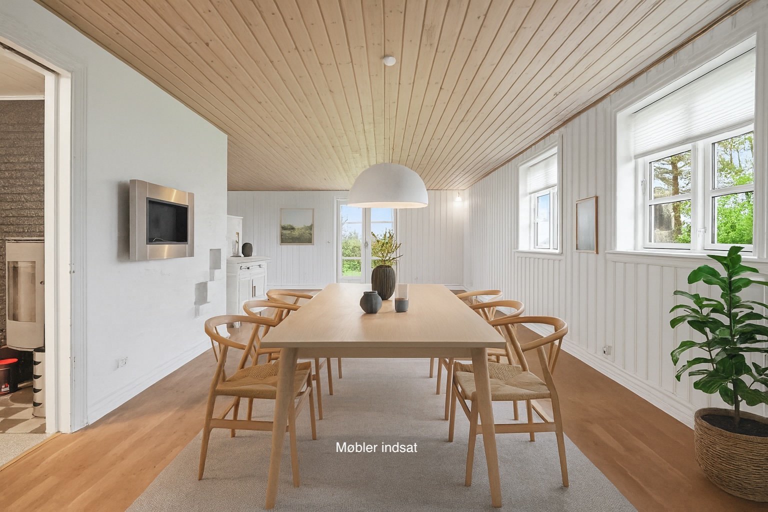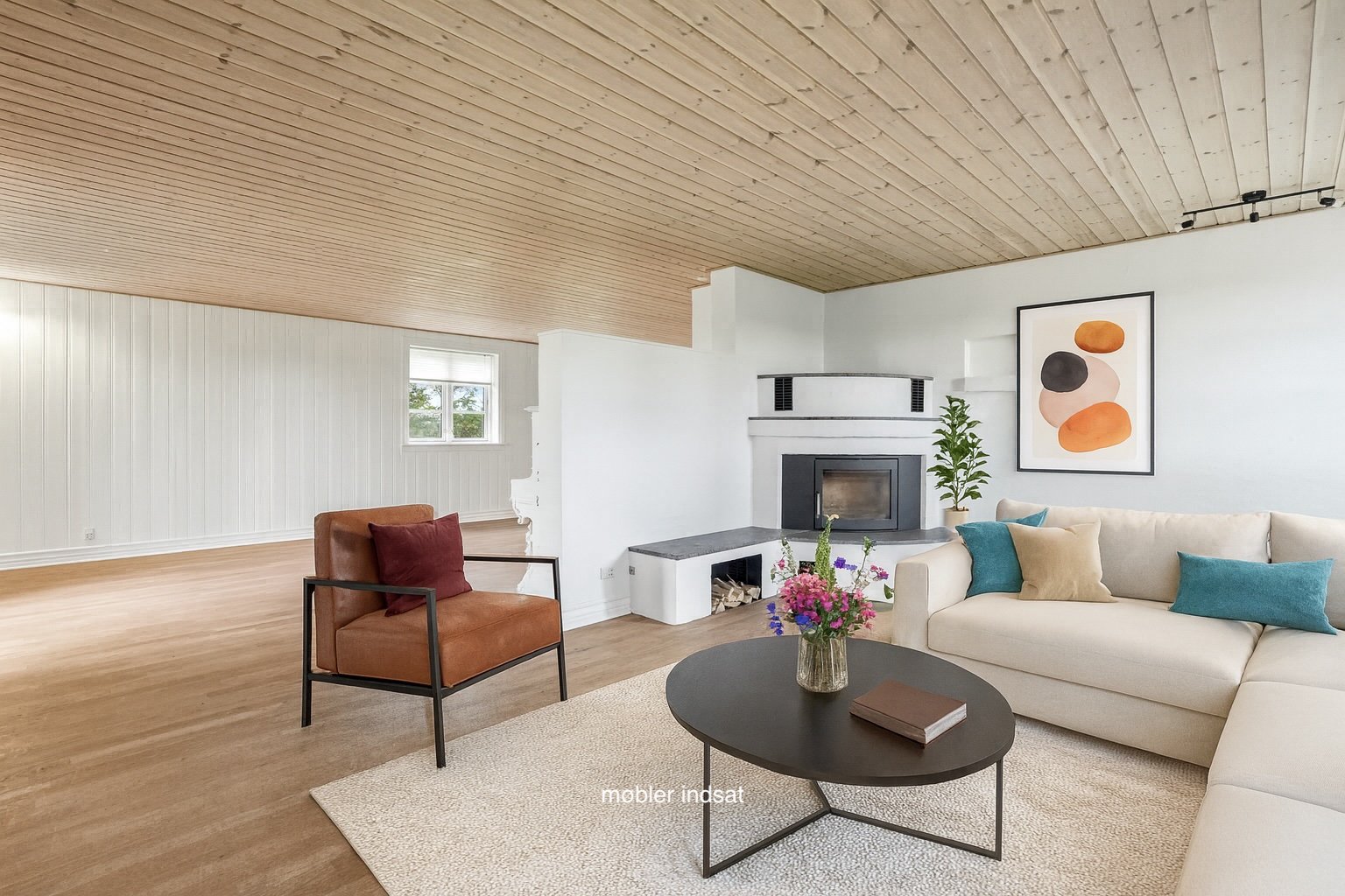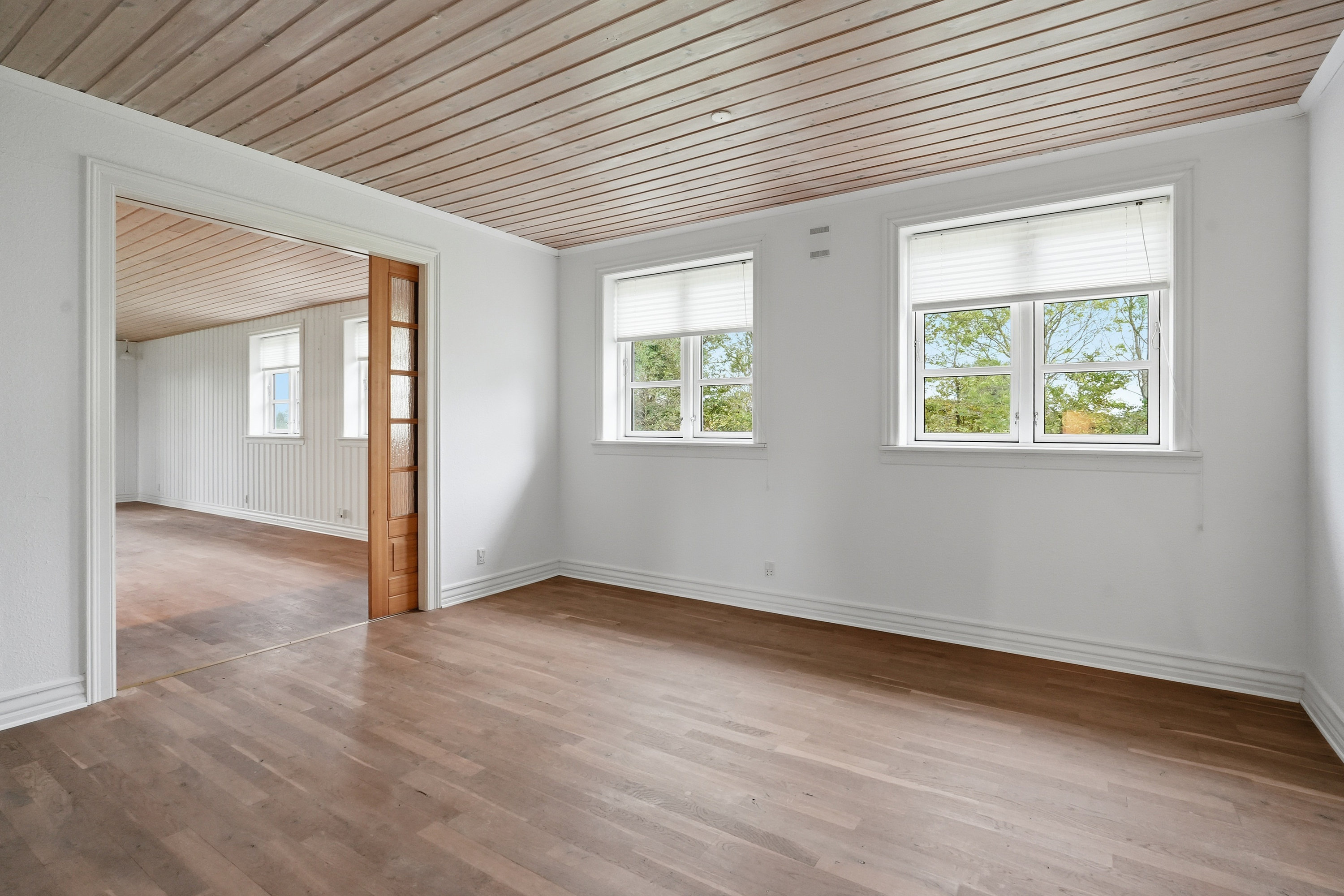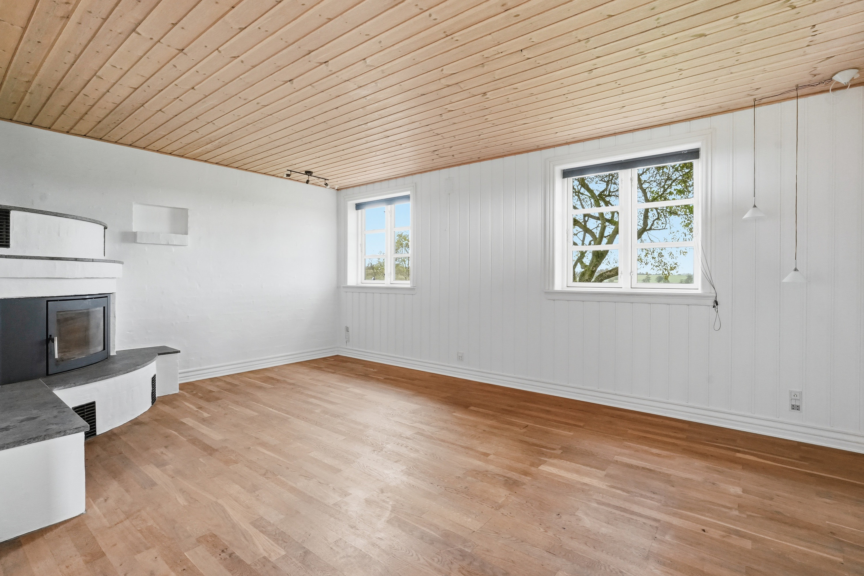 I åben forbindelse til køkkenet ligger en af husets to stuer, der oplagt kan anvendes som alrum eller spisestue. Videre fungerer den store opholdsstue som boligens naturlige samlingspunkt og emmer af en behagelig og varm atmosfære, hvor man straks føler sig hjemme. Her er udgang til terrassen og haven, og brændeovnen spreder både varme og hyggelig stemning i vintermånederne. I stueplan finder man ydermere et rummeligt opholdsrum med gæstetoilet og trappen til førstesalen.