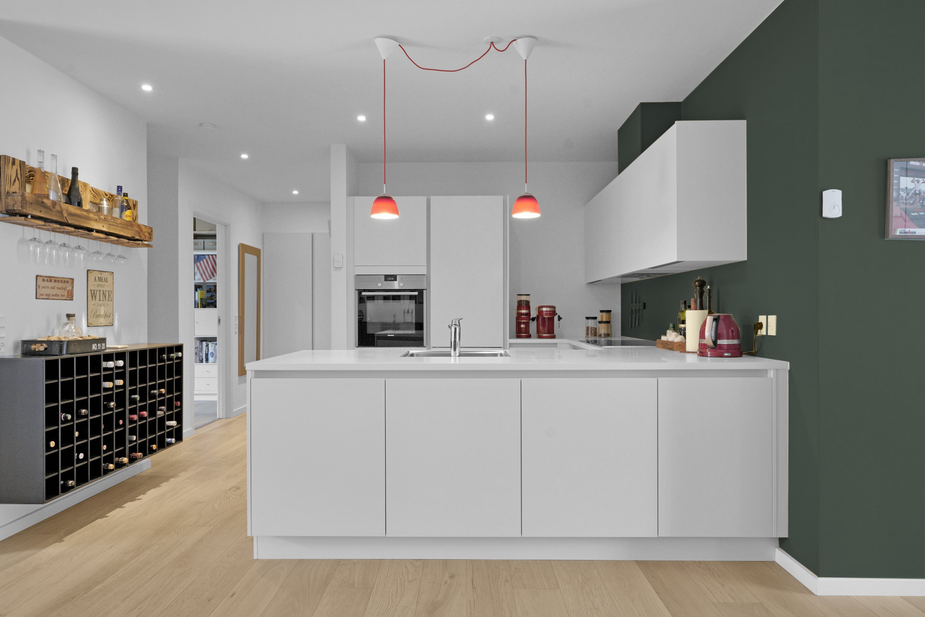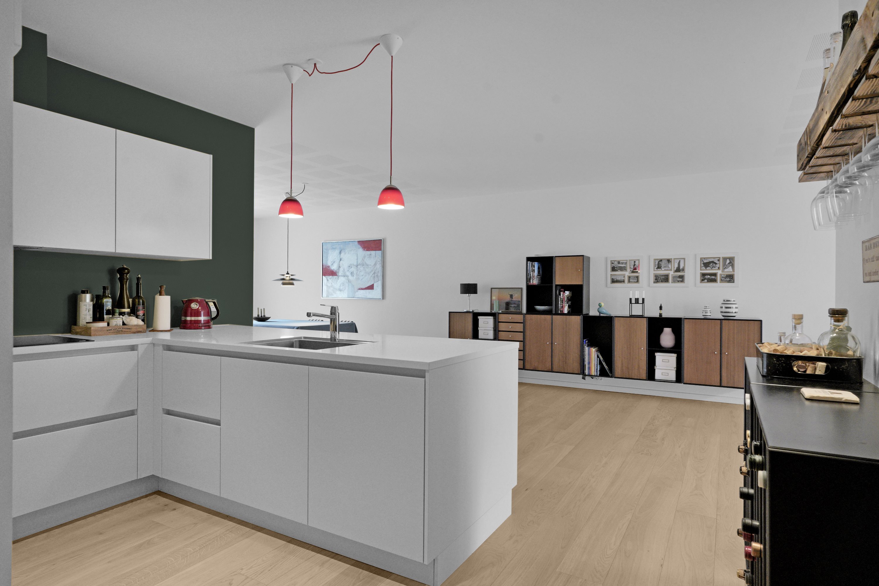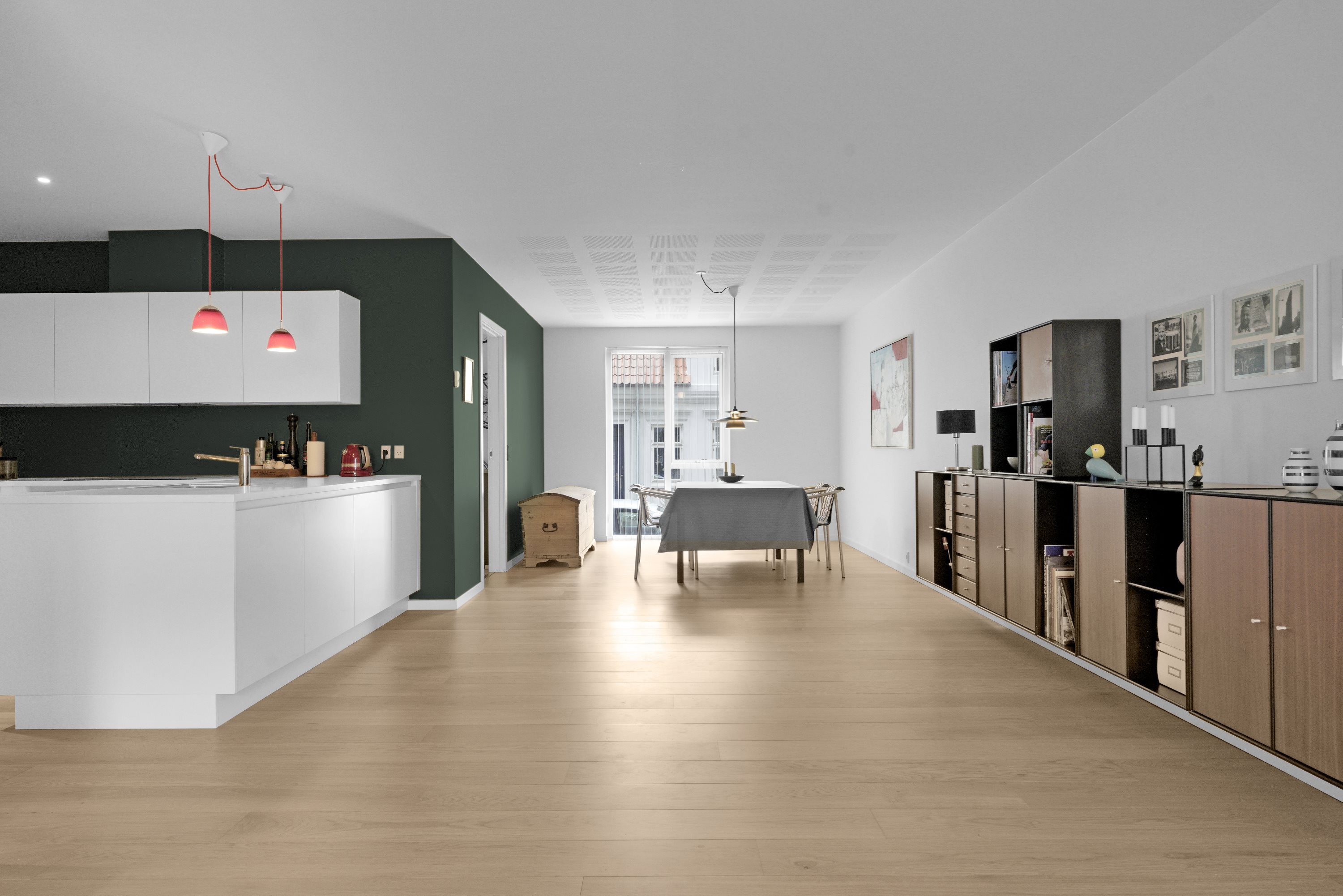 Køkkenet har masser af opbevaringsplads og rigelig bordsplads, hvilket gør det til et ideelt samlingspunkt for hele familien og der er her masser af plads til det store bord så hele familien kan samles. Herfra er der direkte udgang til en stor terrasse, hvor du kan nyde de hyggelig grill-aftener.