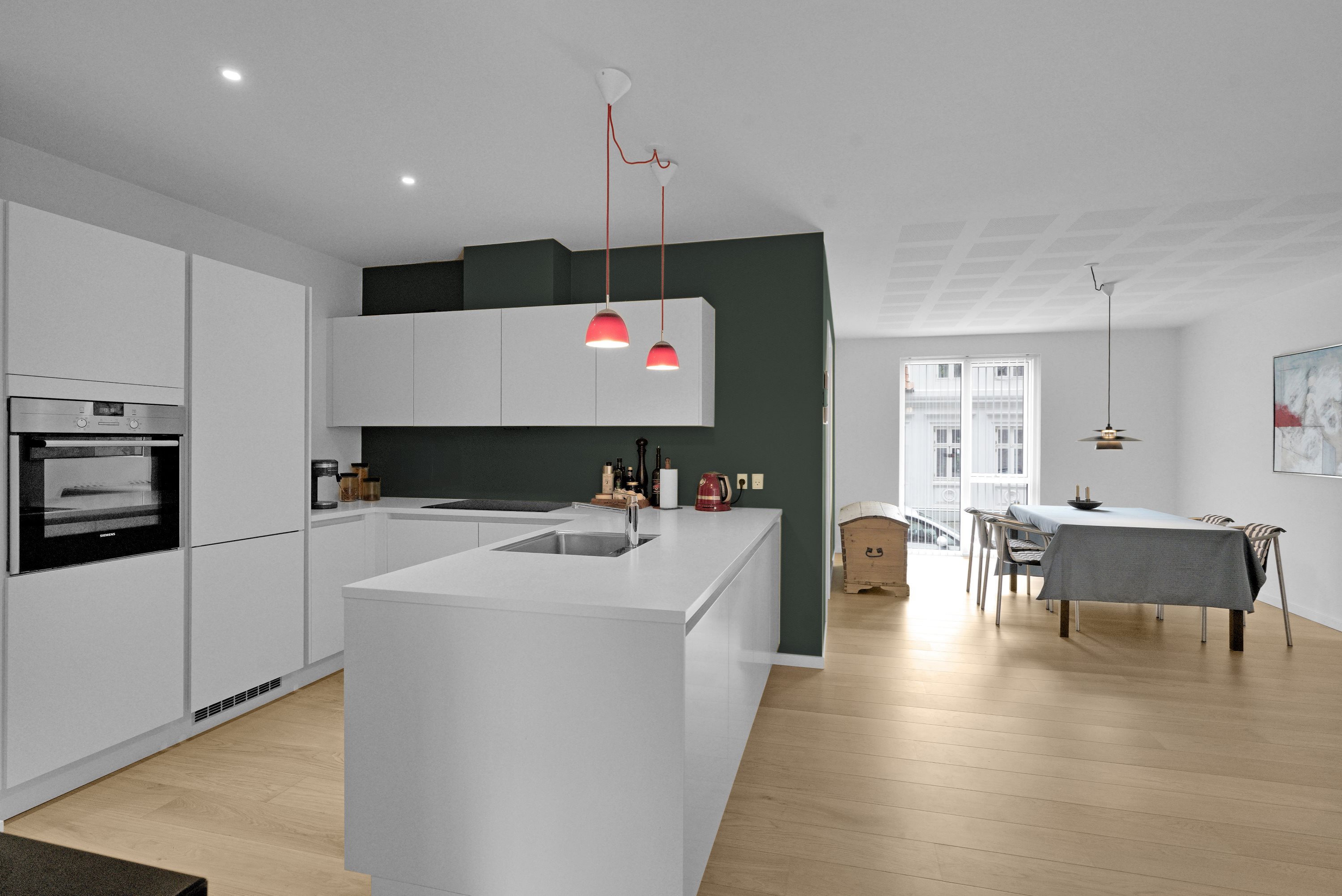 Stort og lyst køkken i åben forbindelse med spisestuen og stuen.
