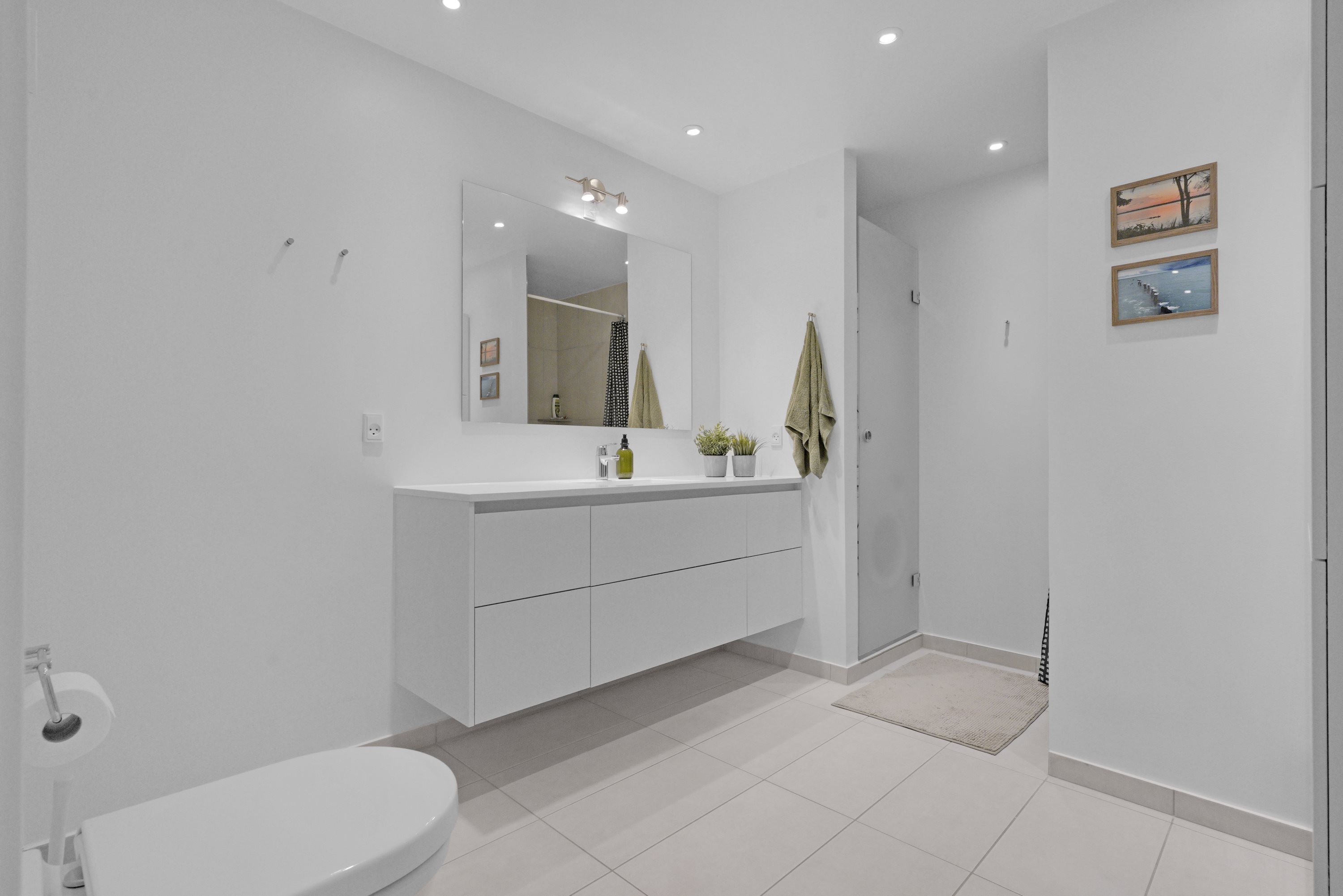 Lyst badeværelse med stor bruseniche og med vaskemaskine og tørretumbler.