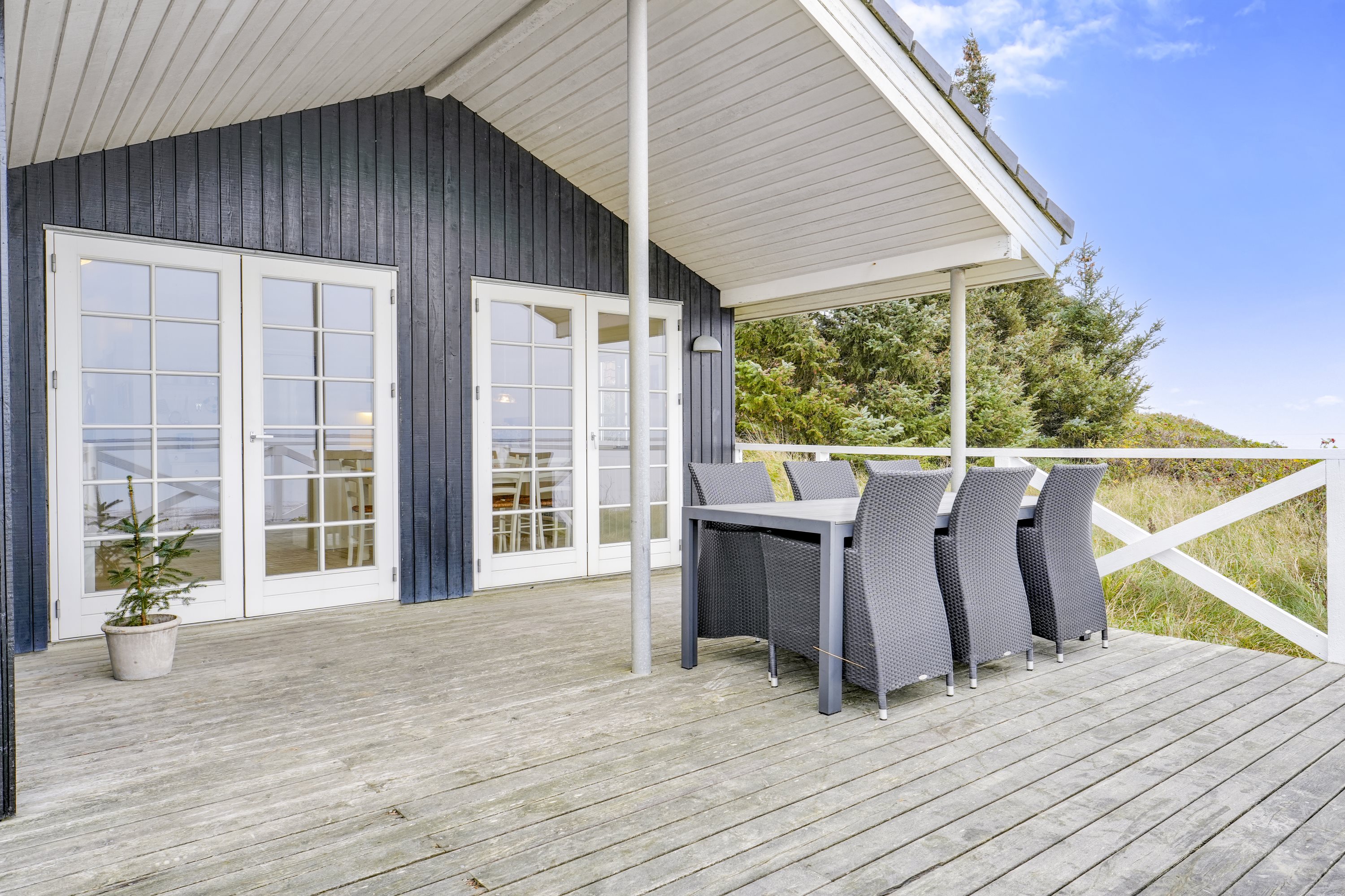 Med en sublim placering og panoramaudsigt over smukke Ho Bugt får du her et sommerhus, hvor komfort, design og natur går op i en højere enhed. Drømmer du om et fristed med udsigt, ro og kvalitet i alle detaljer? Dette træsommerhus i Sjelborg på 113 m² opfylder alt det og mere til! En stor carport med integreret udhus på i alt 35 m² giver masser af plads til opbevaring, hobby eller parkering. Udendørs finder du et velplaceret terrasseområde, hvor solen og vandet kan nydes hele dagen.