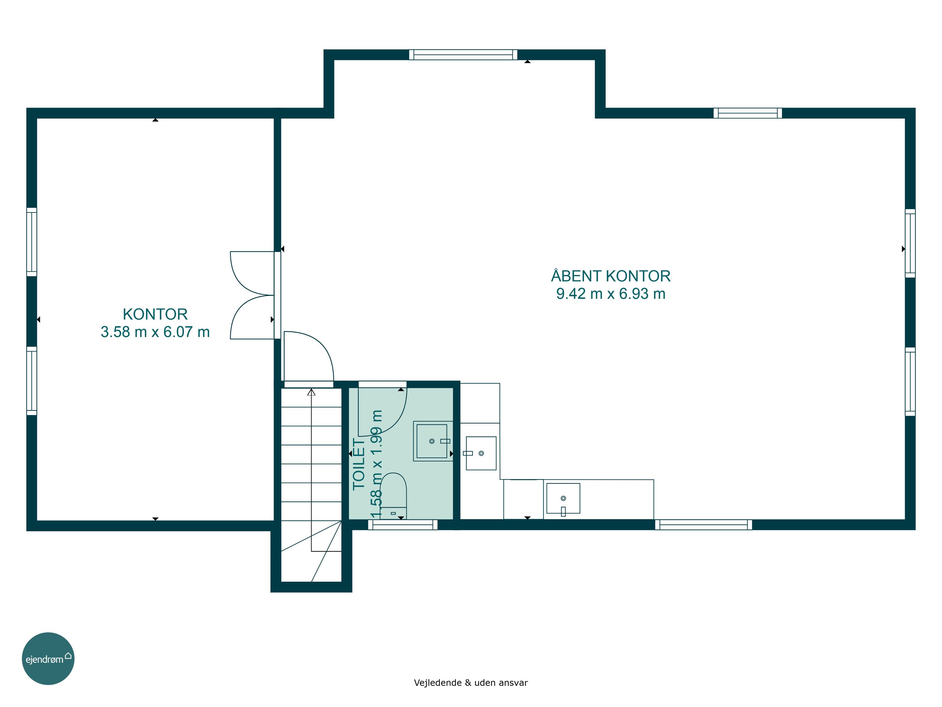 Stueplanen: 3 store kontorer, køkken, toilet, samt lager/kontor.