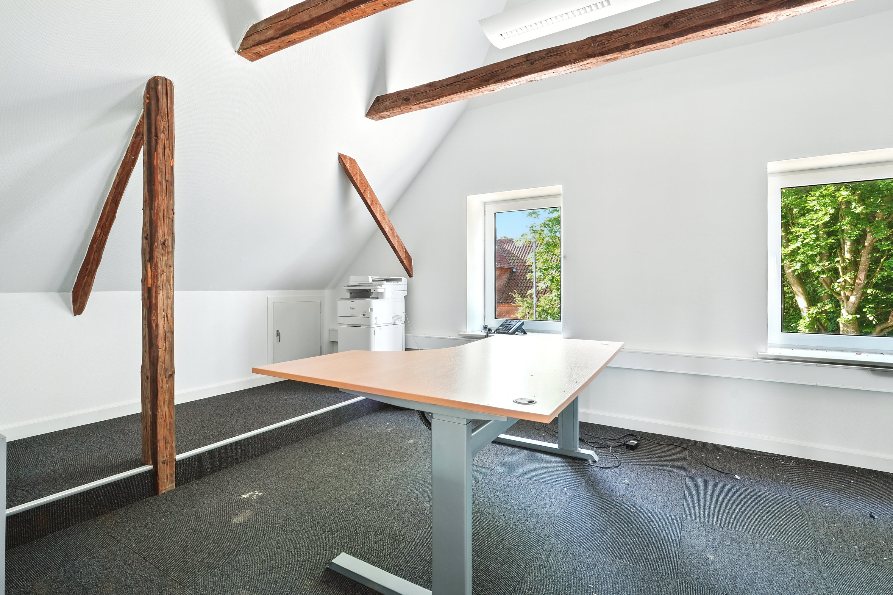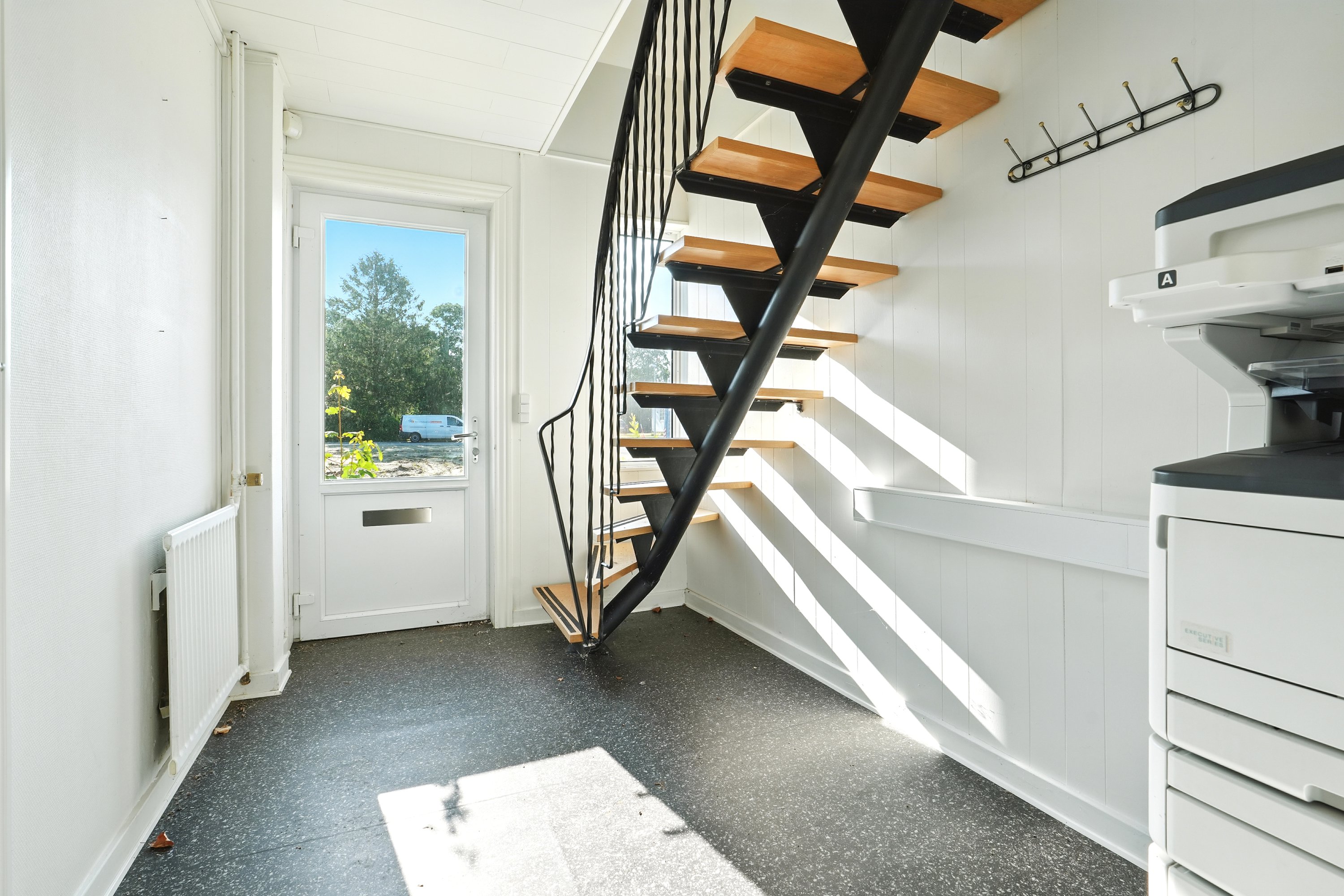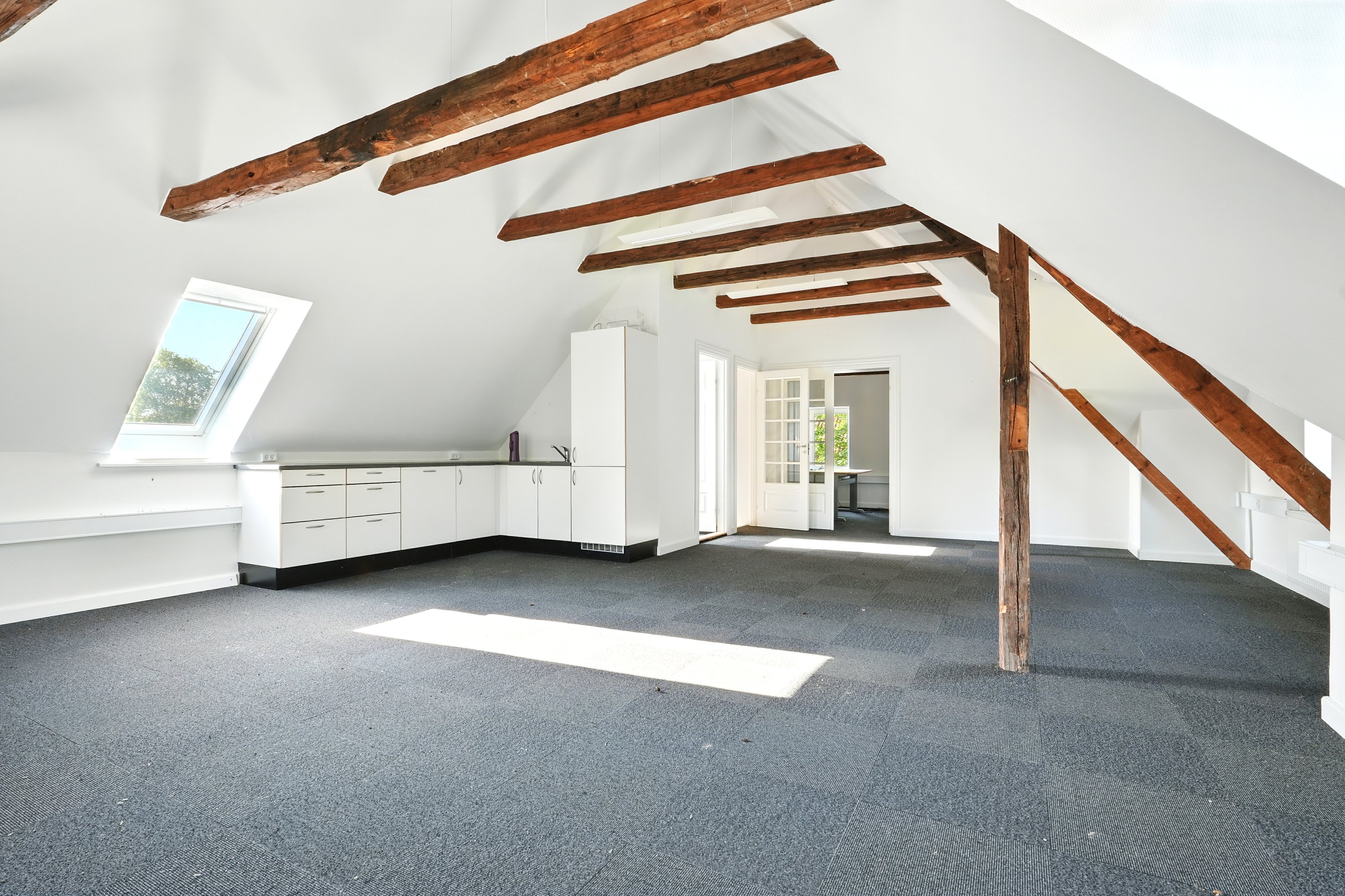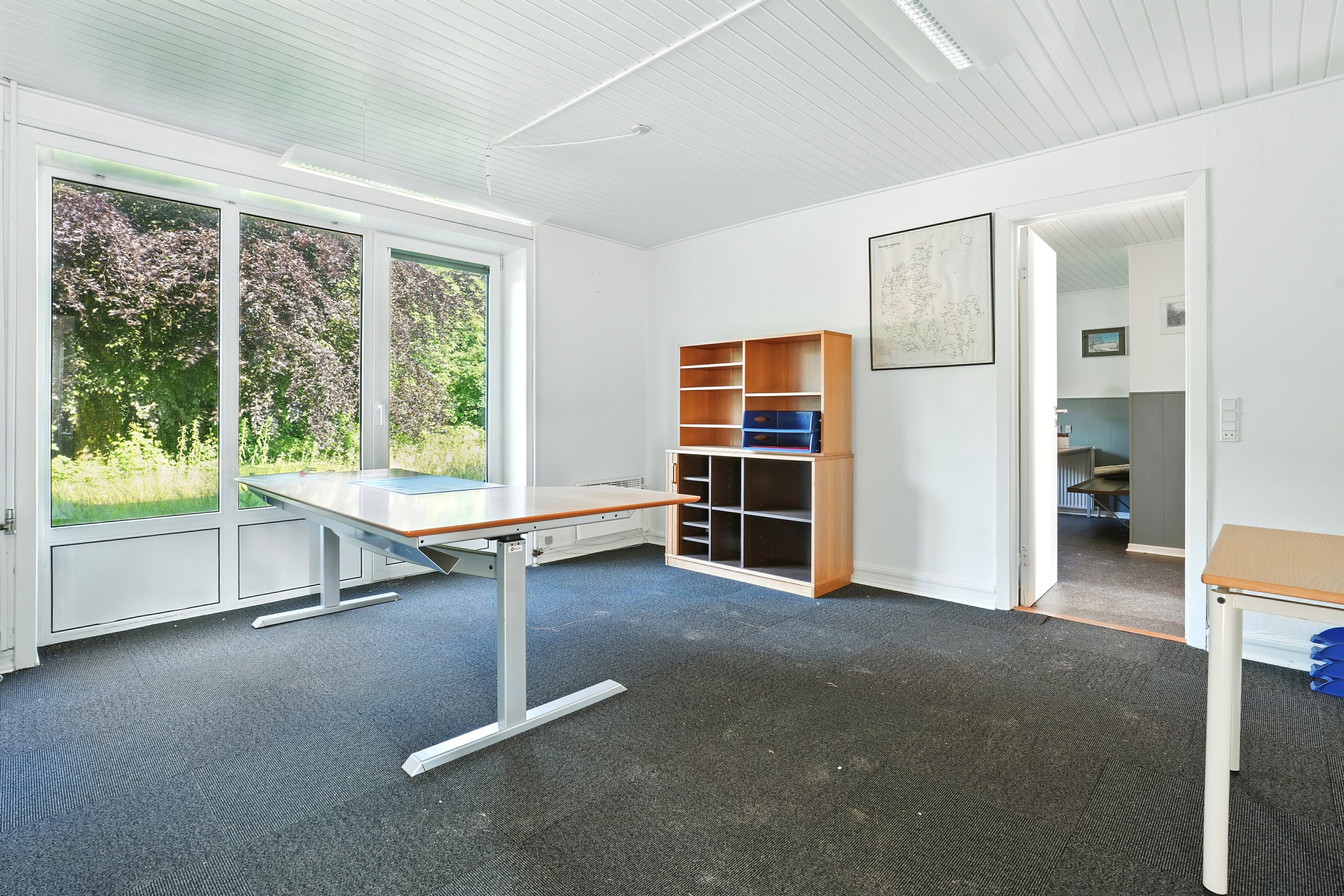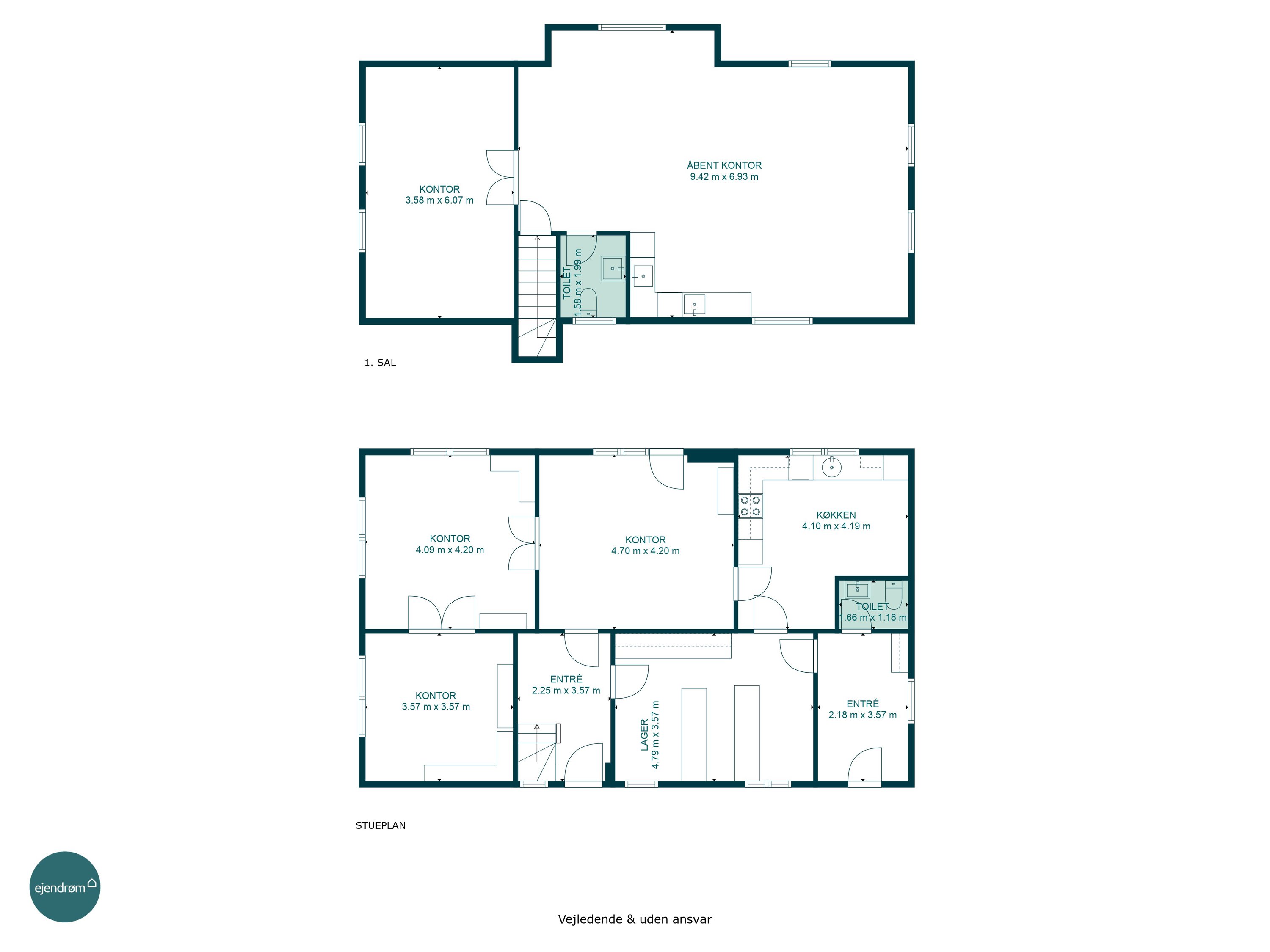 1. sal: Åbent kontor med køkken, toilet, yderligere et kontor.