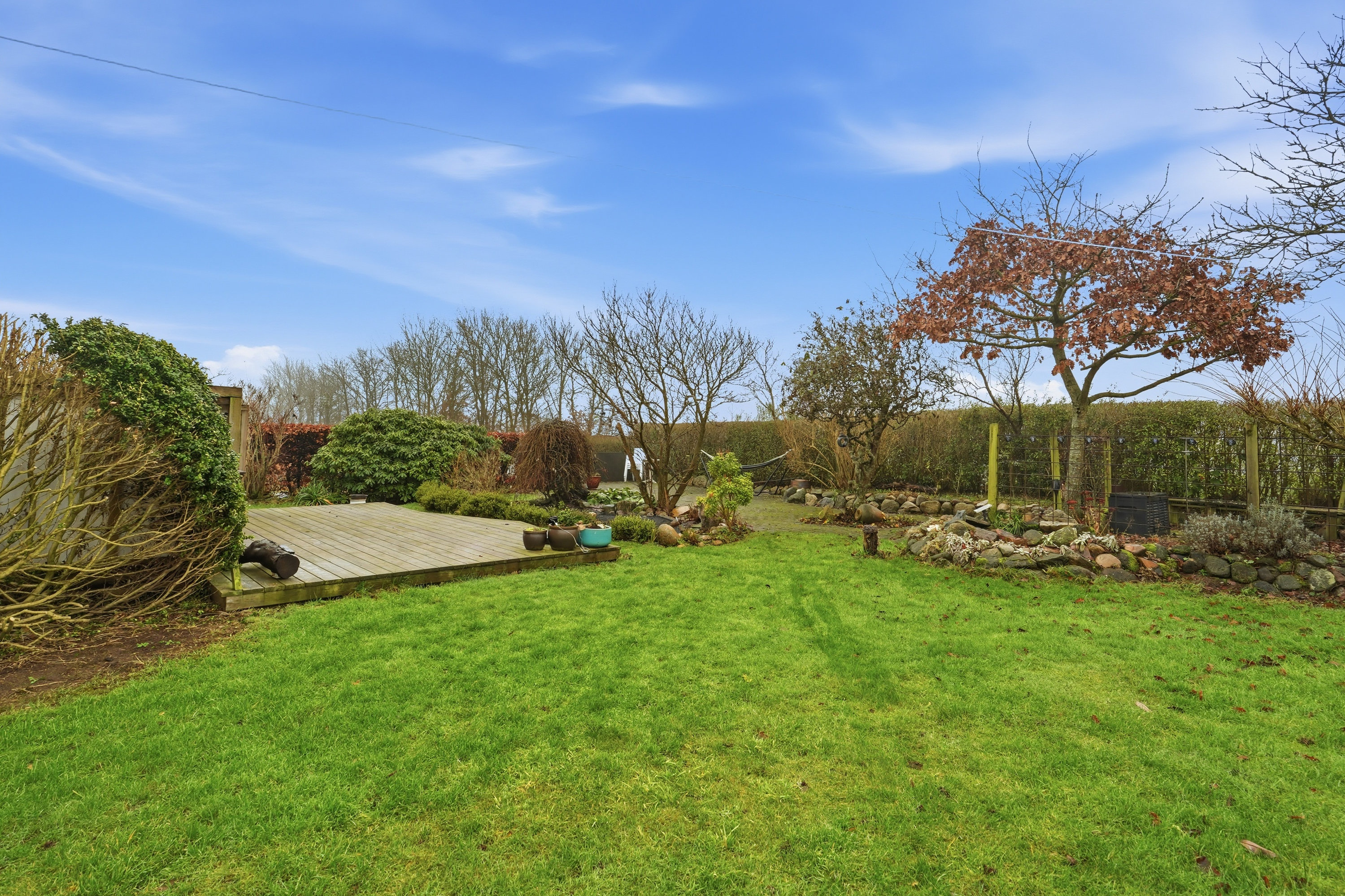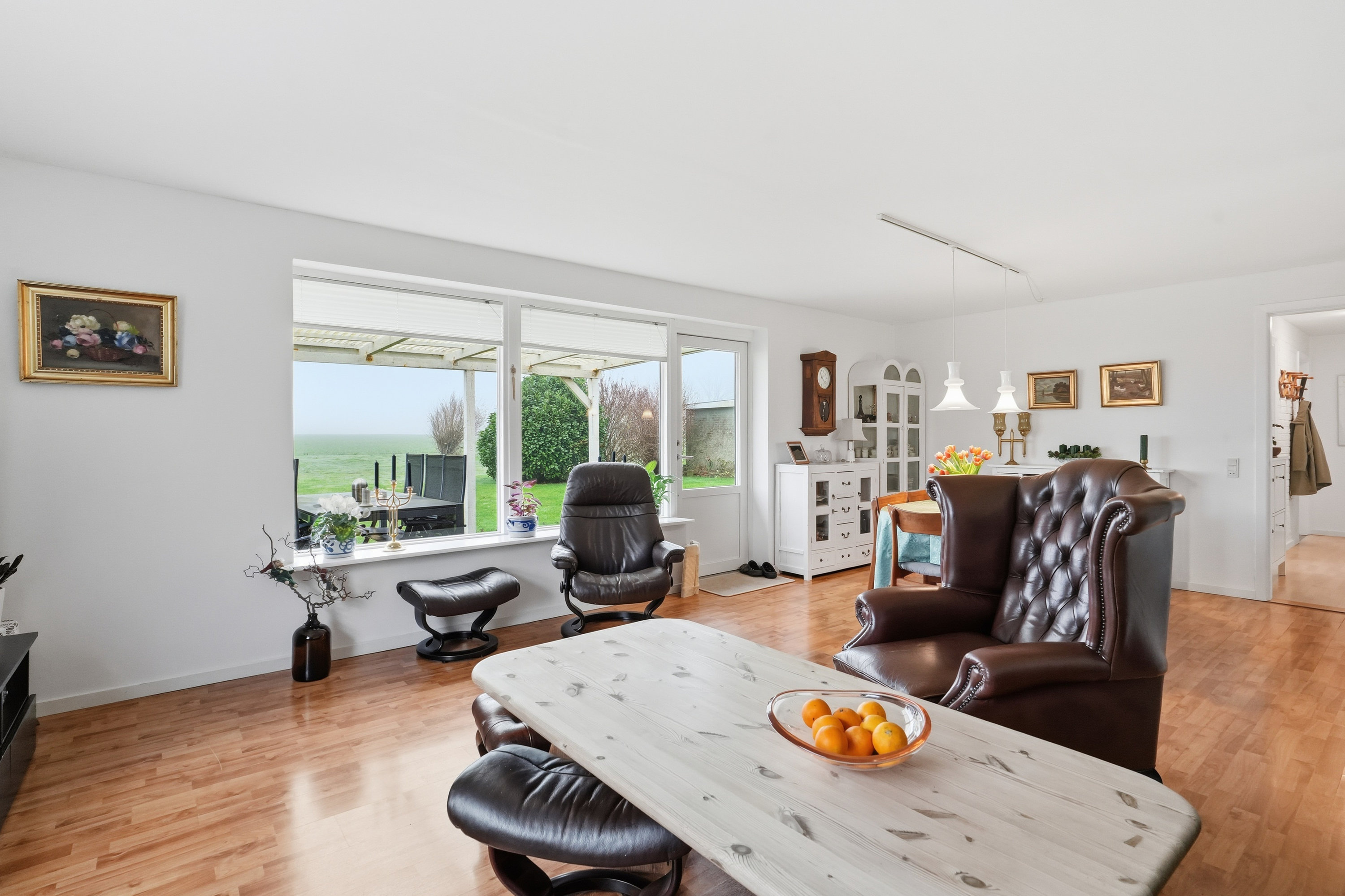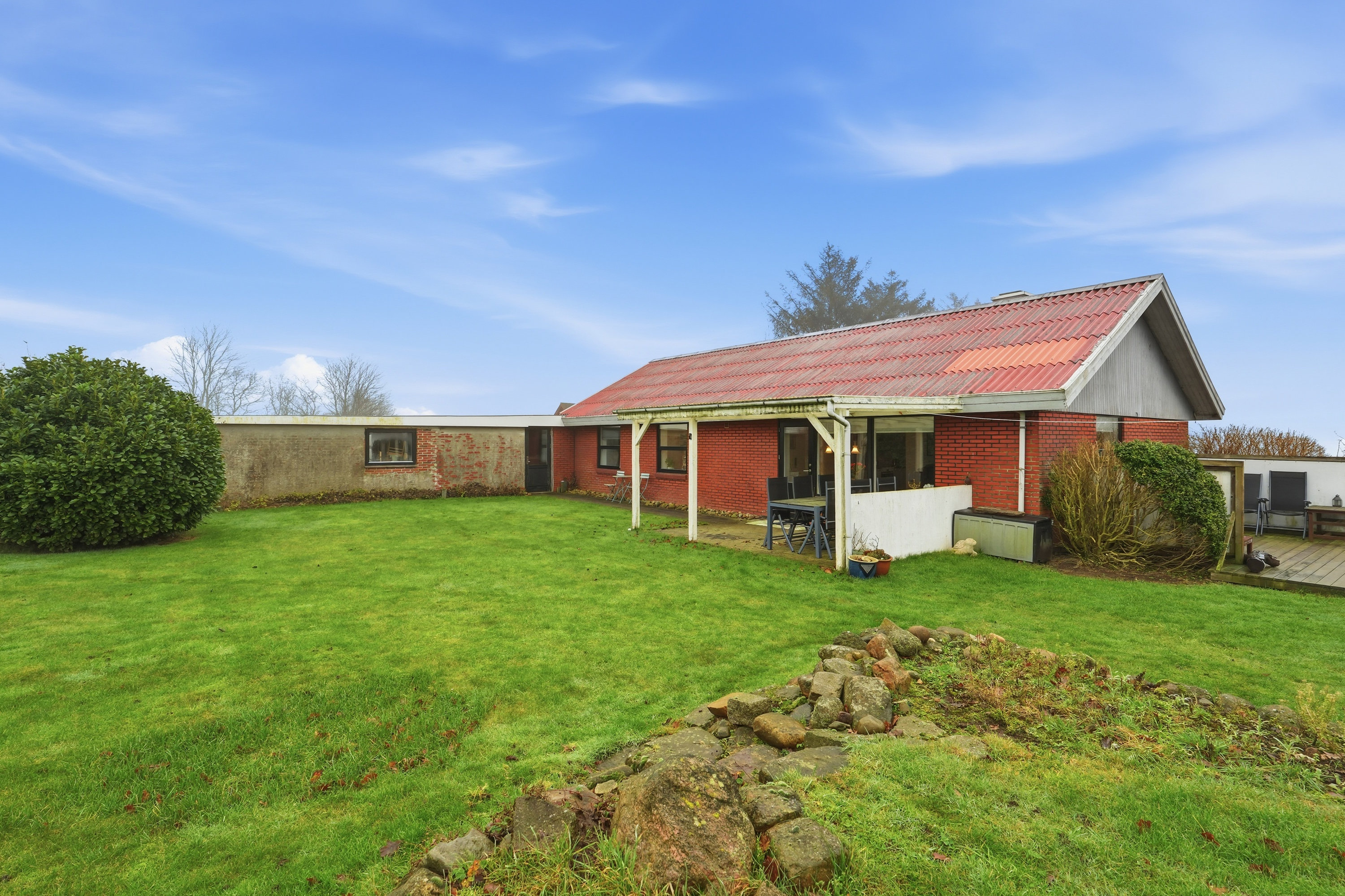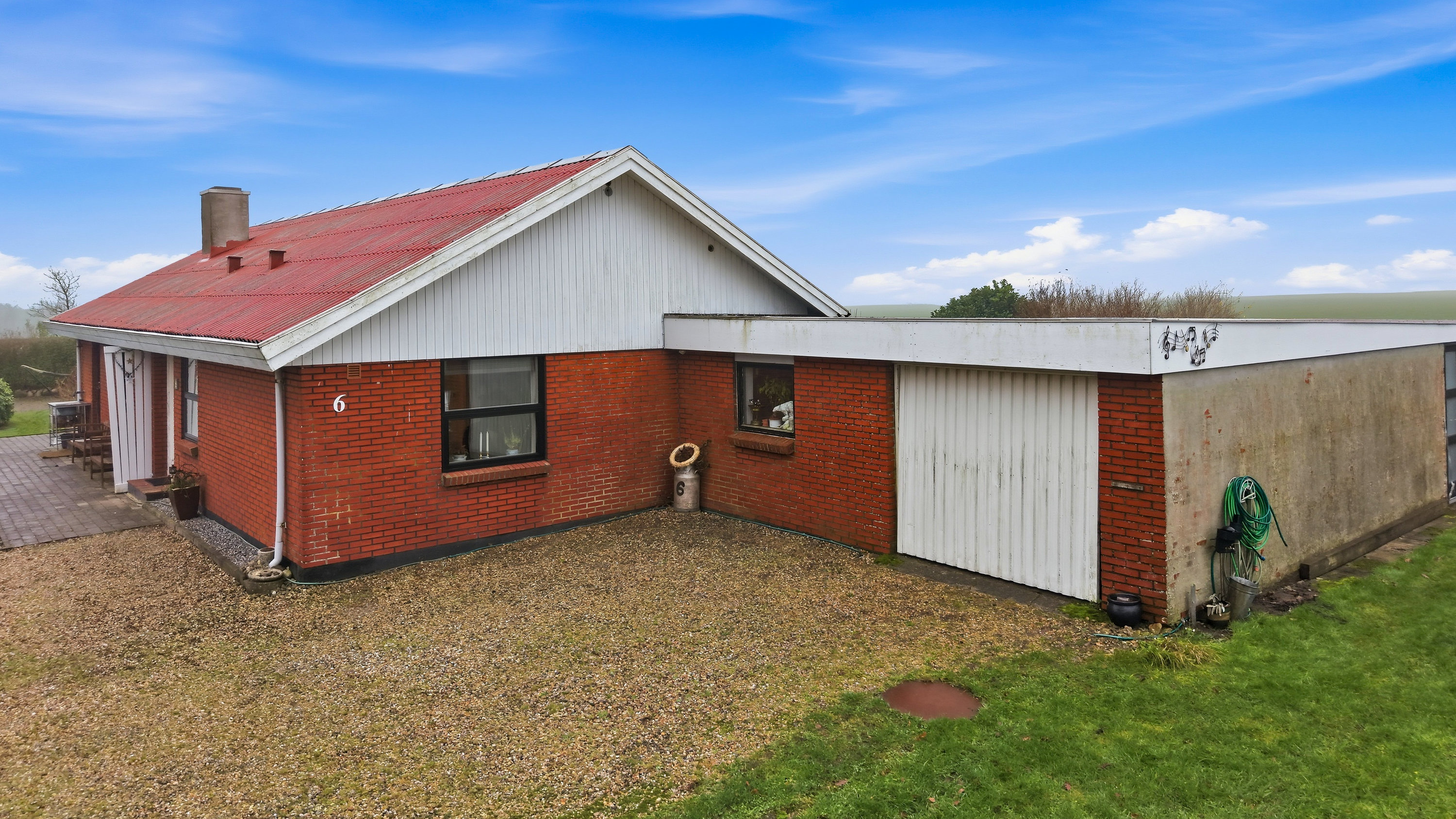 Udenfor venter en stor grund med fuld fokus på udelivet. Haven er et fristed for både leg og afslapning, og her er plads til små dyr, haveprojekter og hyggelige stunder under åben himmel. Den store garage giver masser af muligheder – uanset om du drømmer om hobbyværksted, plads til projekter eller blot god opbevaring.