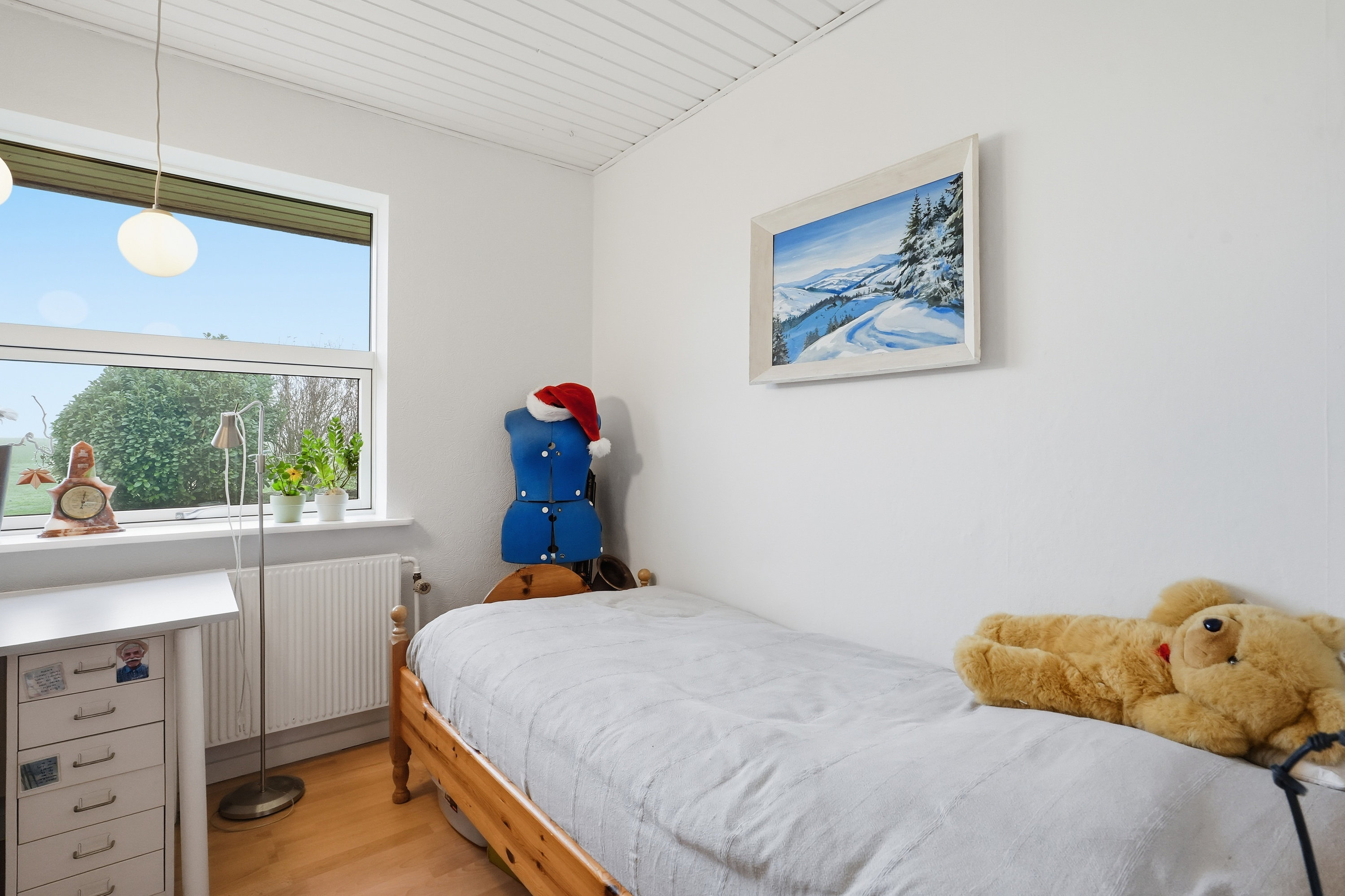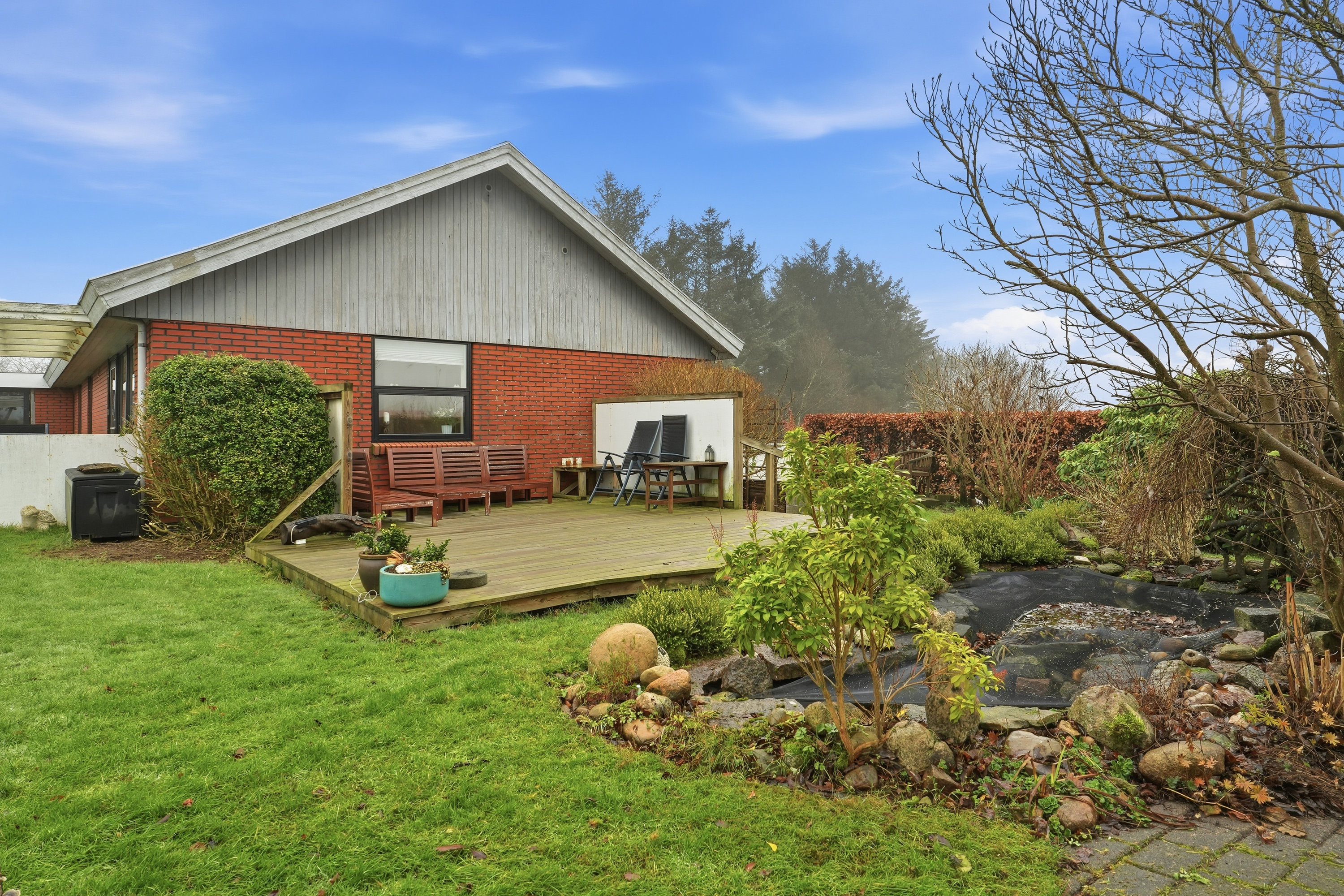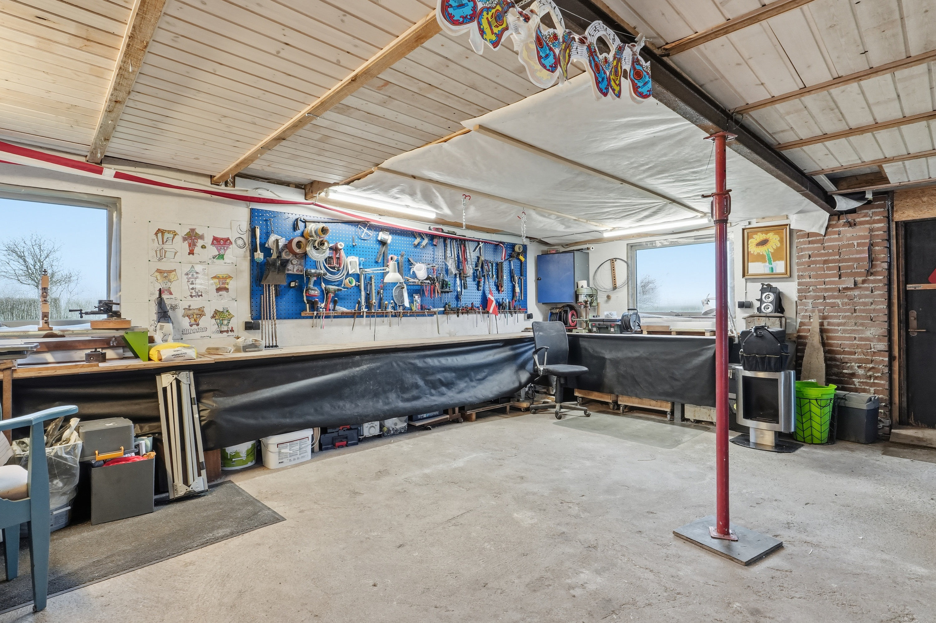 Udenfor venter en stor grund med fuld fokus på udelivet. Haven er et fristed for både leg og afslapning, og her er plads til små dyr, haveprojekter og hyggelige stunder under åben himmel. Den store garage giver masser af muligheder – uanset om du drømmer om hobbyværksted, plads til projekter eller blot god opbevaring.