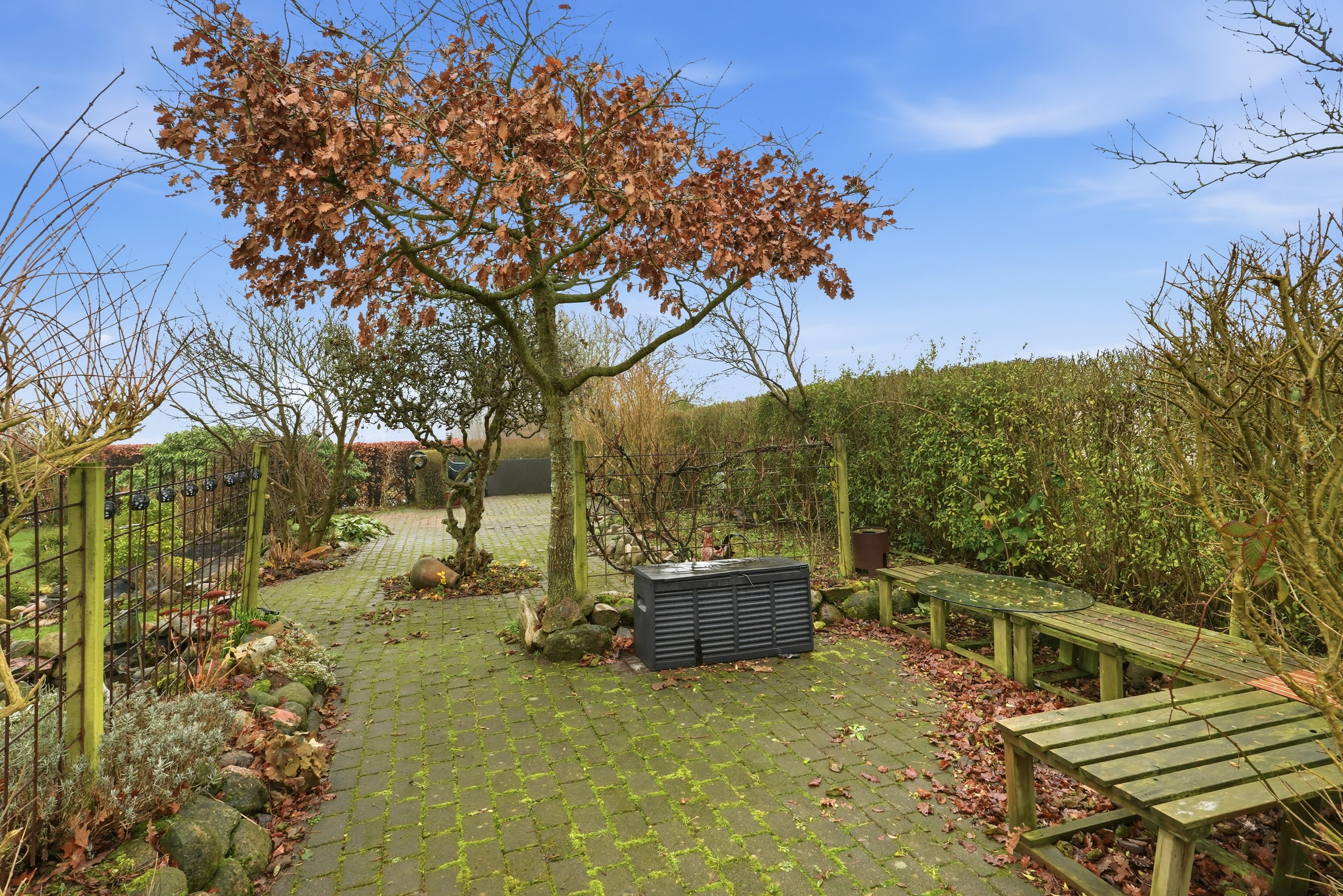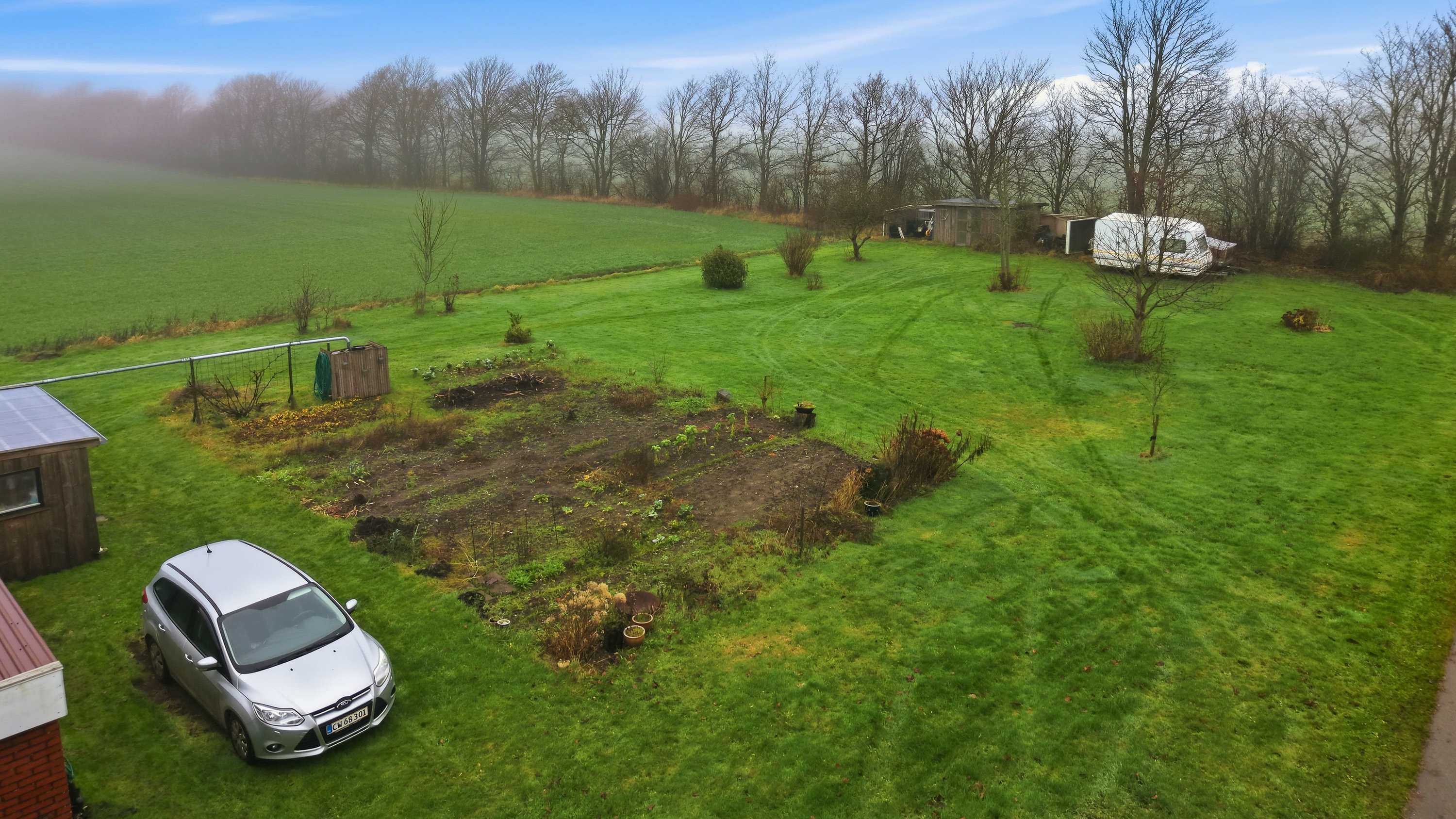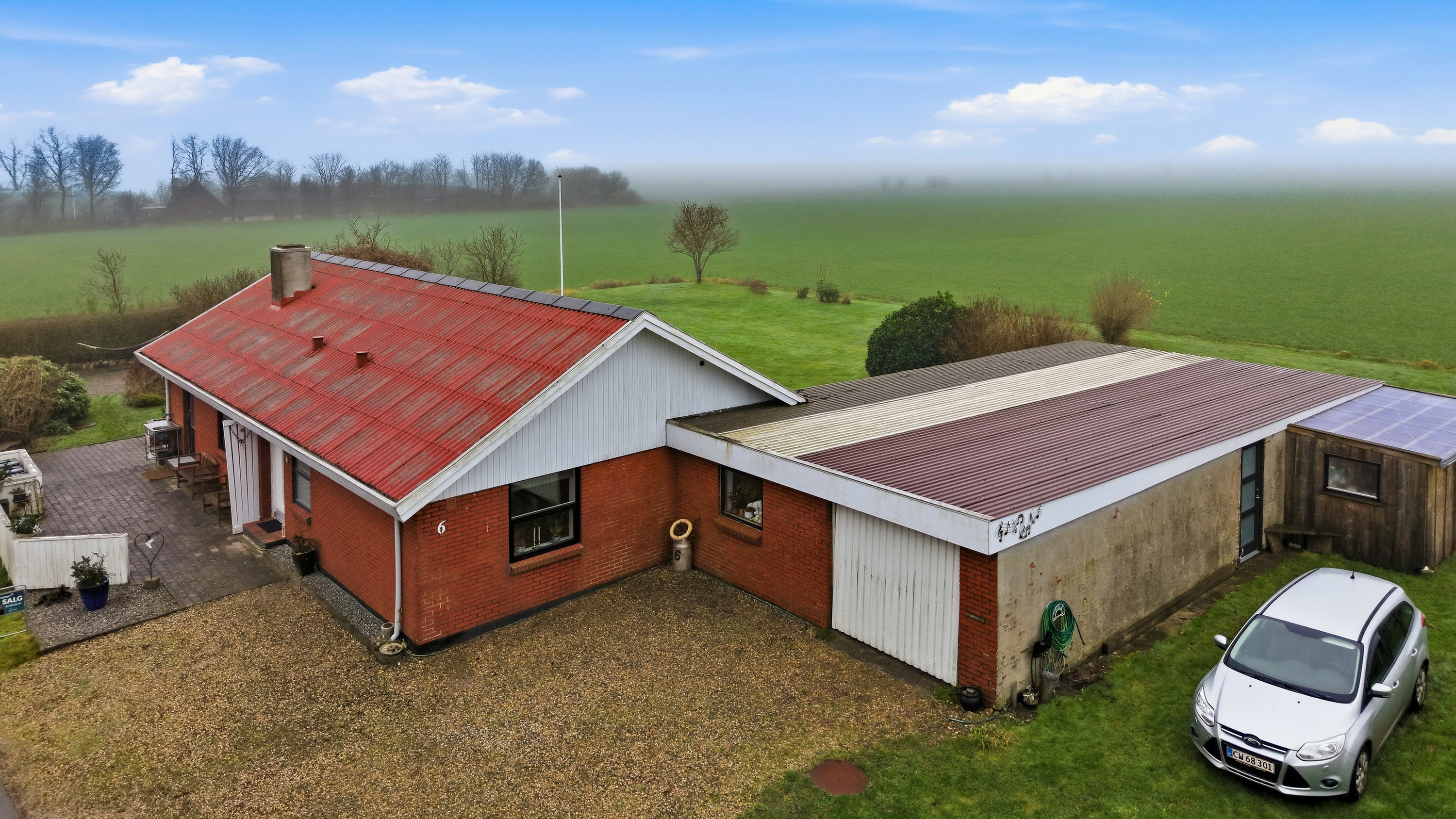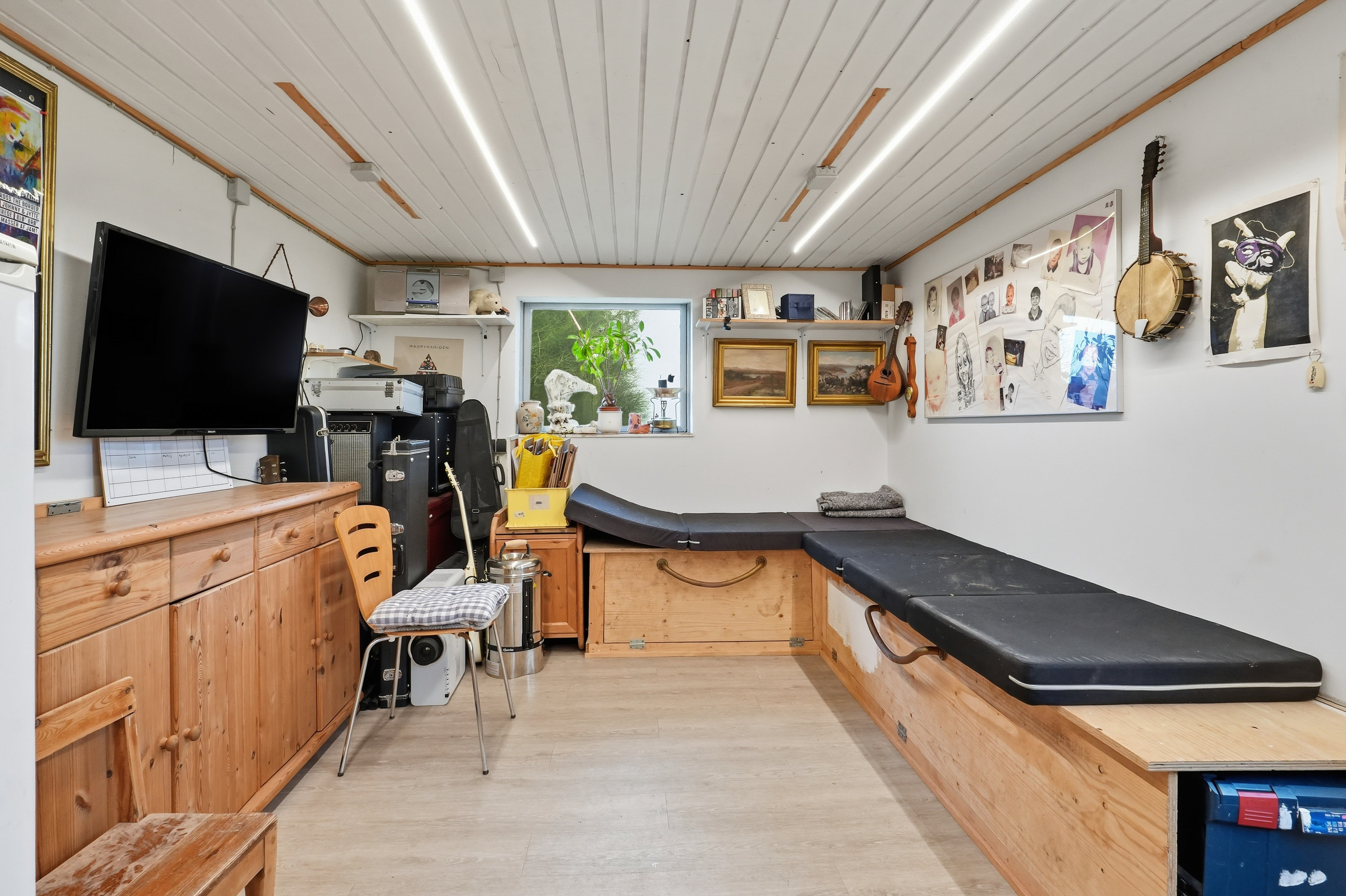 Udenfor venter en stor grund med fuld fokus på udelivet. Haven er et fristed for både leg og afslapning, og her er plads til små dyr, haveprojekter og hyggelige stunder under åben himmel. Den store garage giver masser af muligheder – uanset om du drømmer om hobbyværksted, plads til projekter eller blot god opbevaring.