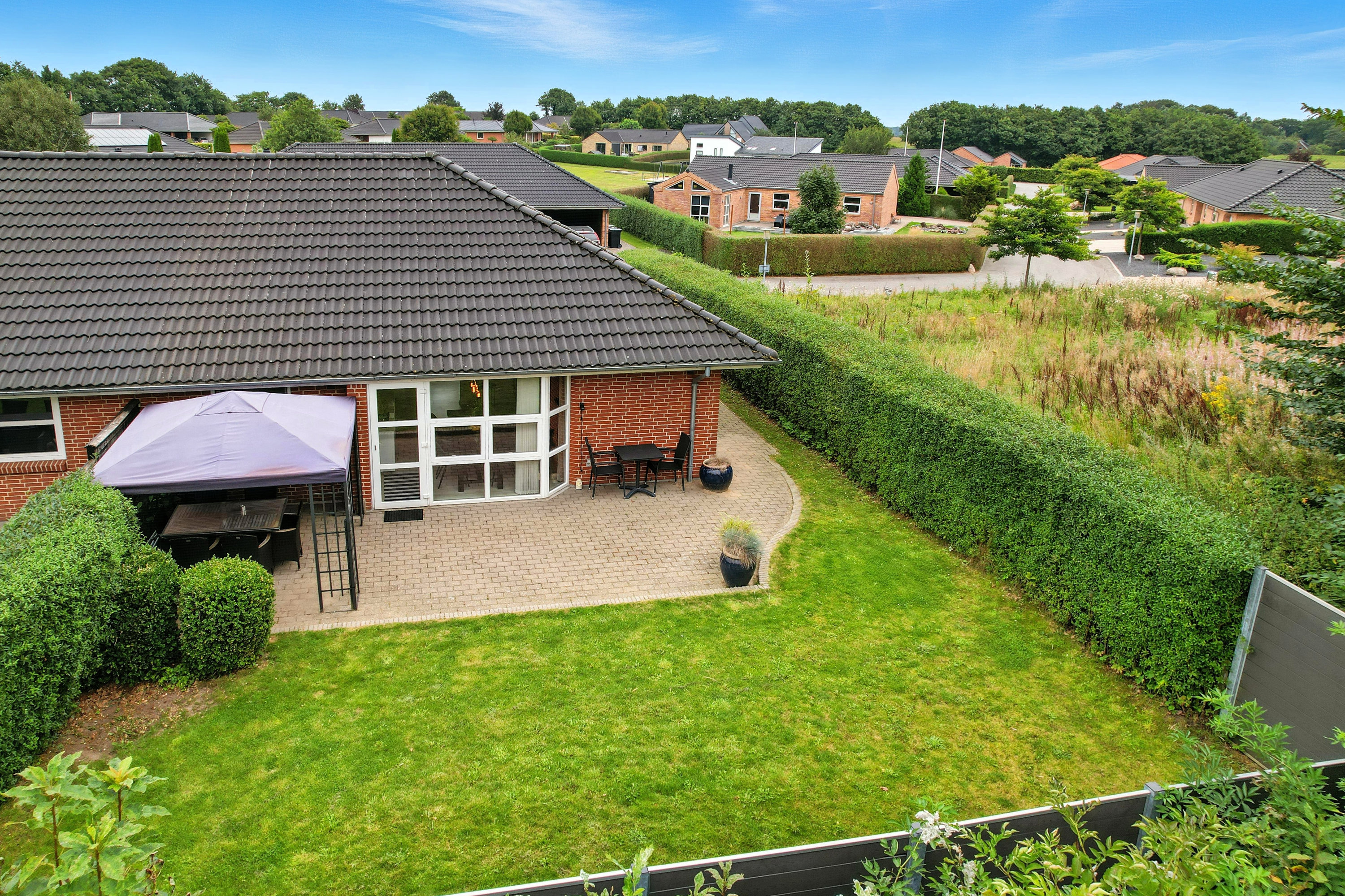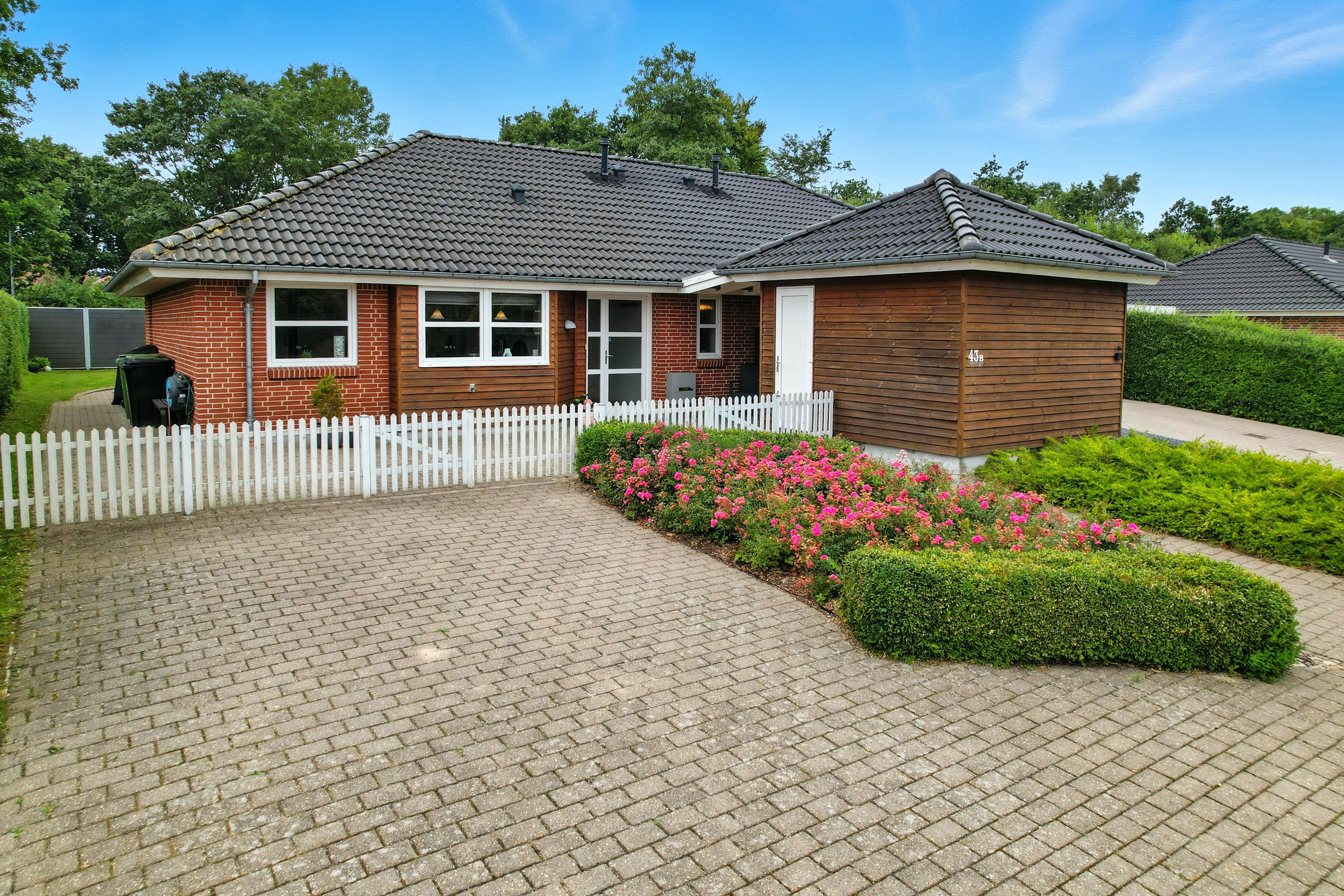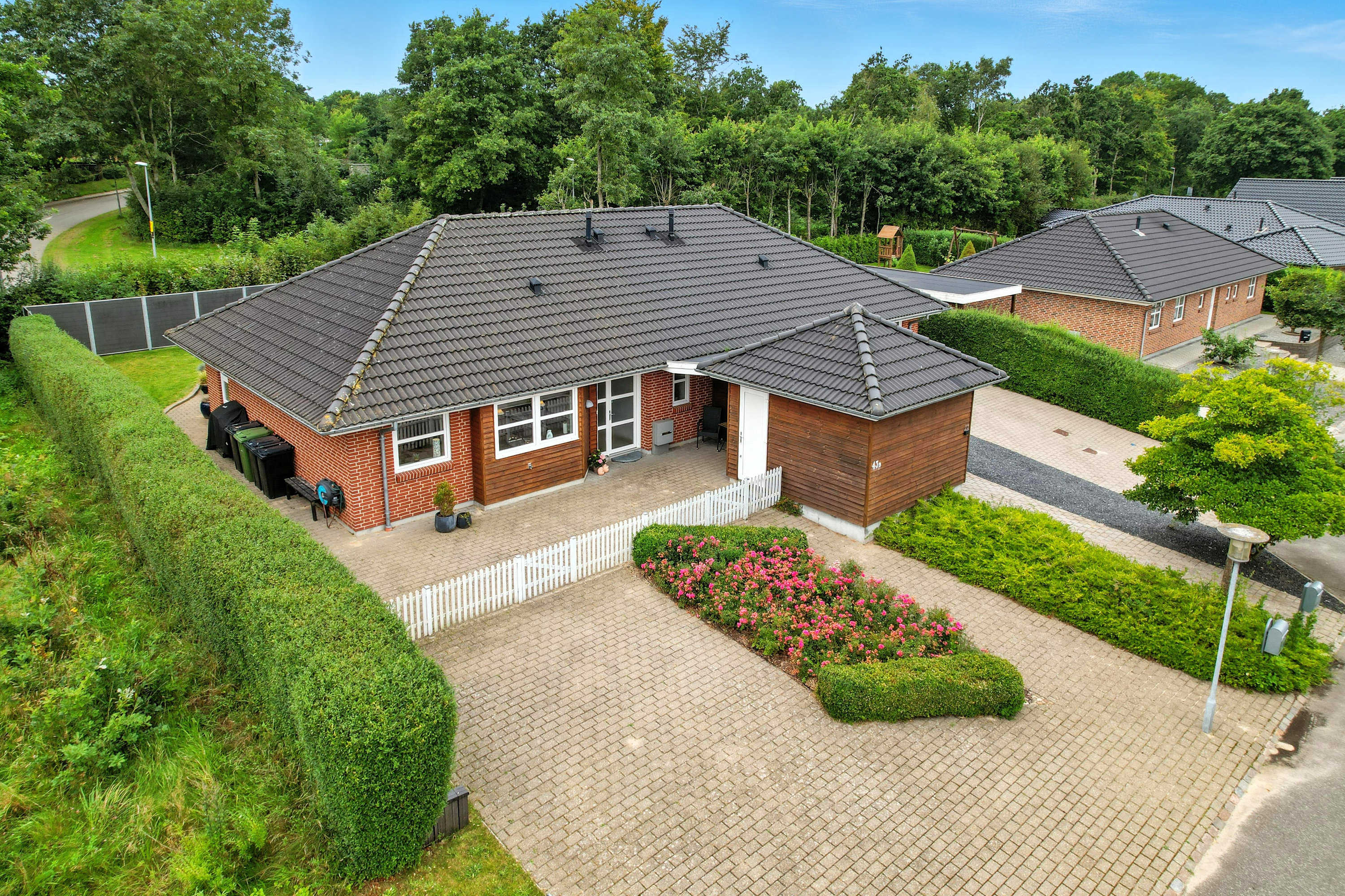 Huset ligger tilbagetrukket fra vejen med en sydvendt og ugeneret terrasse, hvor du kan nyde udelivet i rolige rammer. Foran boligen finder du et isoleret redskabsrum samt et overdækket område, som er praktisk til cykler, barnevogn eller opbevaring.
