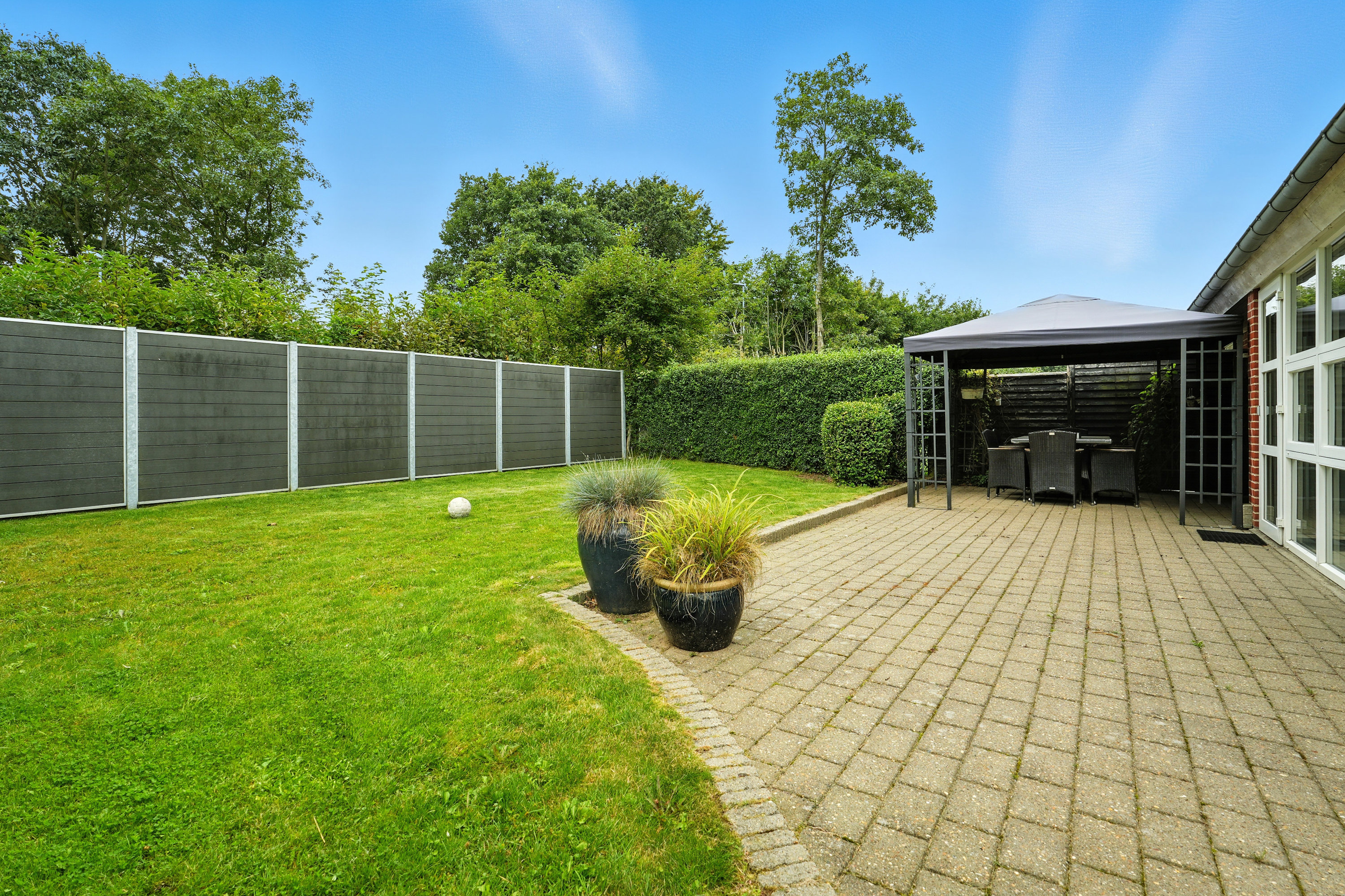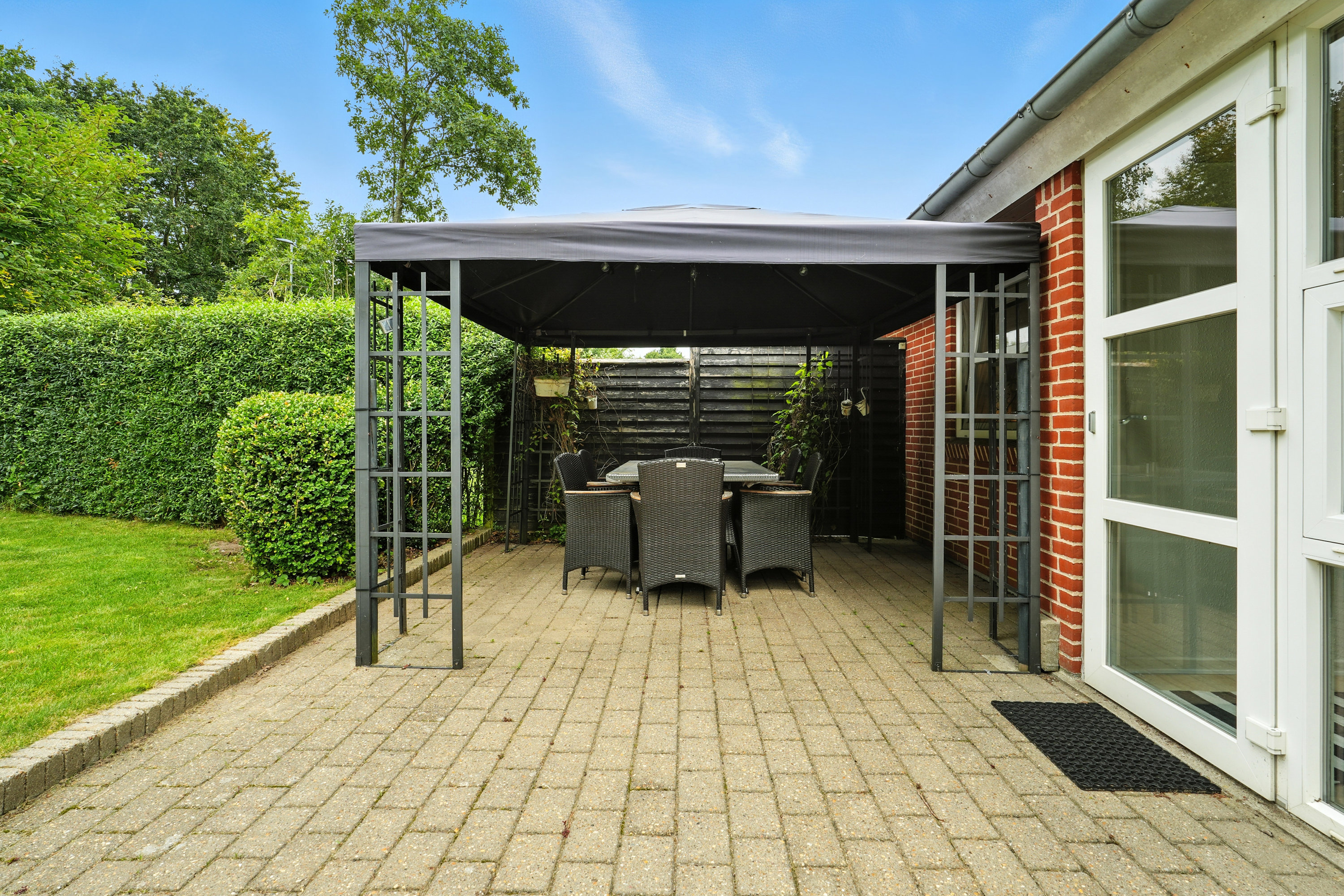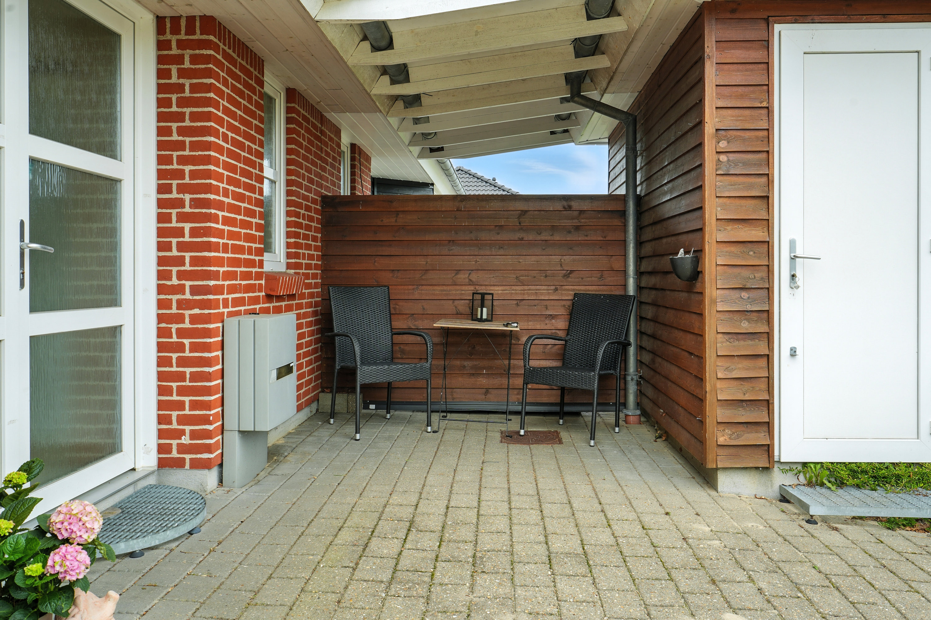 Huset ligger tilbagetrukket fra vejen med en sydvendt og ugeneret terrasse, hvor du kan nyde udelivet i rolige rammer. Foran boligen finder du et isoleret redskabsrum samt et overdækket område, som er praktisk til cykler, barnevogn eller opbevaring.