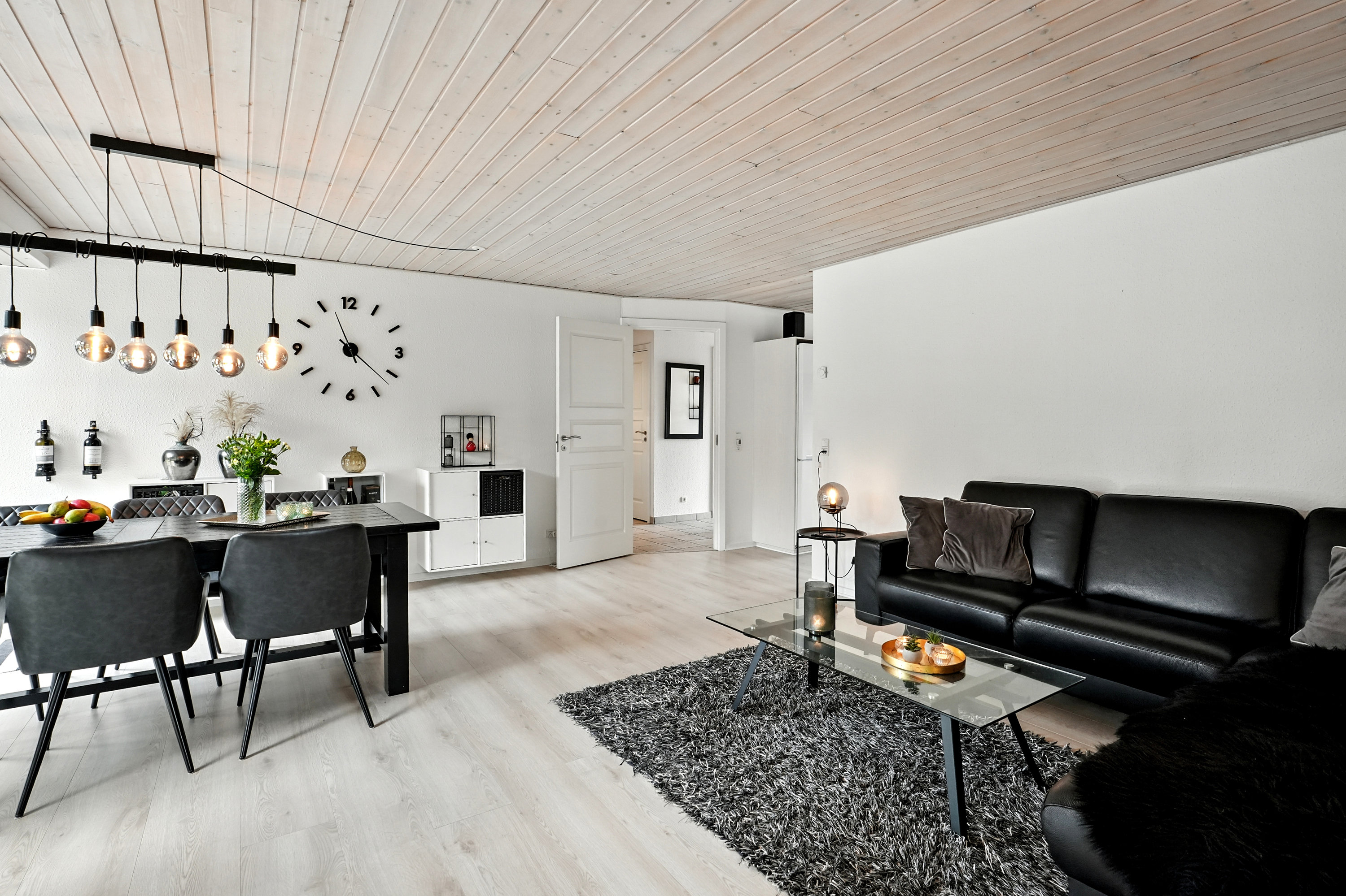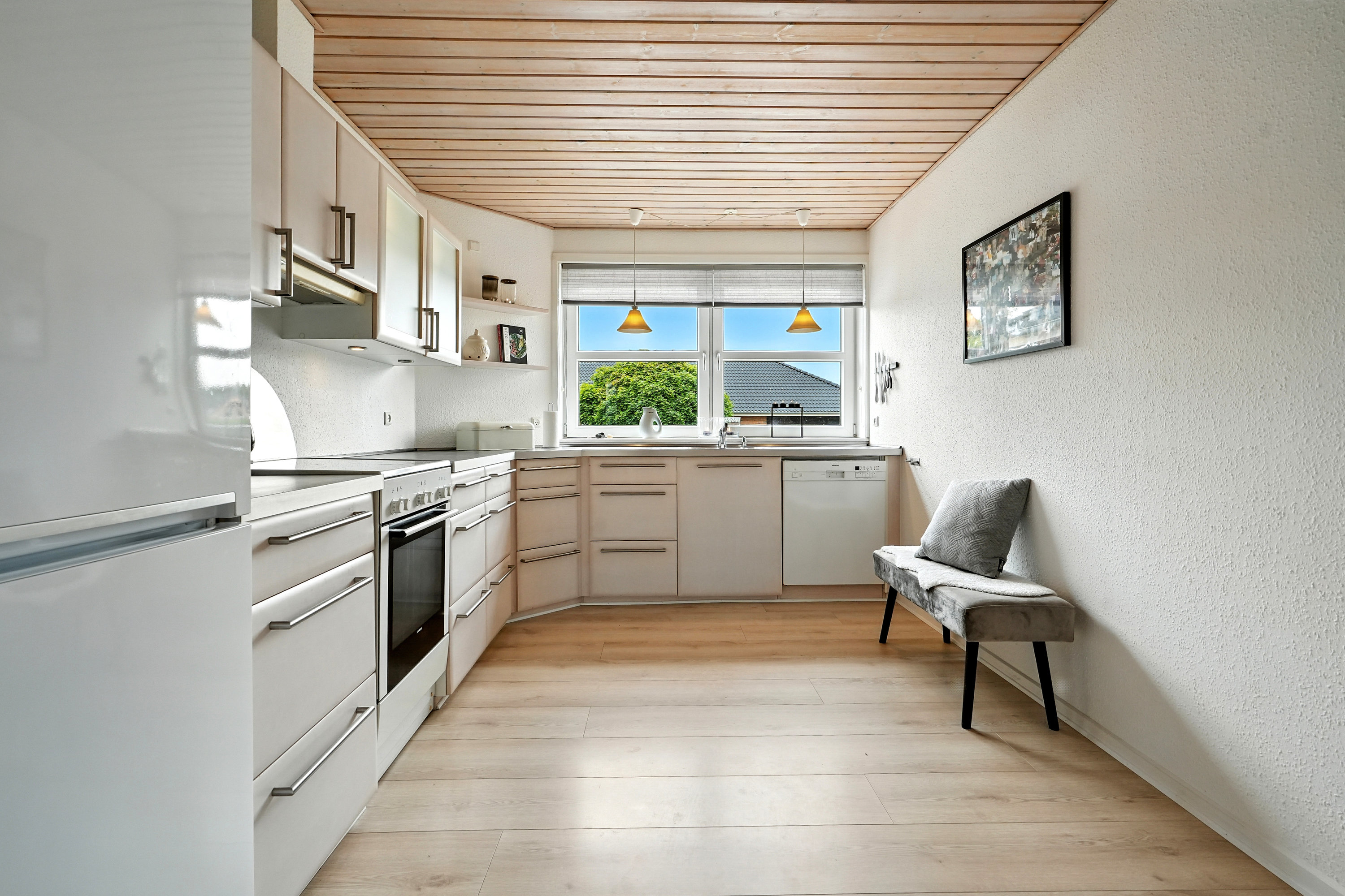 Køkken og stue ligger i åben forbindelse og skaber et lyst og sammenhængende opholdsrum. Der er plads til både spisebord og sofa, og fra stuen er der direkte udgang til den sydvendte terrasse, hvor solen kan nydes ugeneret. Derudover rummer boligen endnu et værelse, der nemt kan fungere som soveværelse, gæsteværelse eller hjemmekontor.