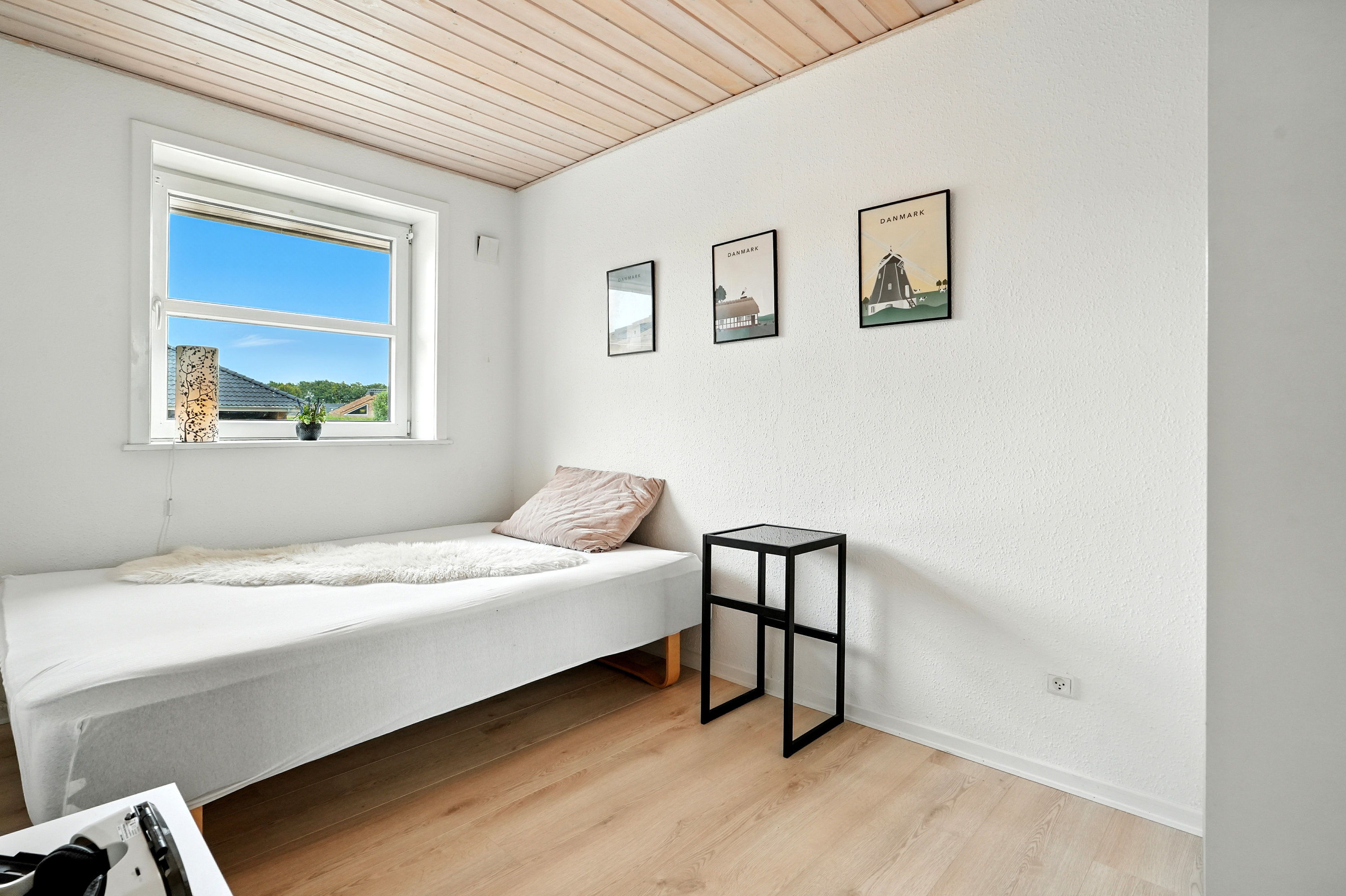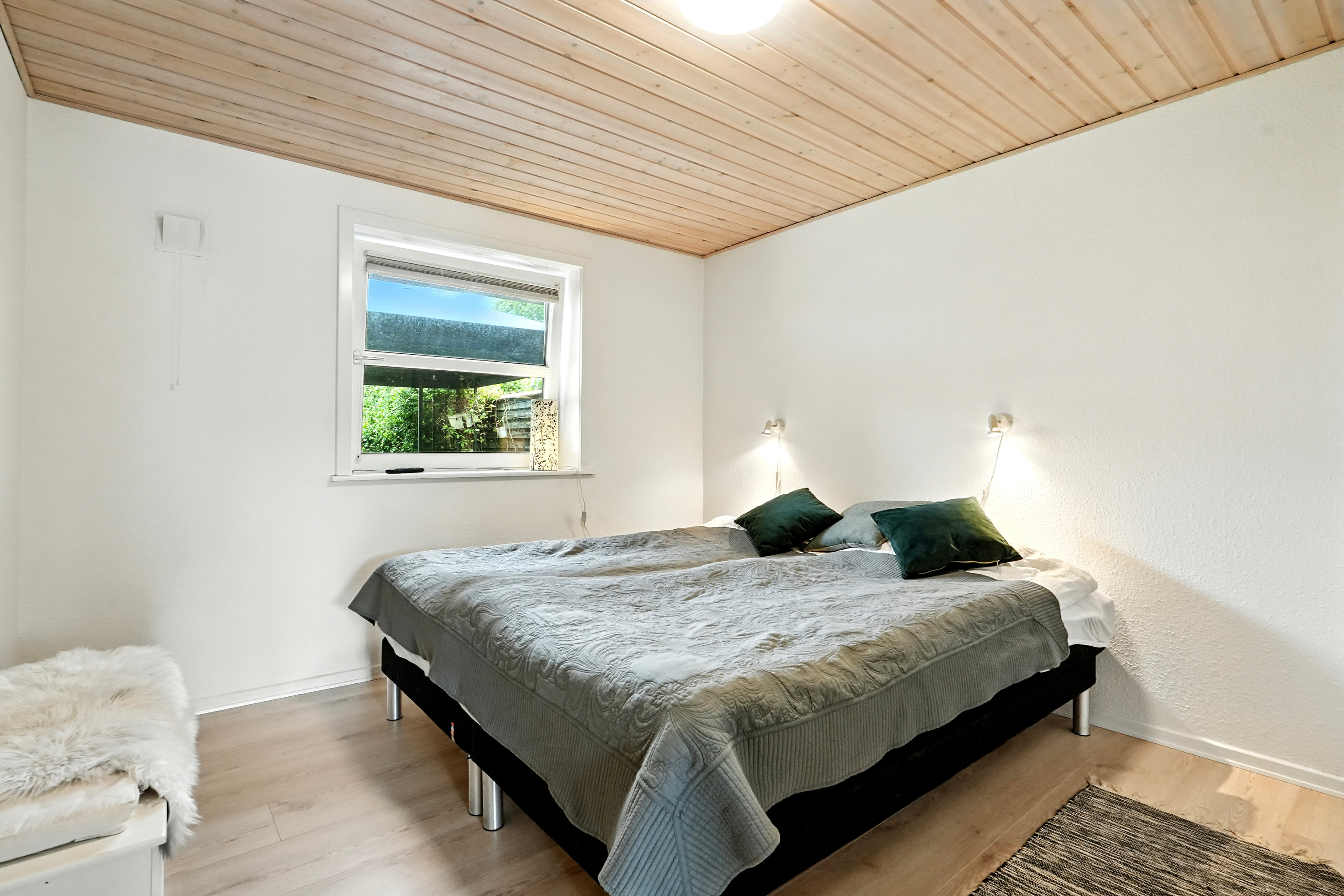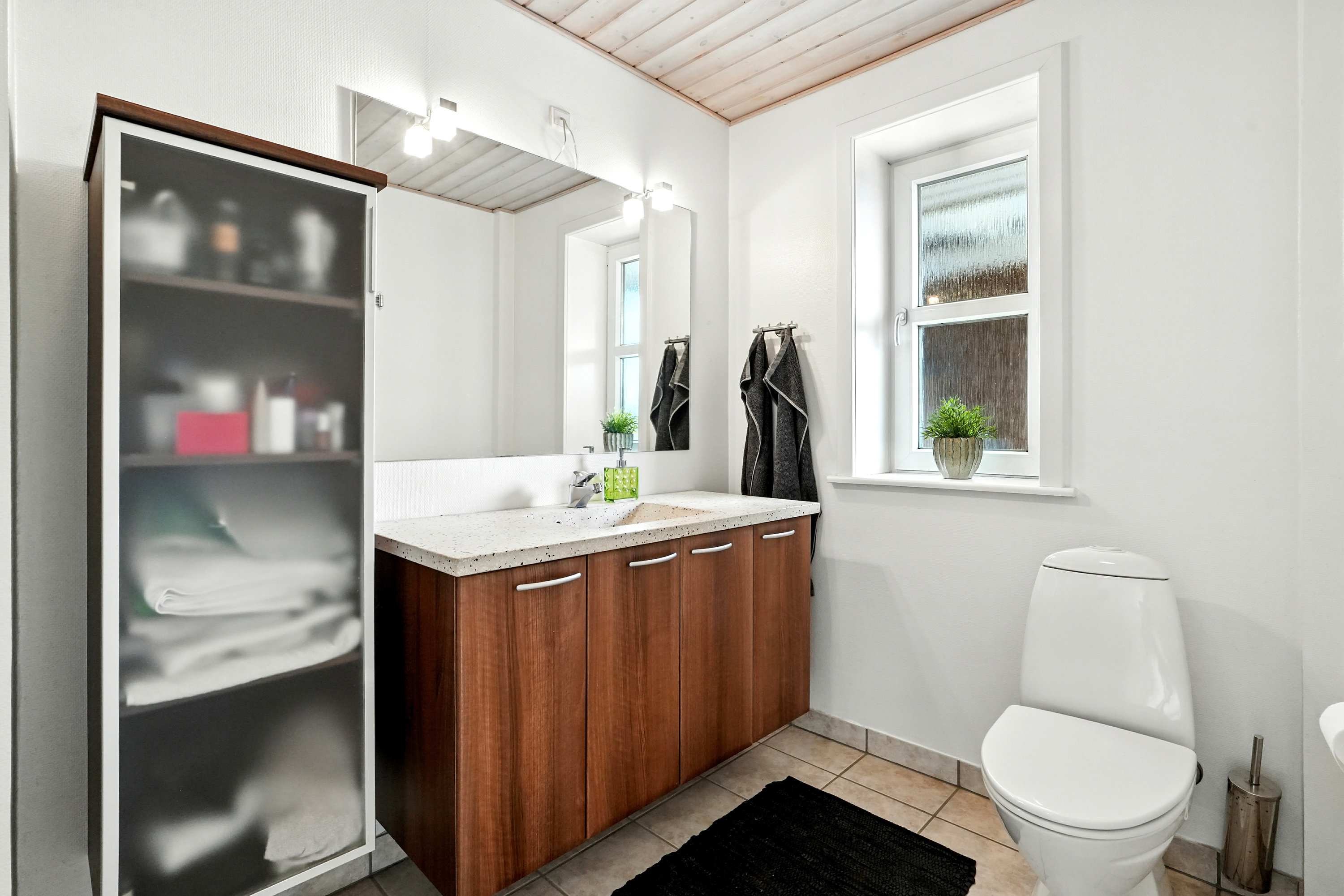 Indendørs er huset indrettet med en lys og funktionel planløsning. Du bliver budt velkommen i et klinkebelagt bryggers med plads til både vaskemaskine og tørretumbler. Herfra er der adgang til et pænt badeværelse med bruseniche og gulvvarme samt et rummeligt værelse med faste skabe.