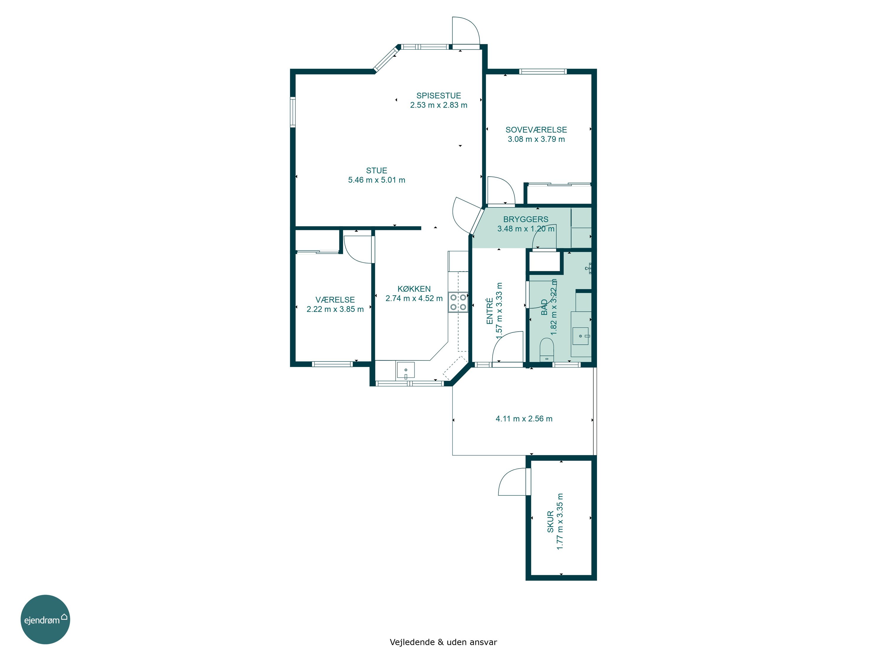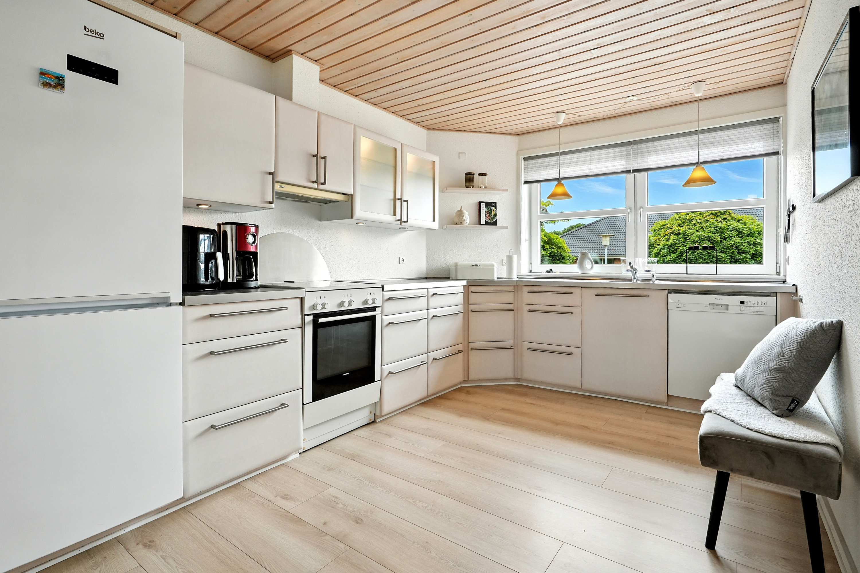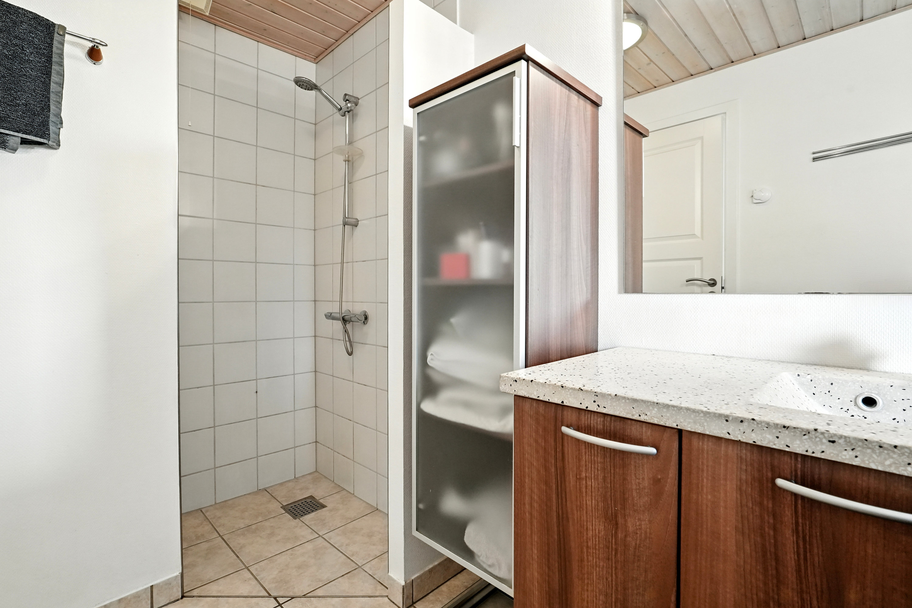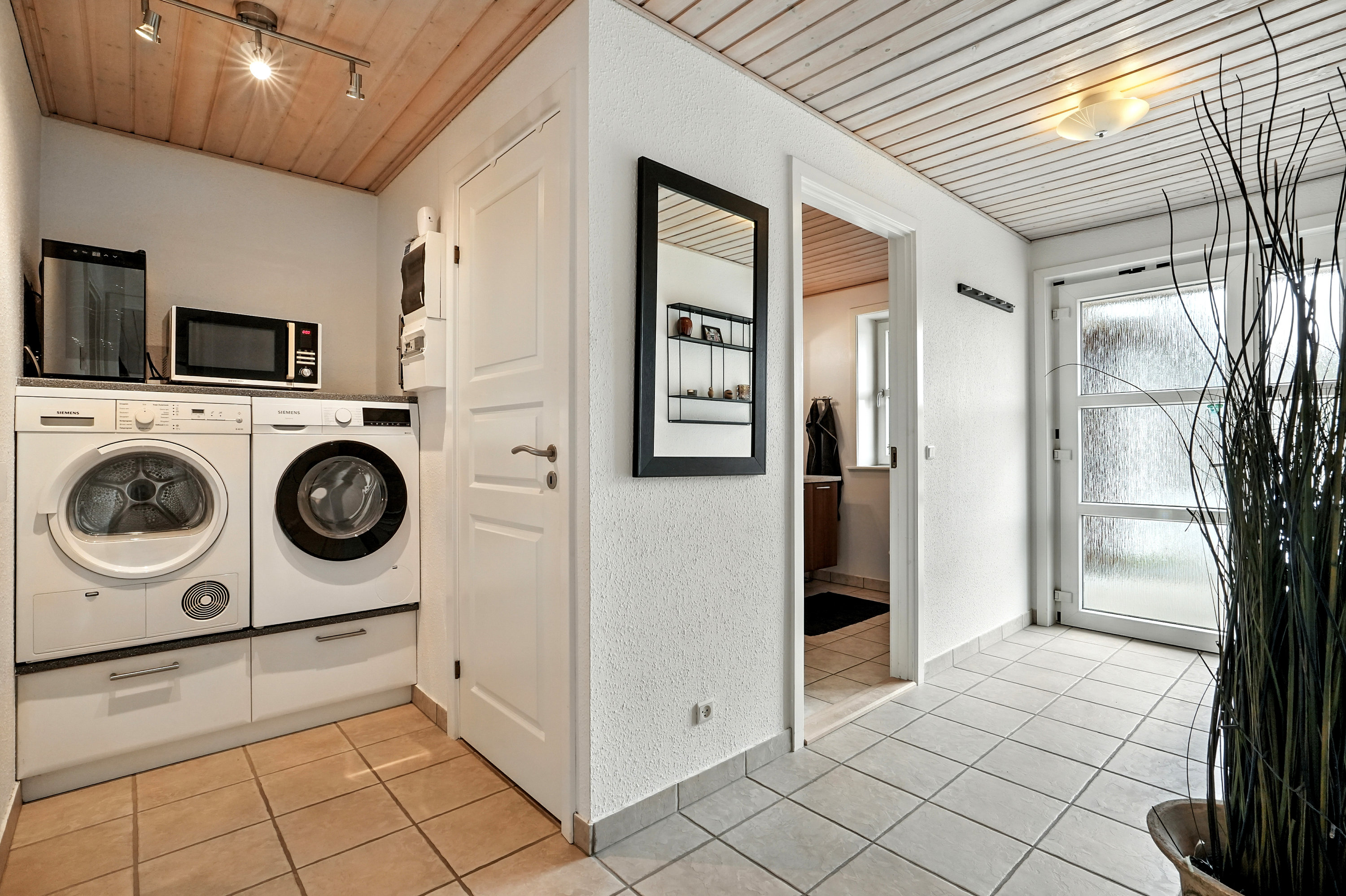 Indendørs er huset indrettet med en lys og funktionel planløsning. Du bliver budt velkommen i et klinkebelagt bryggers med plads til både vaskemaskine og tørretumbler. Herfra er der adgang til et pænt badeværelse med bruseniche og gulvvarme samt et rummeligt værelse med faste skabe.
