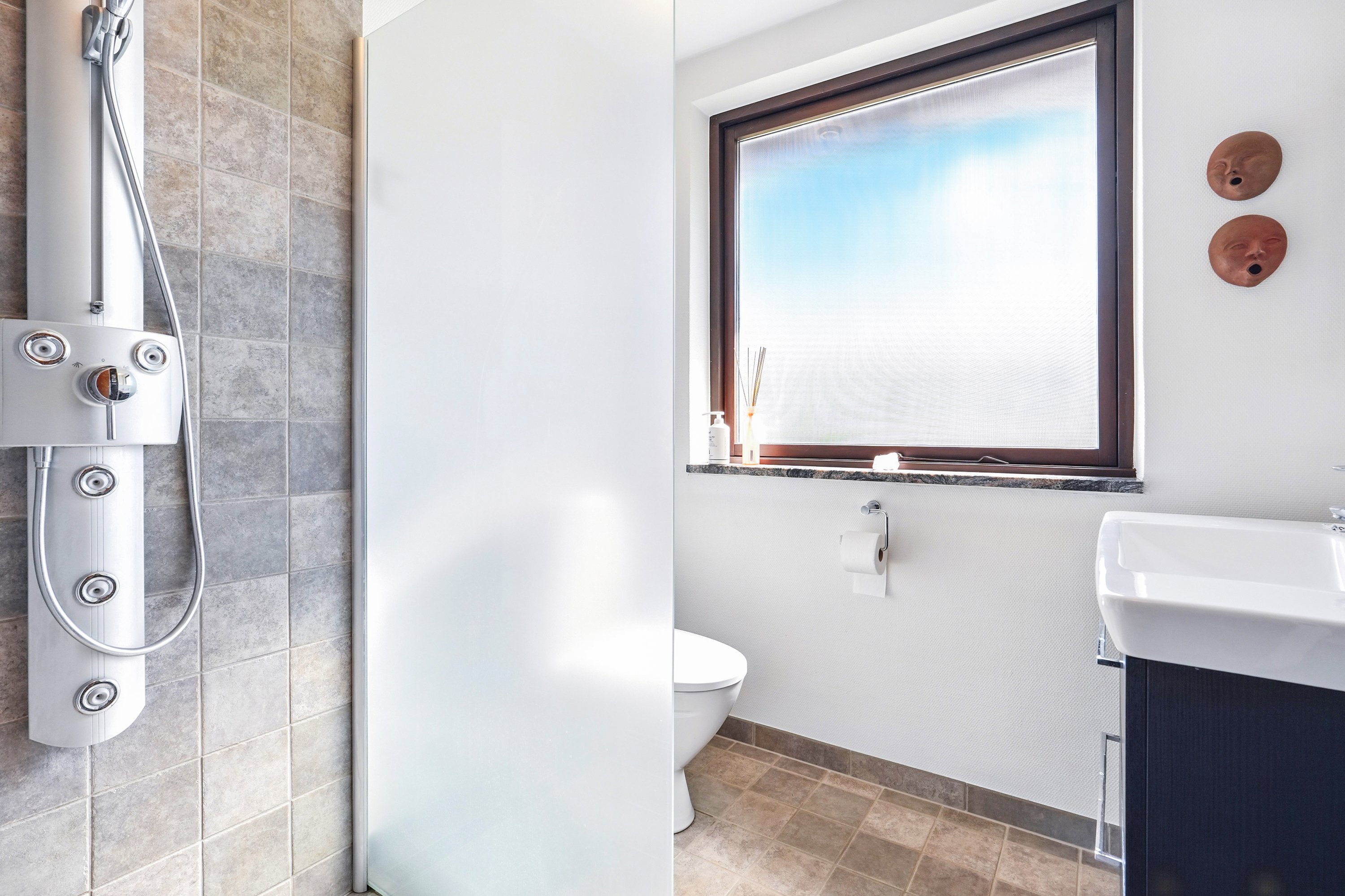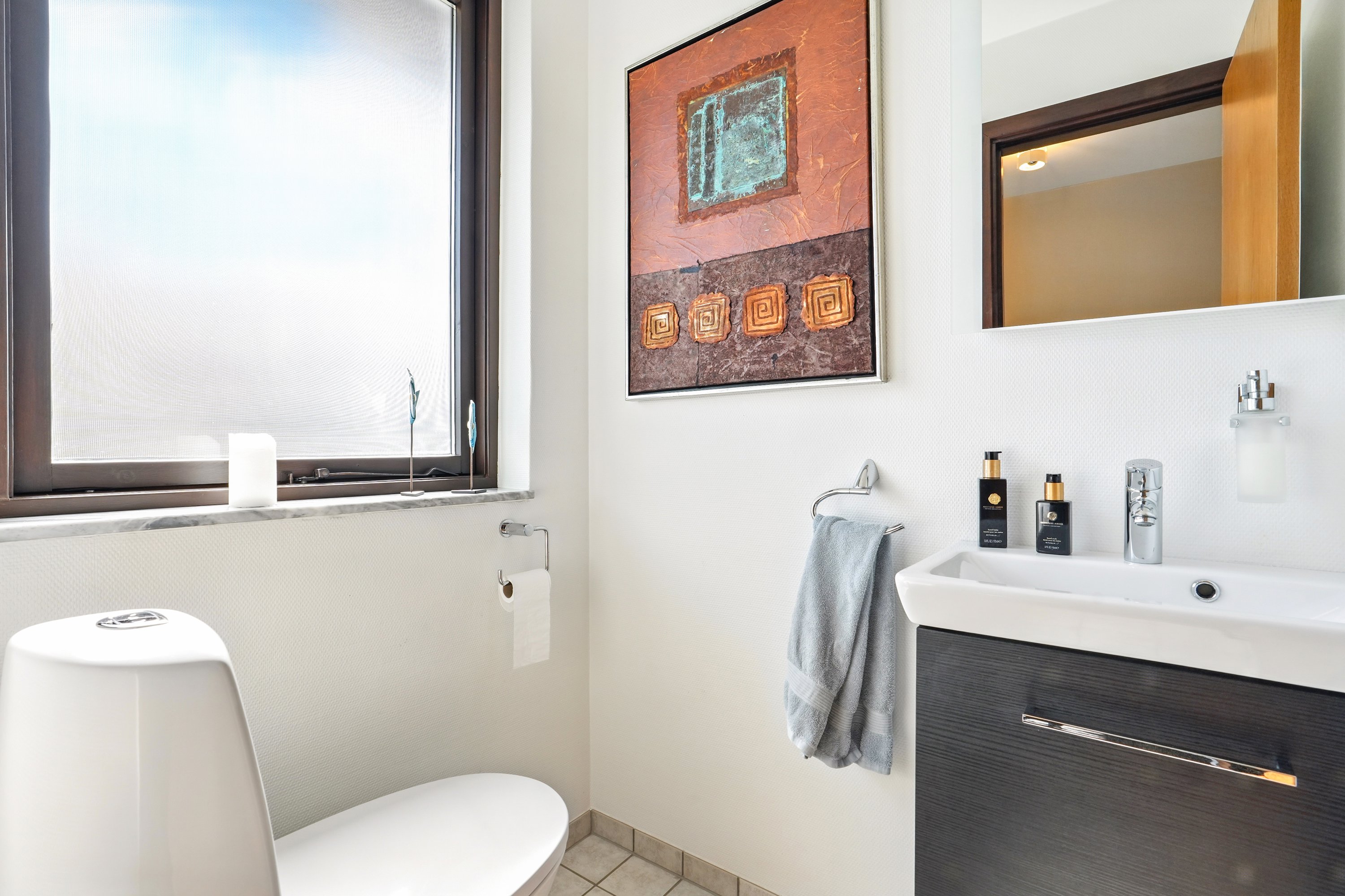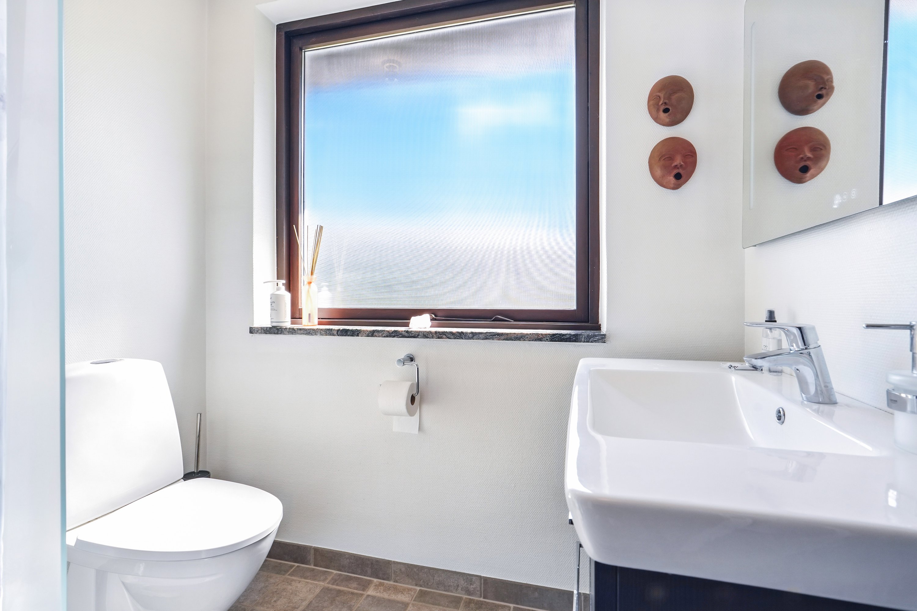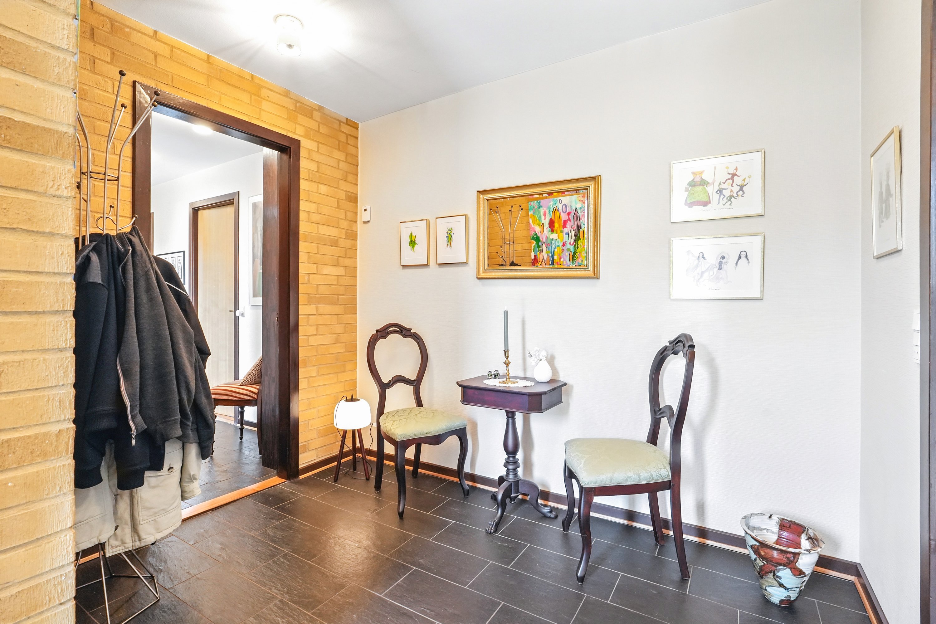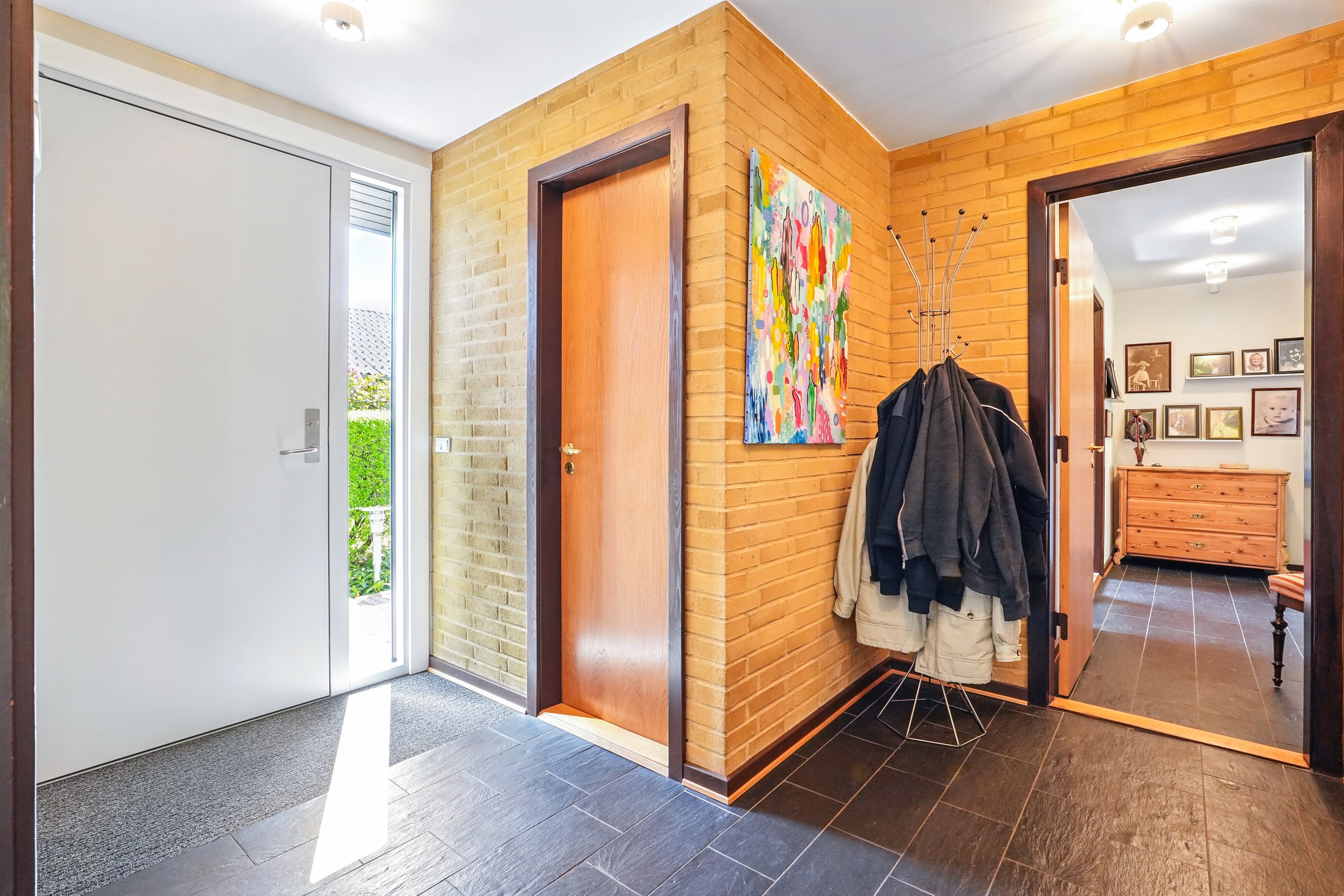 Villaens entré er åben og lys. Samtidig er det også bindeleddet i villaen, som fordeler hjemmet på en harmonisk og god måde. Der er i fobrindelse med entréen et godt gæste toilet, som fremtræder lys og indbydende.