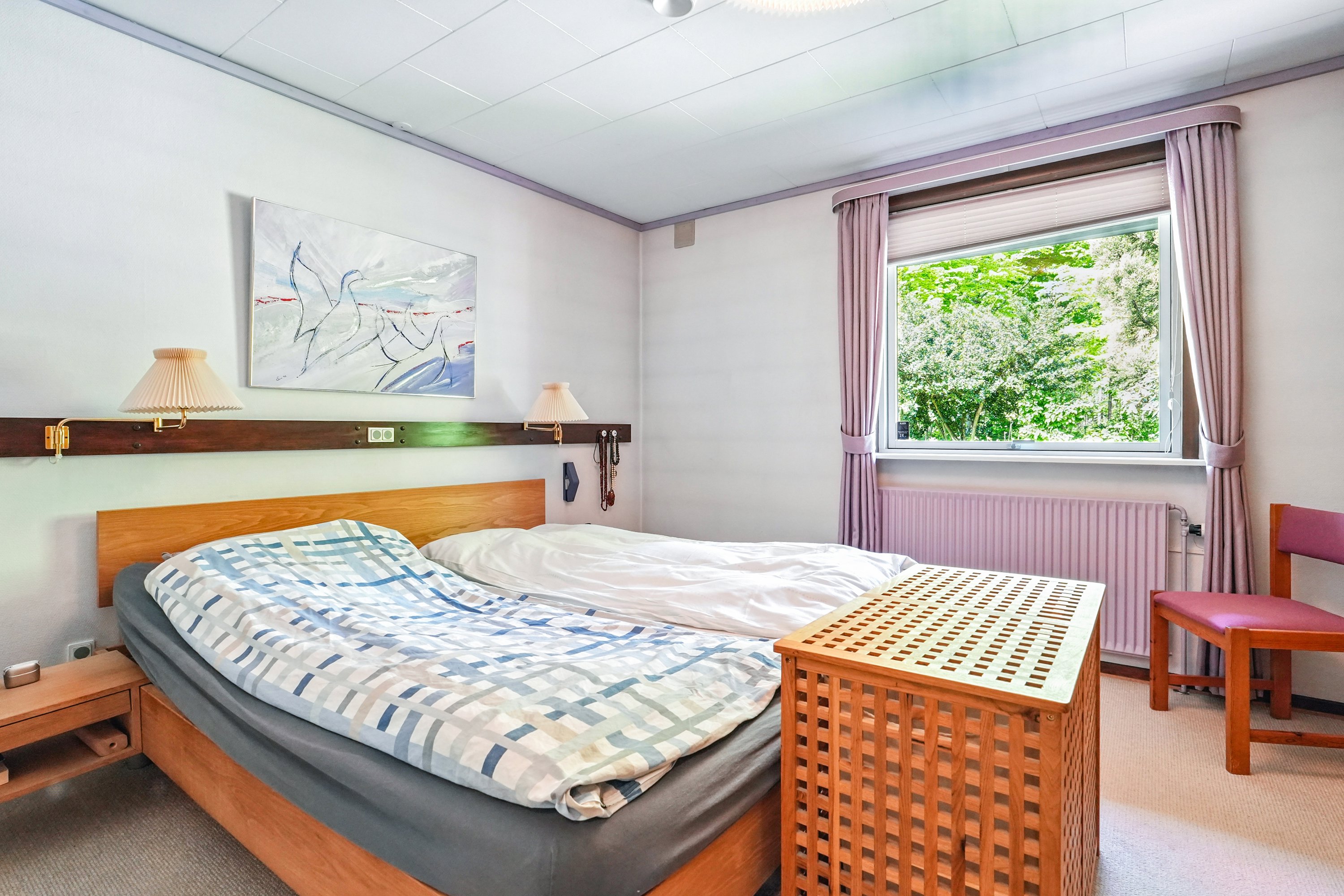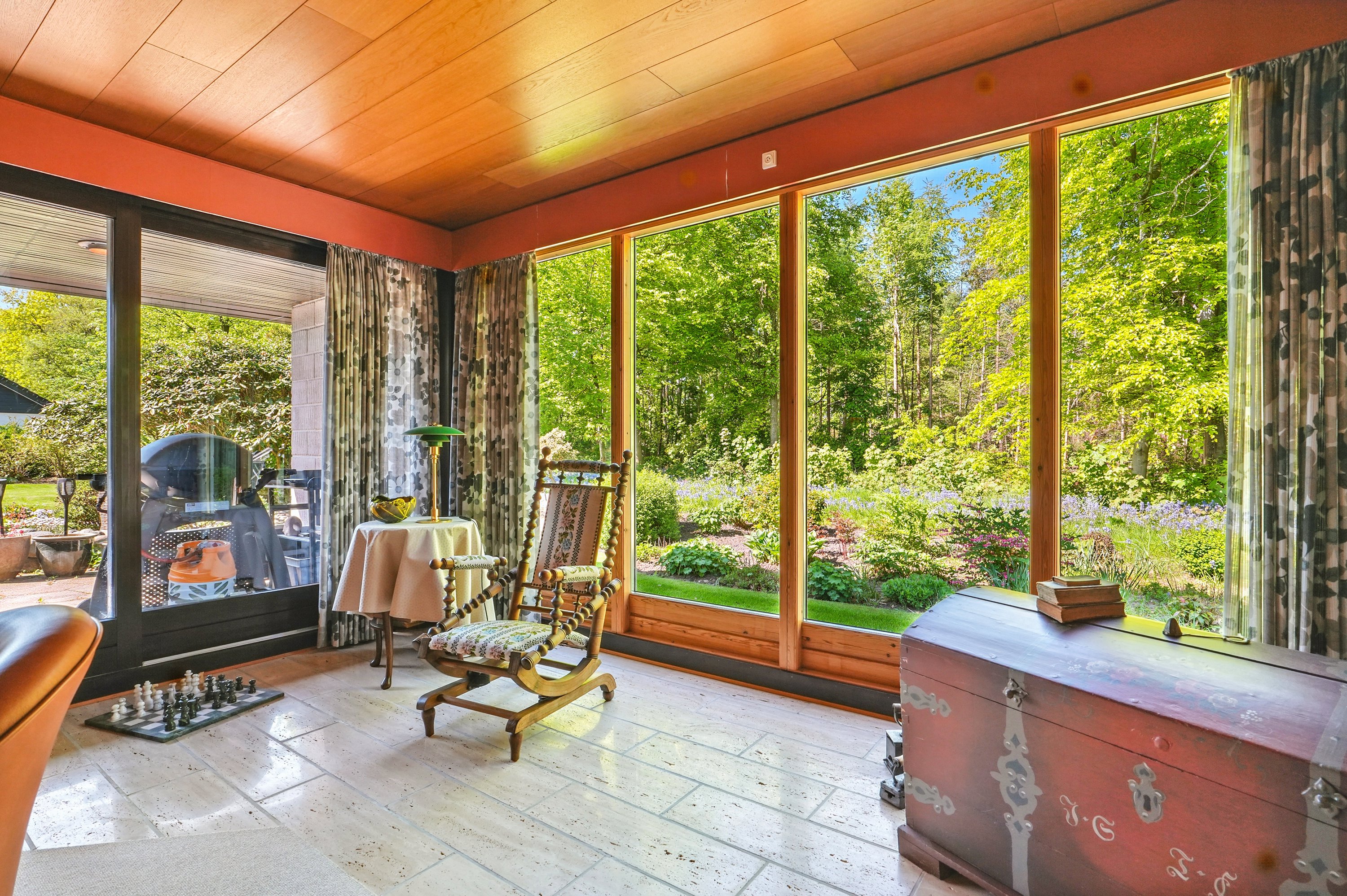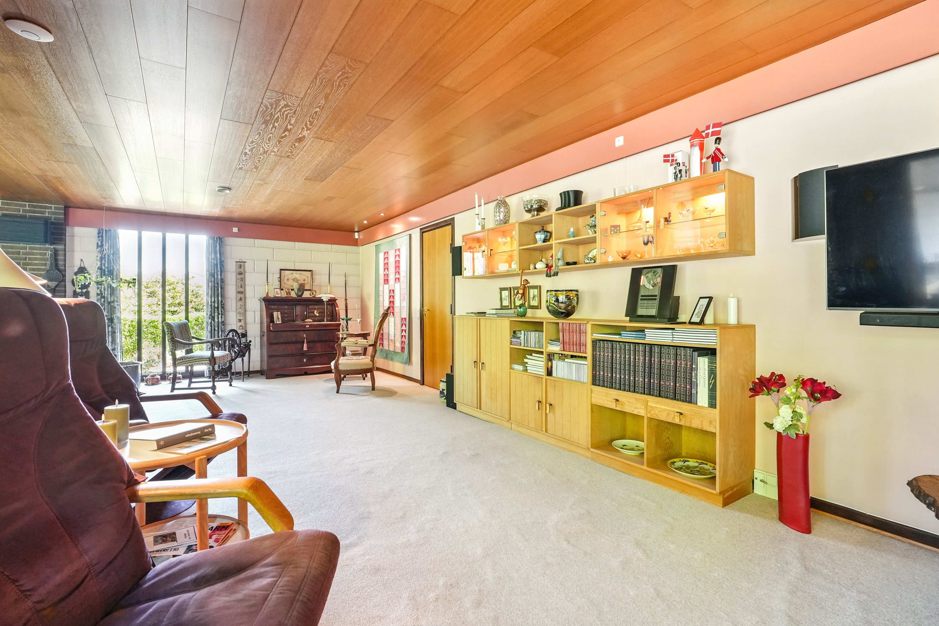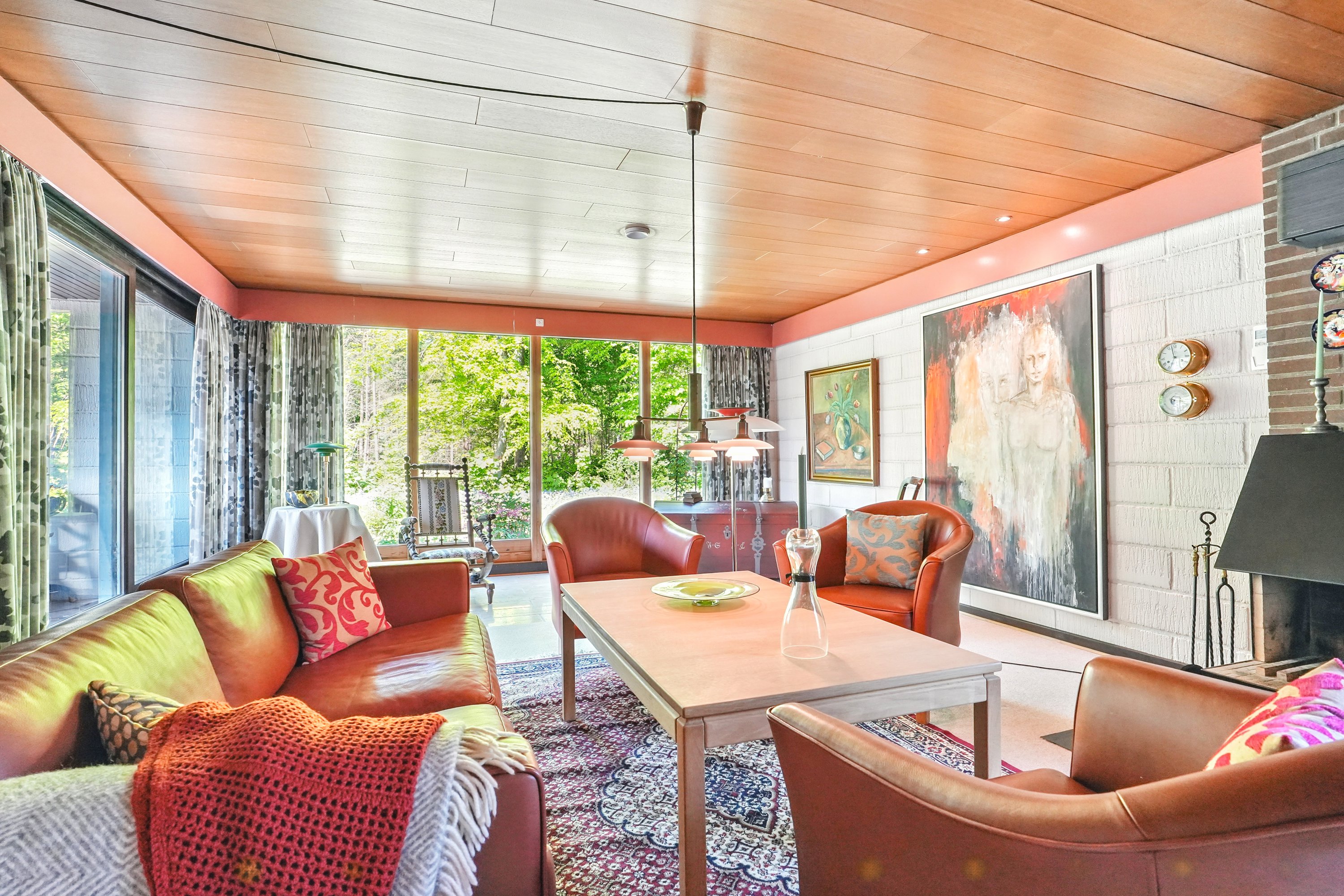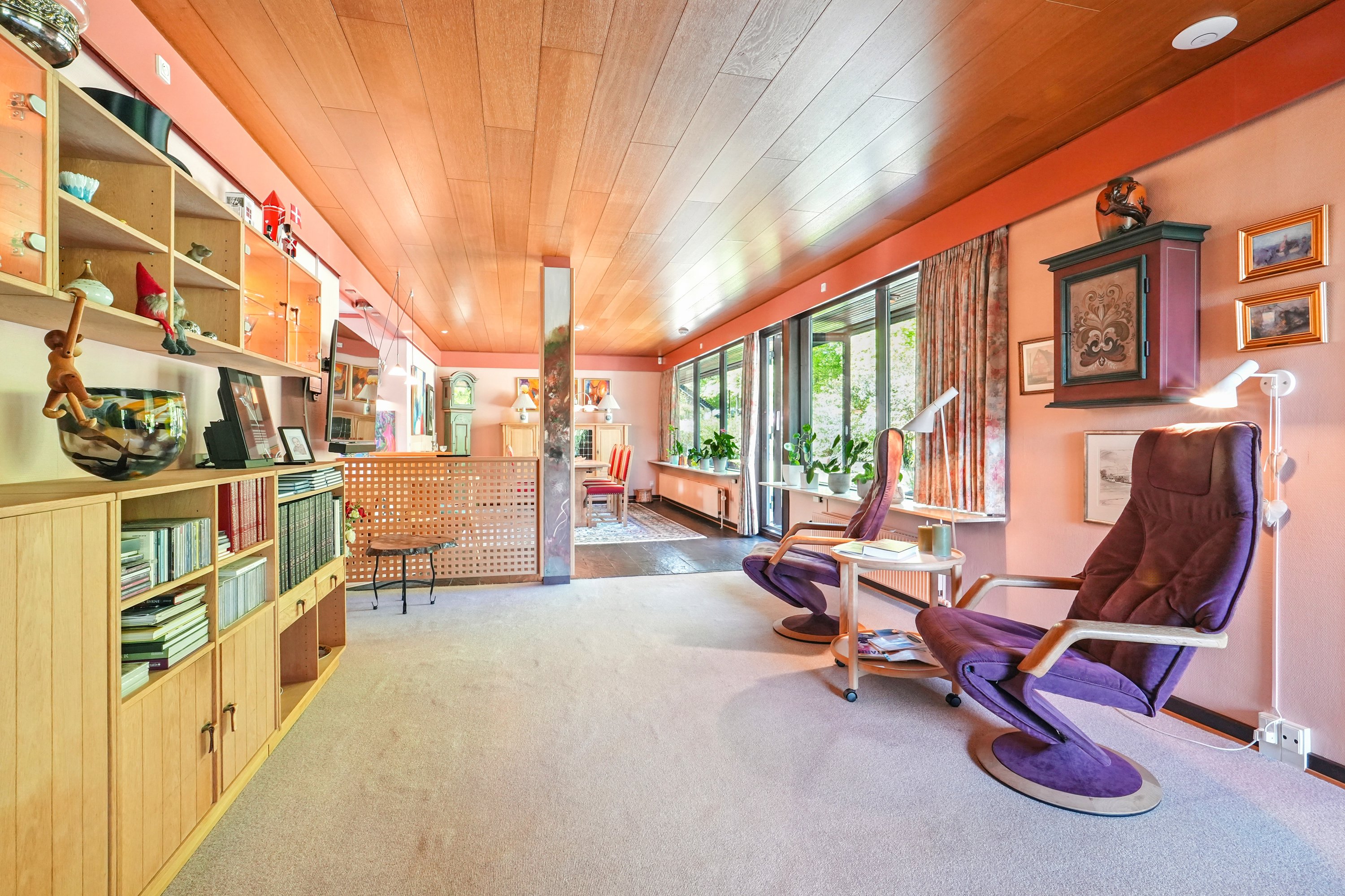 I åben forbindelse til alrummet, er der en stor vinkelstue med åben pejs. Her er der god plads til hyggekroge og samvær. Fra stuen har man mulighed for at nyde udsynet til den smukke natur og have. I forlængelse af stuen, er der yderligere et godt værelse/soveværelse, som er den ideele forældreafdeling.