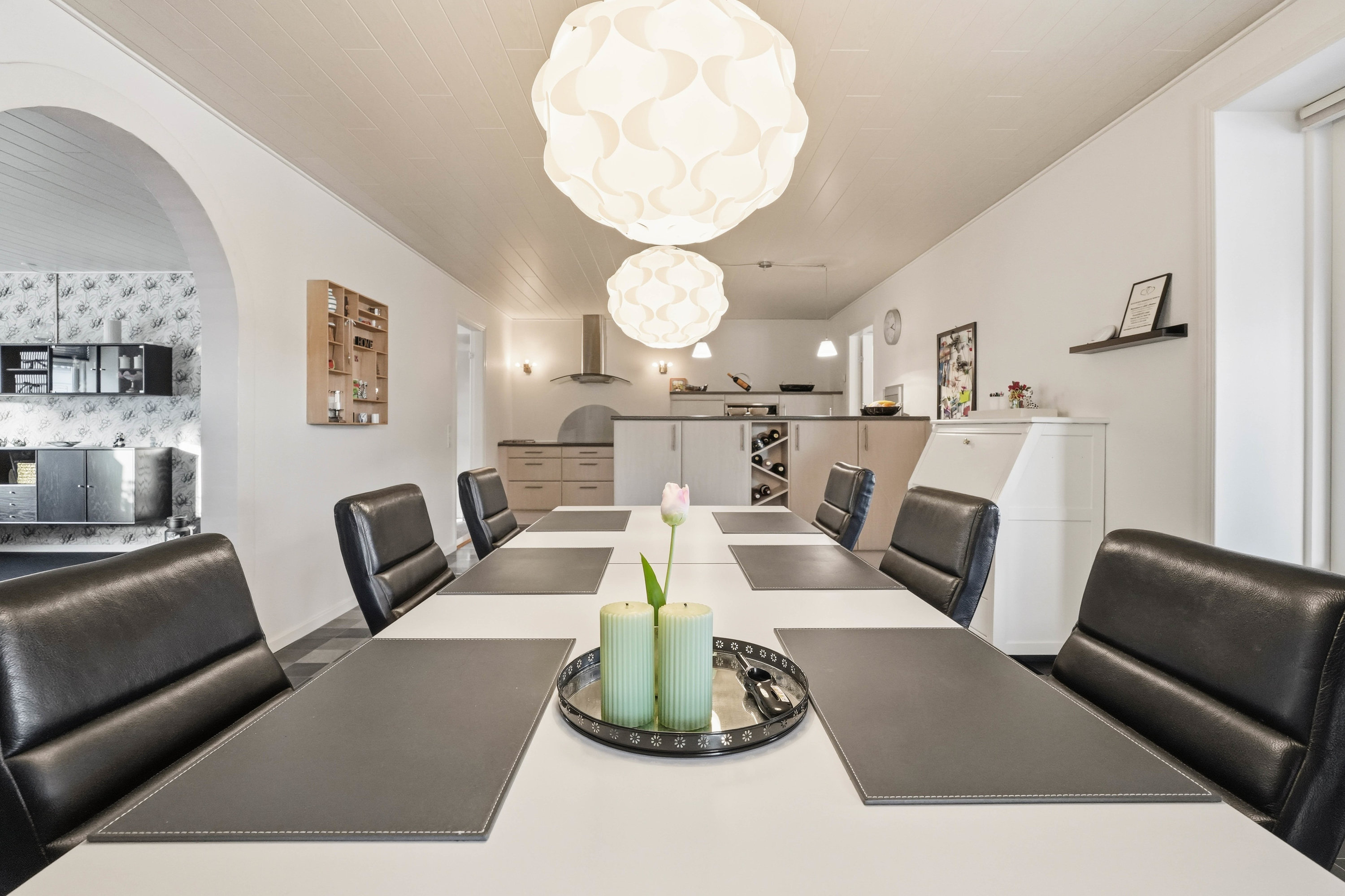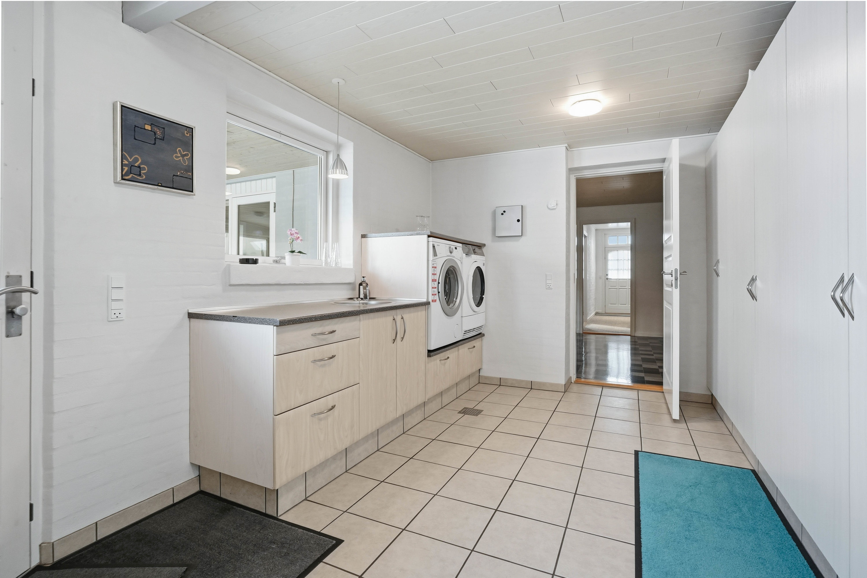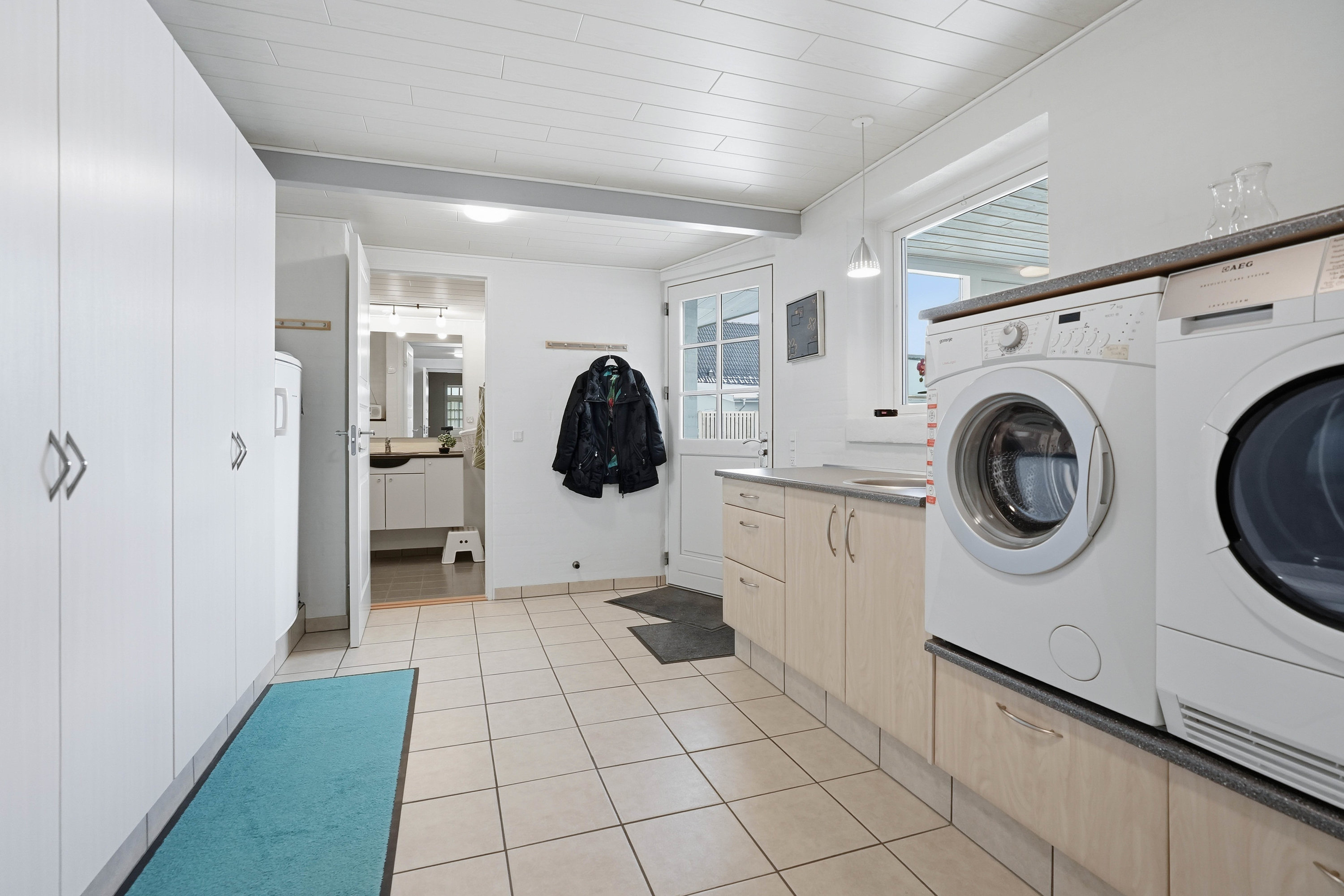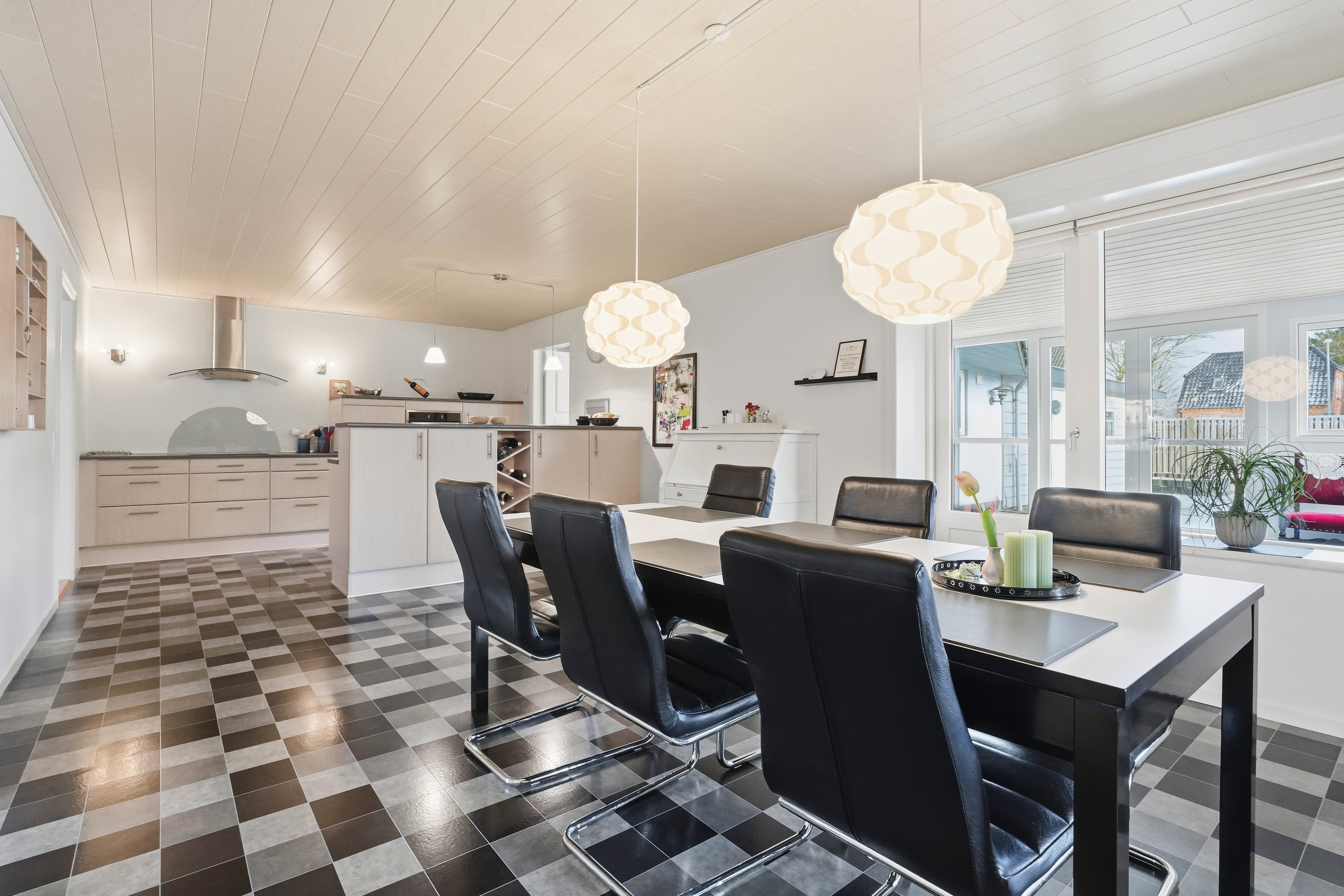 Husets naturlige samlingspunkt er det åbne køkken- og spiseområde, som ligger i direkte forbindelse med hinanden. Køkkenet fremstår funktionelt med god skabs- og bordplads, mens spiseområdet har rigelig plads til det store spisebord, hvor familie og venner kan samles. Herfra er der direkte adgang til den lyse udestue, som tilfører boligen ekstra opholdsplads og skaber en skøn overgang mellem inde- og udeliv med udsigt til haven. Fra køkkenområdet er der adgang til det praktiske bryggers med plads til vaskefaciliteter og god opbevaring. I forlængelse heraf ligger husets ene badeværelse, hvilket er en særdeles praktisk løsning i hverdagen.