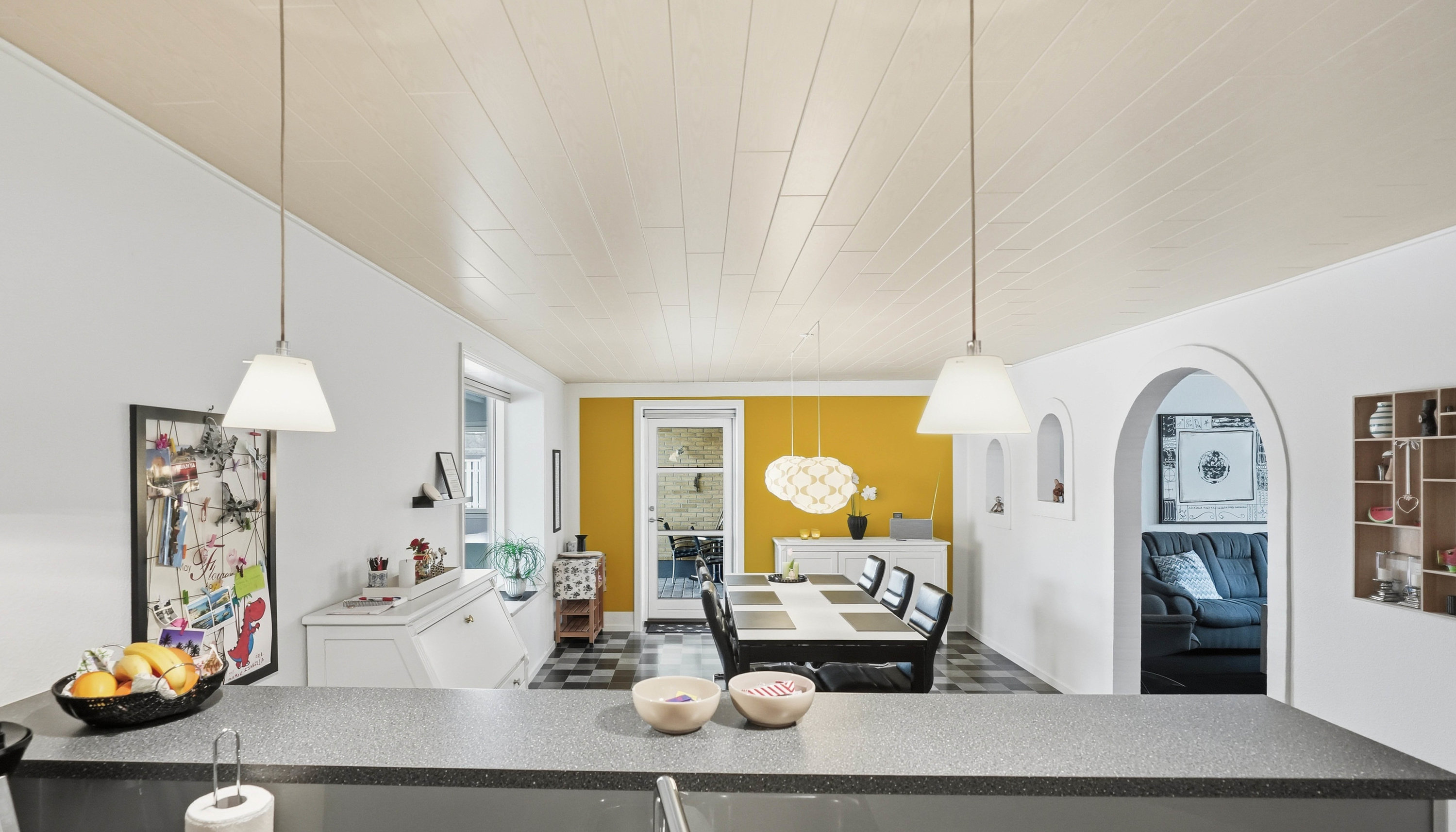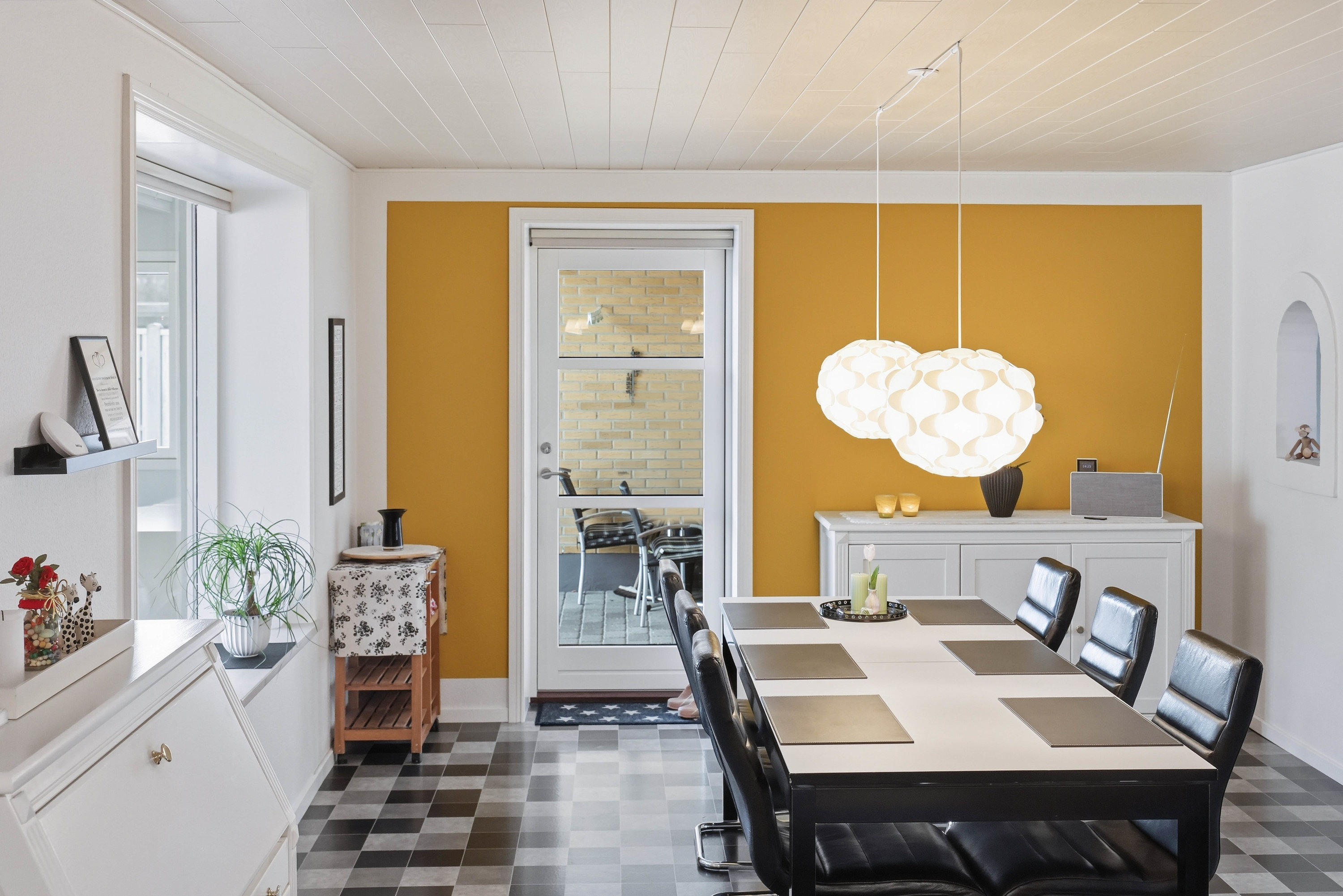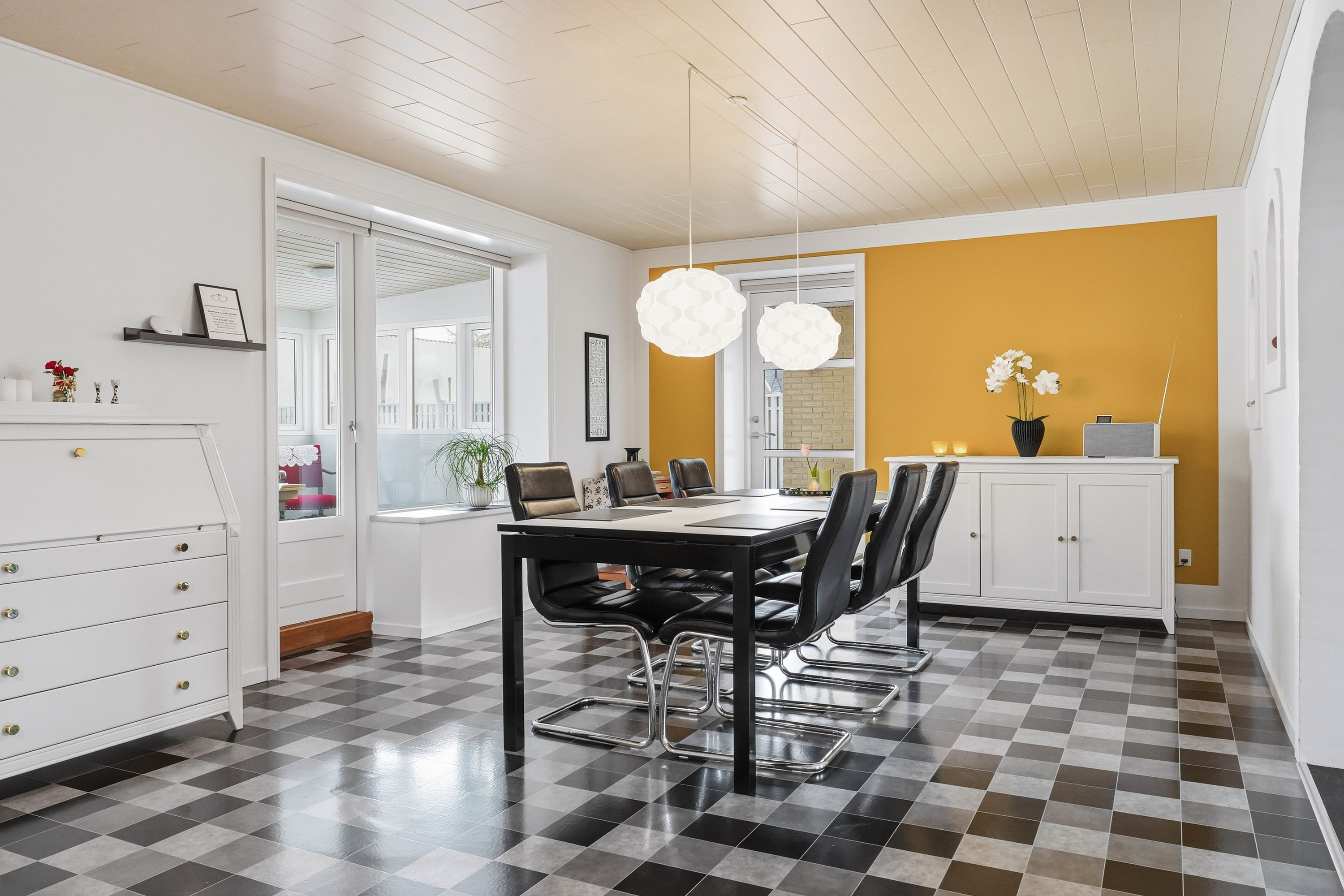 Husets naturlige samlingspunkt er det åbne køkken- og spiseområde, som ligger i direkte forbindelse med hinanden. Køkkenet fremstår funktionelt med god skabs- og bordplads, mens spiseområdet har rigelig plads til det store spisebord, hvor familie og venner kan samles. Herfra er der direkte adgang til den lyse udestue, som tilfører boligen ekstra opholdsplads og skaber en skøn overgang mellem inde- og udeliv med udsigt til haven. Fra køkkenområdet er der adgang til det praktiske bryggers med plads til vaskefaciliteter og god opbevaring. I forlængelse heraf ligger husets ene badeværelse, hvilket er en særdeles praktisk løsning i hverdagen.