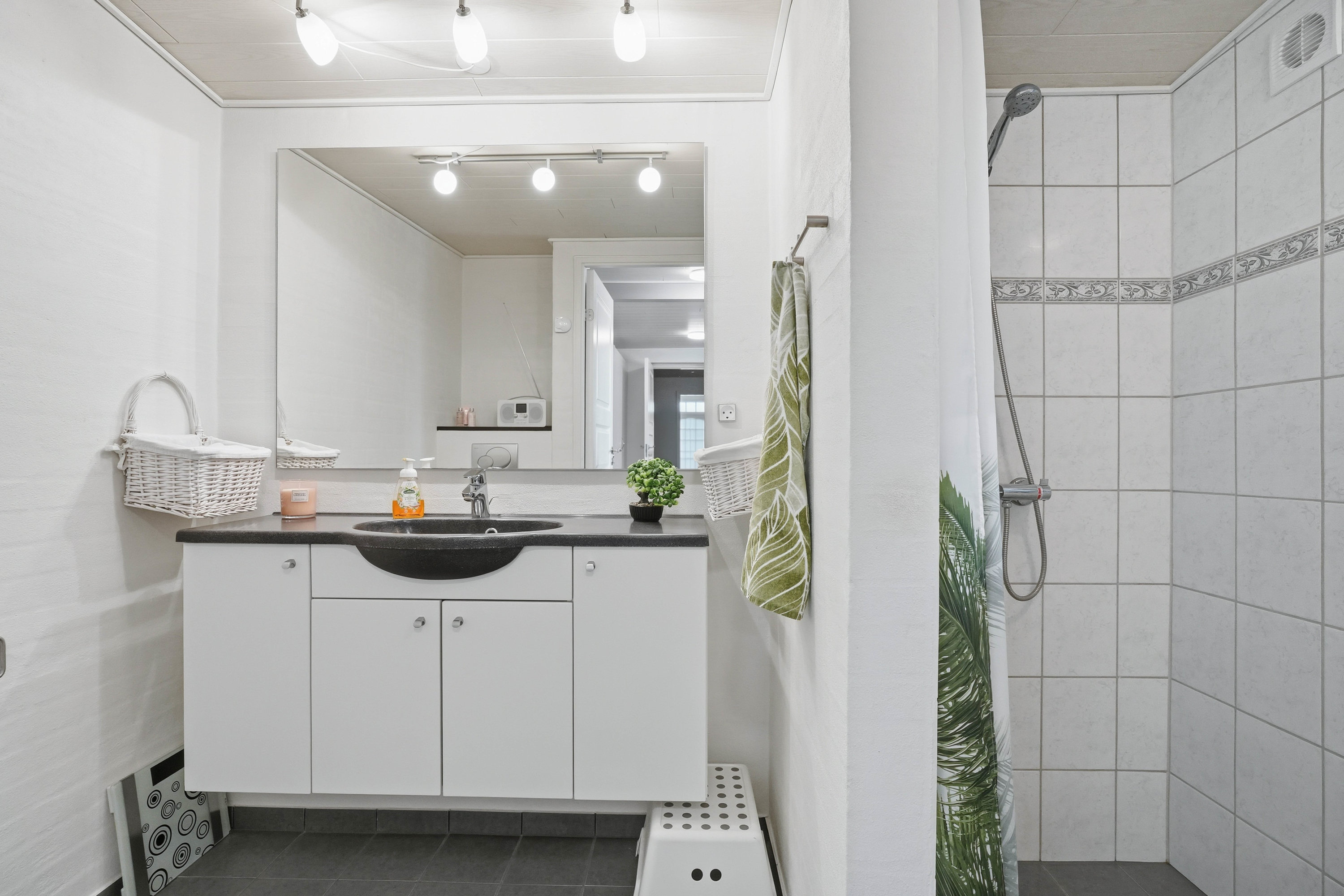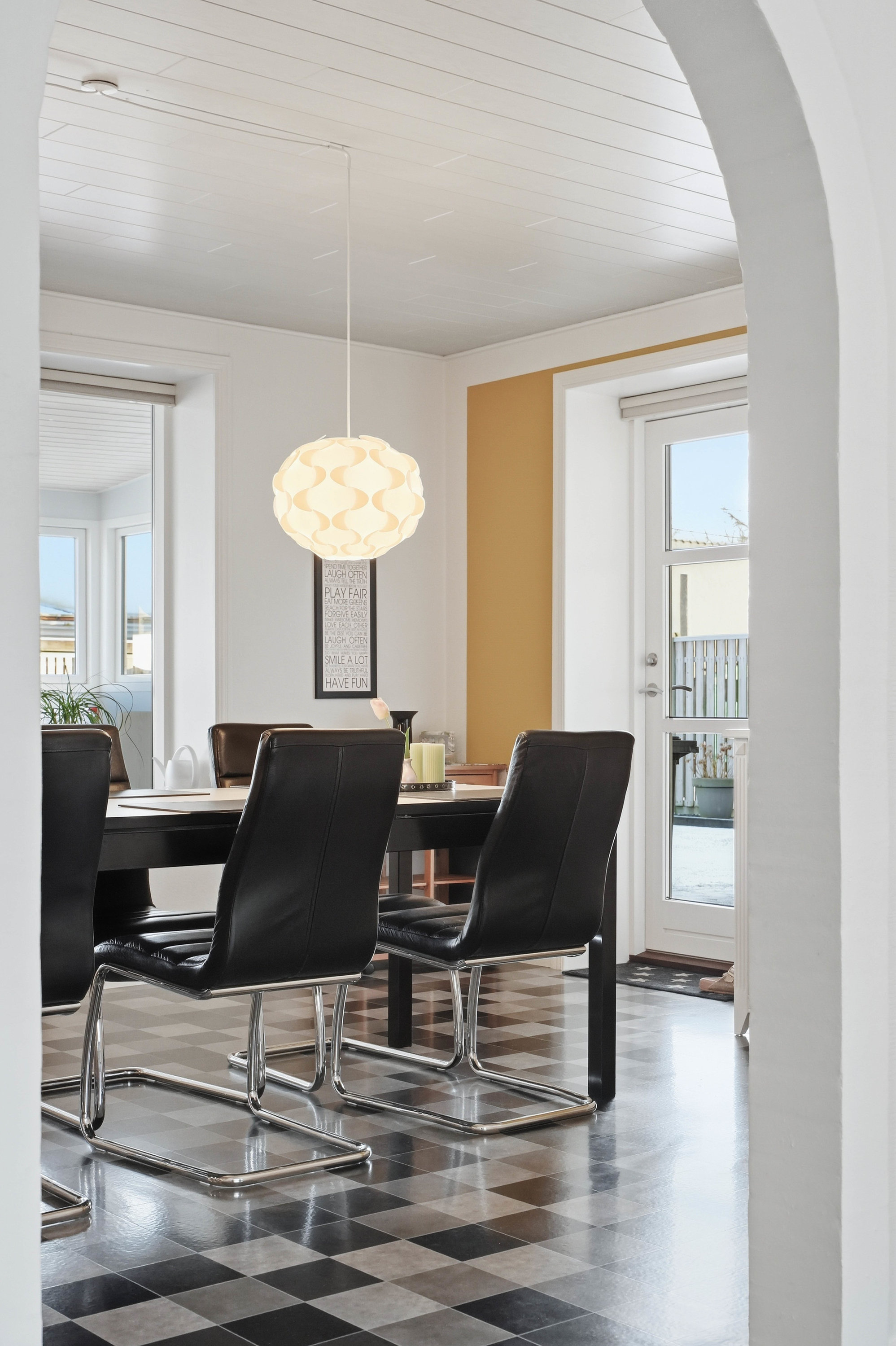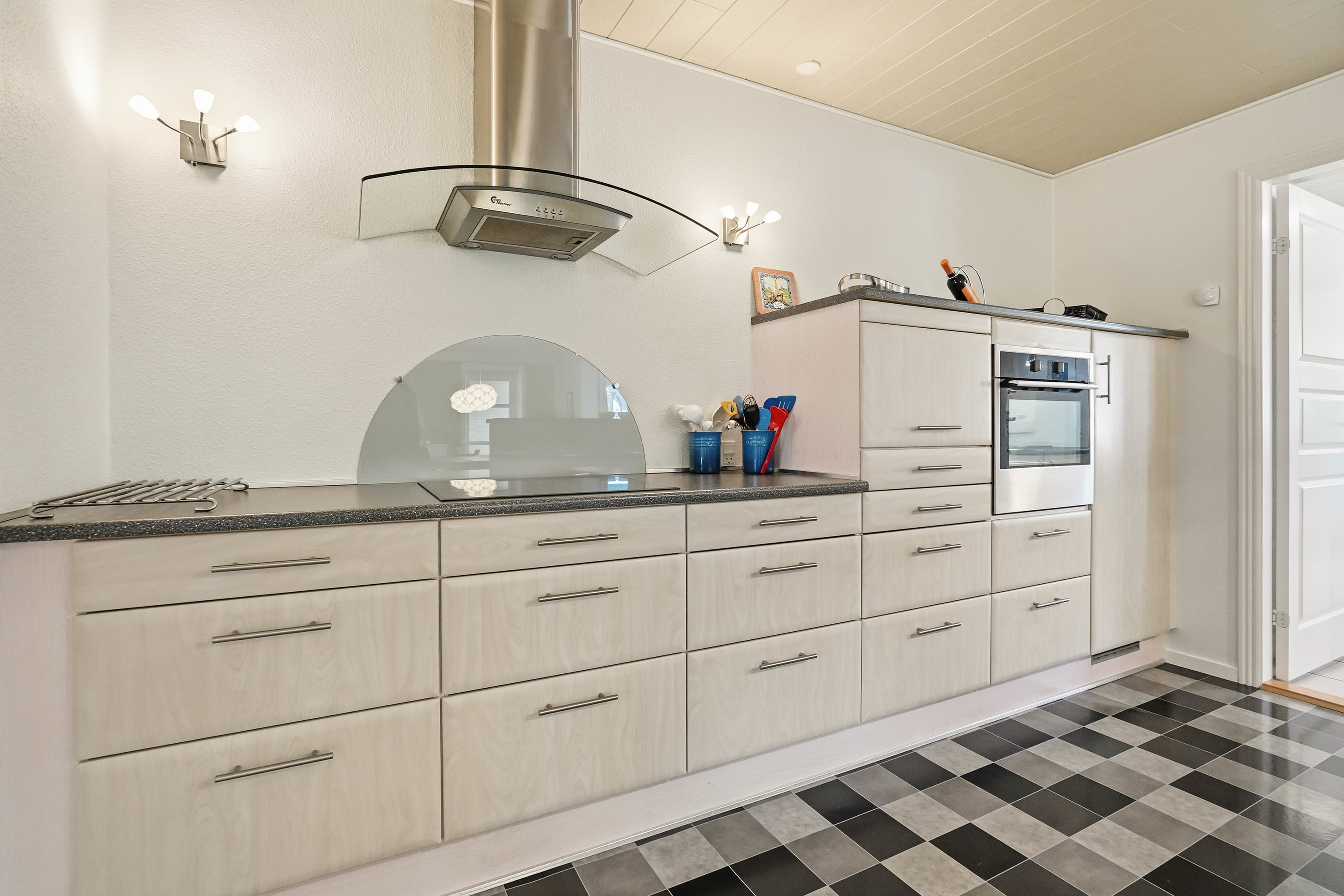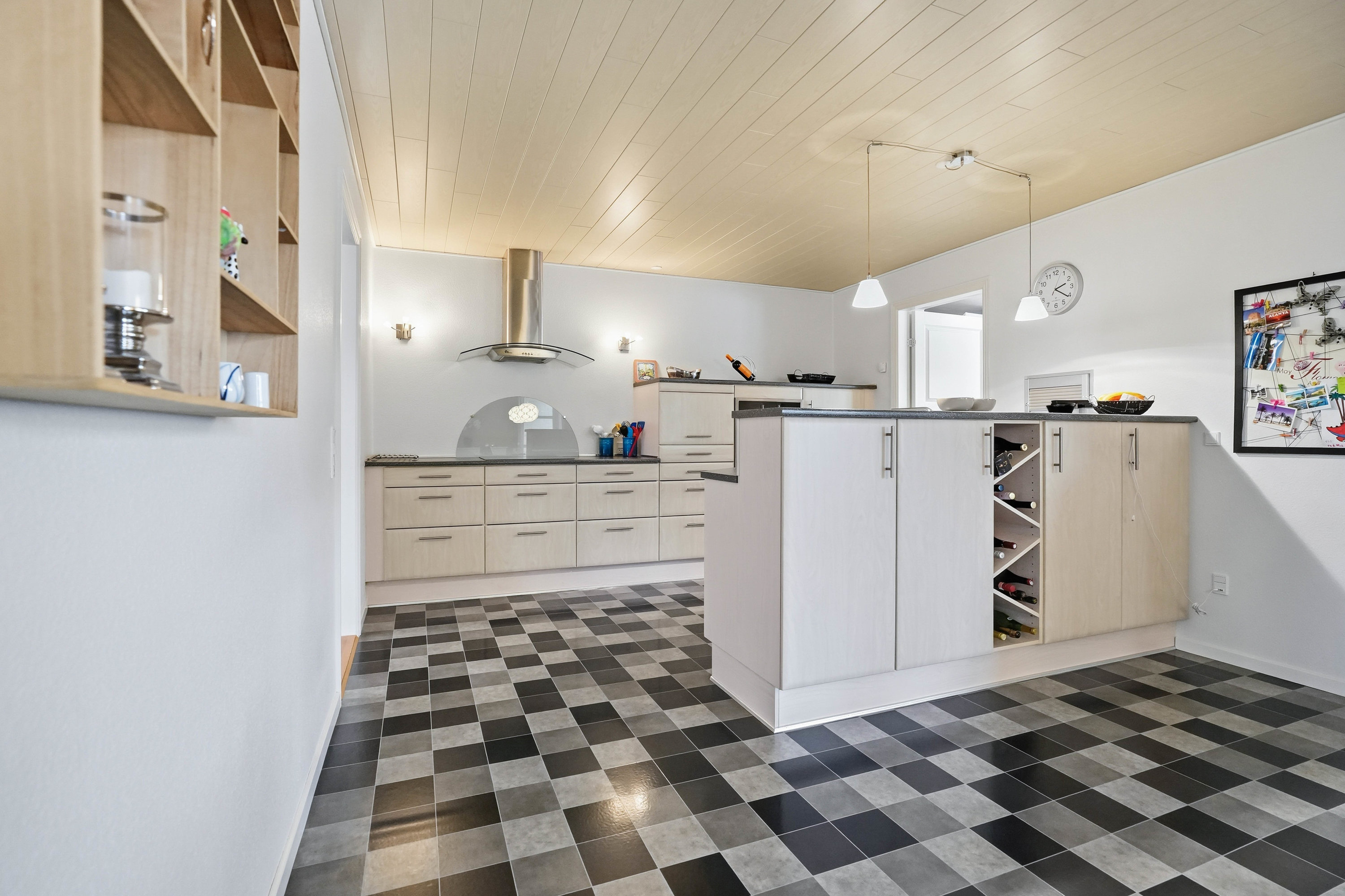 Husets naturlige samlingspunkt er det åbne køkken- og spiseområde, som ligger i direkte forbindelse med hinanden. Køkkenet fremstår funktionelt med god skabs- og bordplads, mens spiseområdet har rigelig plads til det store spisebord, hvor familie og venner kan samles. Herfra er der direkte adgang til den lyse udestue, som tilfører boligen ekstra opholdsplads og skaber en skøn overgang mellem inde- og udeliv med udsigt til haven. Fra køkkenområdet er der adgang til det praktiske bryggers med plads til vaskefaciliteter og god opbevaring. I forlængelse heraf ligger husets ene badeværelse, hvilket er en særdeles praktisk løsning i hverdagen.