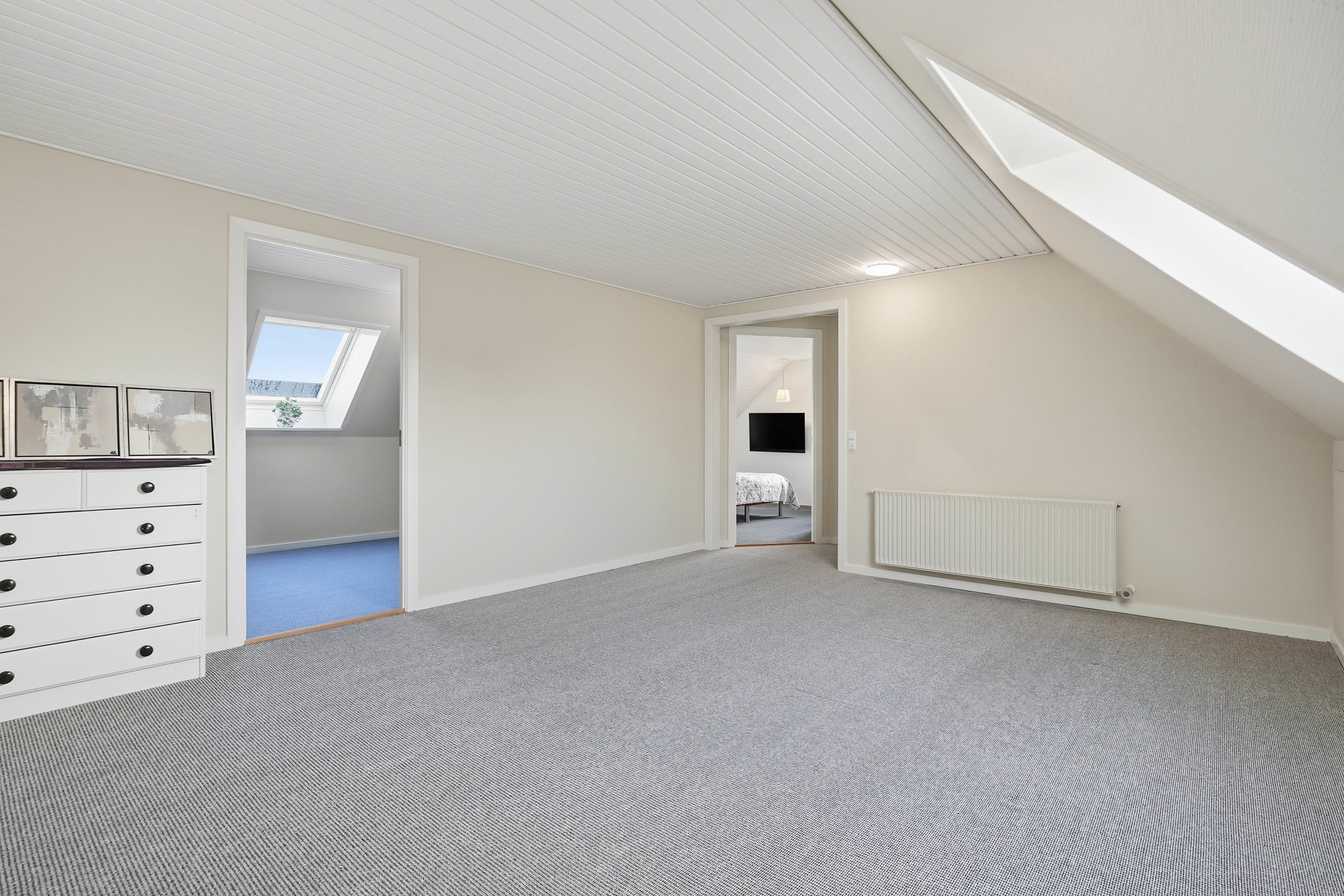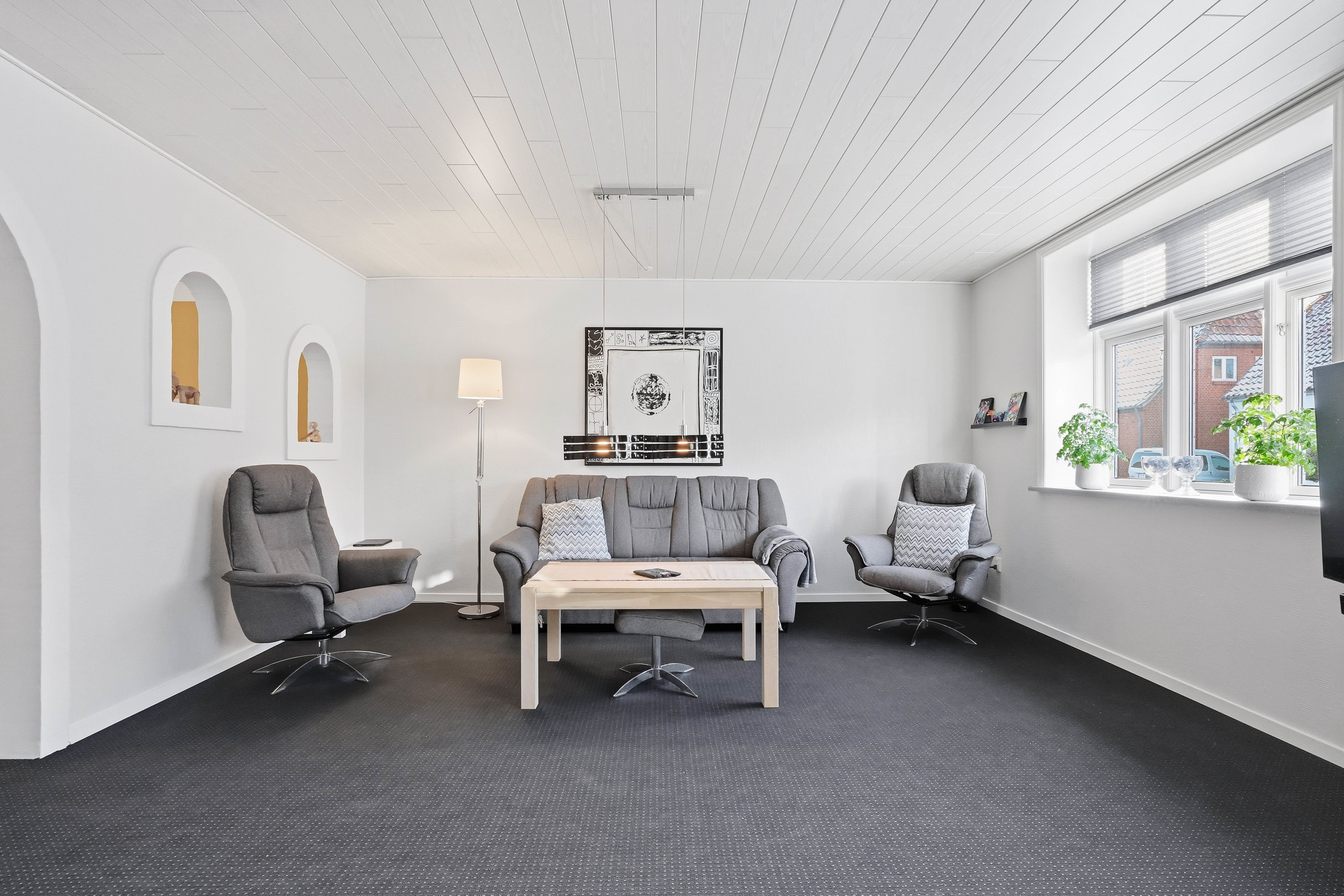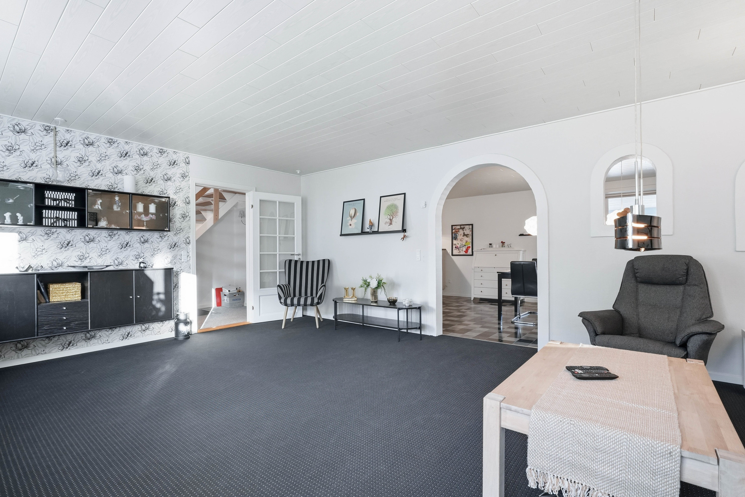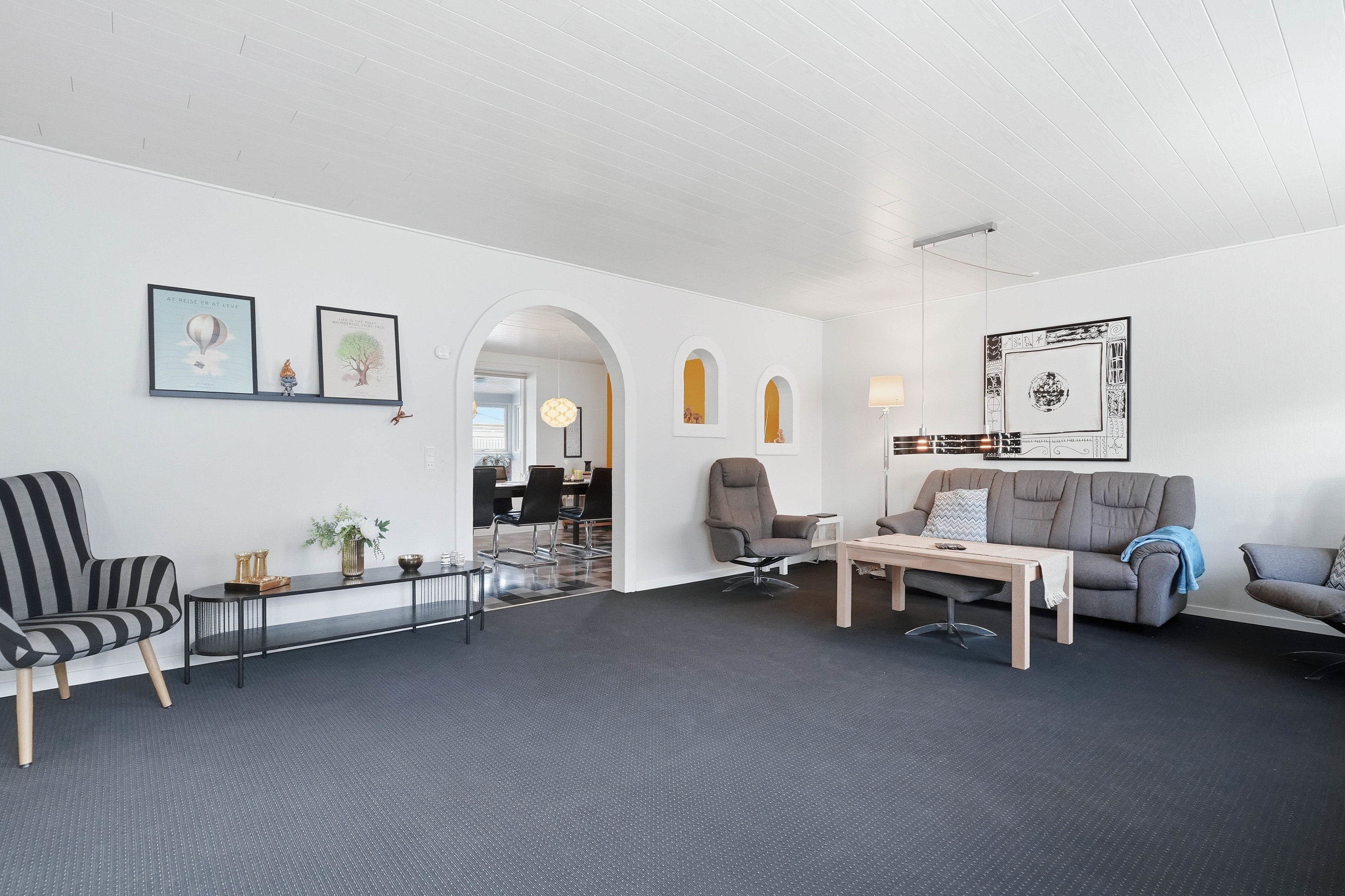 Opholdsstuen er rummelig og indbyder til hyggelige stunder med gode indretningsmuligheder til både sofa- og tv-afdeling. Den naturlige sammenhæng mellem rummene skaber en behagelig atmosfære, som fungerer perfekt til både hverdag og gæstebesøg.