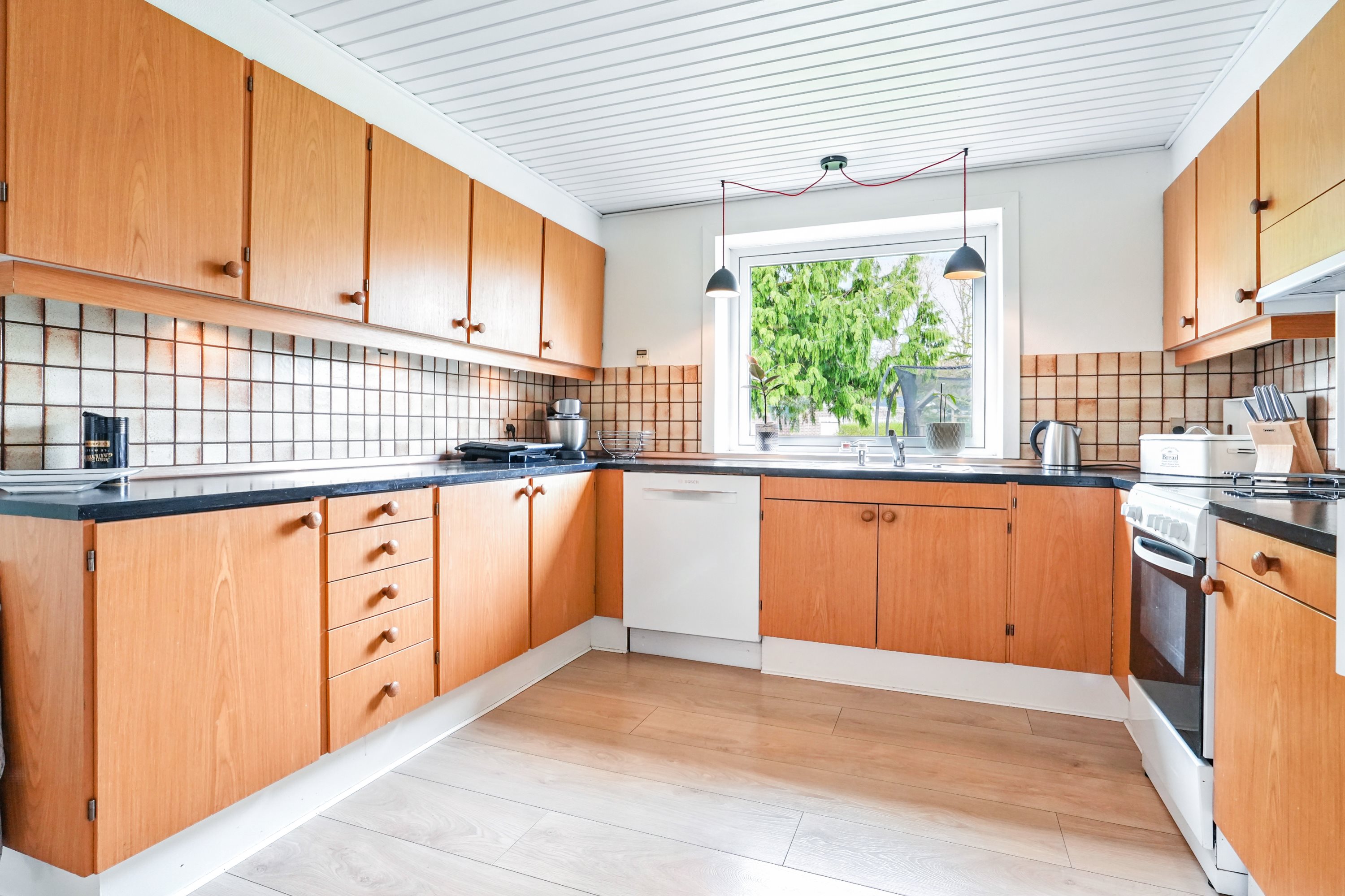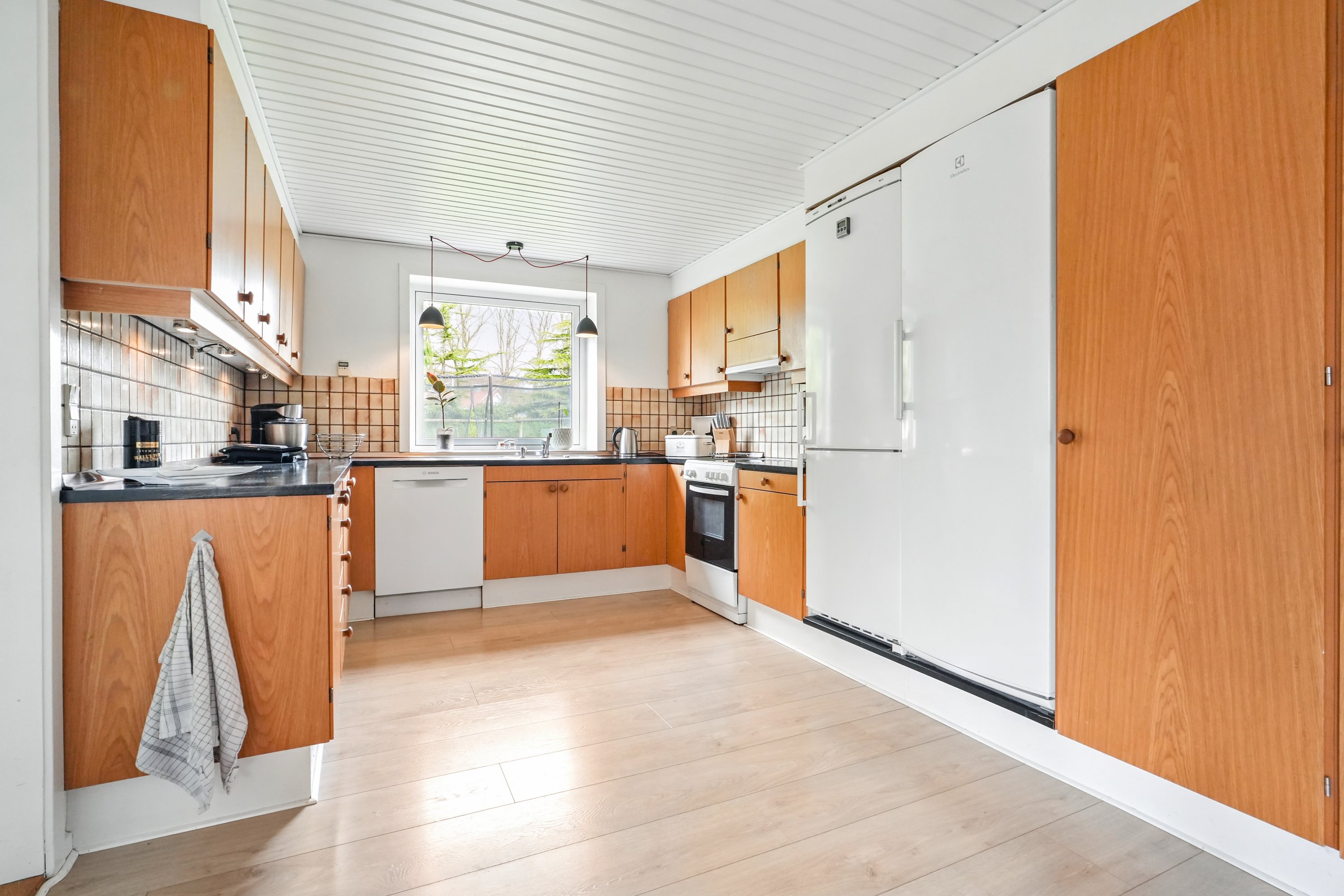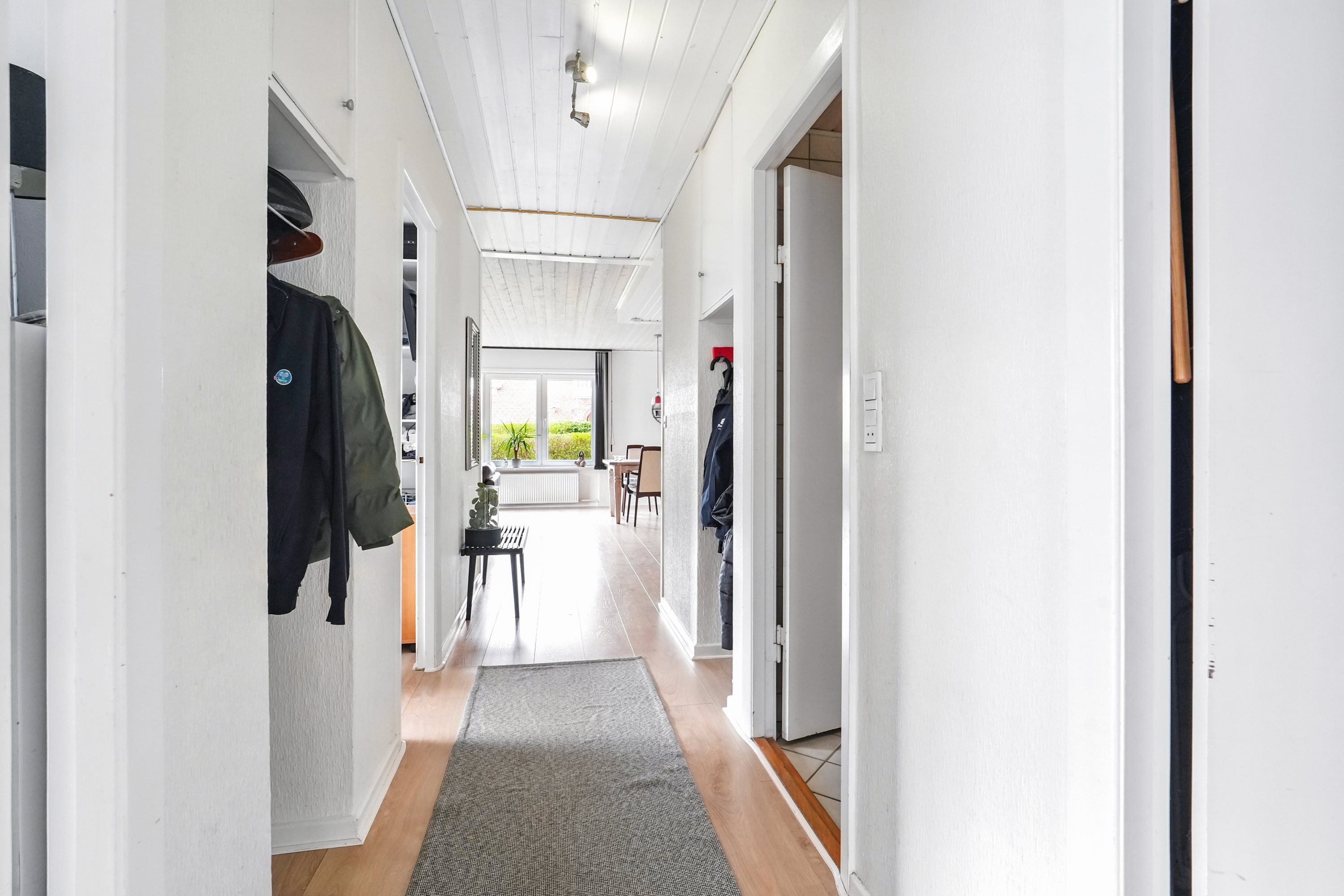 Stuen er møbleringsvenlig og hyggelig. Her er der plads til mange gode stunder for hele familien, mens køkkenet byder på masser af skabs- og bordplads, til den pladskrævende familie.