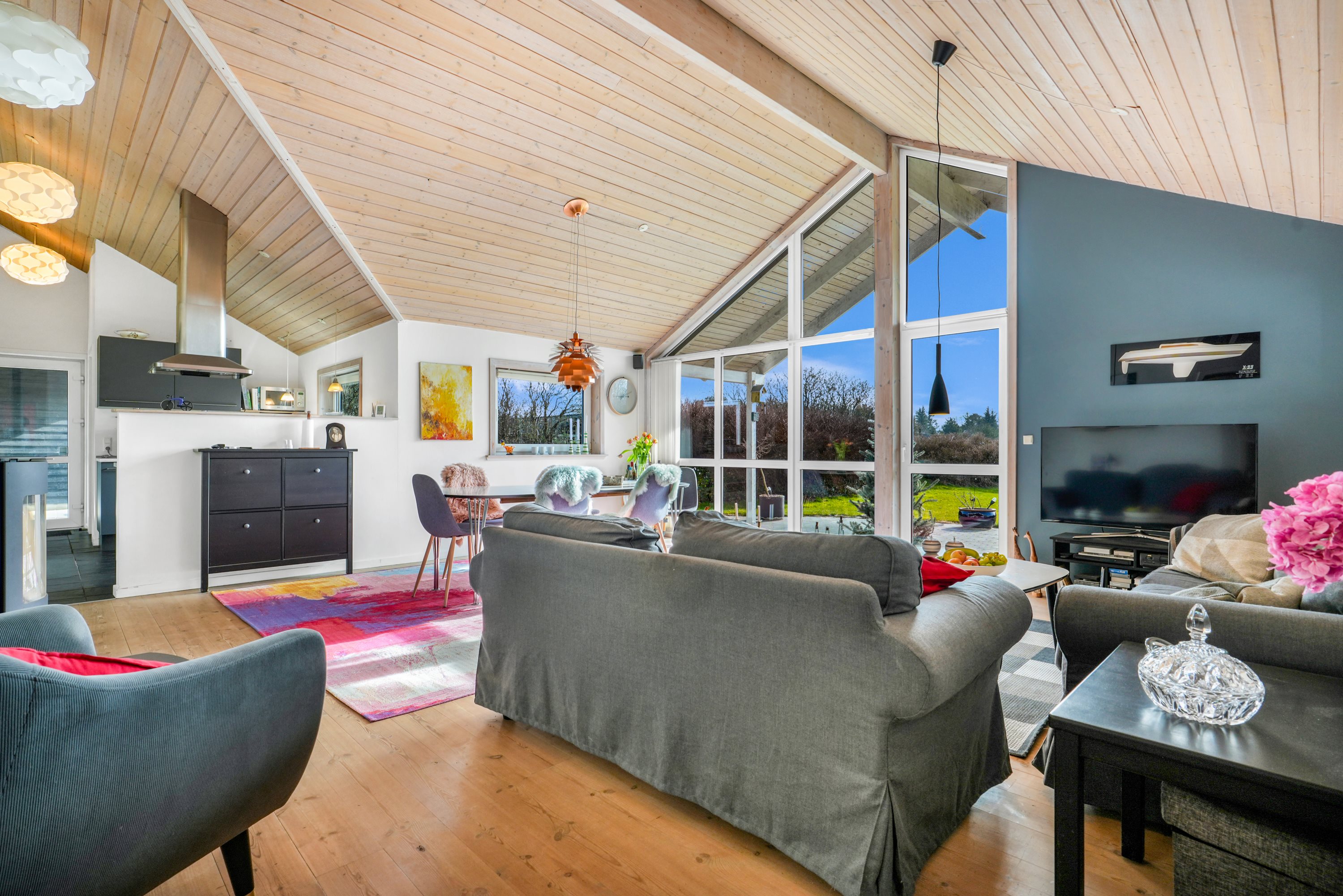 Huset er med loft-til-kip og i køkken-alrummet som er i forbindelse med stuen finder du også vindue-til-kip, som giver et fantastisk lysindfald og giver en god følelse af rummelighed imens du kan nyde udsigten ud til terrassen og haven. Indretningen er lys og indeholder entré, 4 soveværelser + hems. 2 dejlige badeværelser med bruseniche og væghængte toiletter, det éne med sauna og badekar. Dejligt samtalekøkken med halvvæg og alt i hårde hvidevarer som er i åben forbindelse med alrummet og stuen. Fra stuen er der direkte udgang til den førnævnte terrasse og ikke mindst haven.