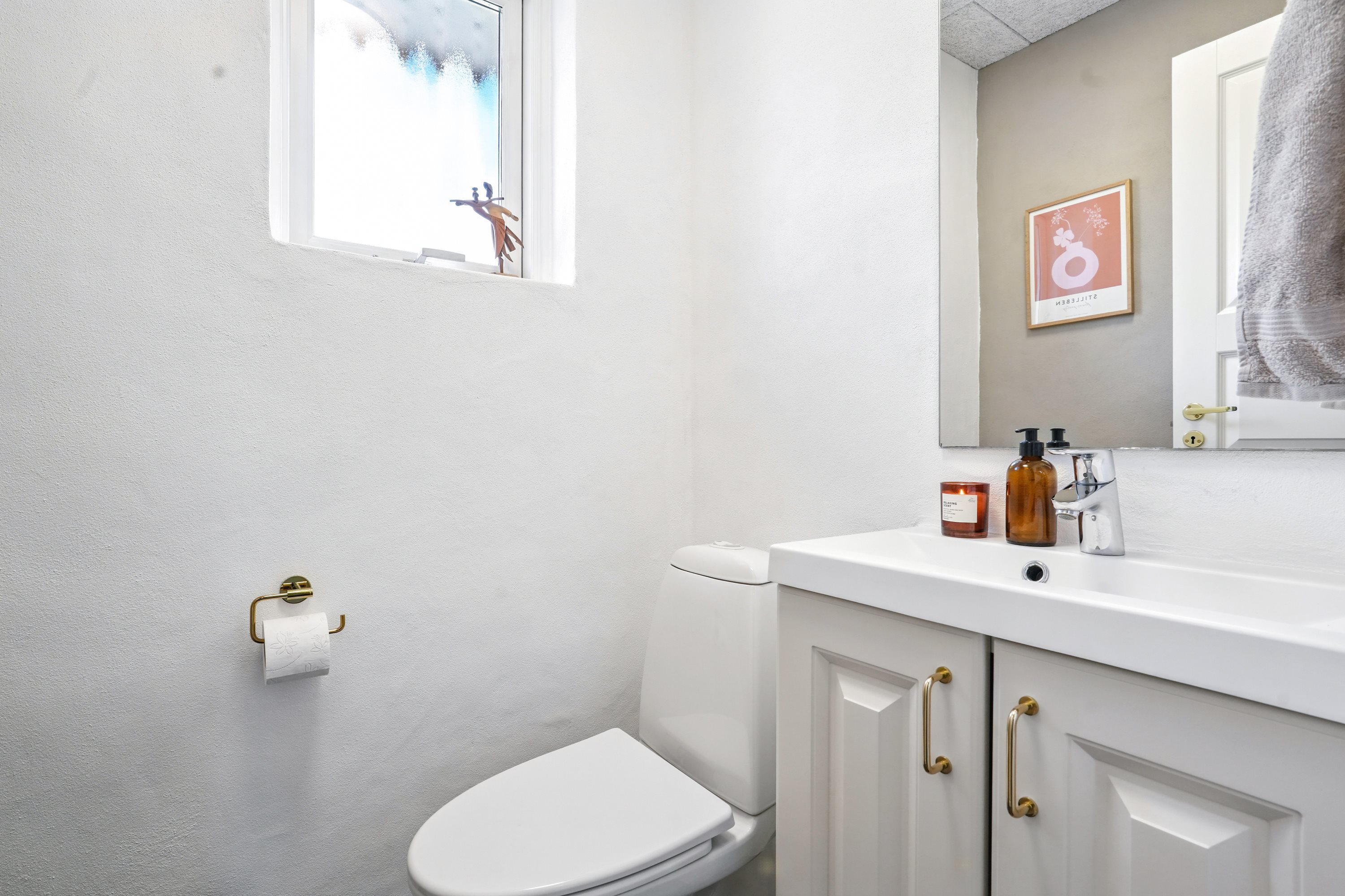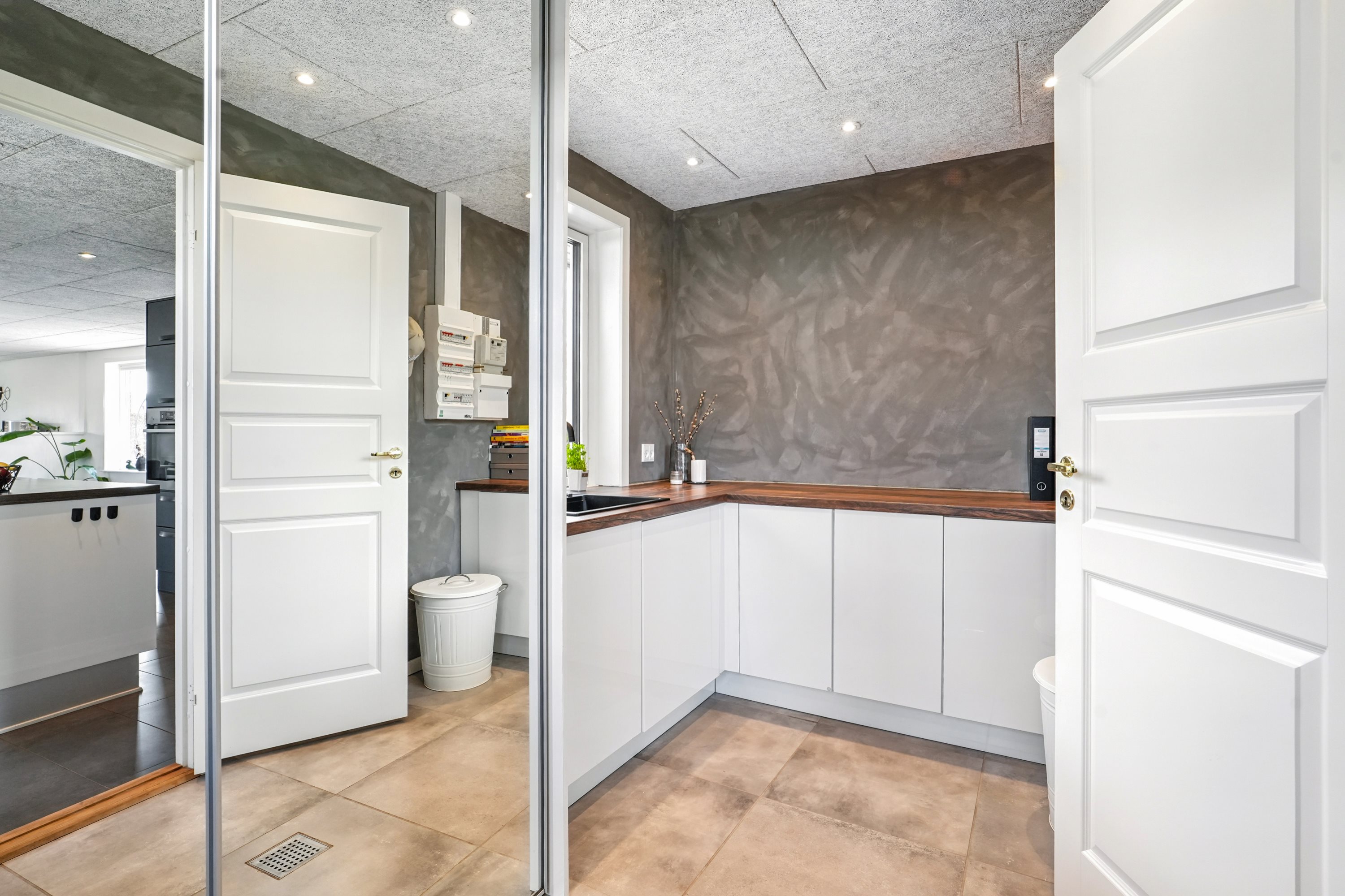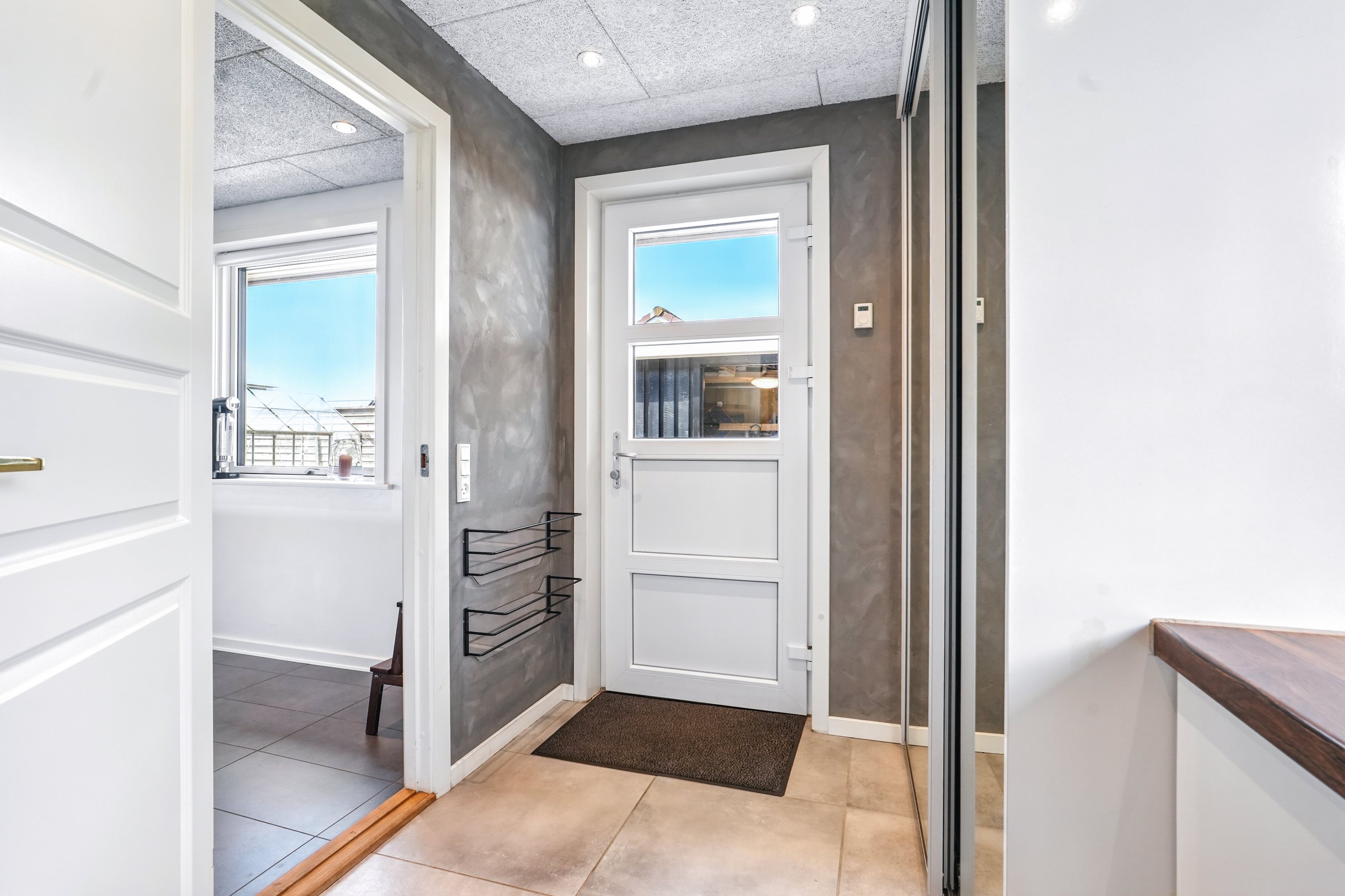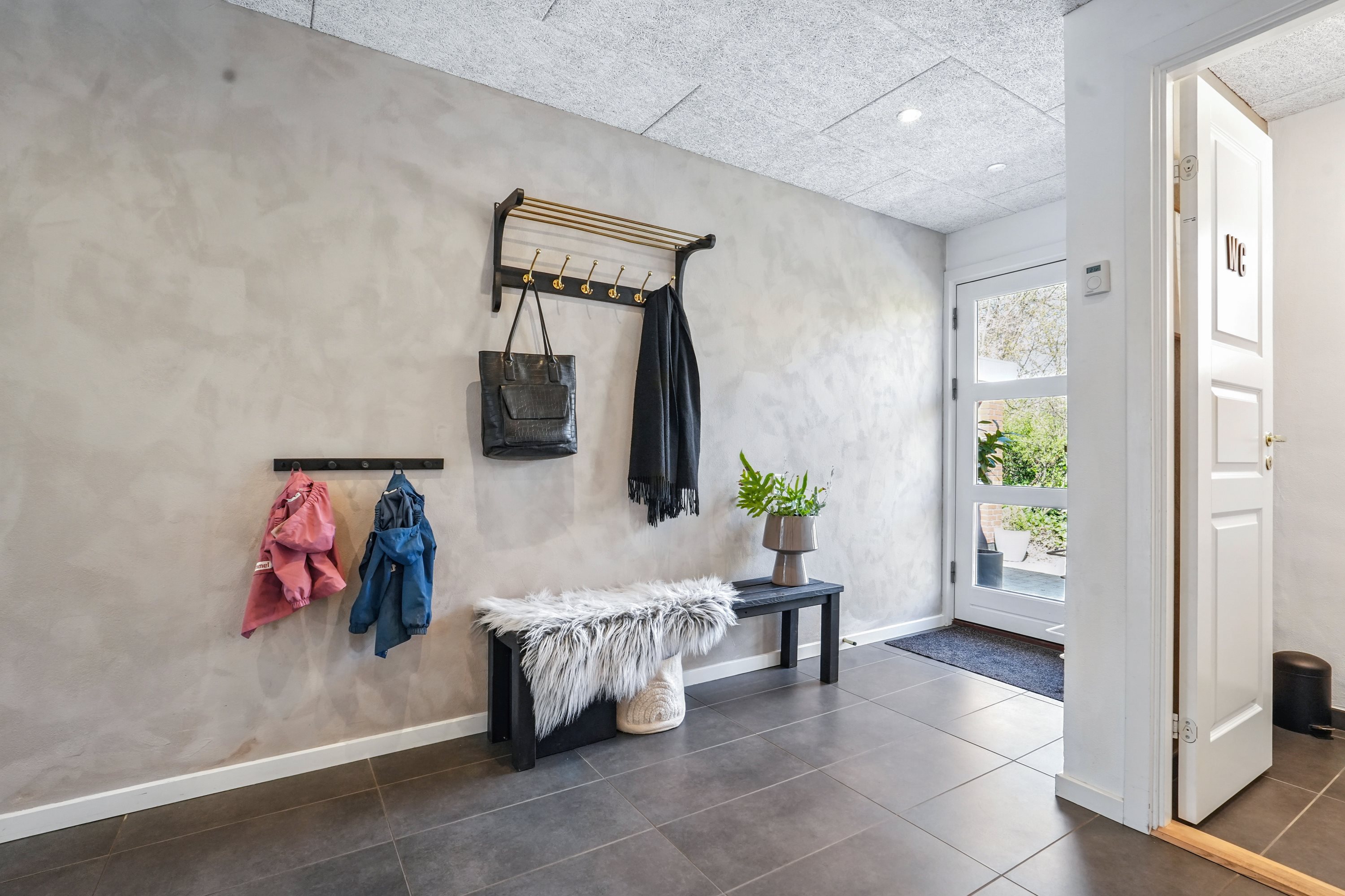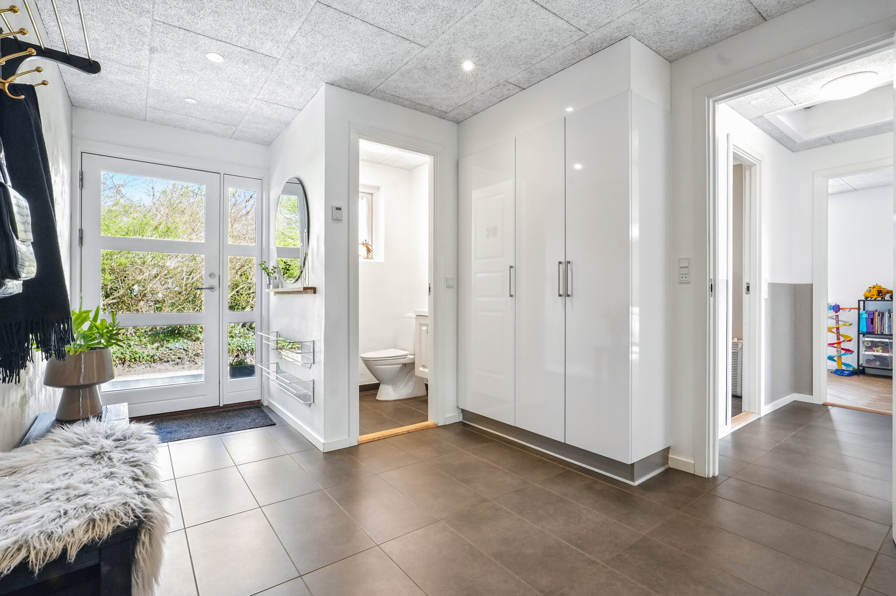 Indretningen byder på minimal spildplads. Her finder man fra entréen et lyst og godt gæste W.C. Her er der samtidig god plads til fodtøj og overtøj, når hjemmet fyldes med gæster. Her er der netop opsat troltektlofter i 2025.