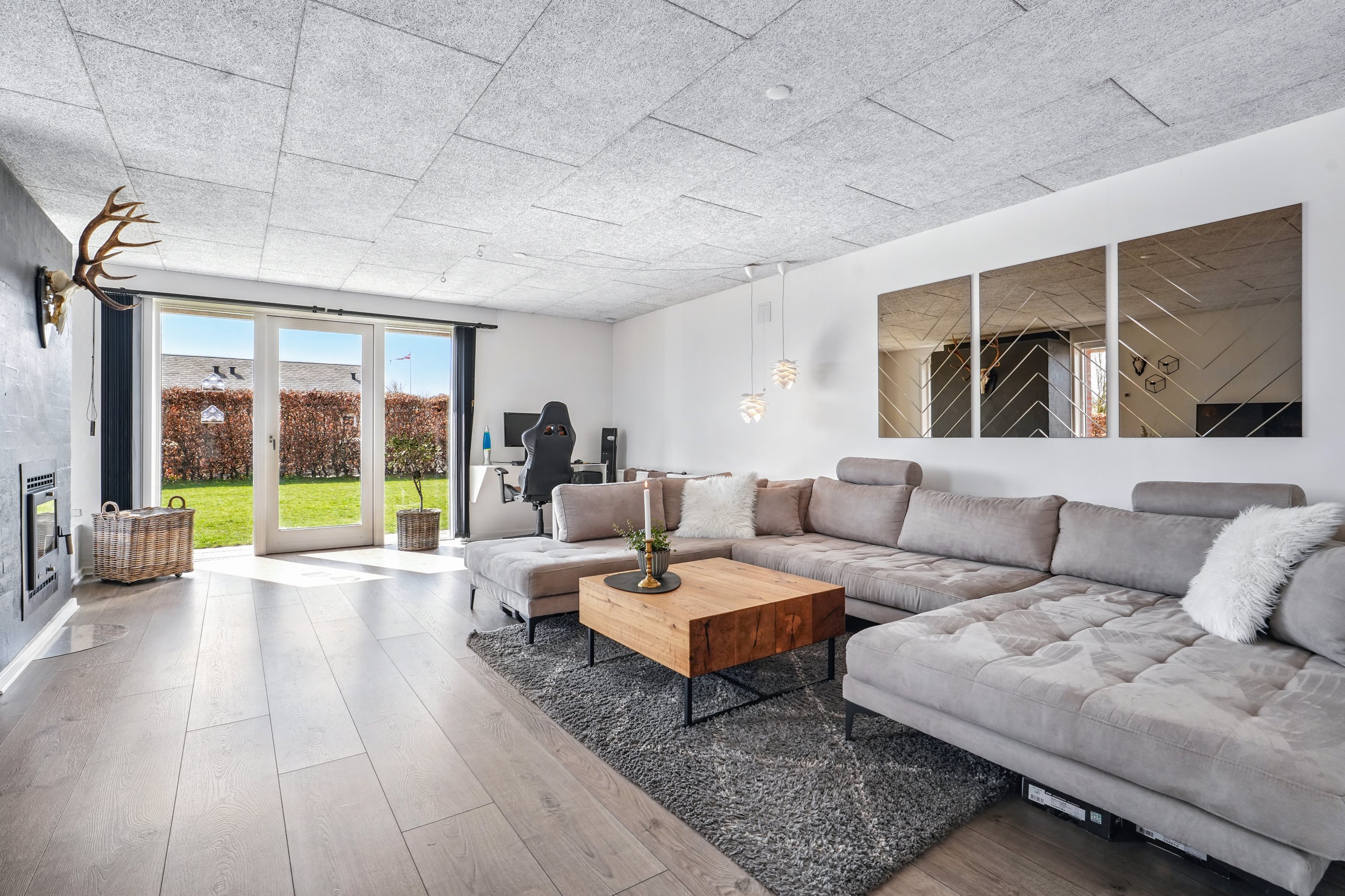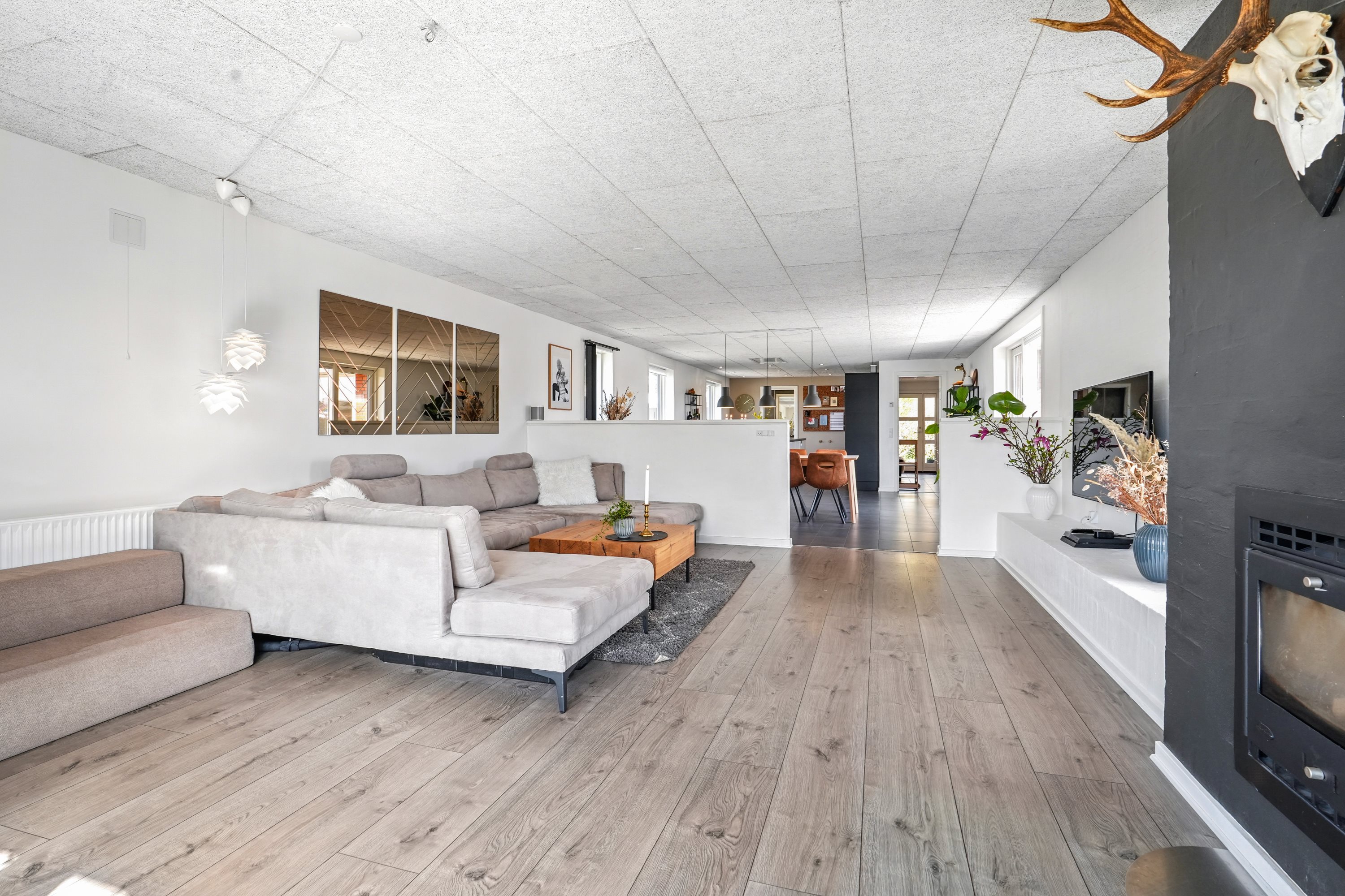 Bag halvmuren er der en hyggelig opholdsstue, hvor også de store vinduespartier og pejsen er med til at skabe de perfekte rammer. Her er der stemning, nærvær og liv, når familien er sammen om fredagssnolderet.