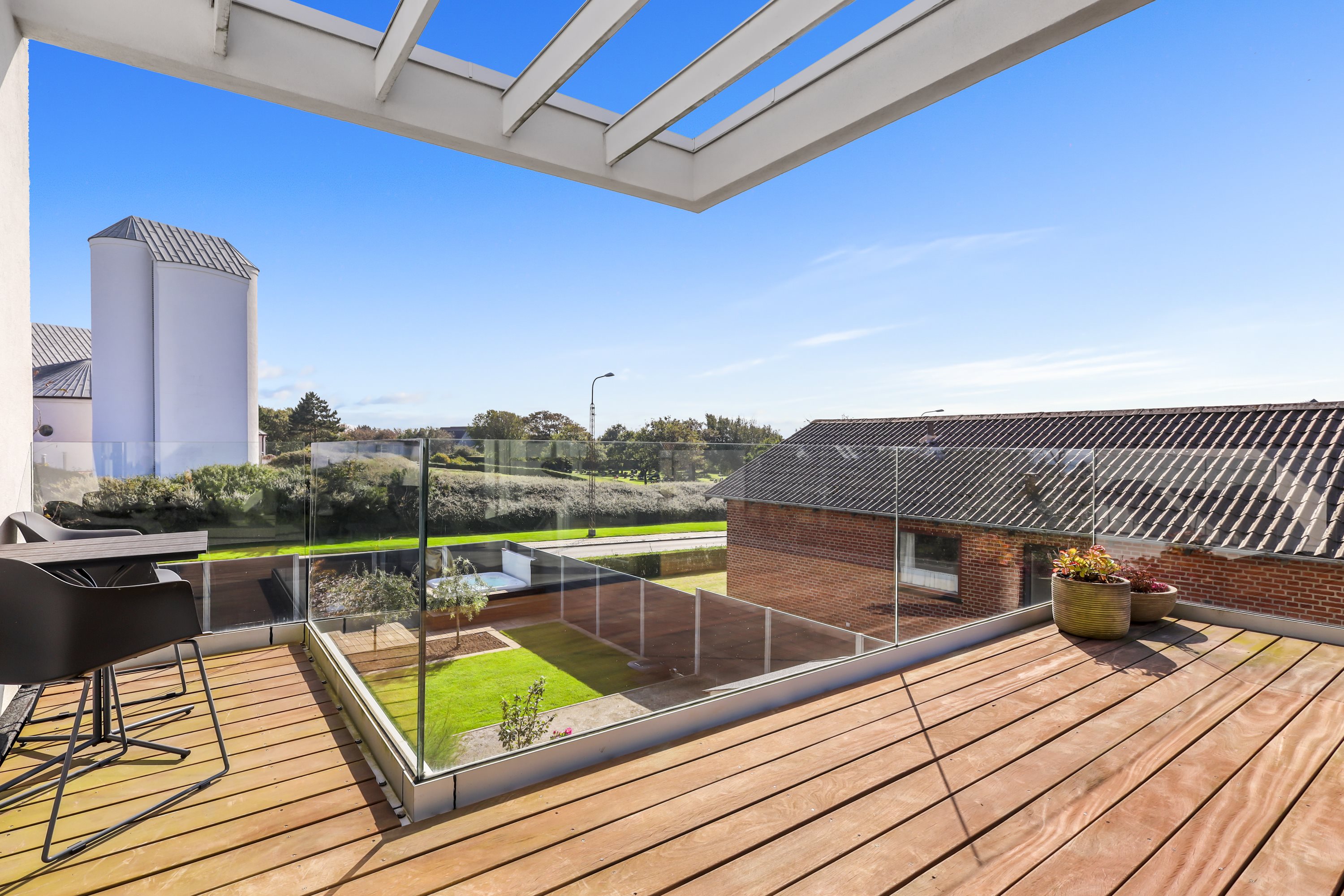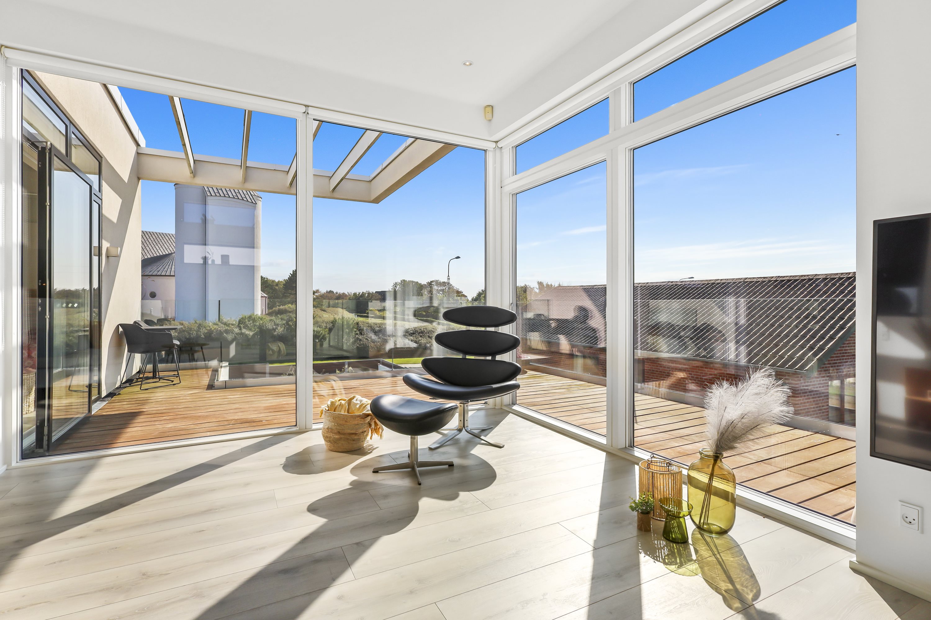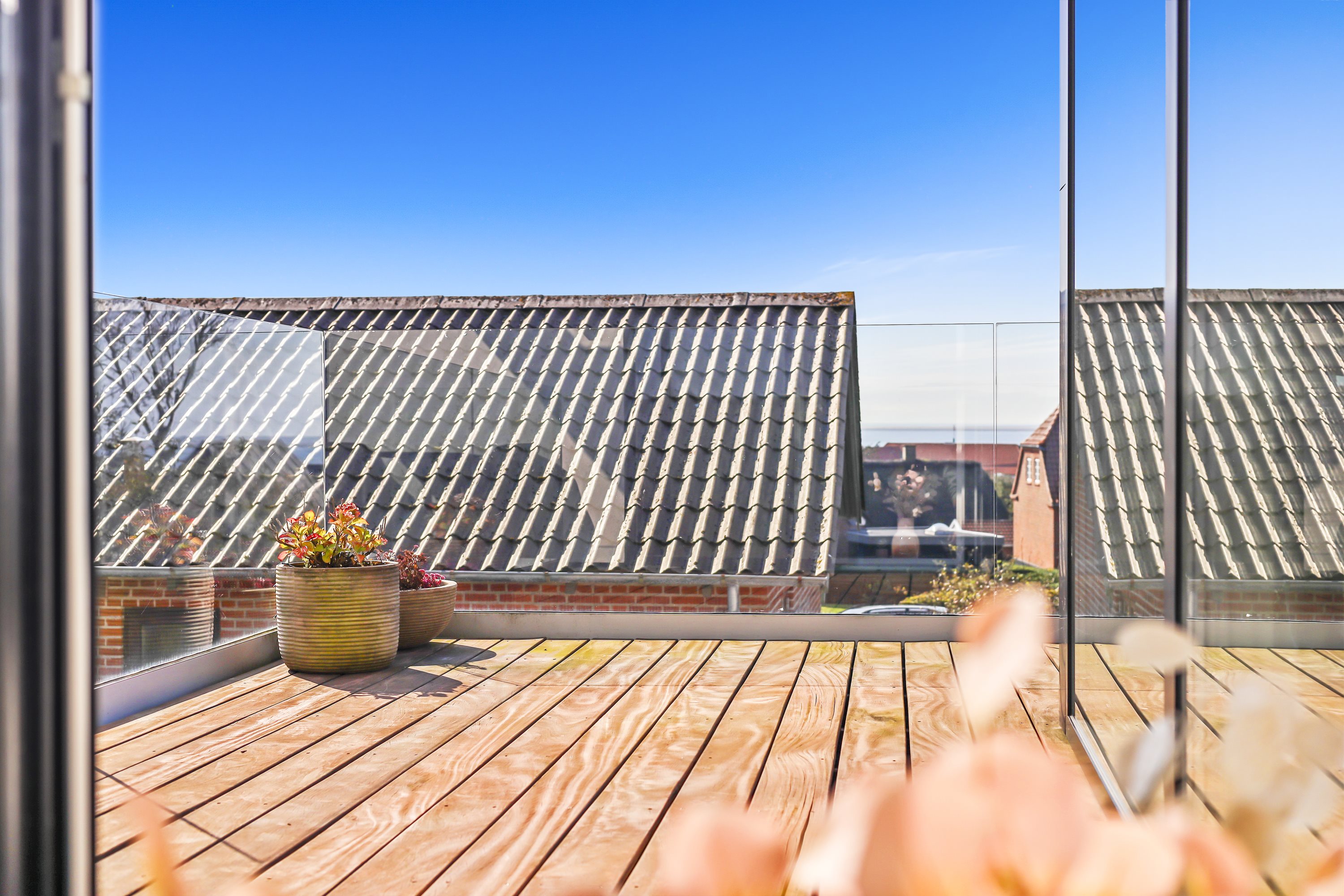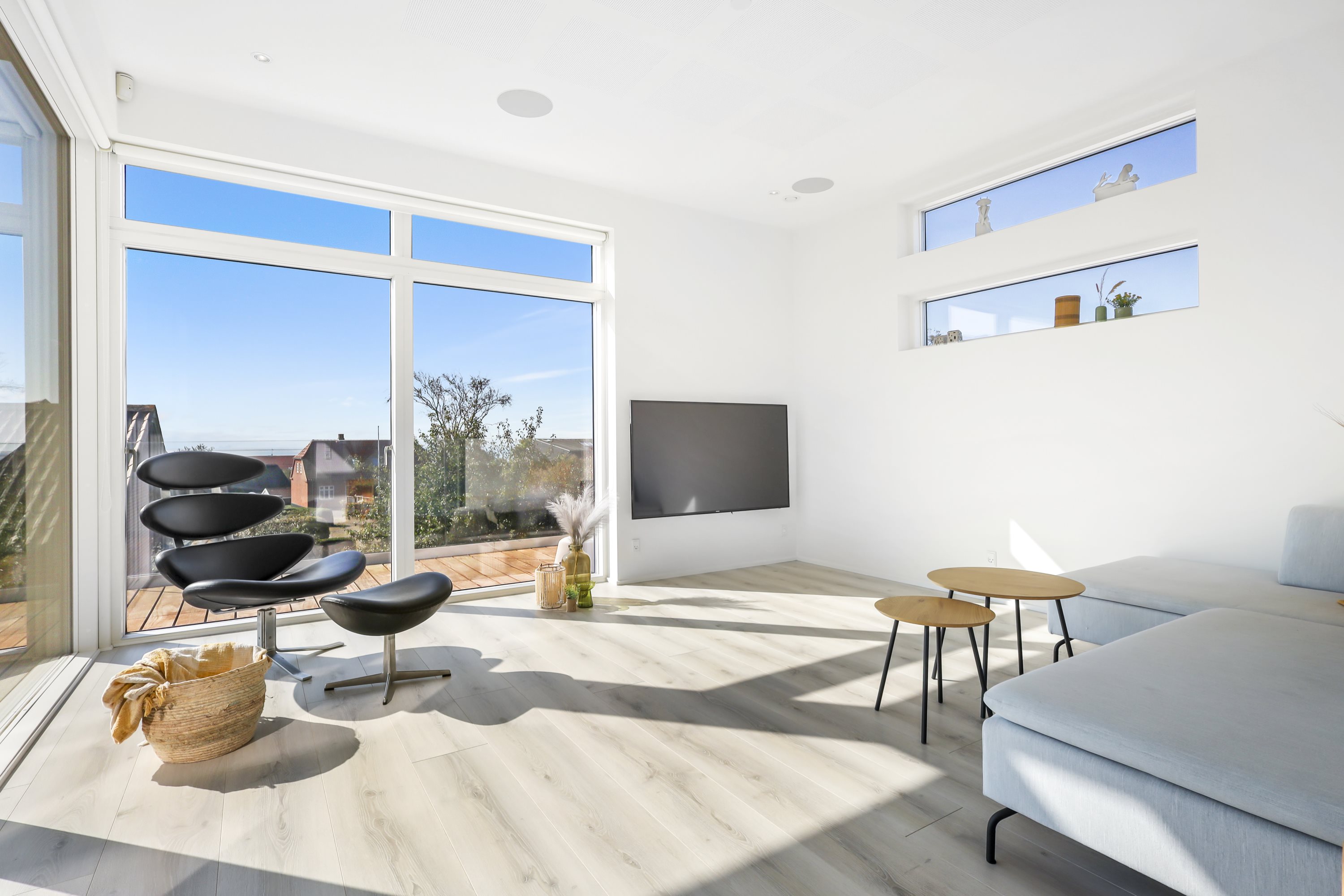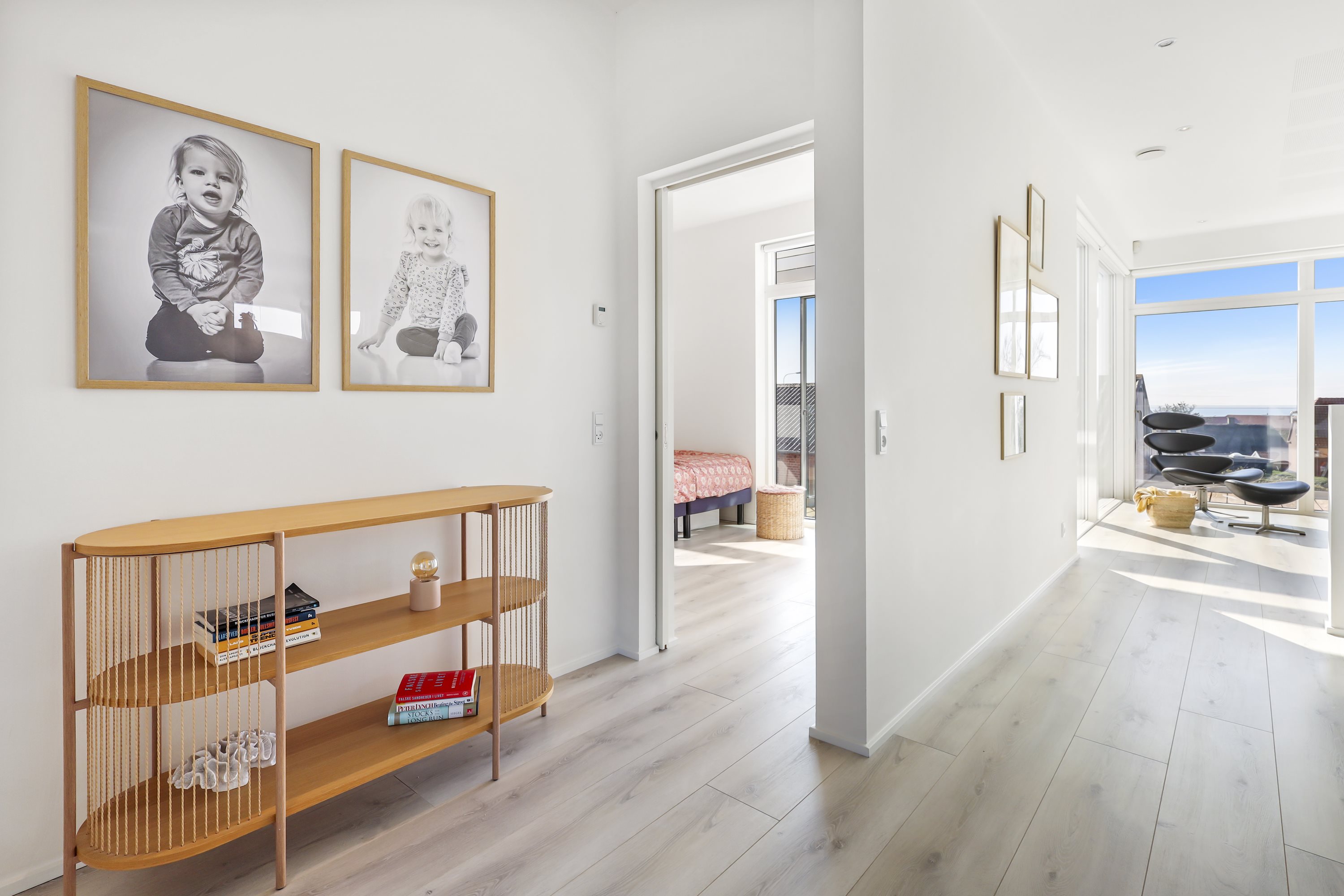 1. salen byder på yderligere 2 store værelser, hvoraf det ene har et walk-in-closet. Stuen har store vinduespartier, hvorfra man kan indtage tagterrassen. Herfra kan man nyde udsynet til havet og det omkringliggende liv.