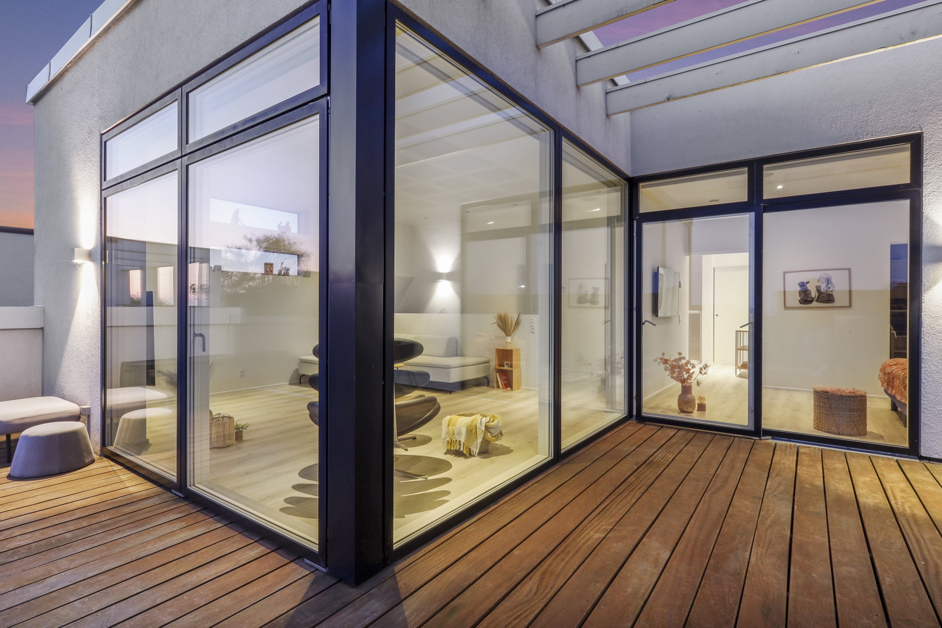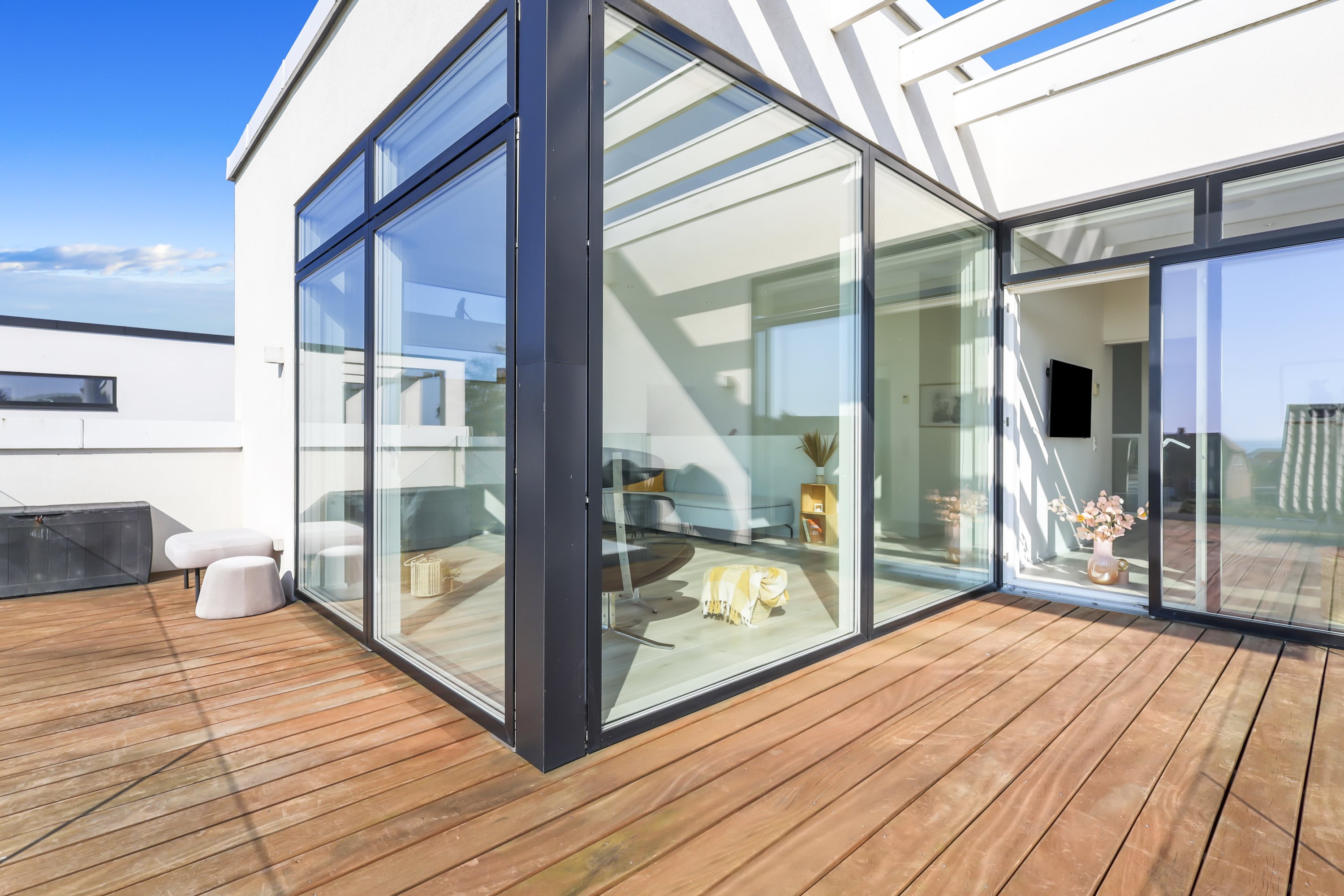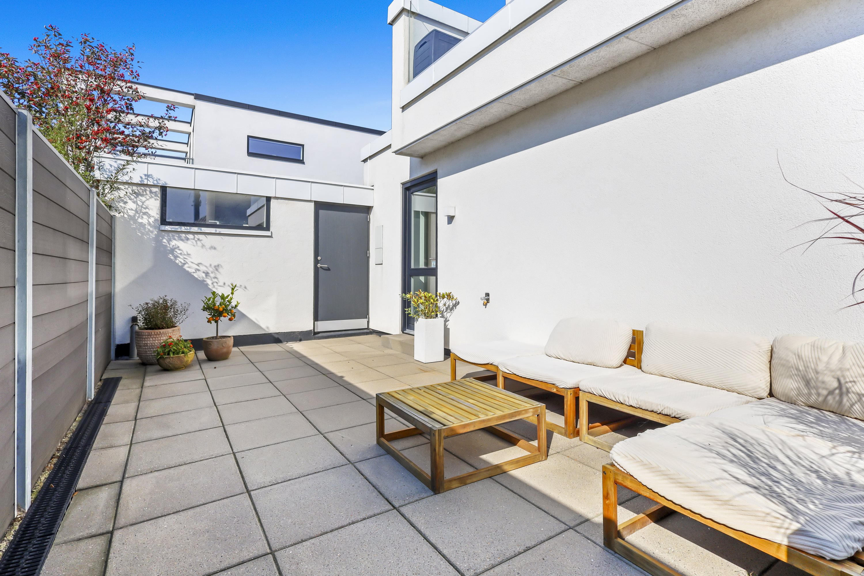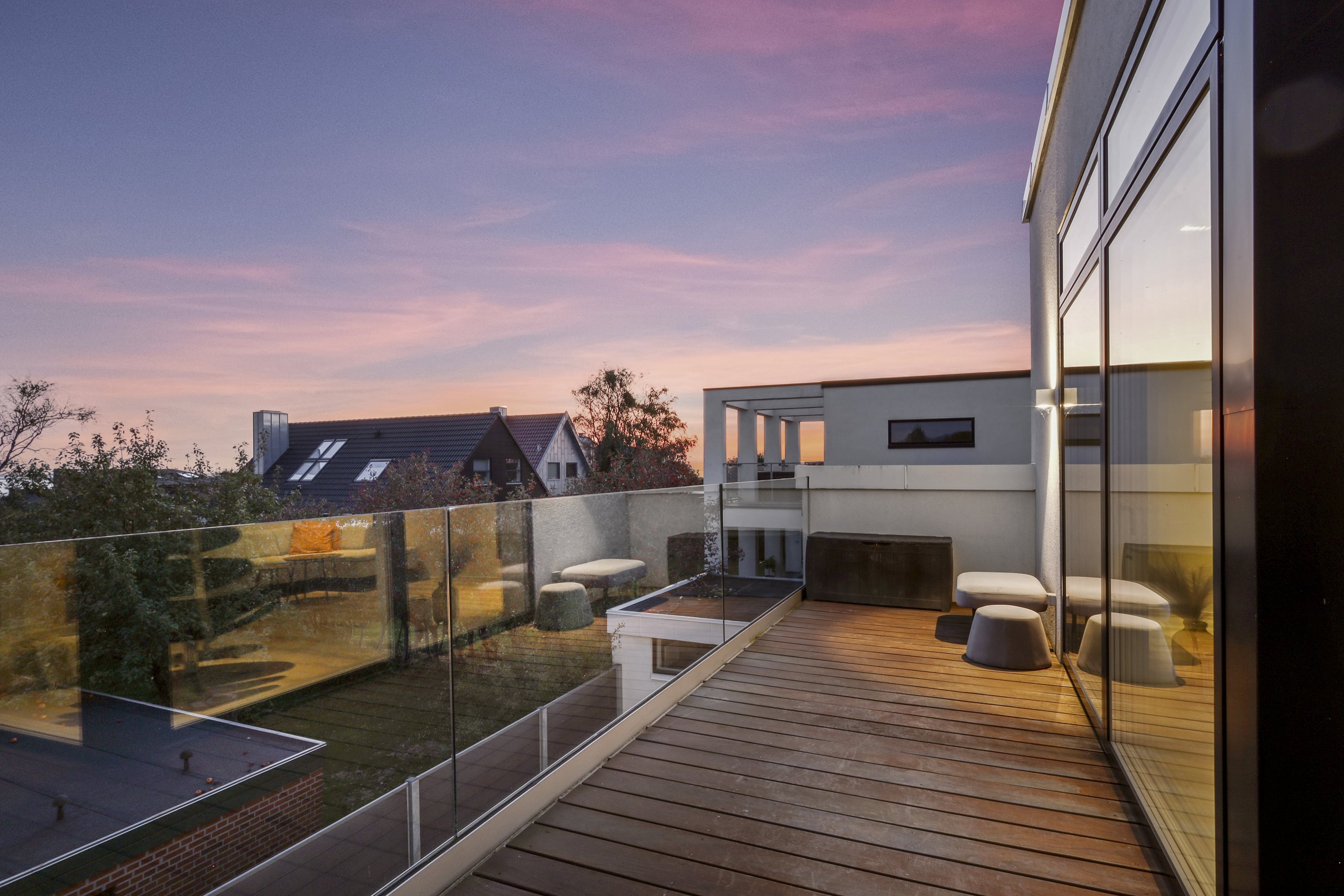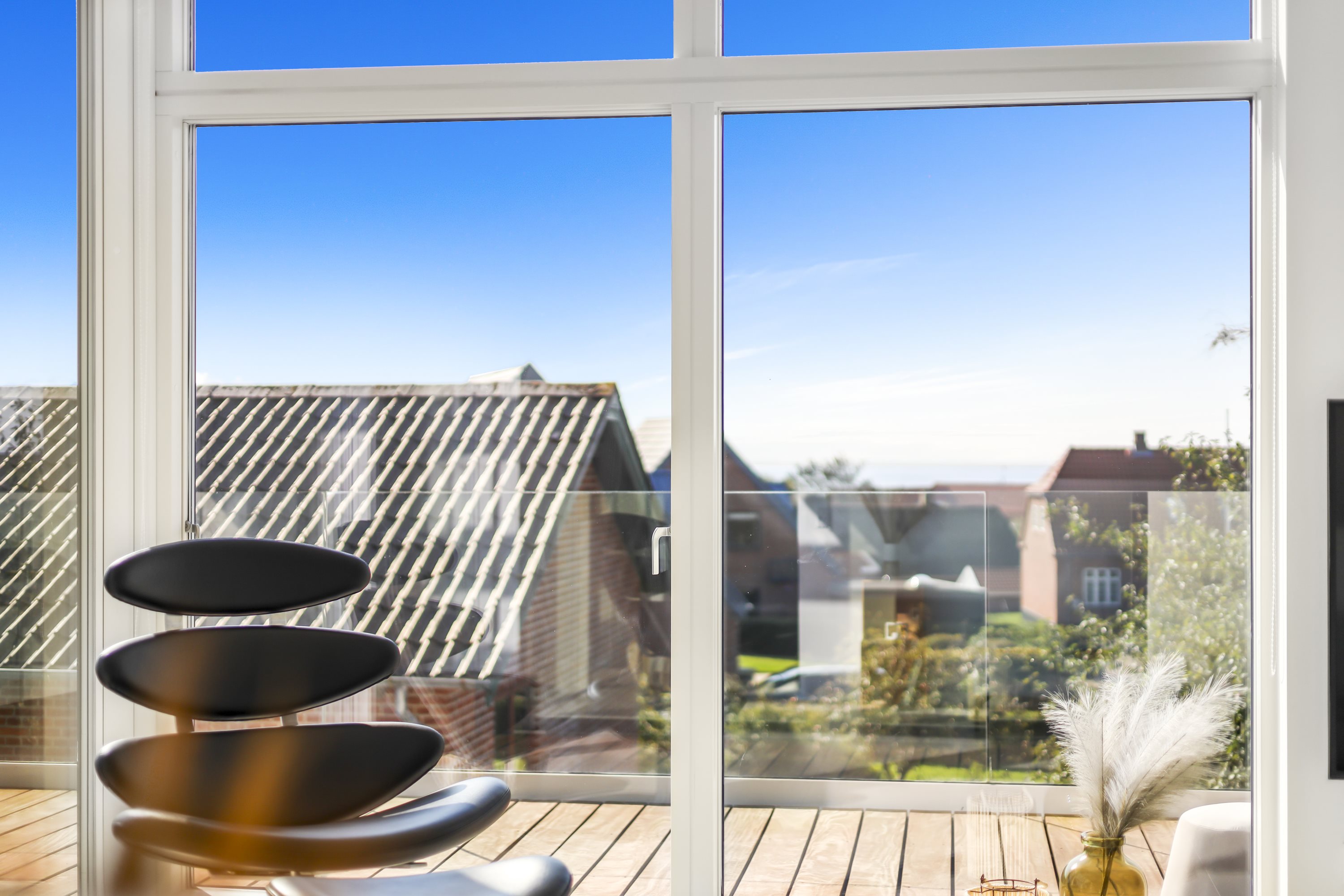 1. salen byder på yderligere 2 store værelser, hvoraf det ene har et walk-in-closet. Stuen har store vinduespartier, hvorfra man kan indtage tagterrassen. Herfra kan man nyde udsynet til havet og det omkringliggende liv.