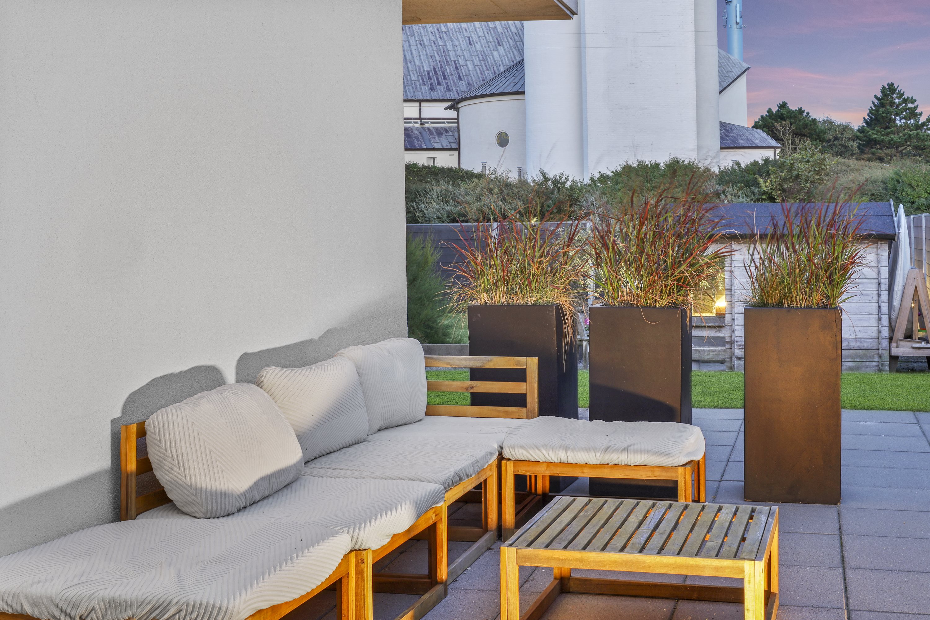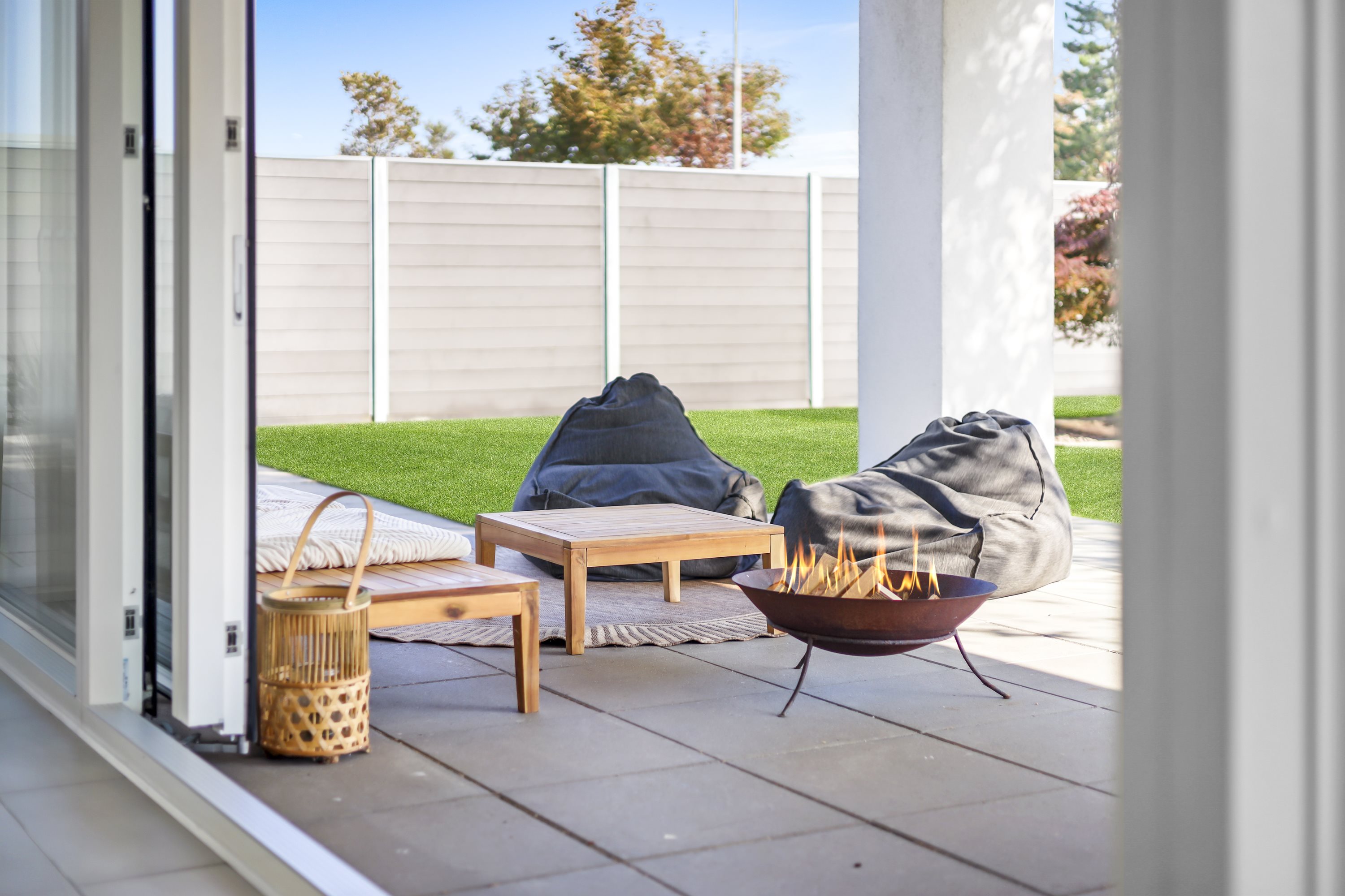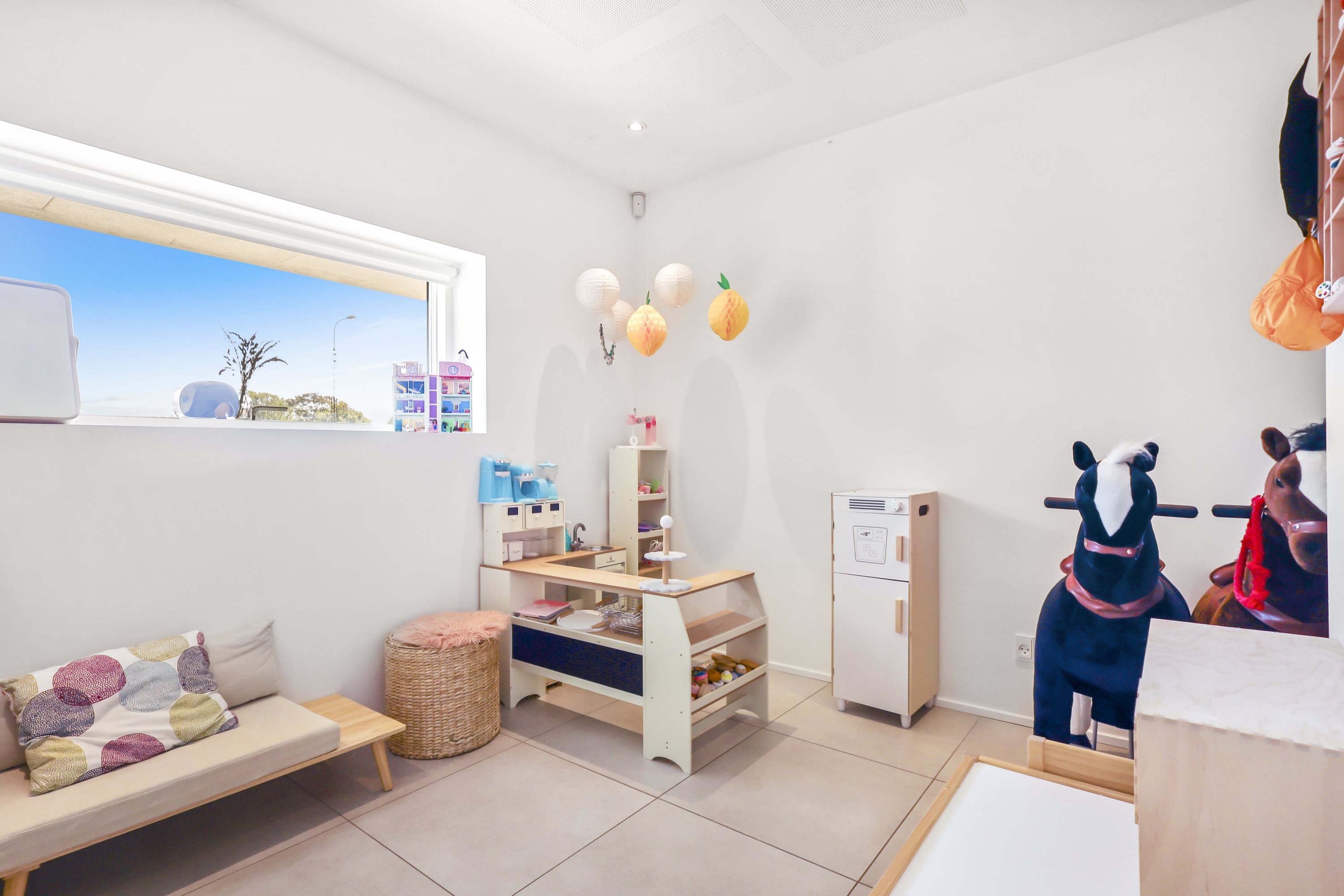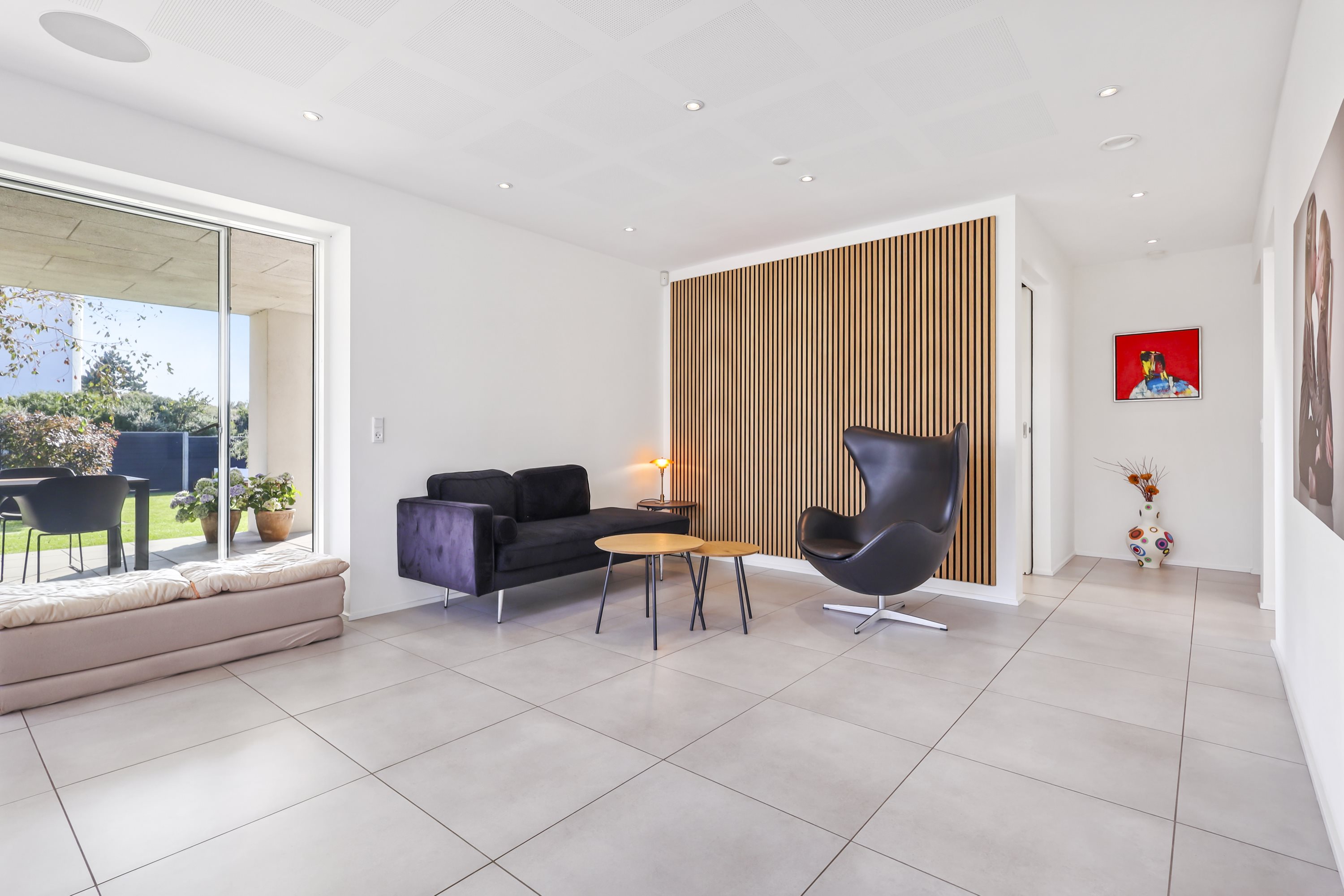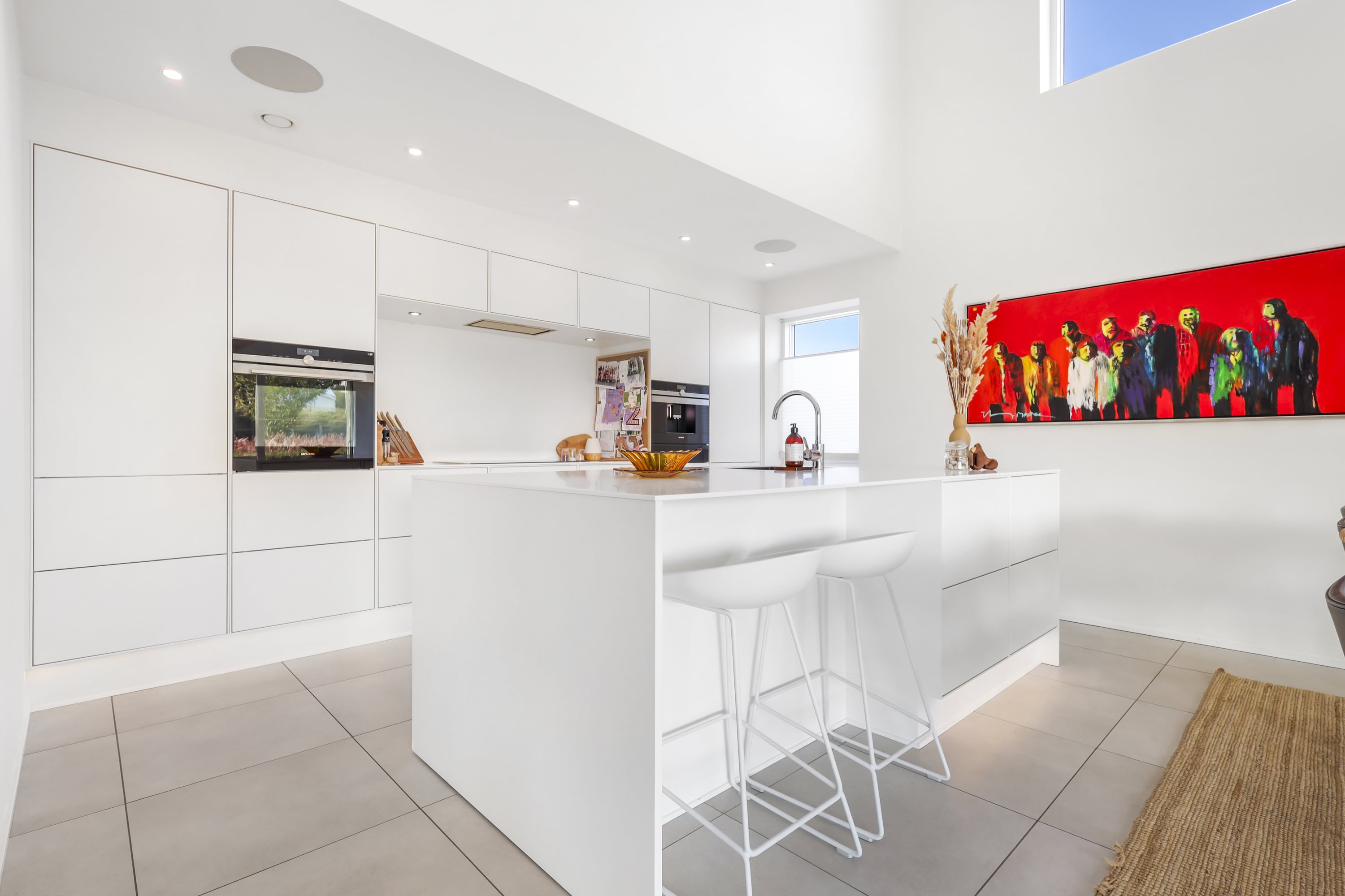 Smart home-løsningen giver dig mulighed for at styre store dele af hjemmets belysning via app, og det multizonede lydsystem med Sonance-loftshøjtalere sørger for sublim lydoplevelse i stuerne, køkken/alrummet, begge badeværelser, soveværelset og endda på de to terrasser – herunder den overdækkede.