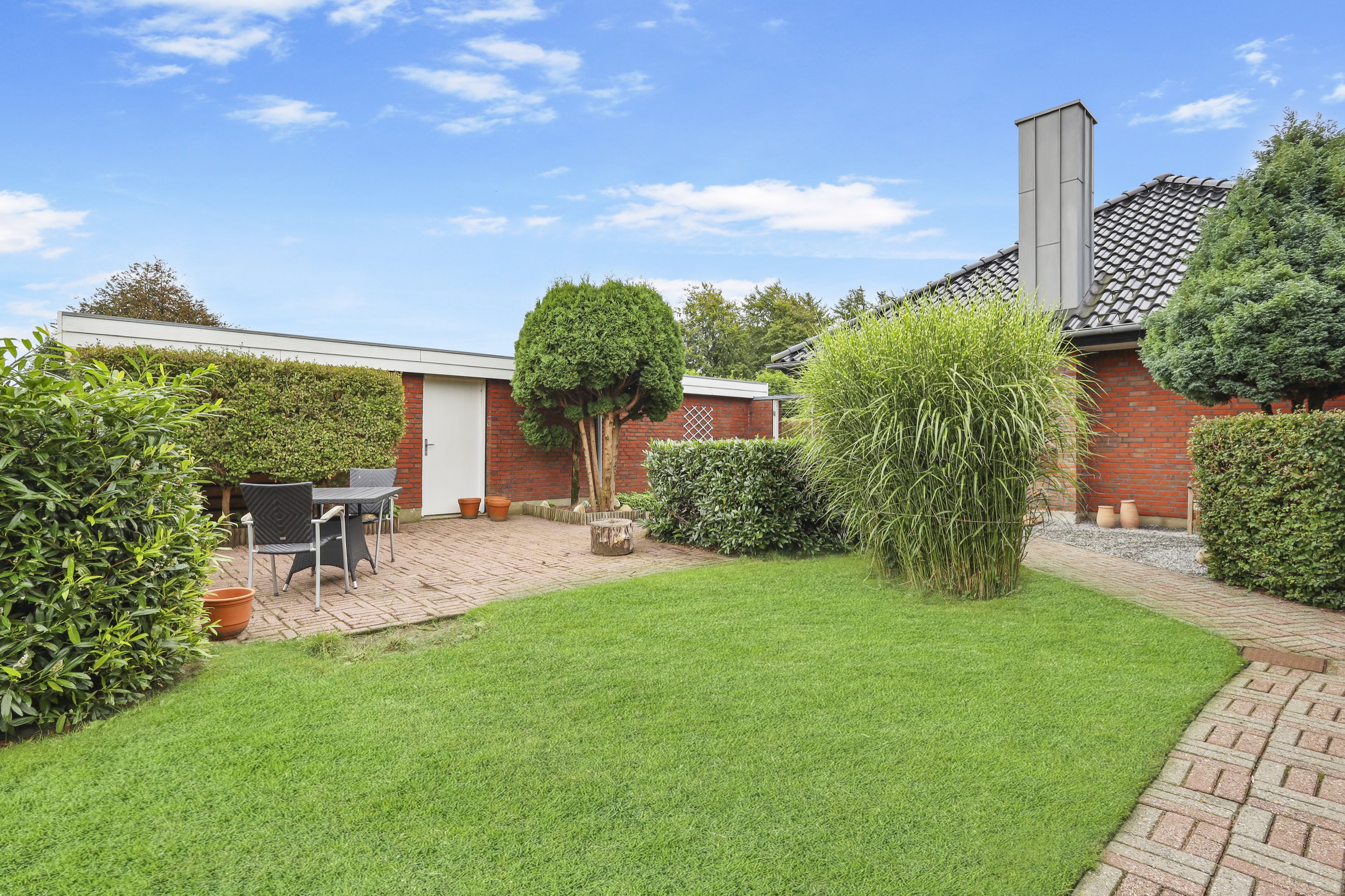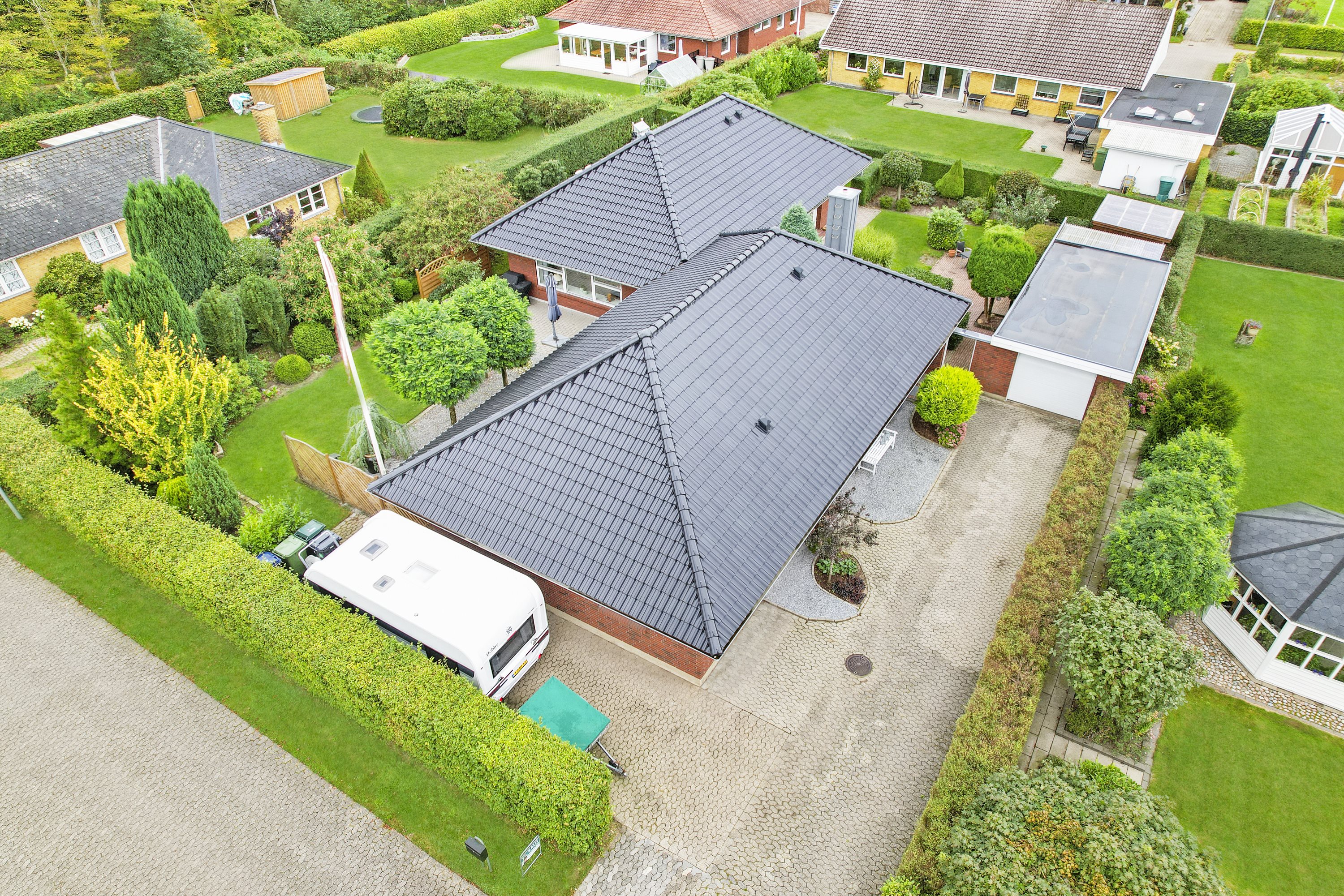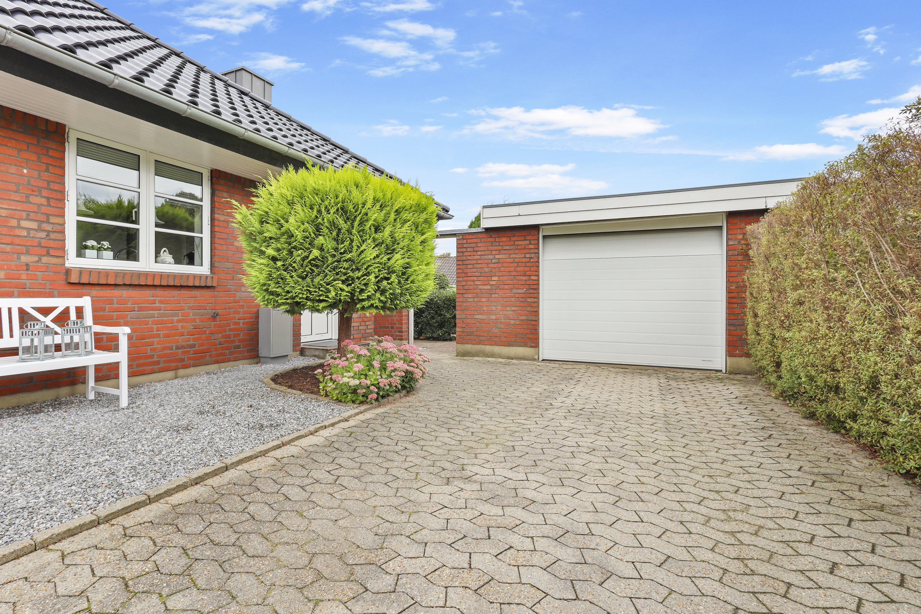 Villaen har en fin garage med tilhørende redskabsrum. Haven er et kapitel for sig. Der er flere gode terrasser hvor solen kan nydes hele dagen. Samtidig grænser villaen op til den populære Vestskov, som indbyder til skønne gåture mv.