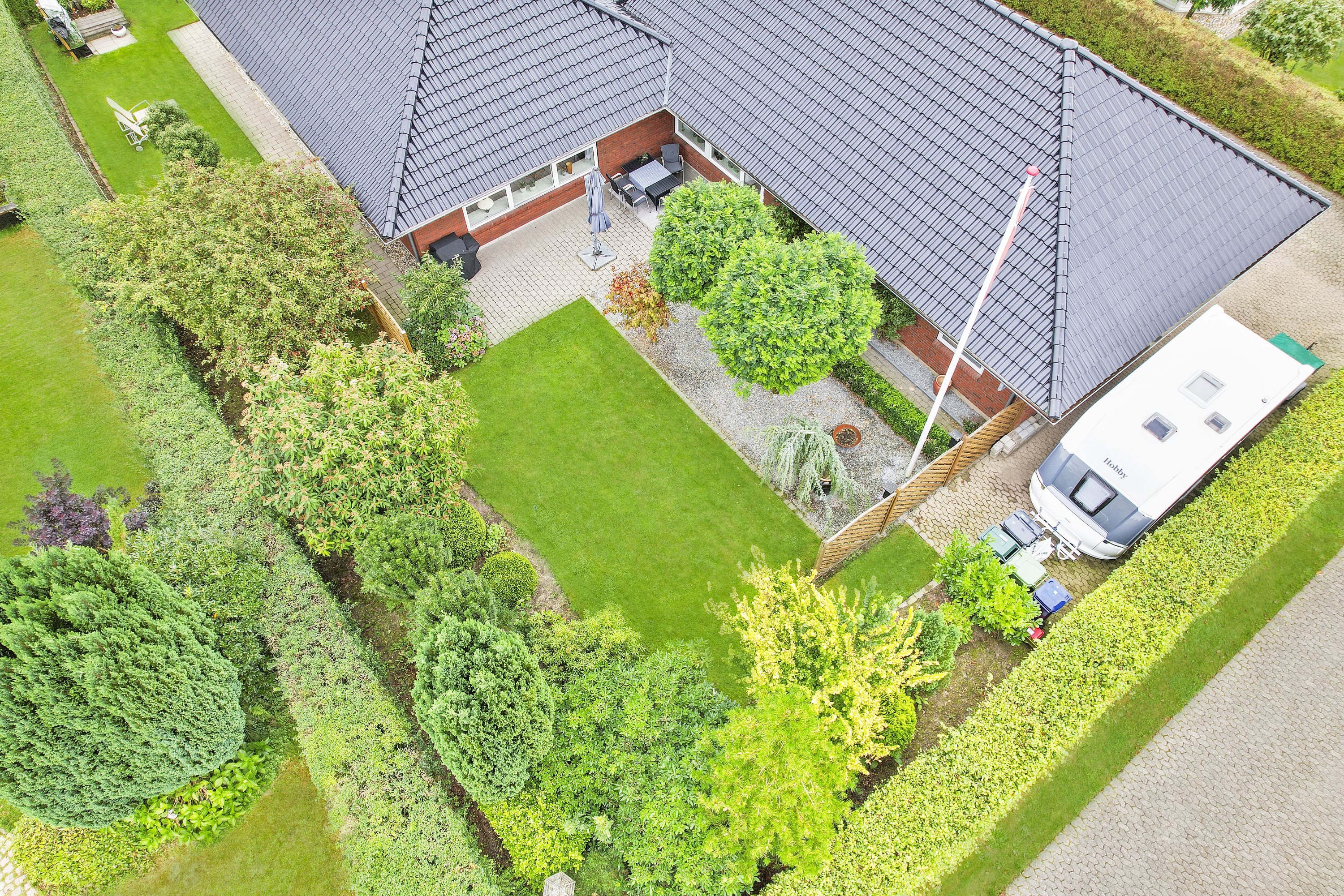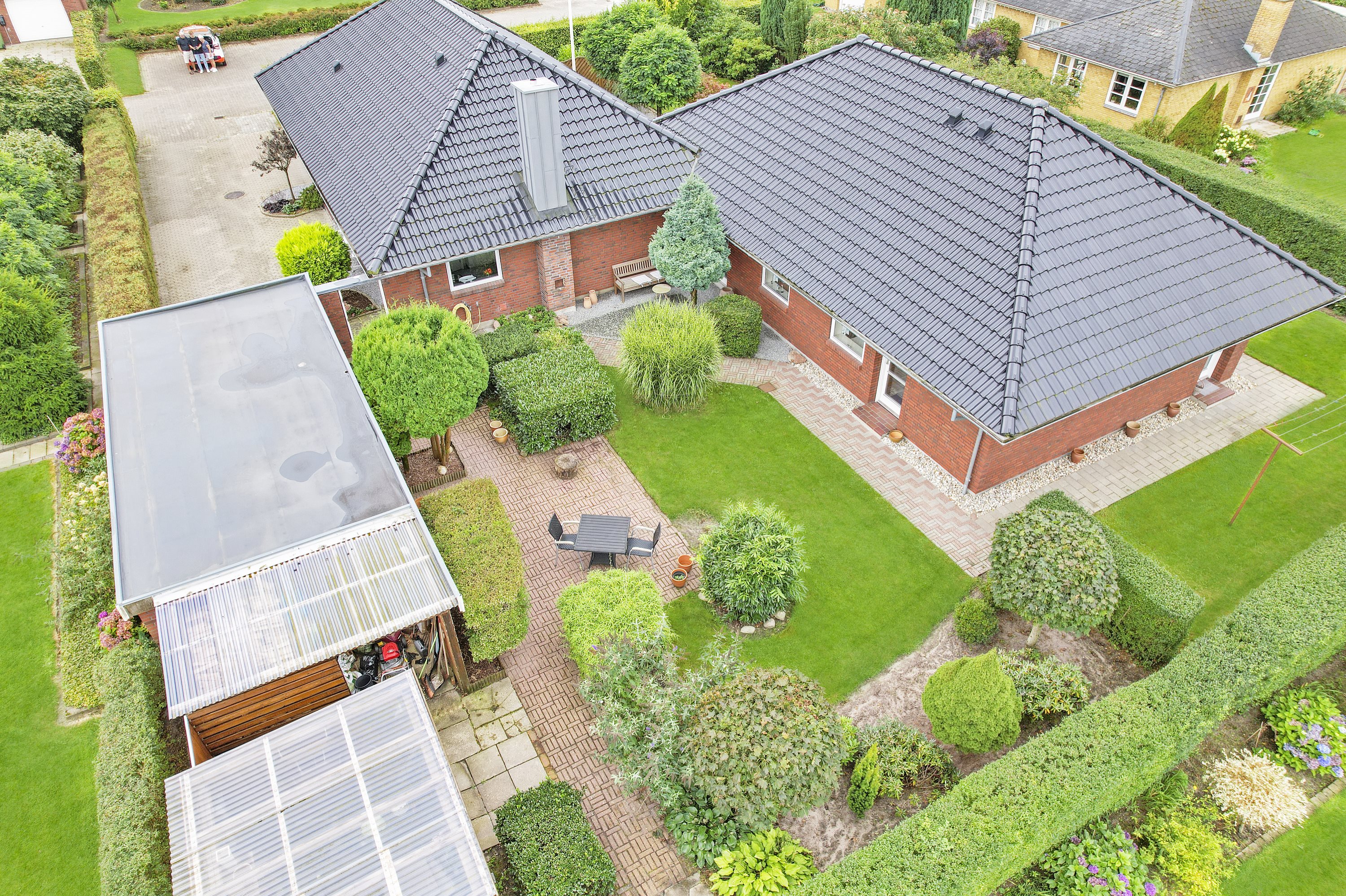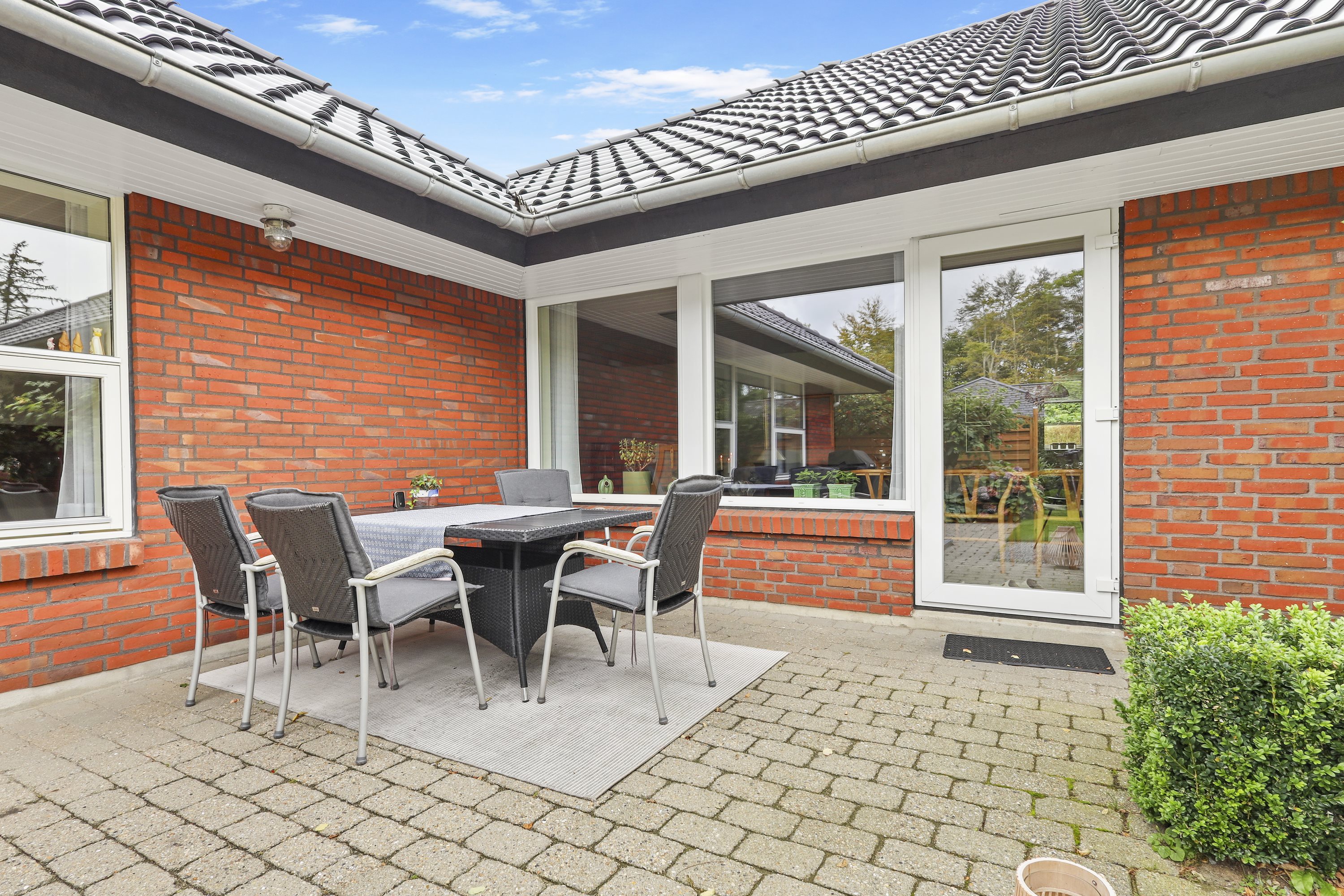 Villaen har en fin garage med tilhørende redskabsrum. Haven er et kapitel for sig. Der er flere gode terrasser hvor solen kan nydes hele dagen. Samtidig grænser villaen op til den populære Vestskov, som indbyder til skønne gåture mv.