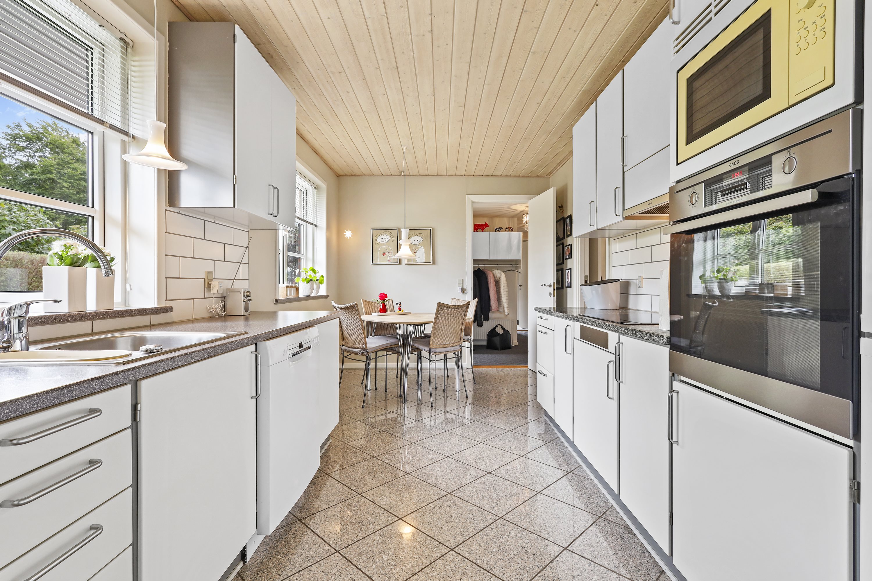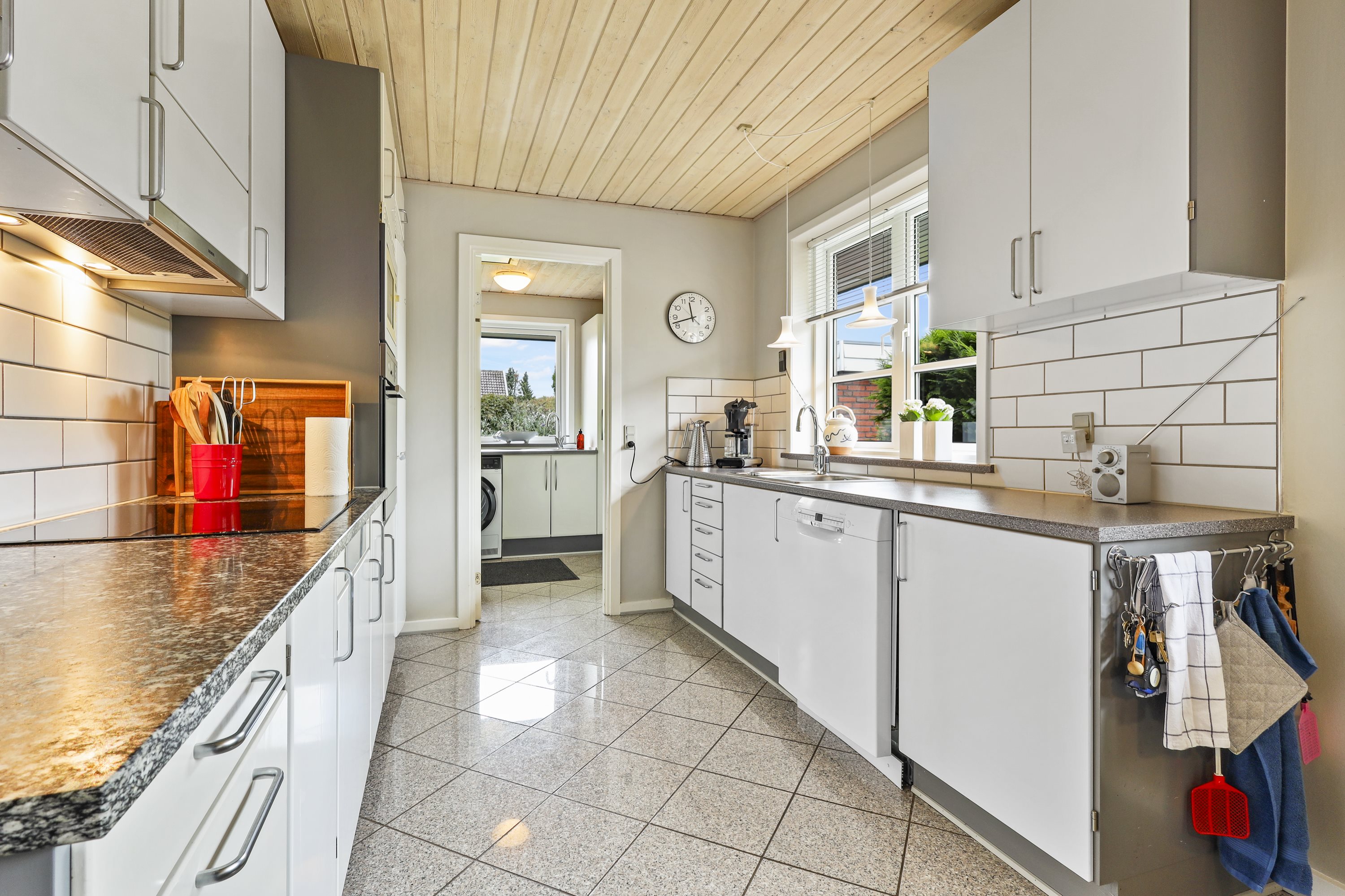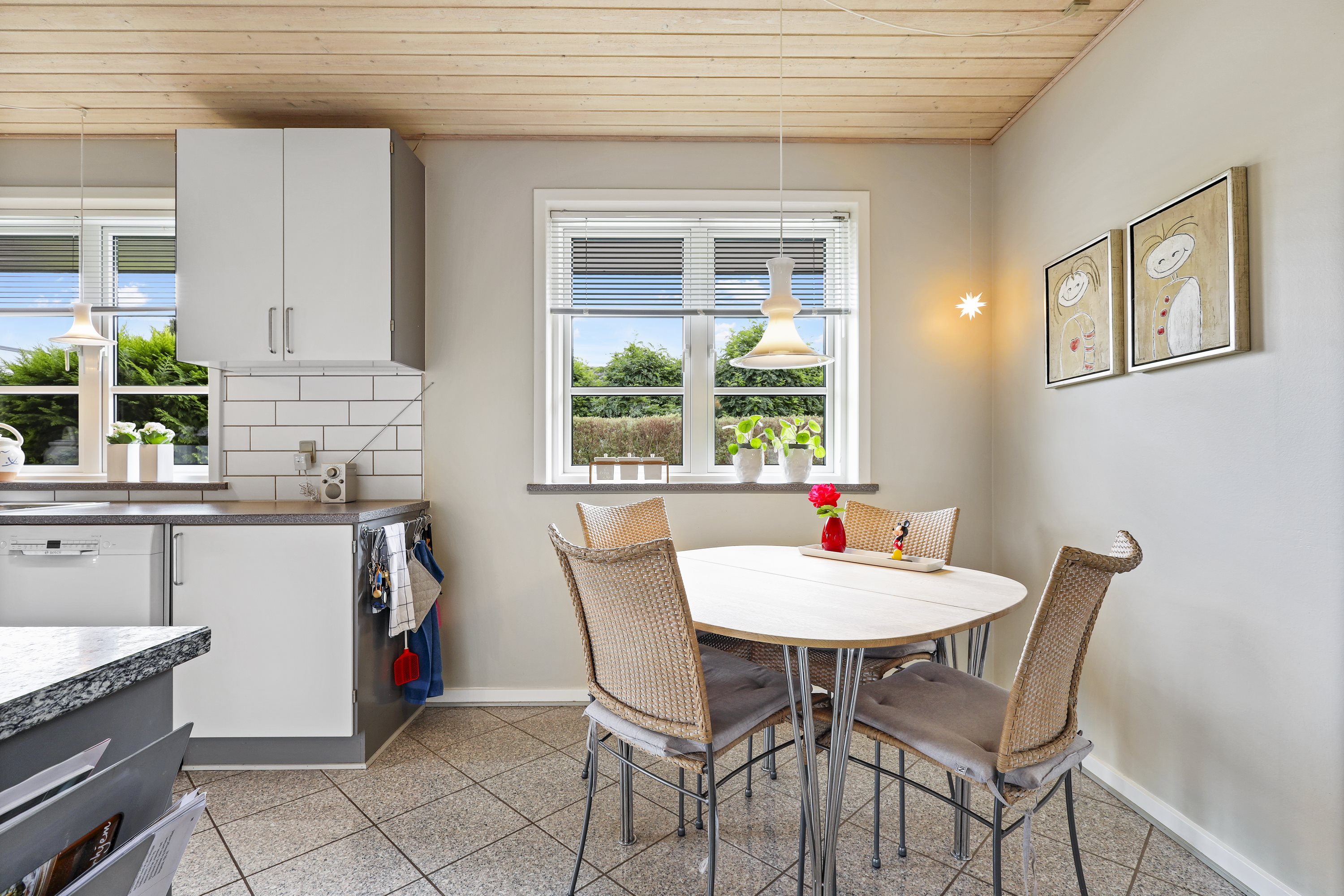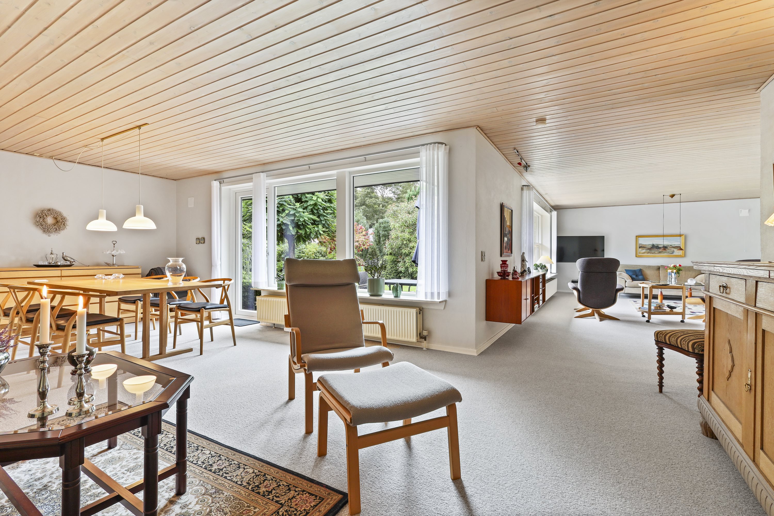 Indretningen byder på: en praktisk bryggers med plads til tøjvask. Videre er et meget velholdt køkken med en hyggelig spiseplads. Børneafdelingen består af 3 gode værelser med tilhørende badeværelse med bruseniche og gulvvarme. De to stuer er villaens ”samlingspunkt” her er de store vinduespartier med til at drage naturen ind i stuerne. Går du med en drøm om køkken/alrum, kunne man undersøge at nedlægge væggen mellem køkkenet og ”spisestuen”. Og på den måde få et stort køkken/alrum og stue i forlængelse af hinanden.