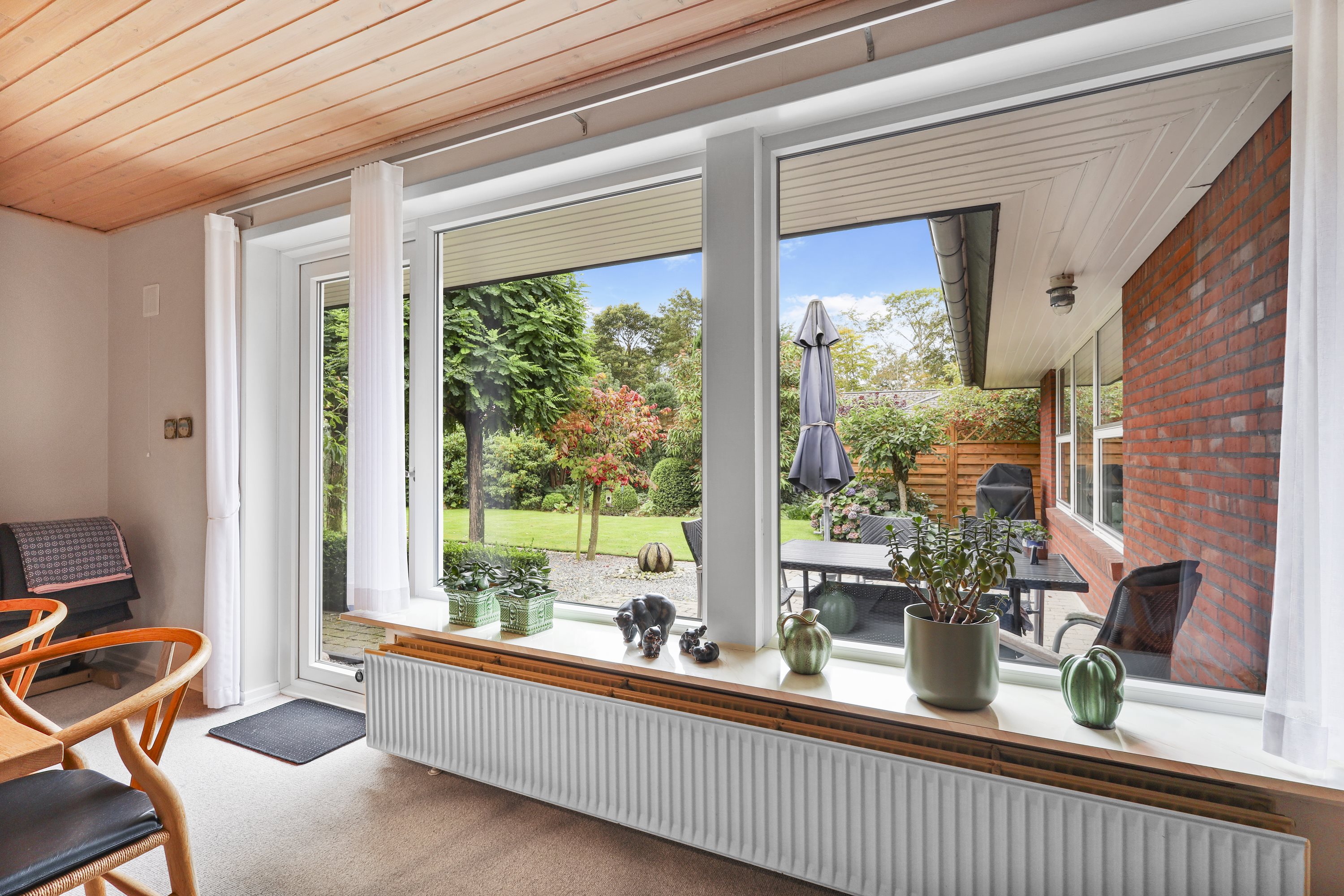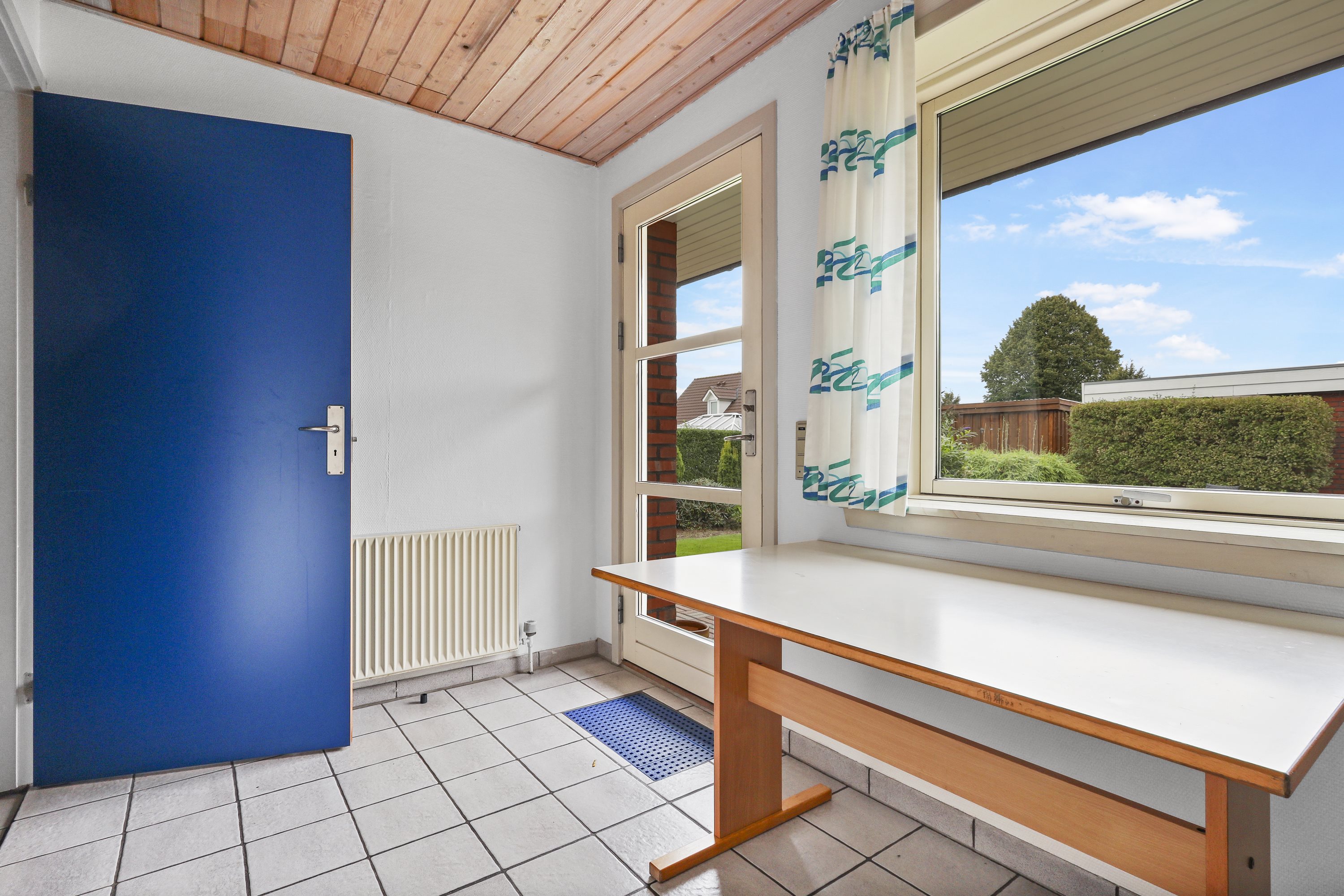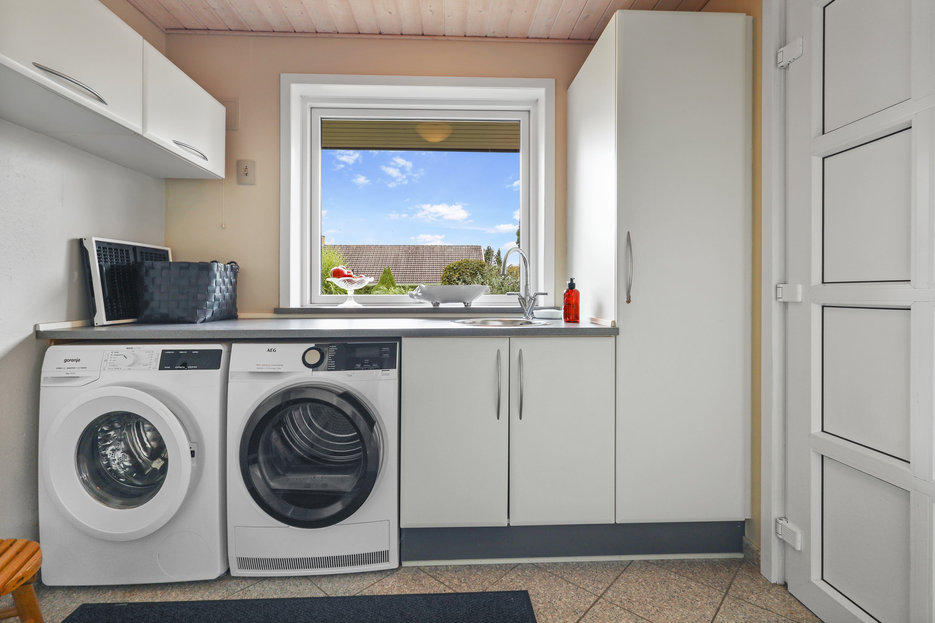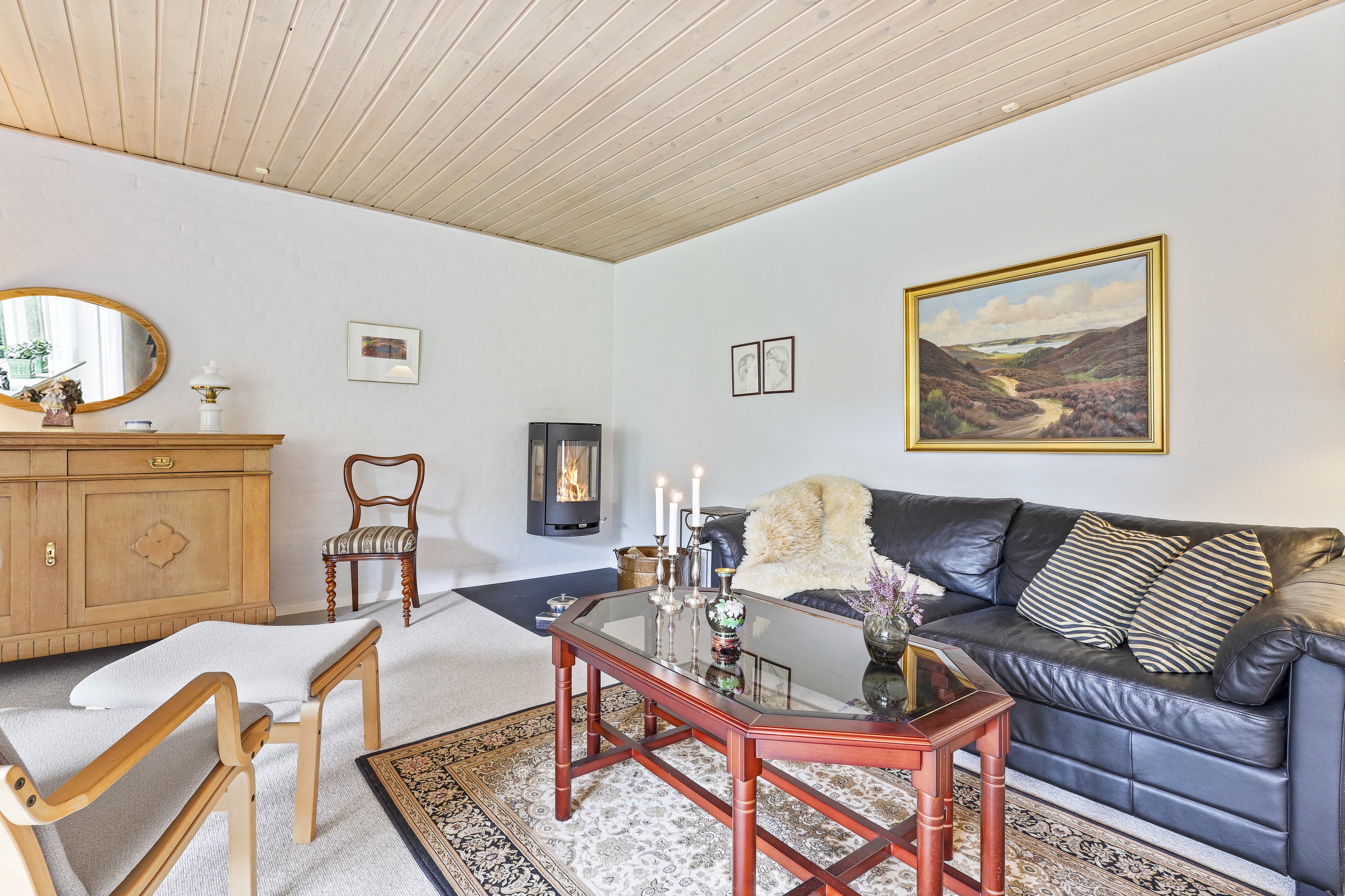 Indretningen byder på: en praktisk bryggers med plads til tøjvask. Videre er et meget velholdt køkken med en hyggelig spiseplads. Børneafdelingen består af 3 gode værelser med tilhørende badeværelse med bruseniche og gulvvarme. De to stuer er villaens ”samlingspunkt” her er de store vinduespartier med til at drage naturen ind i stuerne. Går du med en drøm om køkken/alrum, kunne man undersøge at nedlægge væggen mellem køkkenet og ”spisestuen”. Og på den måde få et stort køkken/alrum og stue i forlængelse af hinanden.