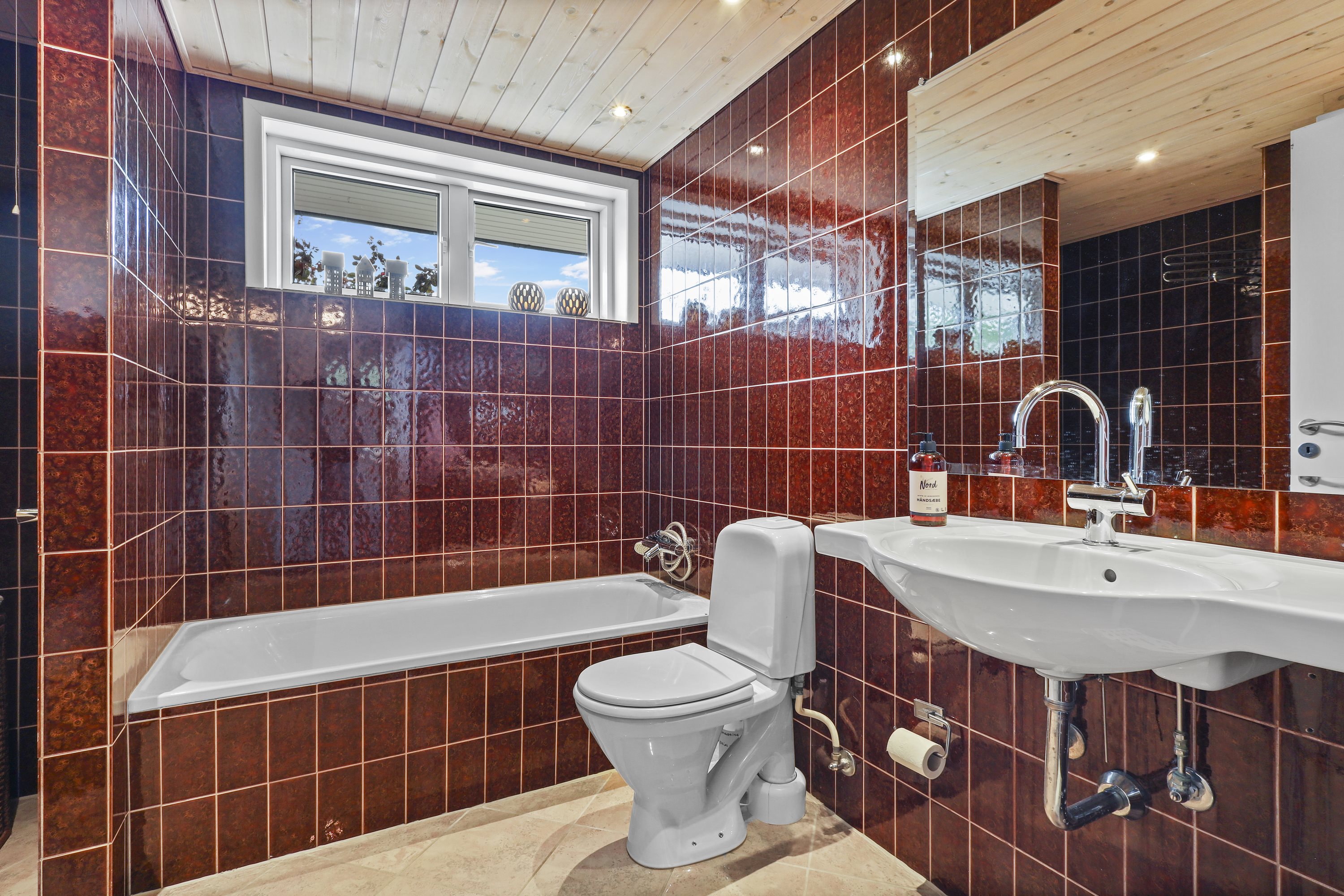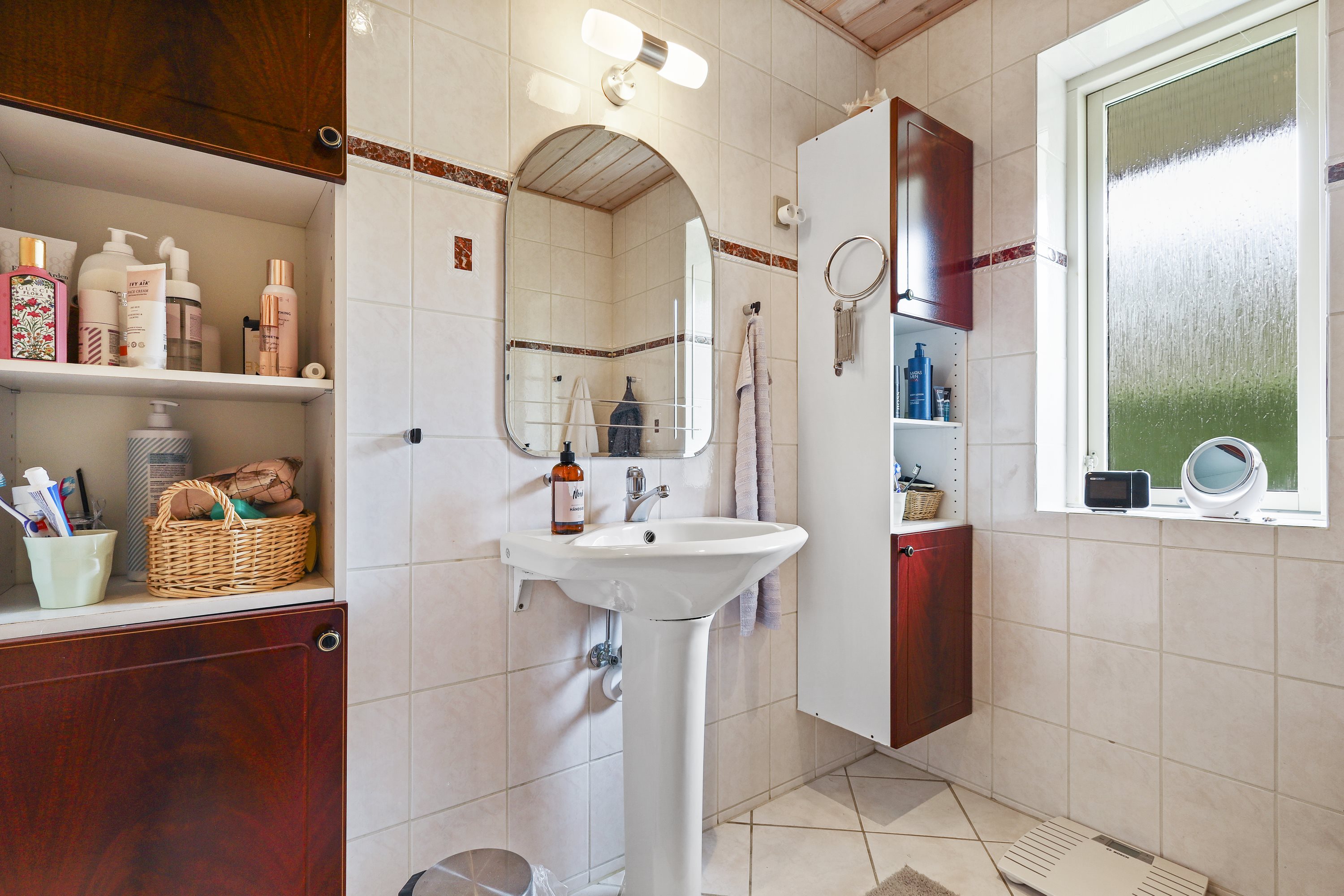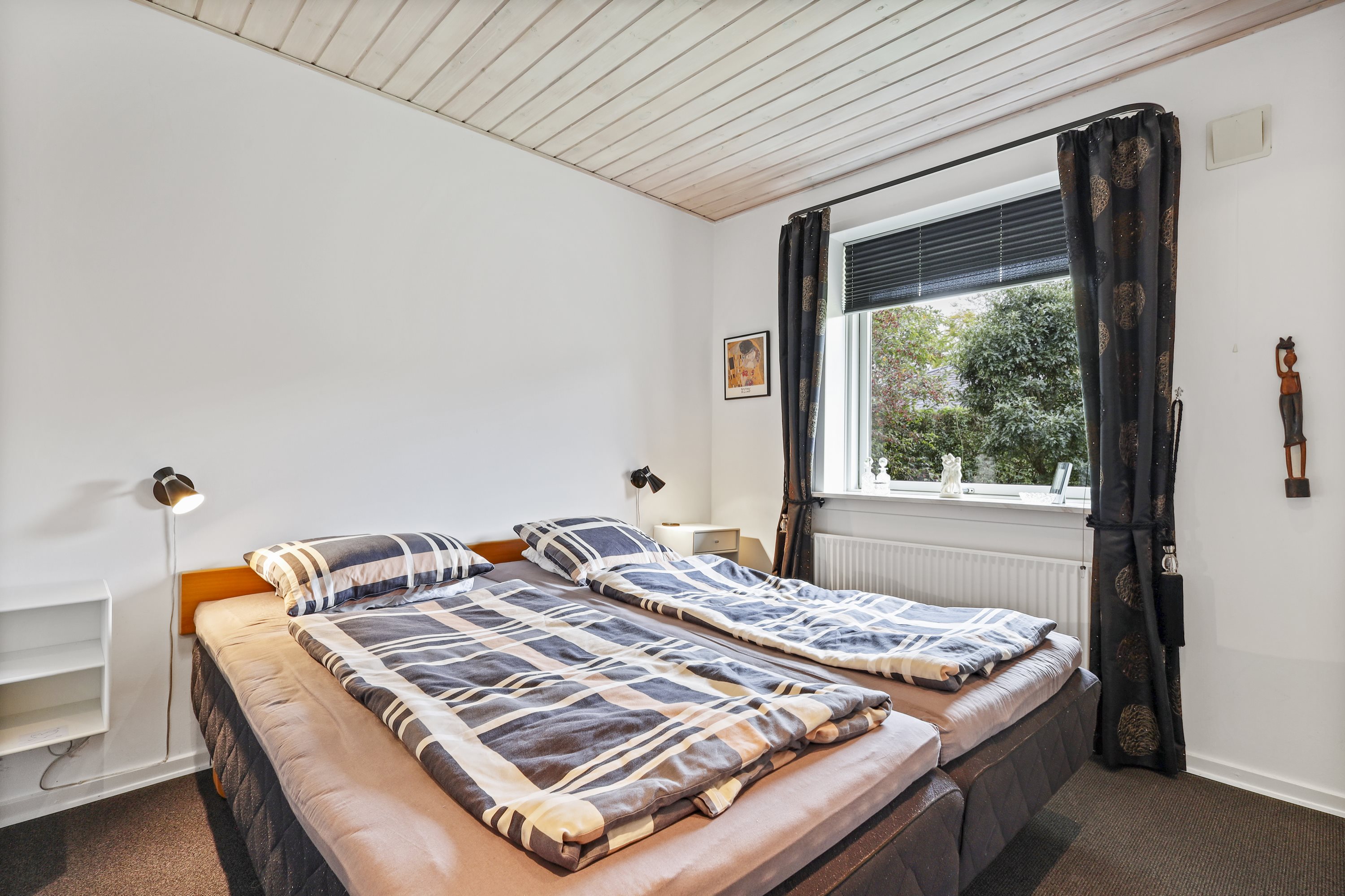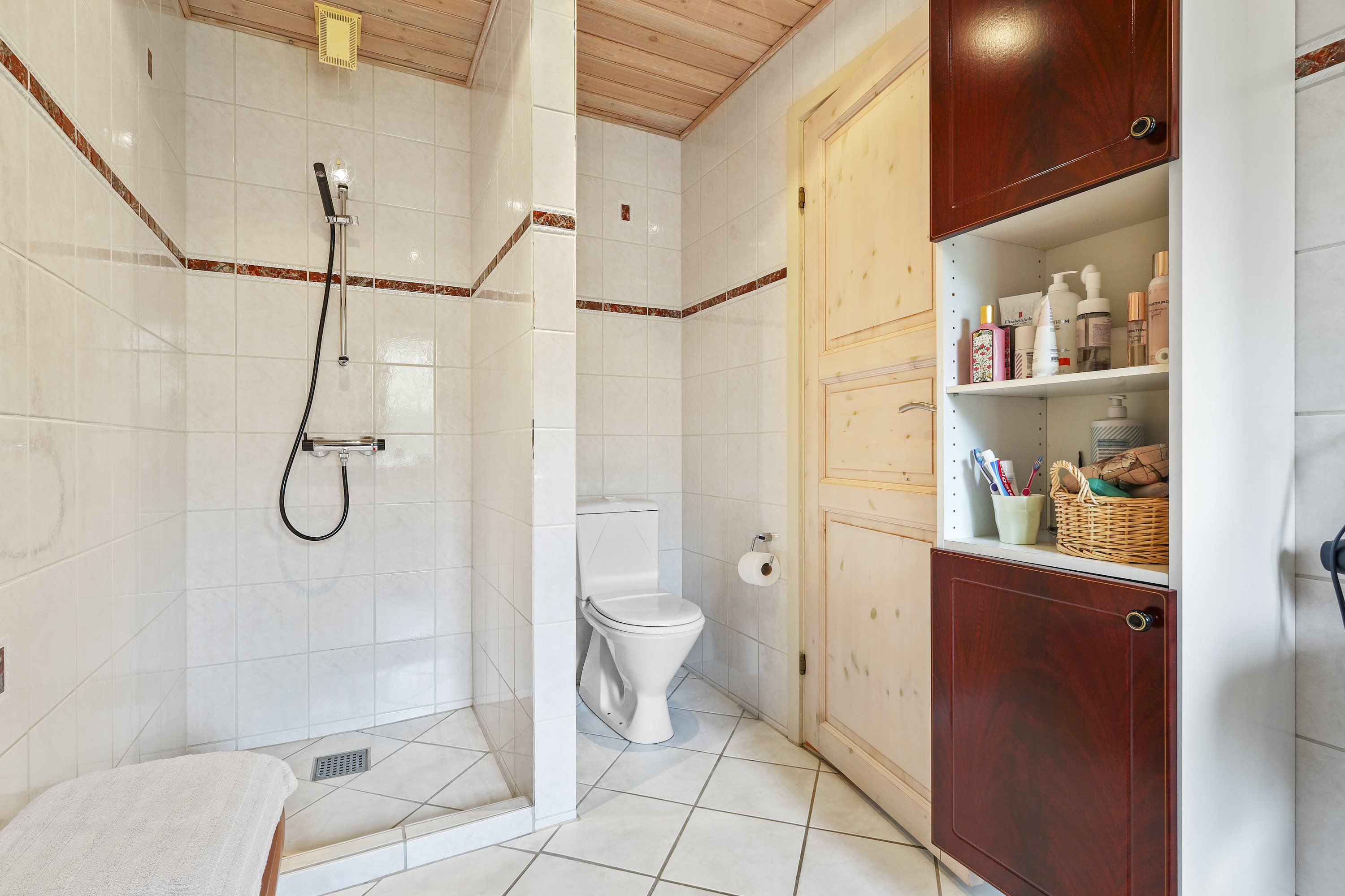 Indretningen byder på: en praktisk bryggers med plads til tøjvask. Videre er et meget velholdt køkken med en hyggelig spiseplads. Børneafdelingen består af 3 gode værelser med tilhørende badeværelse med bruseniche og gulvvarme. De to stuer er villaens ”samlingspunkt” her er de store vinduespartier med til at drage naturen ind i stuerne. Går du med en drøm om køkken/alrum, kunne man undersøge at nedlægge væggen mellem køkkenet og ”spisestuen”. Og på den måde få et stort køkken/alrum og stue i forlængelse af hinanden.