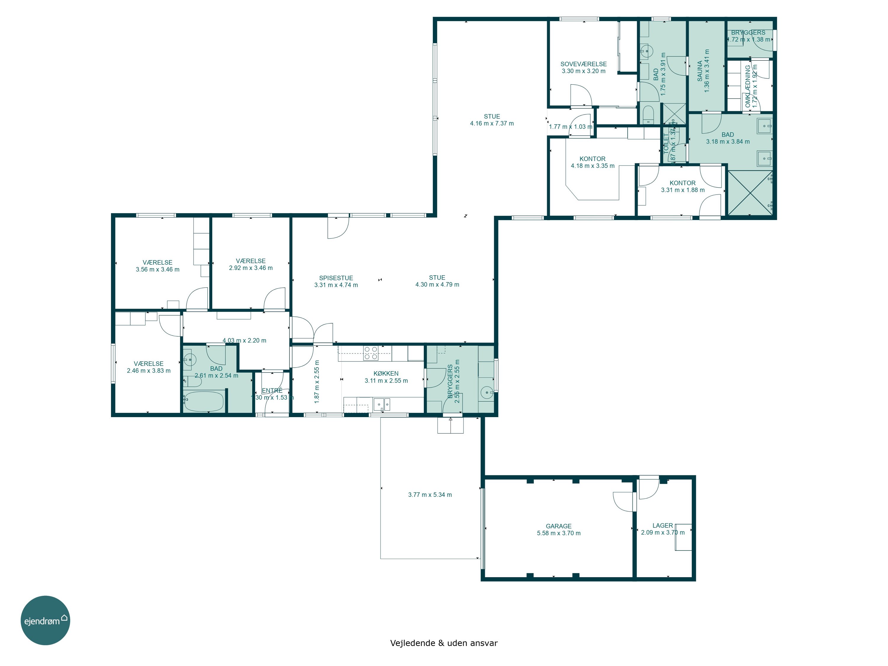 Voksenafdelingen består af et godt soveværelse, et fint badeværelse med gulvvarme og bruseniche i forlængelse heraf er en sauna. Erhvervsdelen består af et stort kontor, omklædningsrum samt et baderum. En afdeling der er perfekt til erhverv, teeangeafdeling eller noget helt tredje da man har egen indgang.