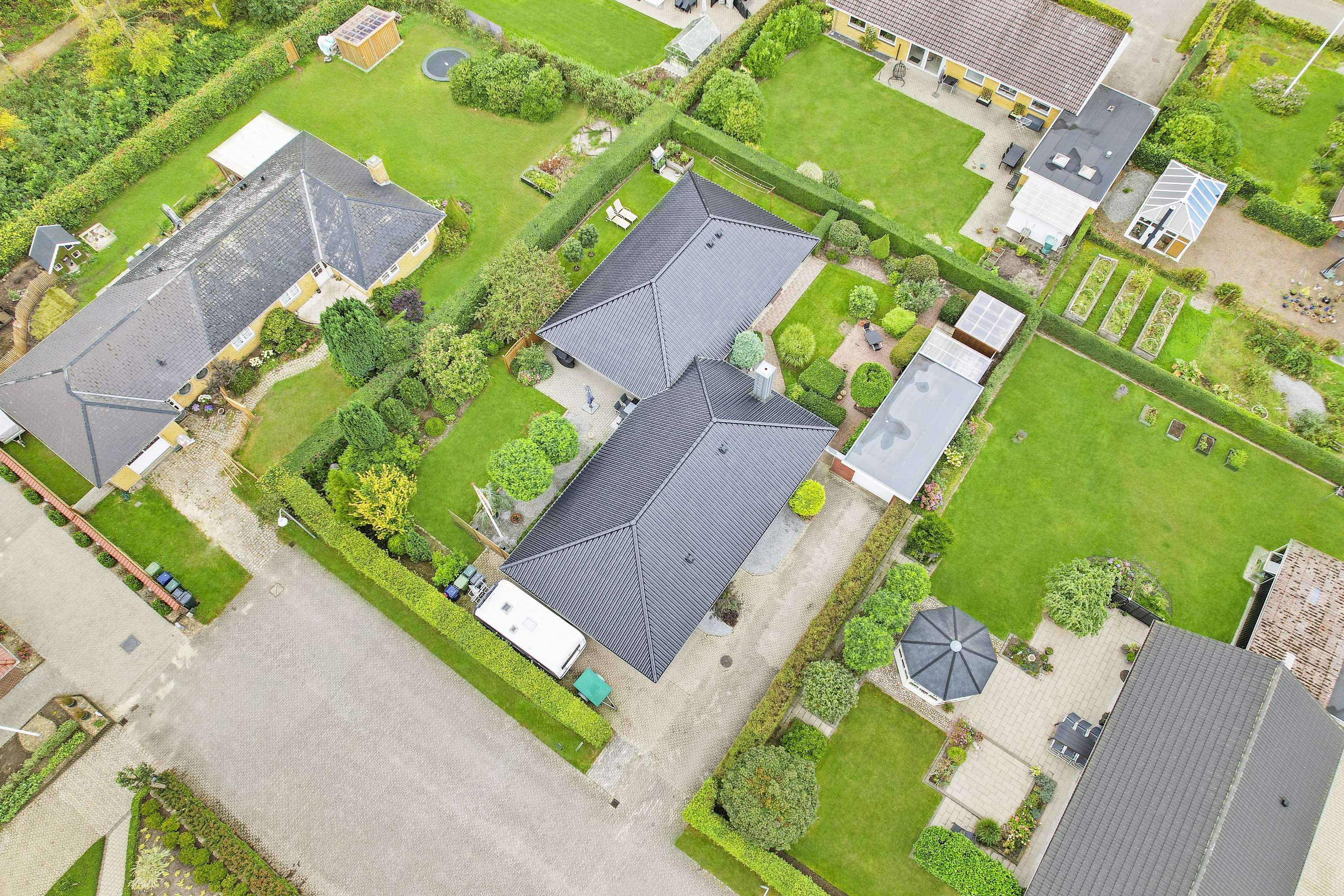 Villaen er beliggende i en lukket lomme, hvorfra der er cykelstier til hhv. skole, indkøb og institutioner.