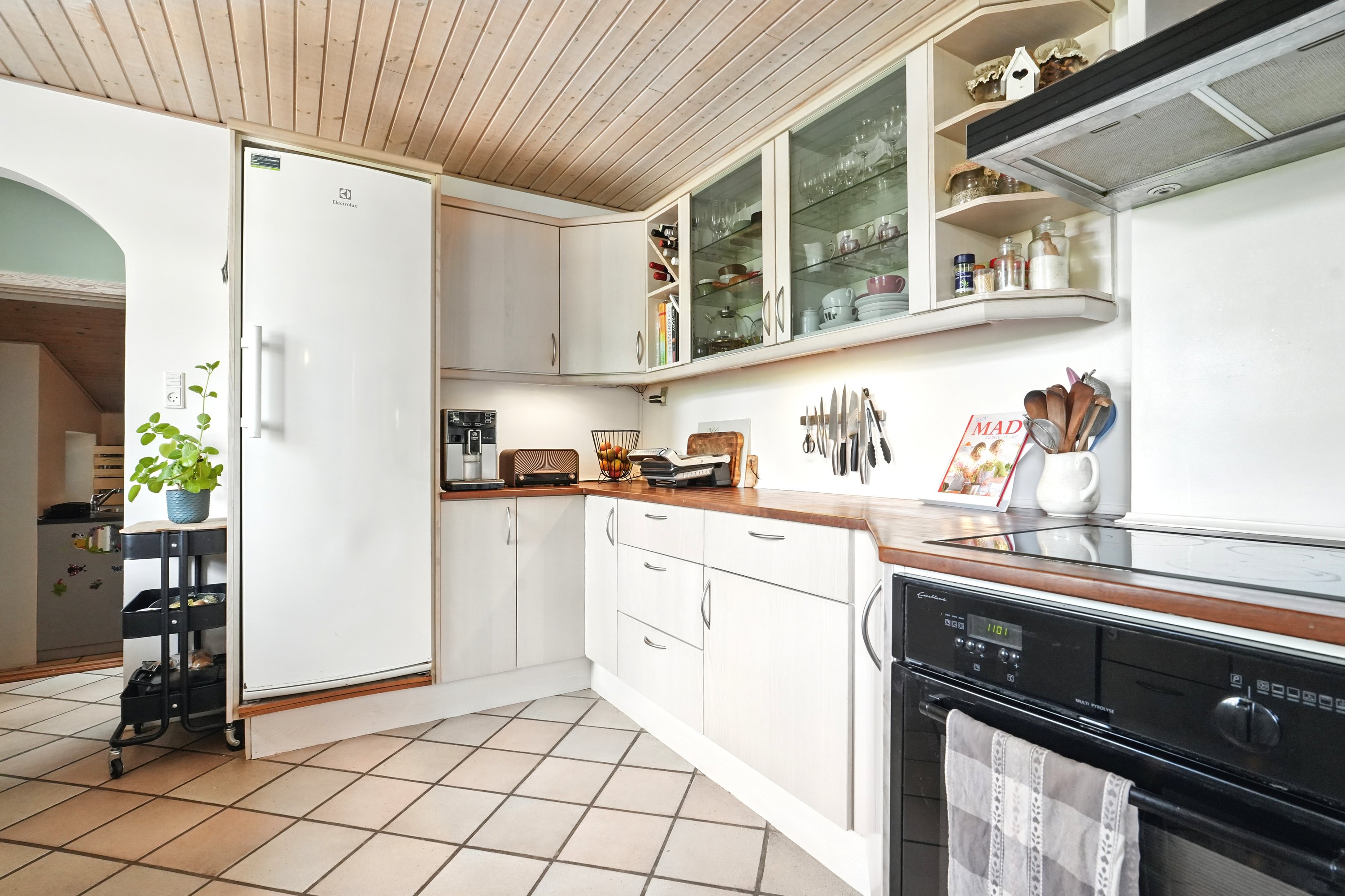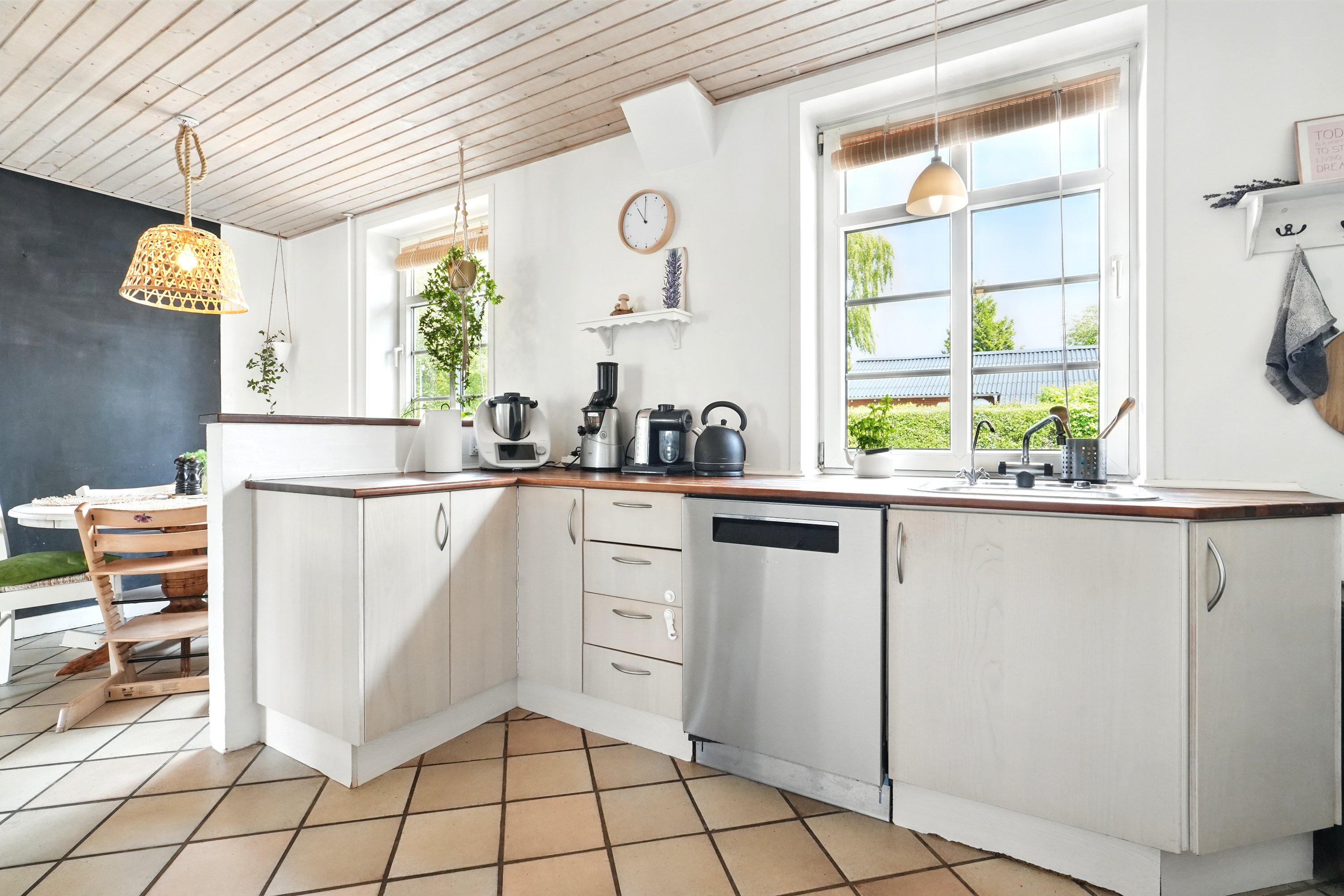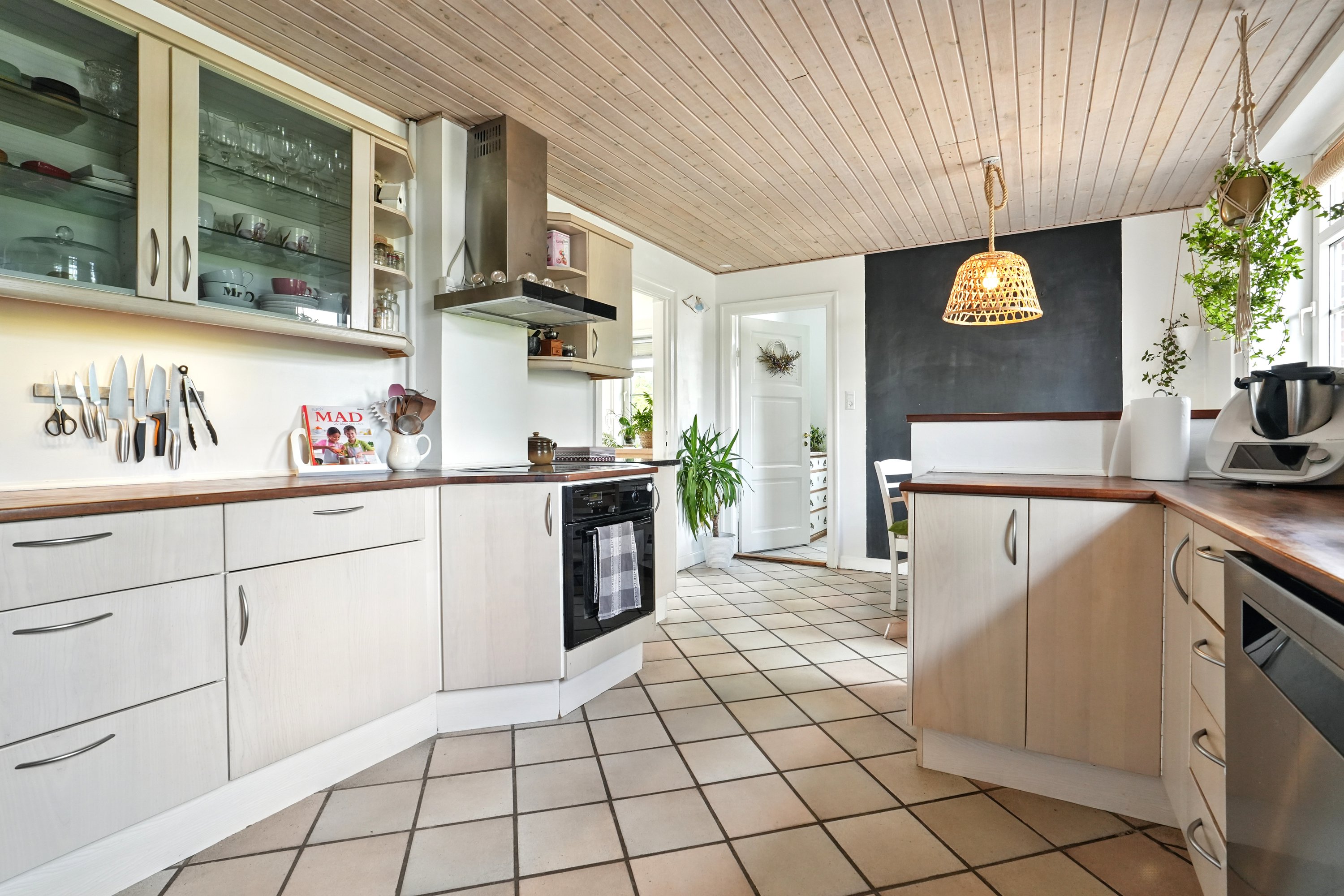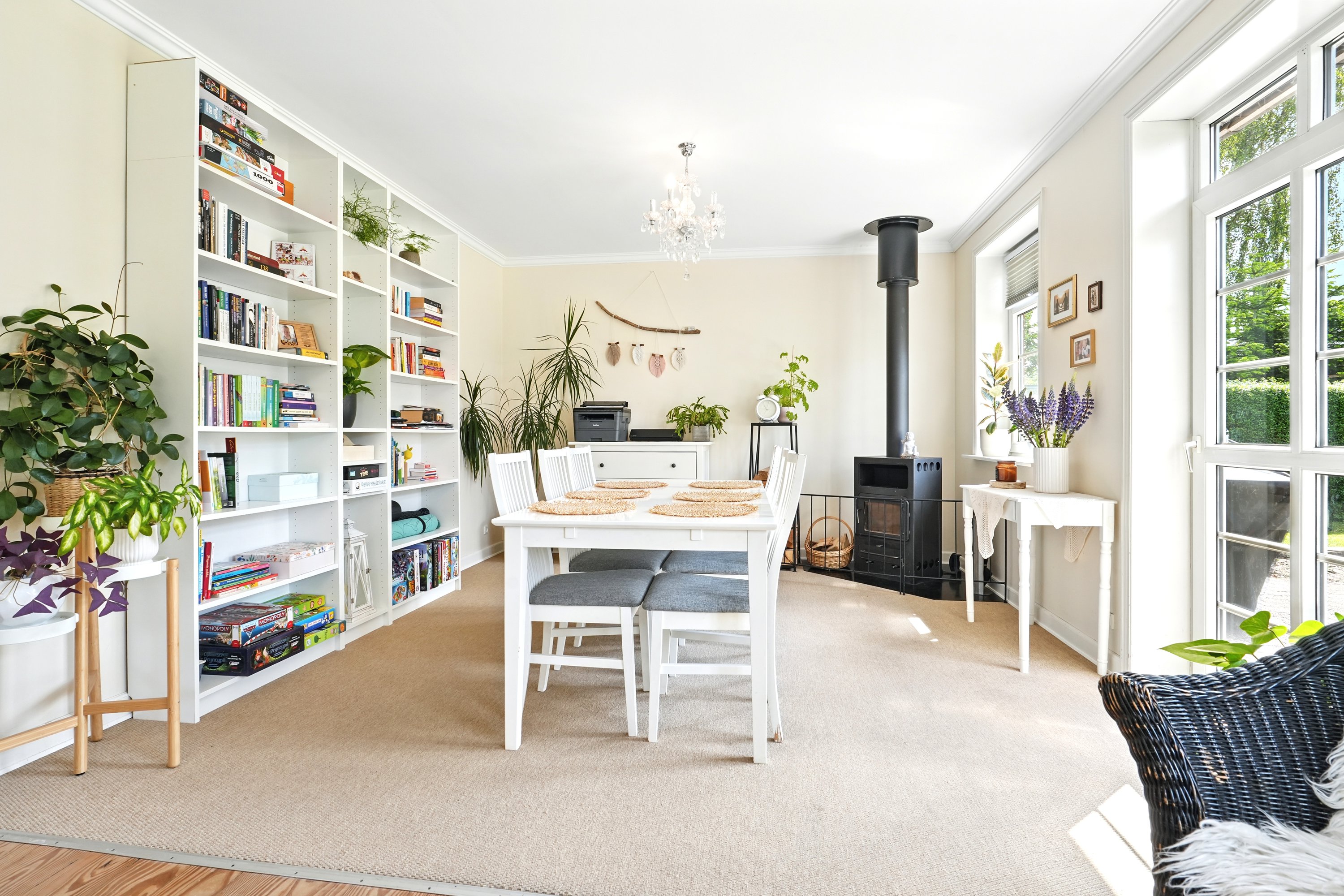 Indenfor fortsætter det gode førstehåndsindtryk. Den lyse entré tager imod med et venligt udtryk og leder jer videre ind i husets hjerte – det dejlige spisekøkken. Her er der masser af plads til at tilberede måltider, mens snakken går og vinen skænkes ved spisebordet. Når huset er fuldt af gæster, er det skønt, at den rummelige stue både kan rumme et stort spisebord og en hyggelig sofakrog – et perfekt rum til både festlige lejligheder og stille aftener. I stueetagen finder I desuden et stort og praktisk bryggers samt et pænt og rummeligt badeværelse.