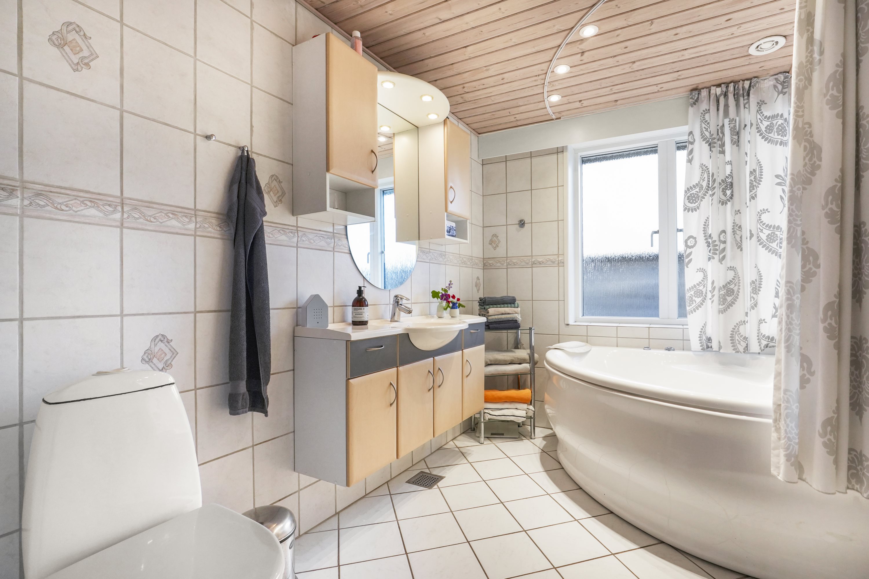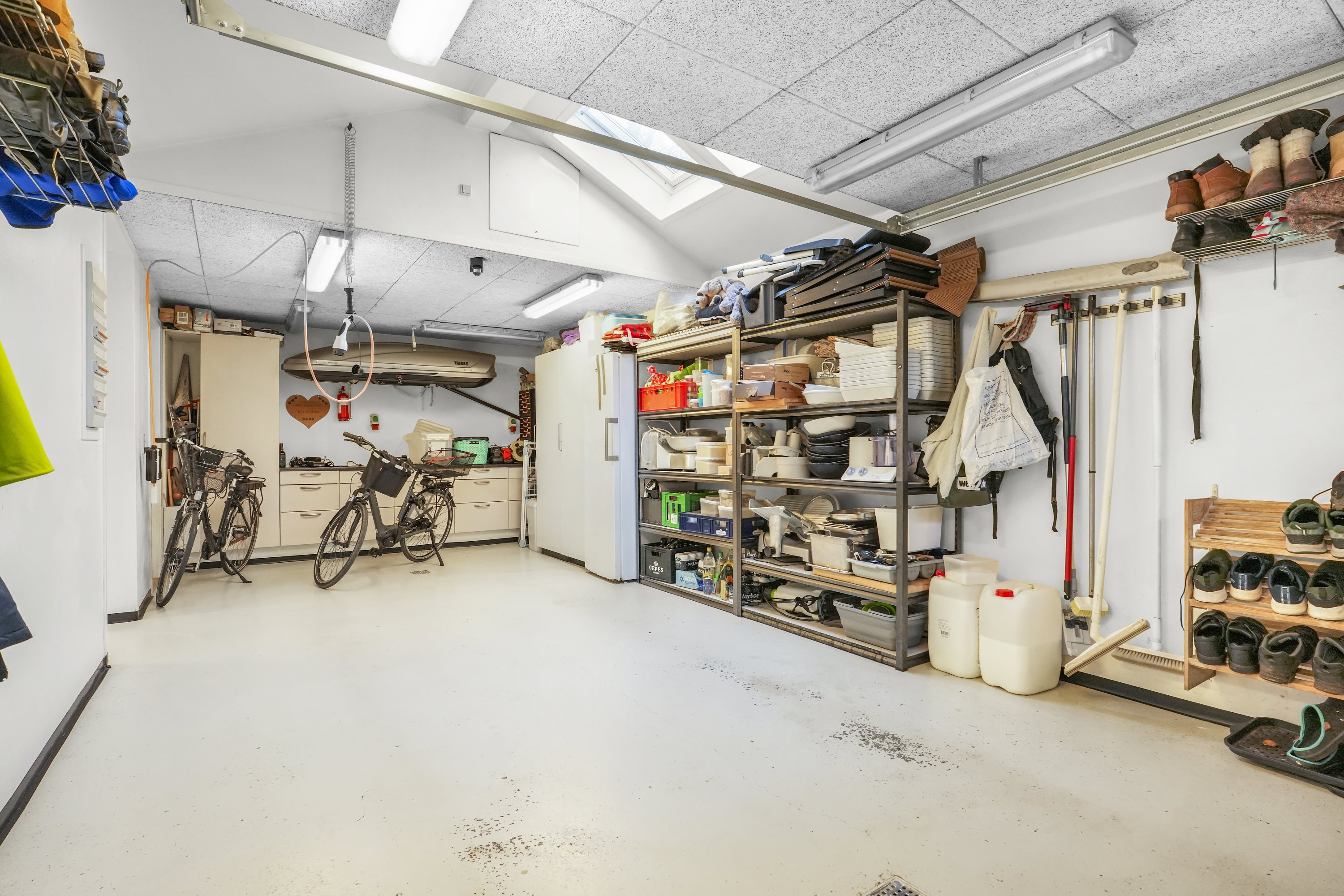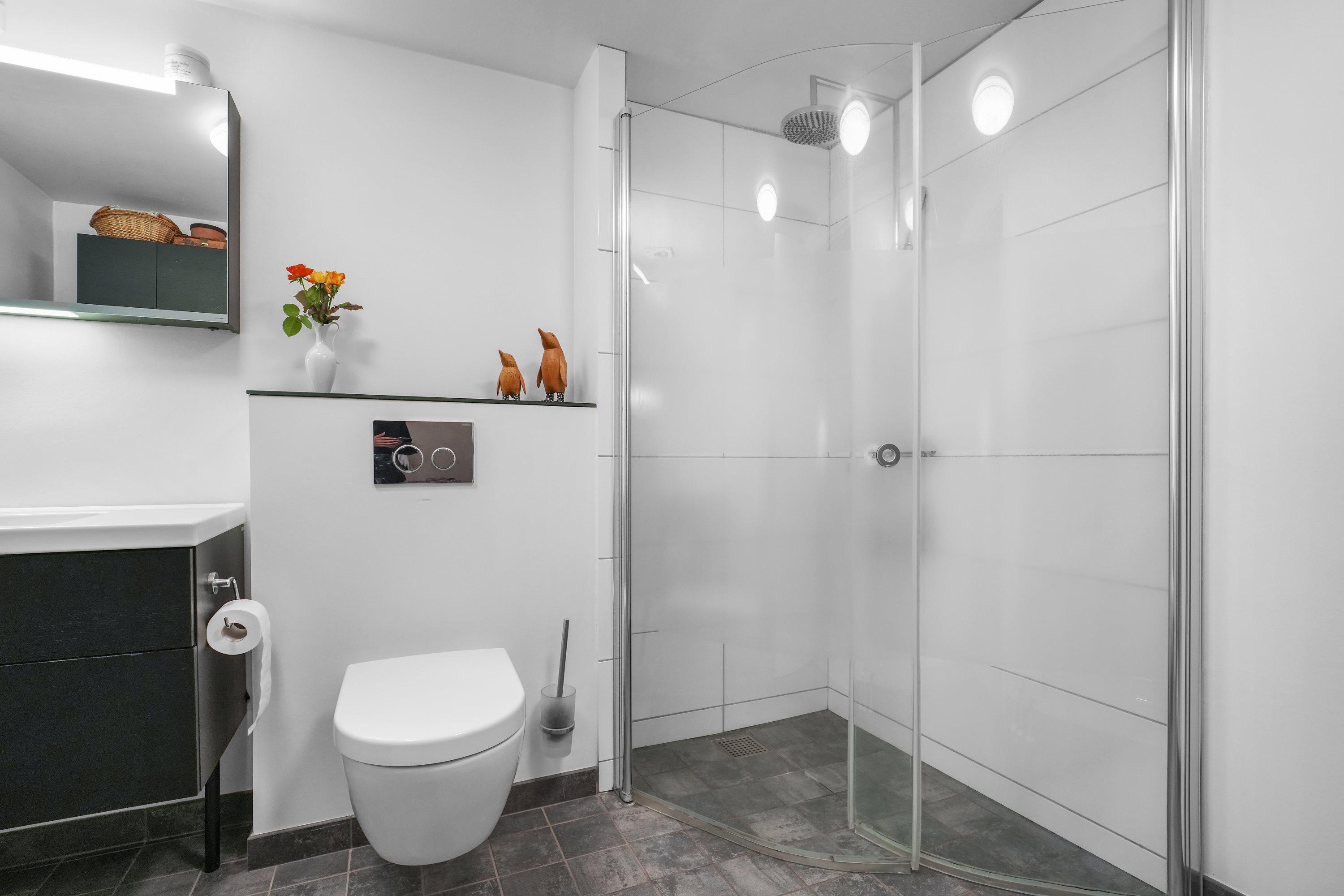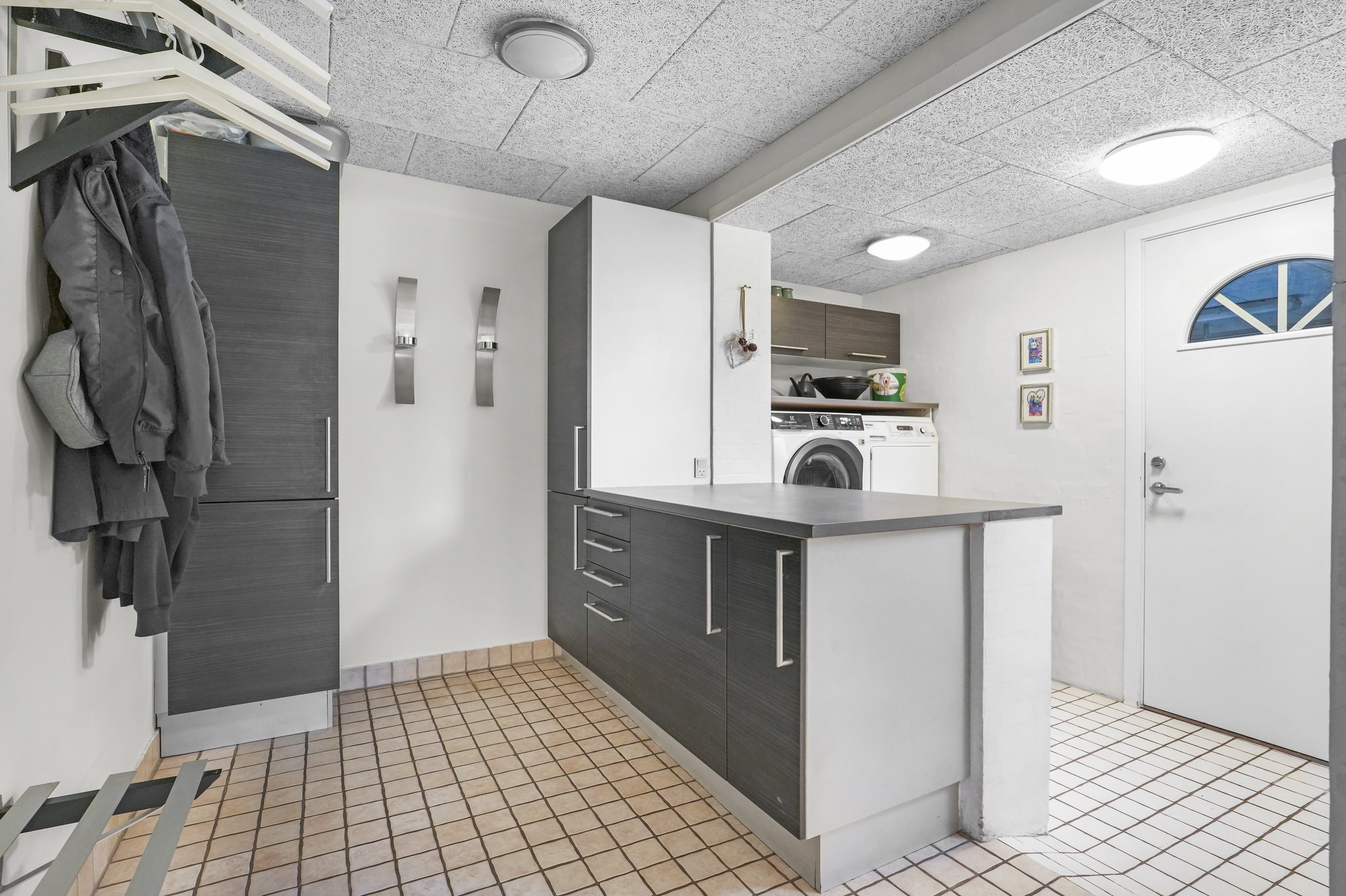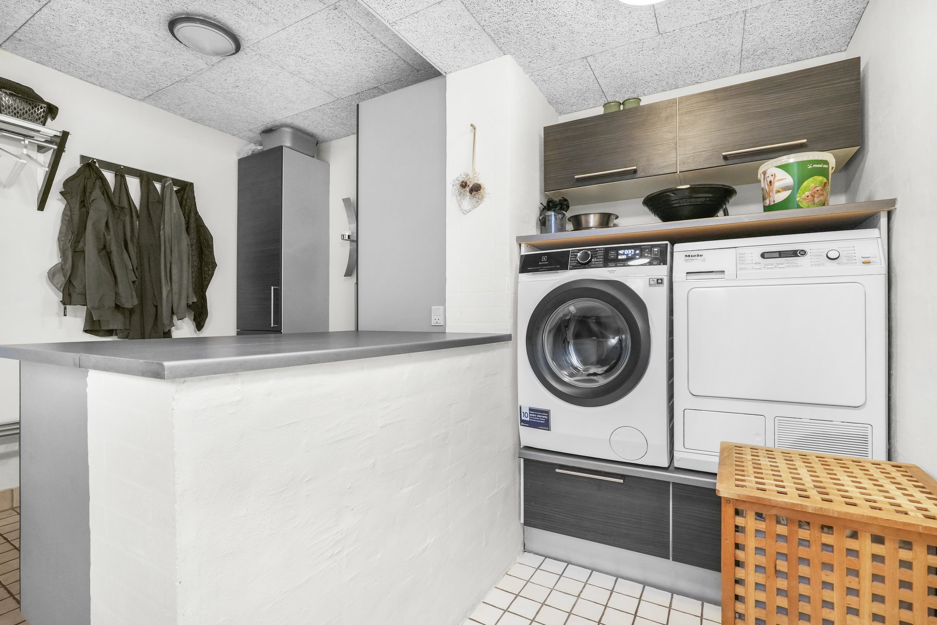 Indretningen byder på et lyst og praktisk bryggers med masser af skabsplads og gode løsninger til hverdagens praktiske opgaver. Bryggerset fungerer som det perfekte bindeled mellem villa og garage, så du kan komme tørskoet ind og ud. Herfra er der også adgang til villaens ene badeværelse – ideelt placeret ved garagen, så teenageren kan holde fest uden at forstyrre resten af husstanden.
