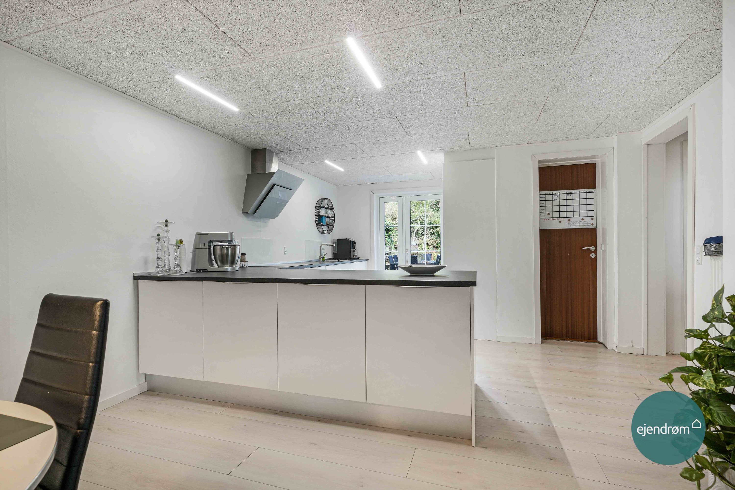“Hjertet” er det åbne og lyse køkken/alrum, hvor der her i moderniseringen tænkt i pæne tidsløse materialer. I forbindelse med køkkenet er der er godt viktualierum. Yderligere er der samtidig god plads til spisebordet, så hele familien kan samles.