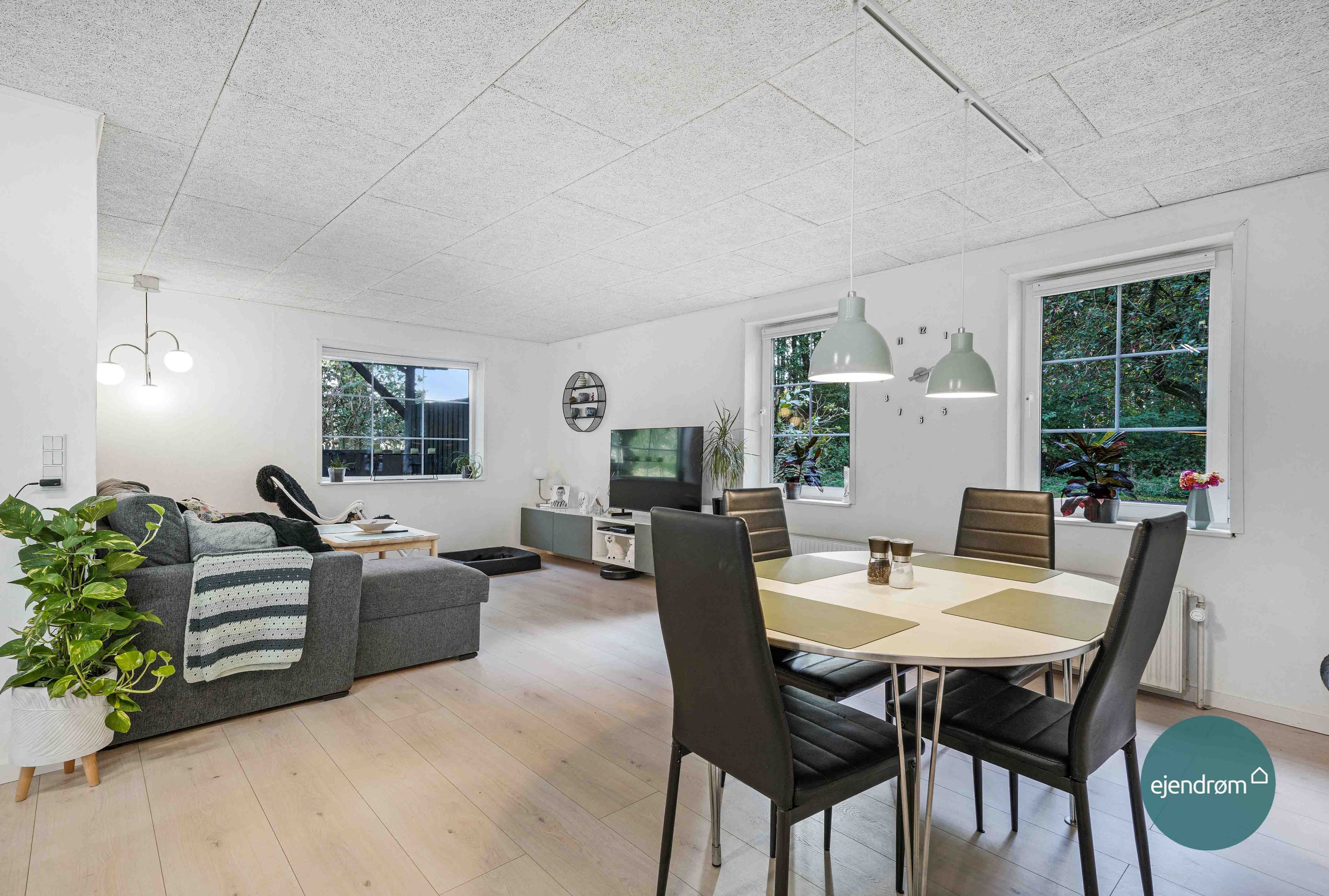 Stuen er lys og hyggelig, hvor vinduespartierne er med til at sikre dig til fantastisk lysindfald.