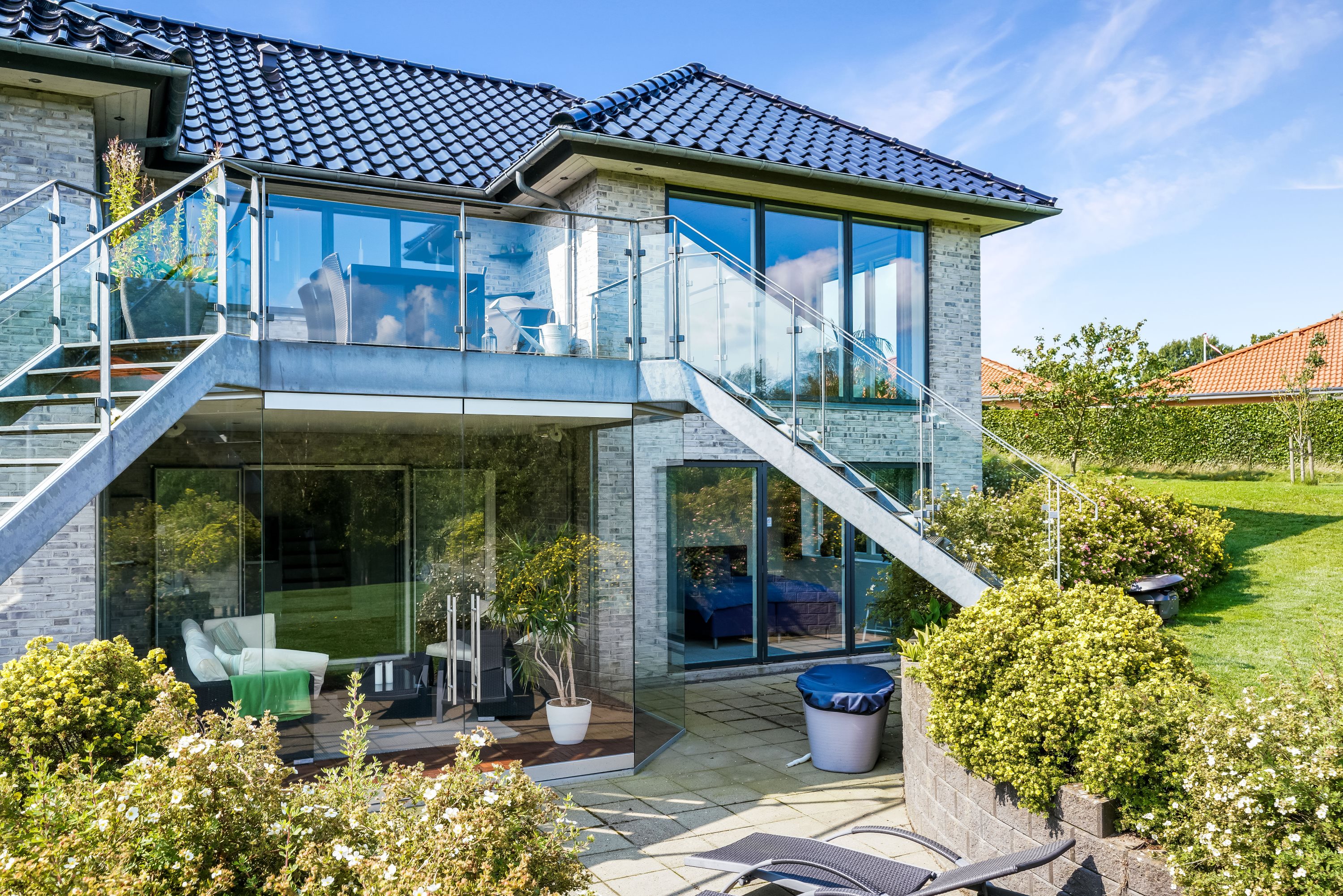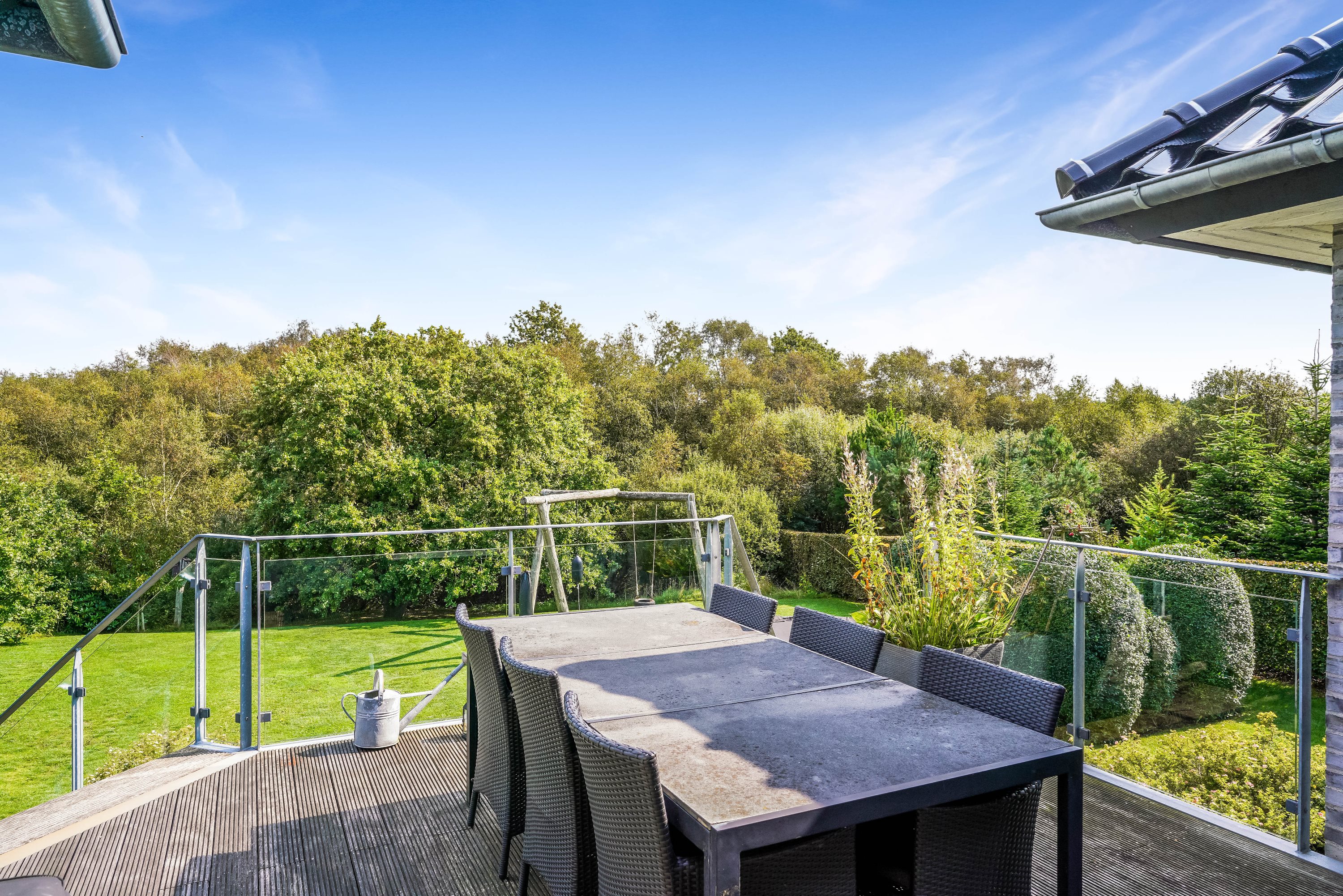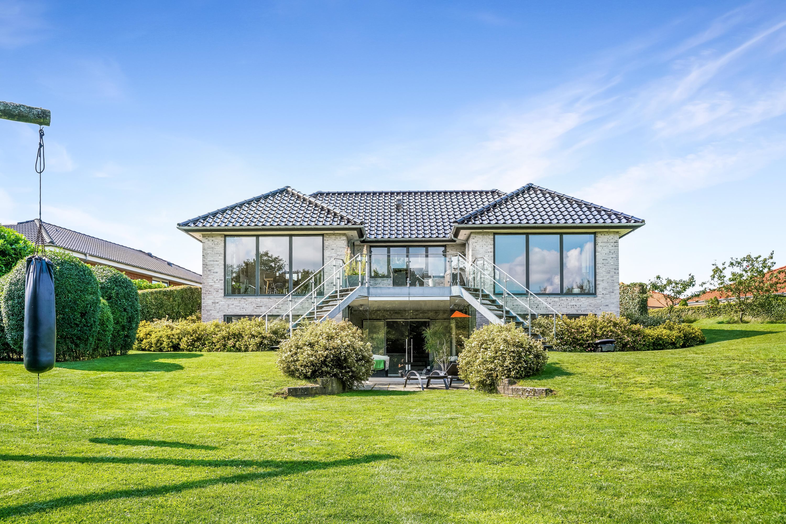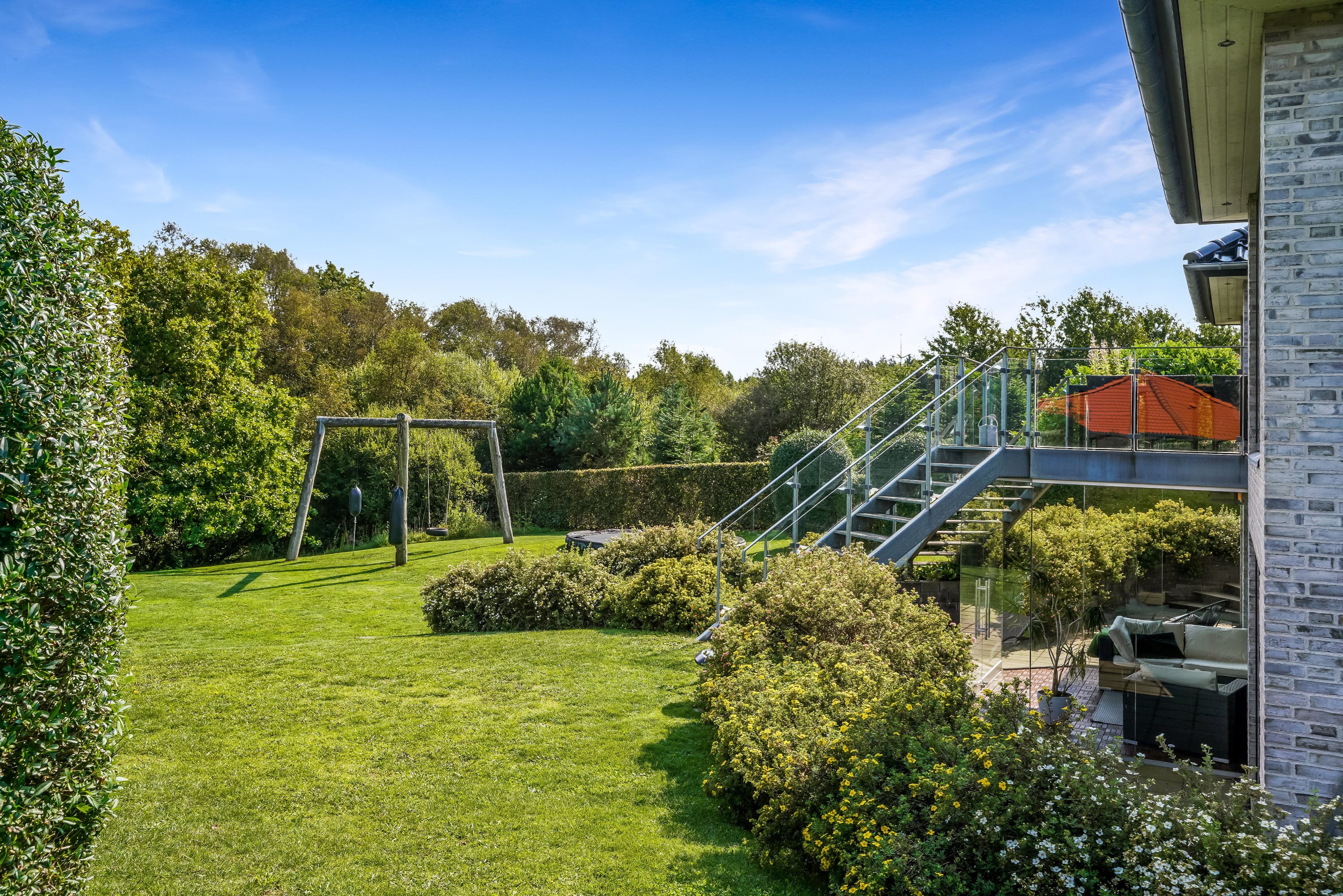 Opholdsstuen i underetagen er indrettet med god plads til både afslapning og underholdning og har adgang til en dejlig udestue med den rummelige altan over sig, der tilbyder en fantastisk udsigt over det omkringliggende landskab.