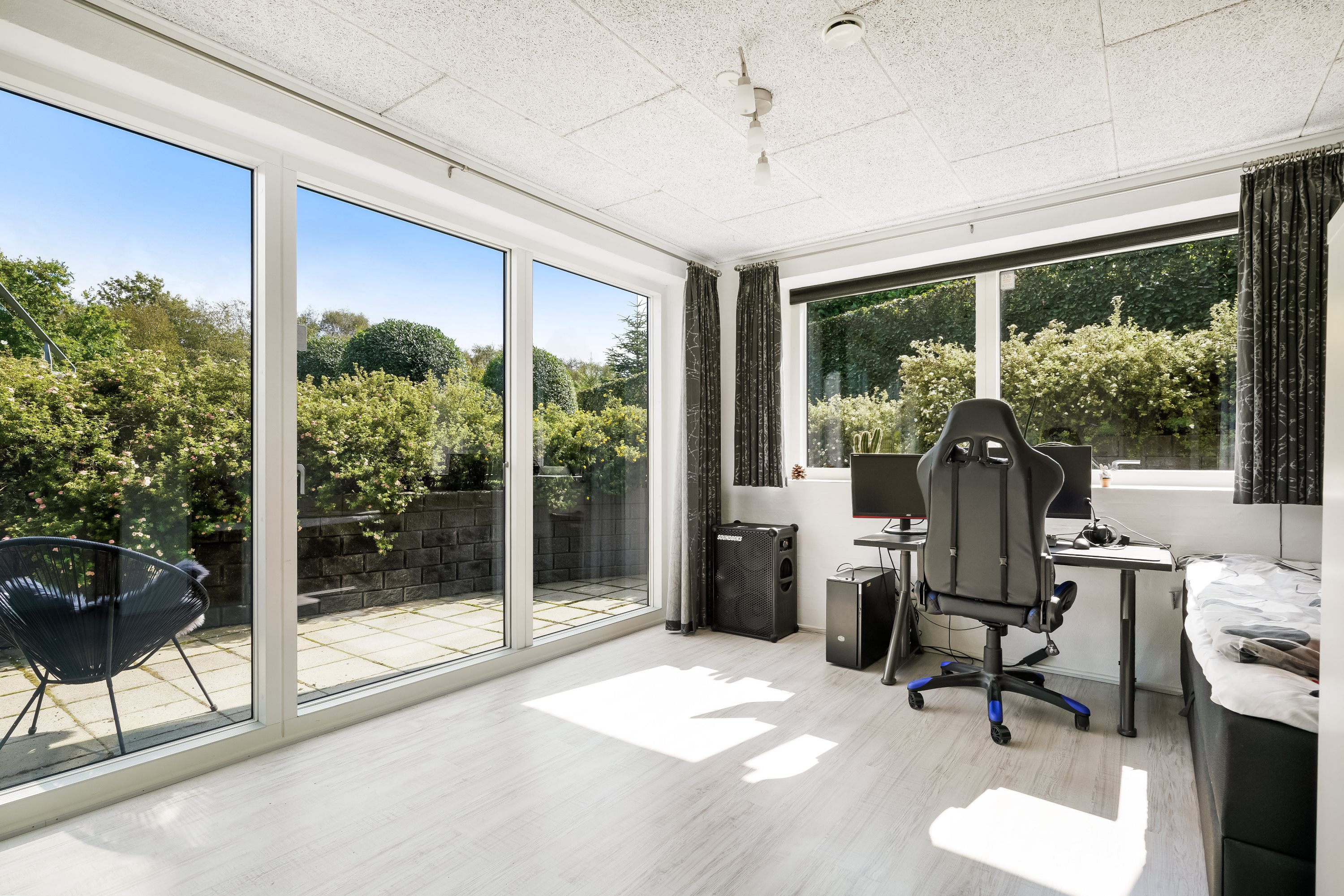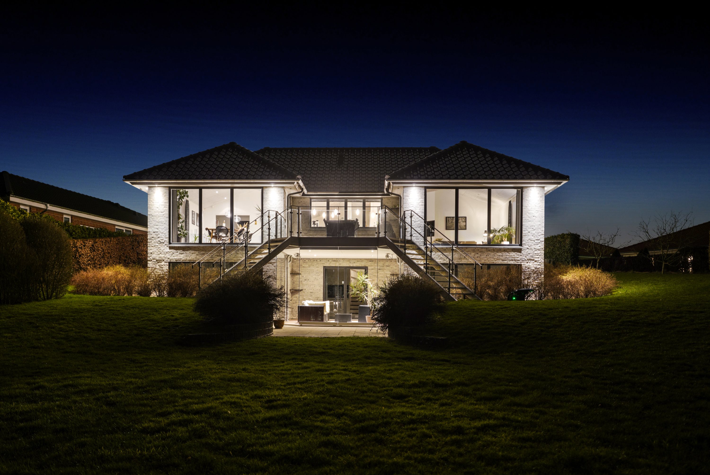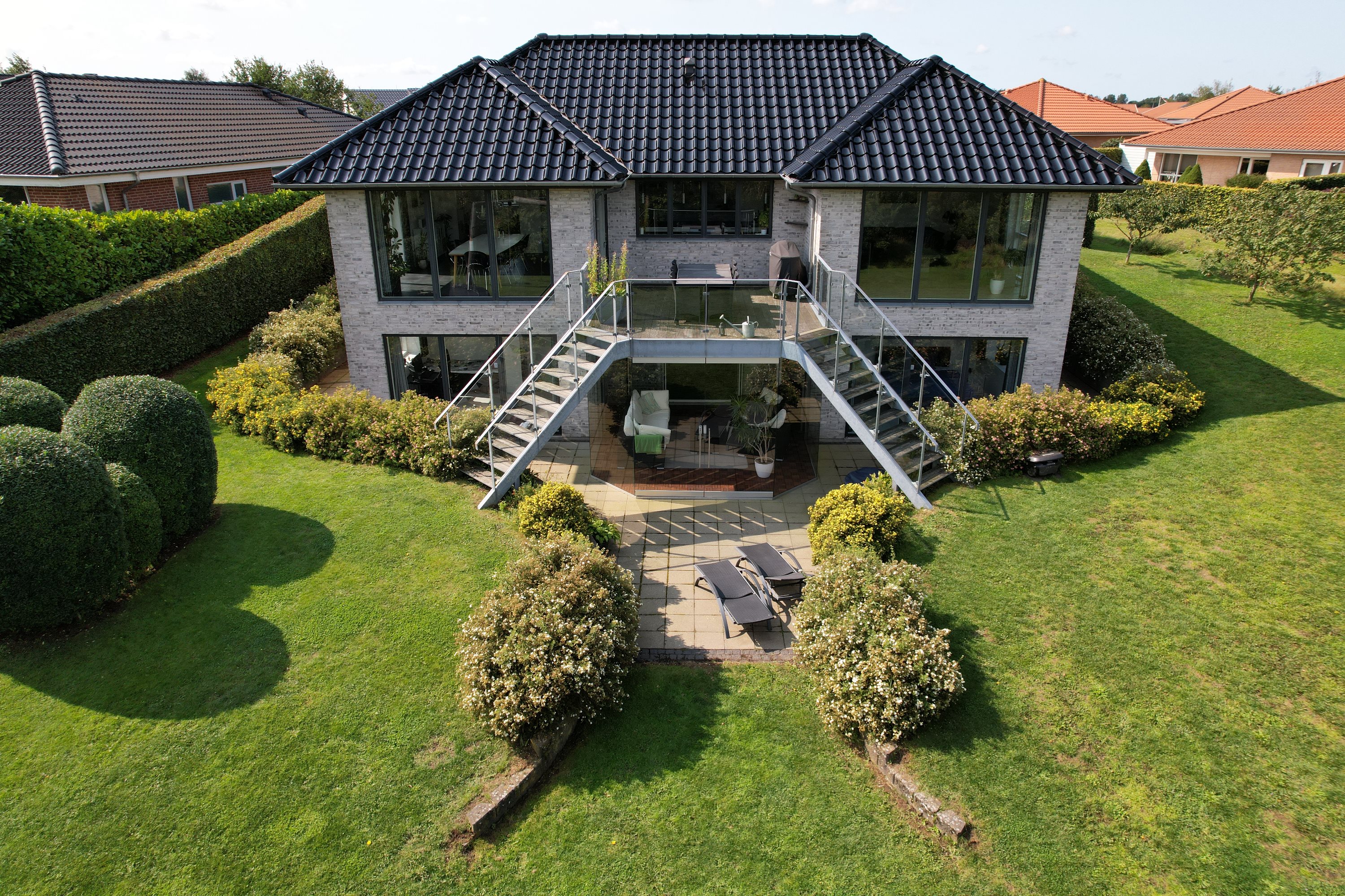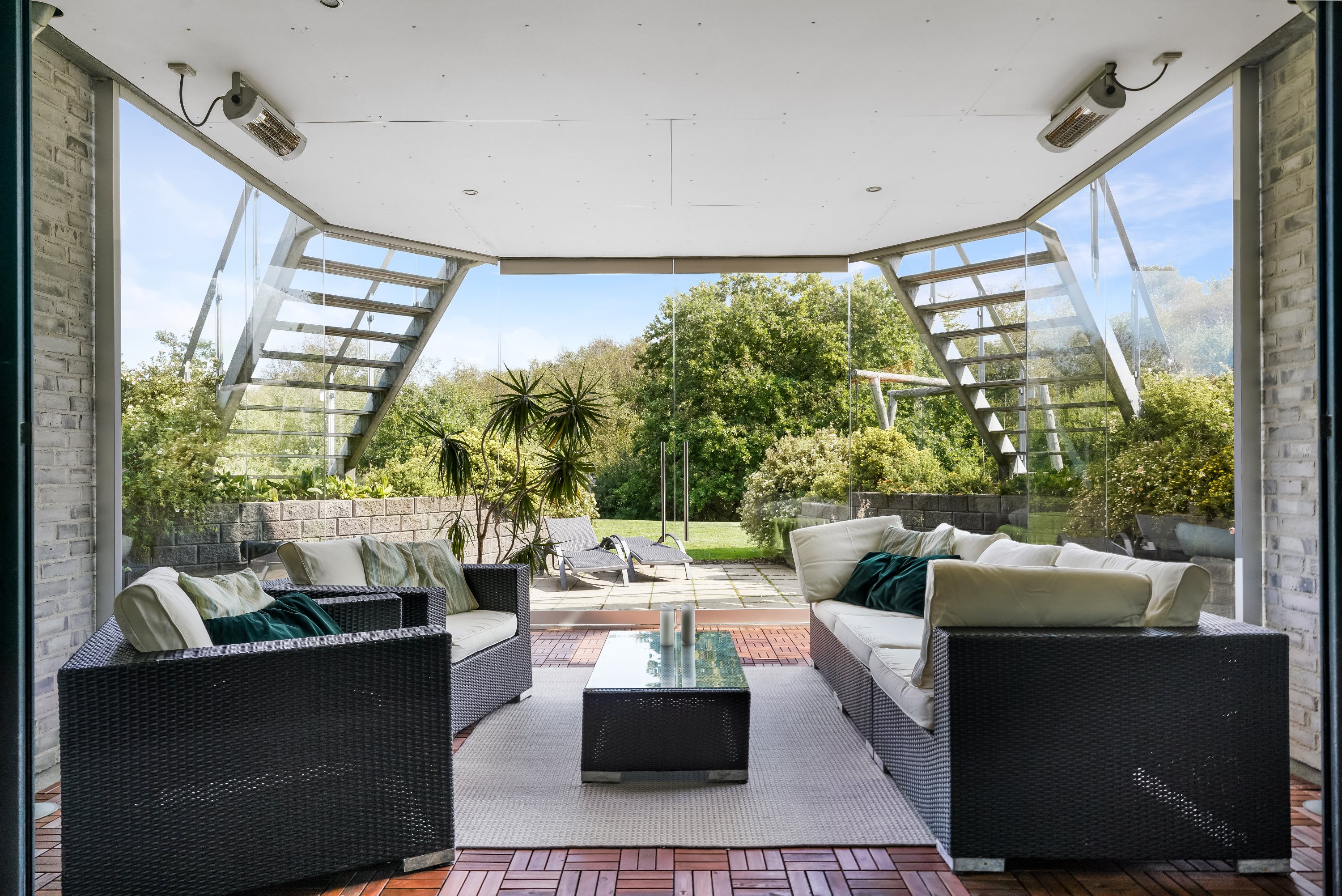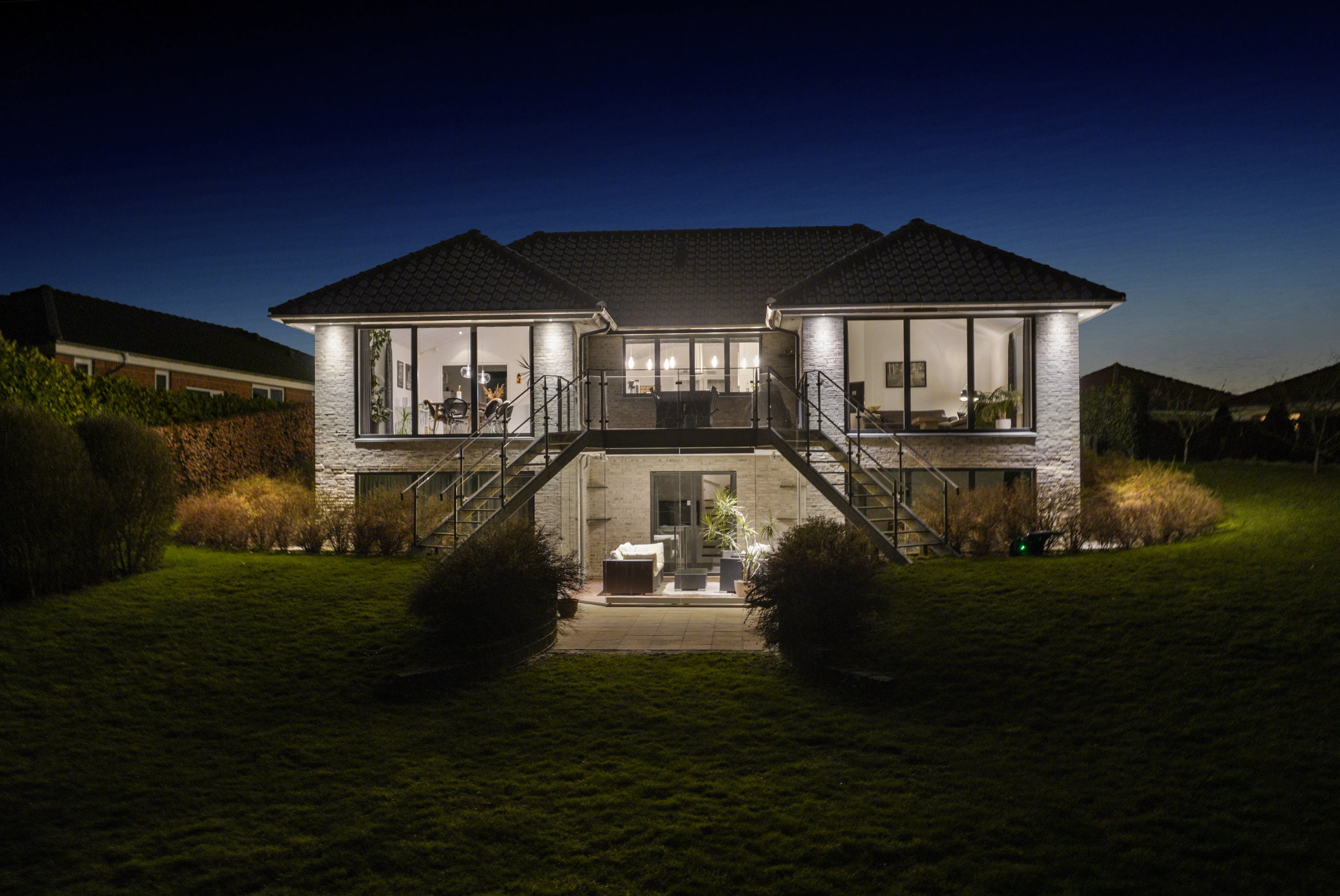 Opholdsstuen i underetagen er indrettet med god plads til både afslapning og underholdning og har adgang til en dejlig udestue med den rummelige altan over sig, der tilbyder en fantastisk udsigt over det omkringliggende landskab.