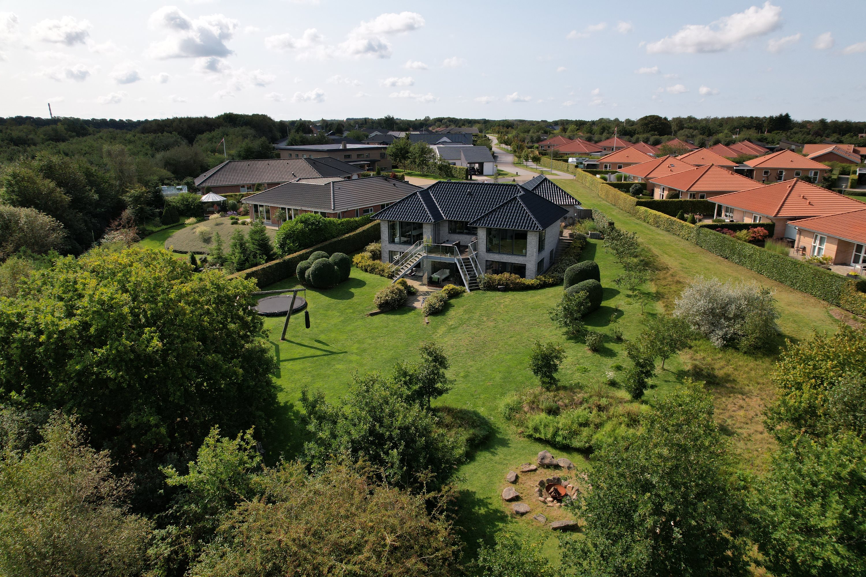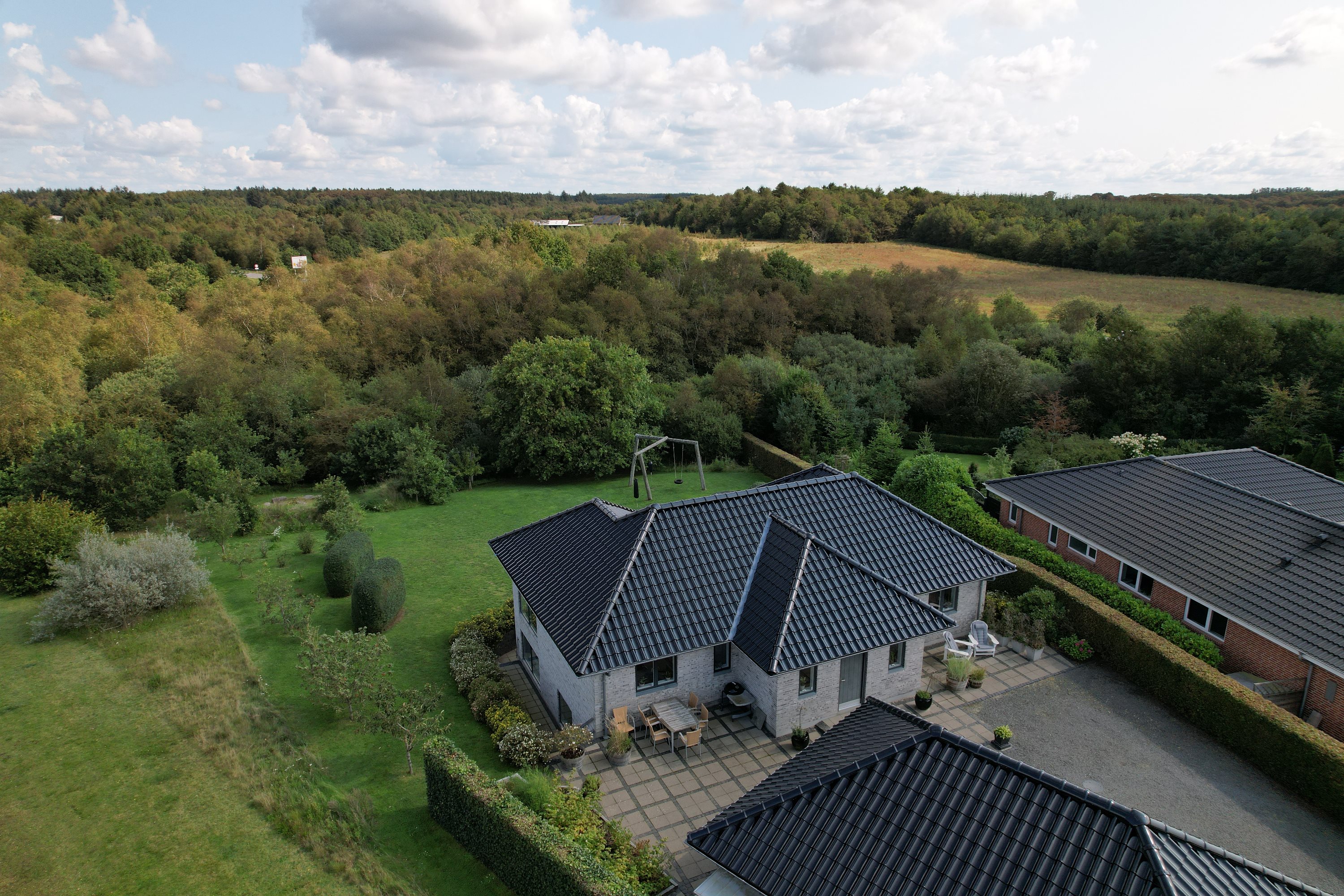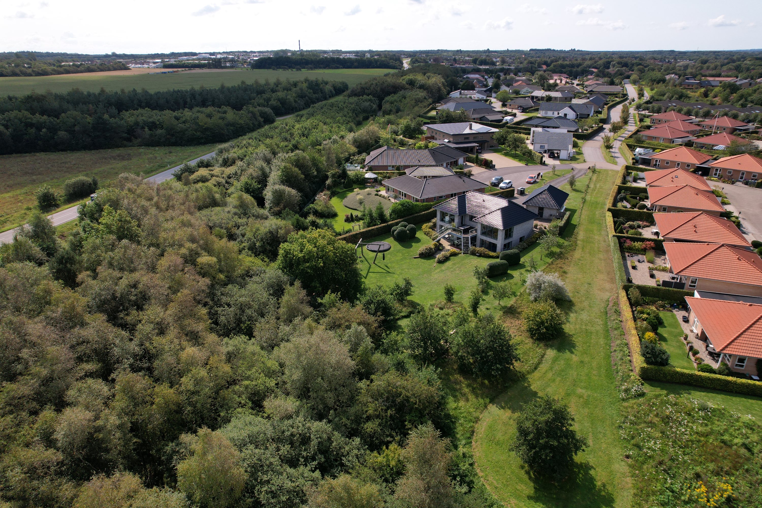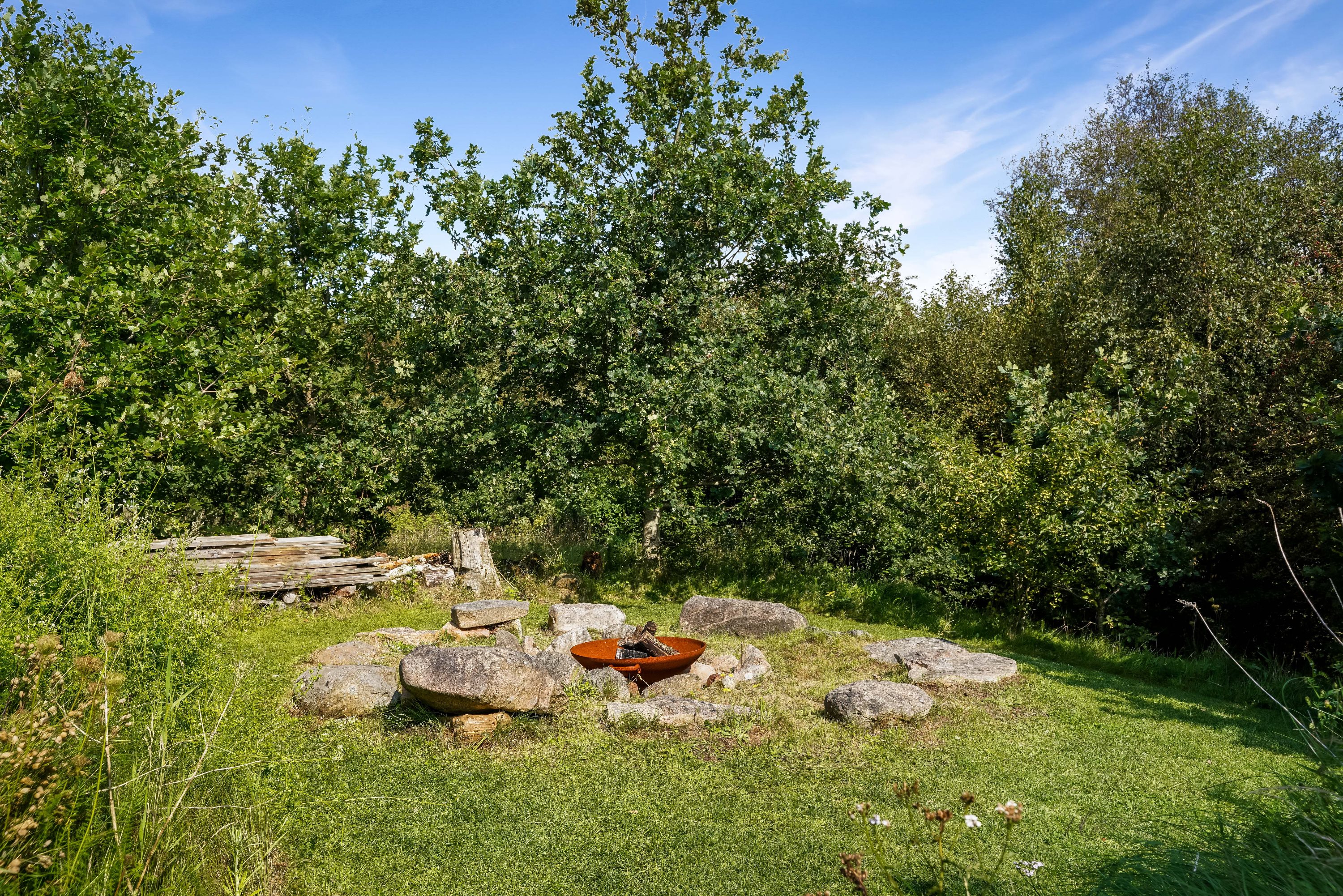Ejendommen er strategisk placeret ud til skovareal, hvilket giver indtrykket af at have ens egen private skov lige udenfor døren. Dette tilføjer et ekstra lag af ro og fred til den allerede idylliske beliggenhed.