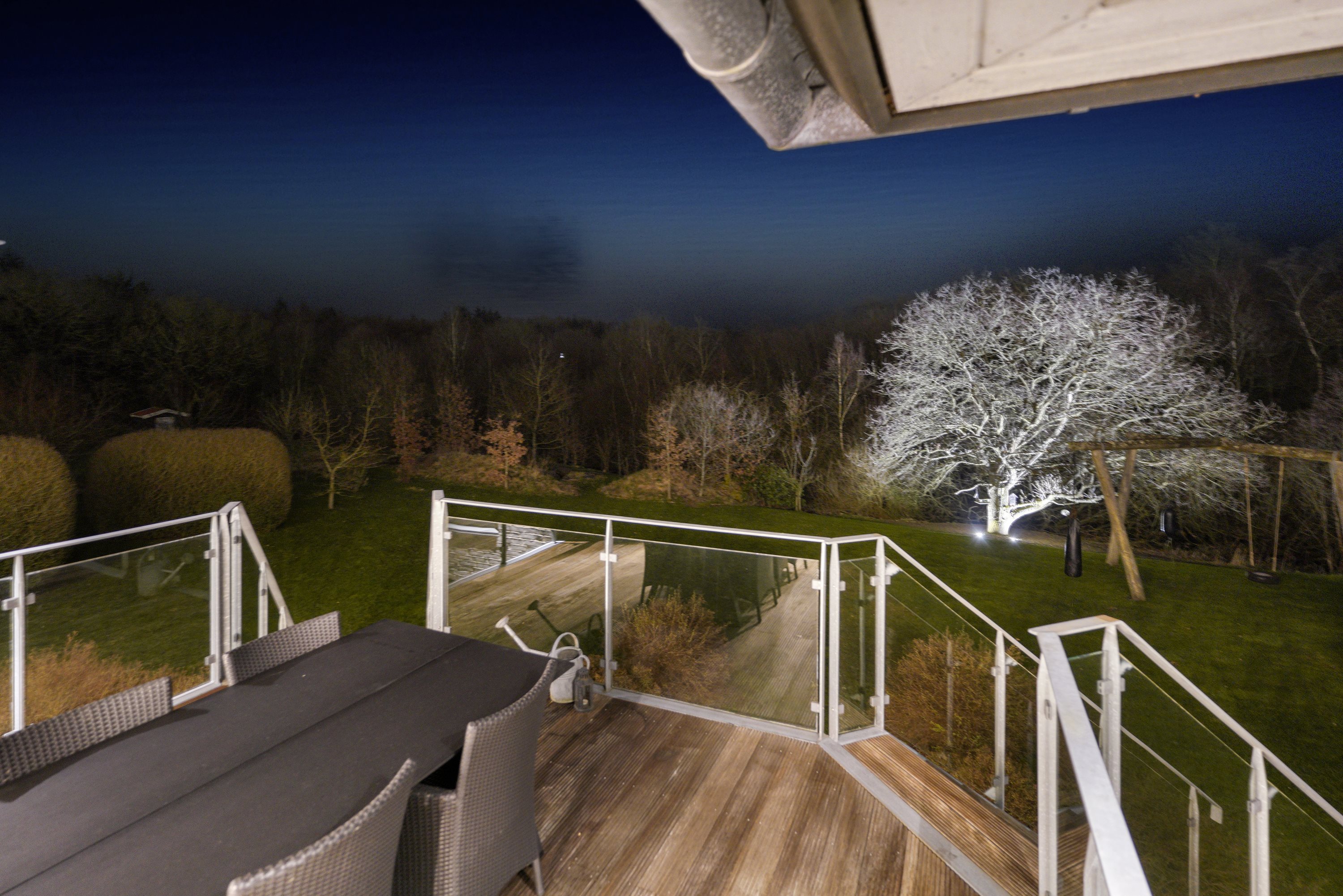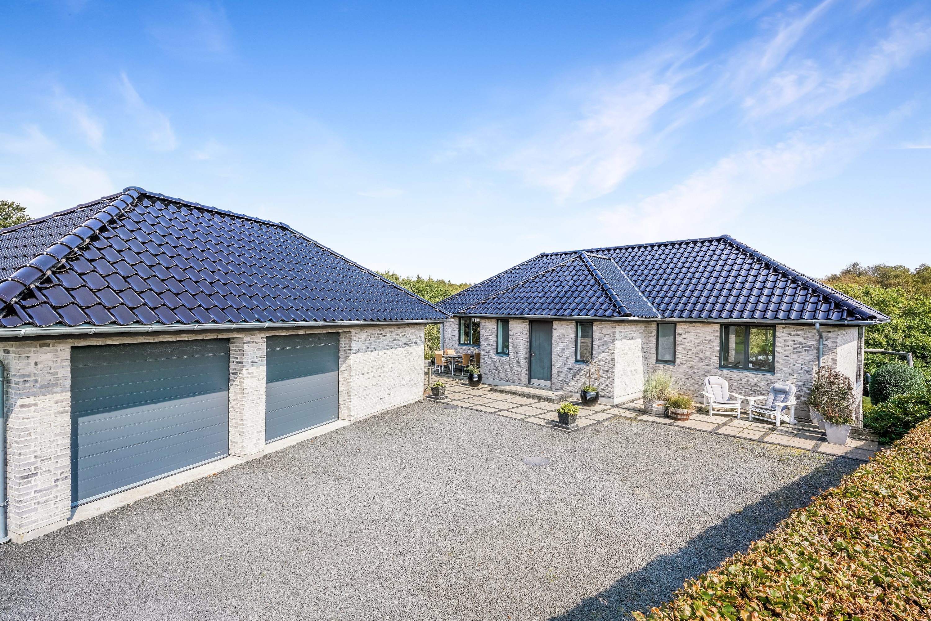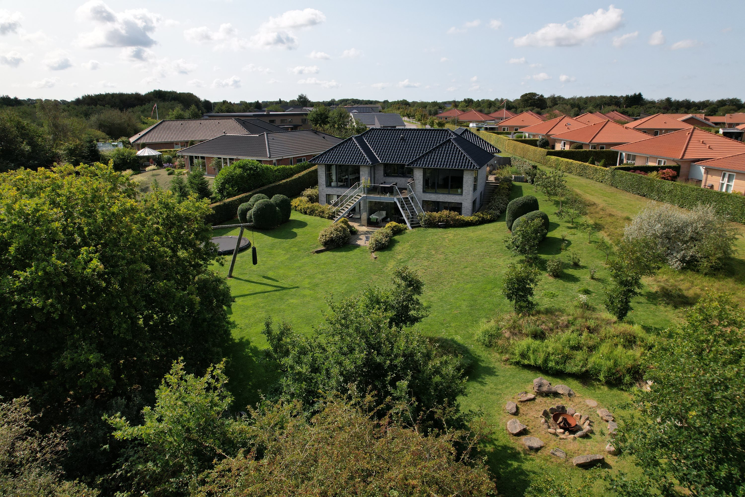Ejendommen er strategisk placeret ud til skovareal, hvilket giver indtrykket af at have ens egen private skov lige udenfor døren. Dette tilføjer et ekstra lag af ro og fred til den allerede idylliske beliggenhed.