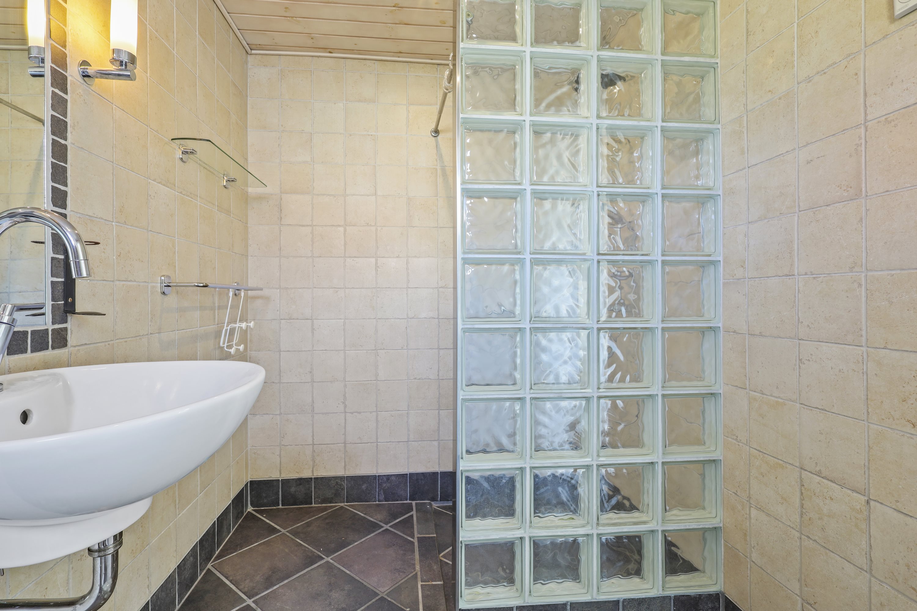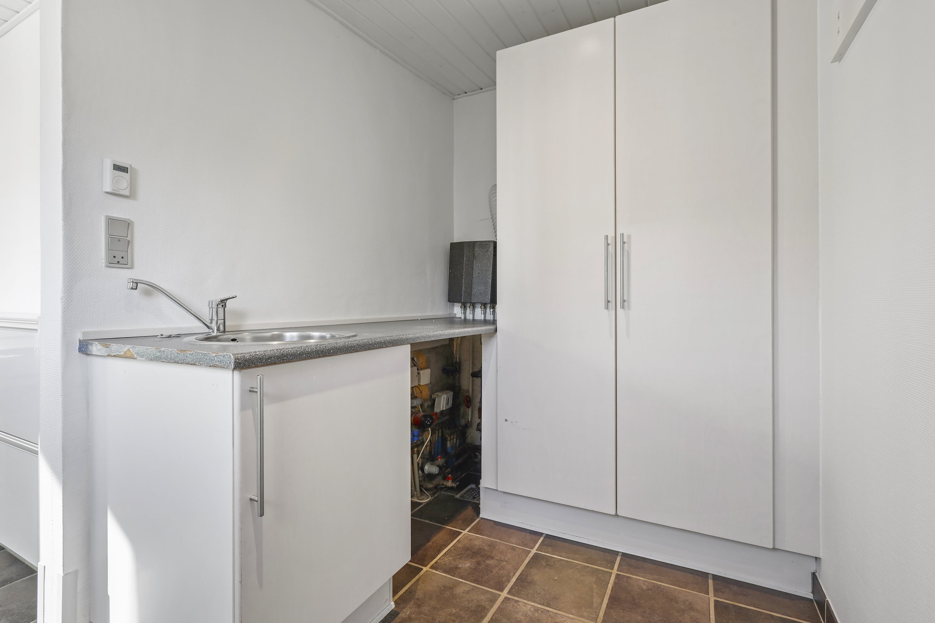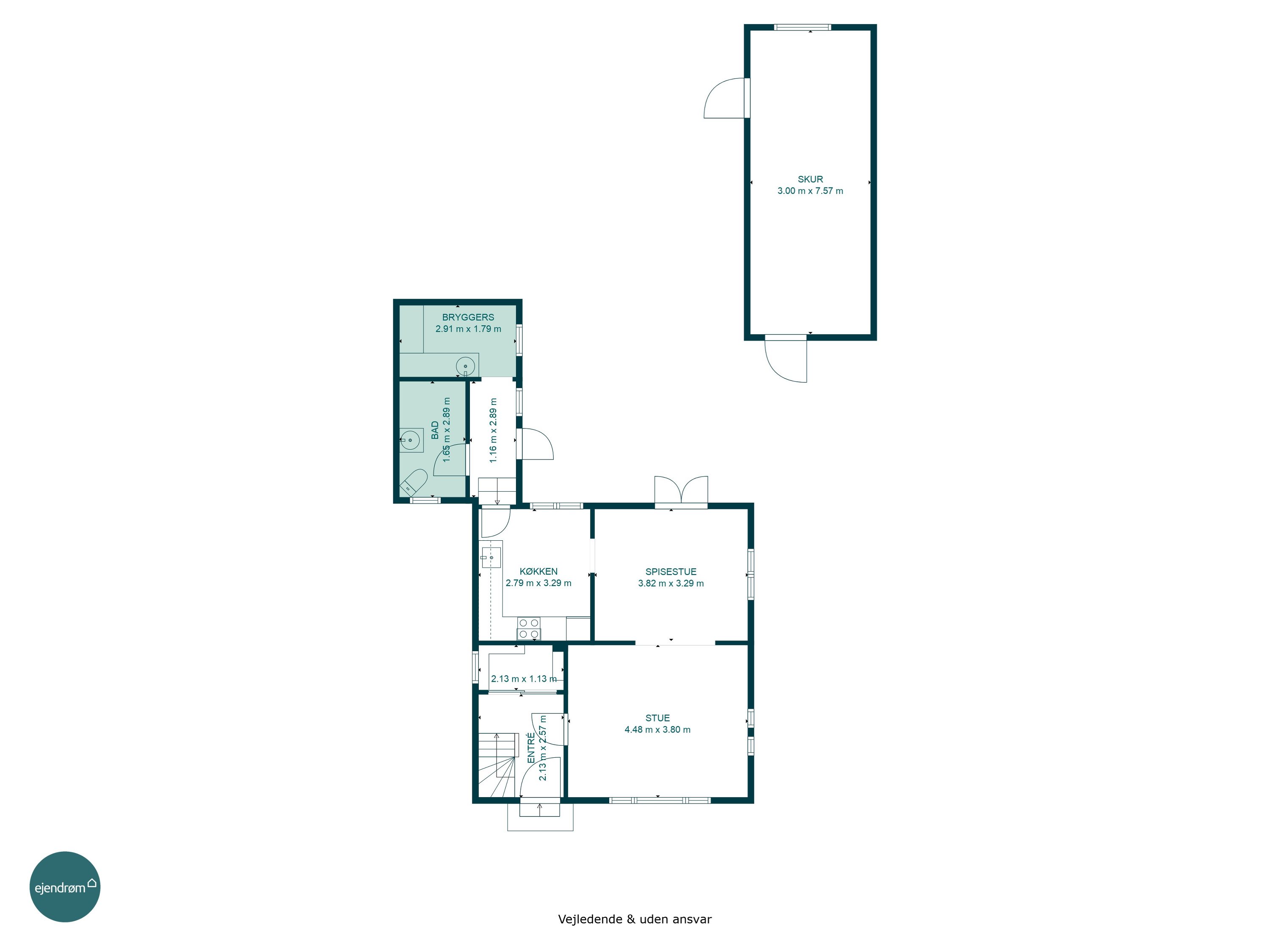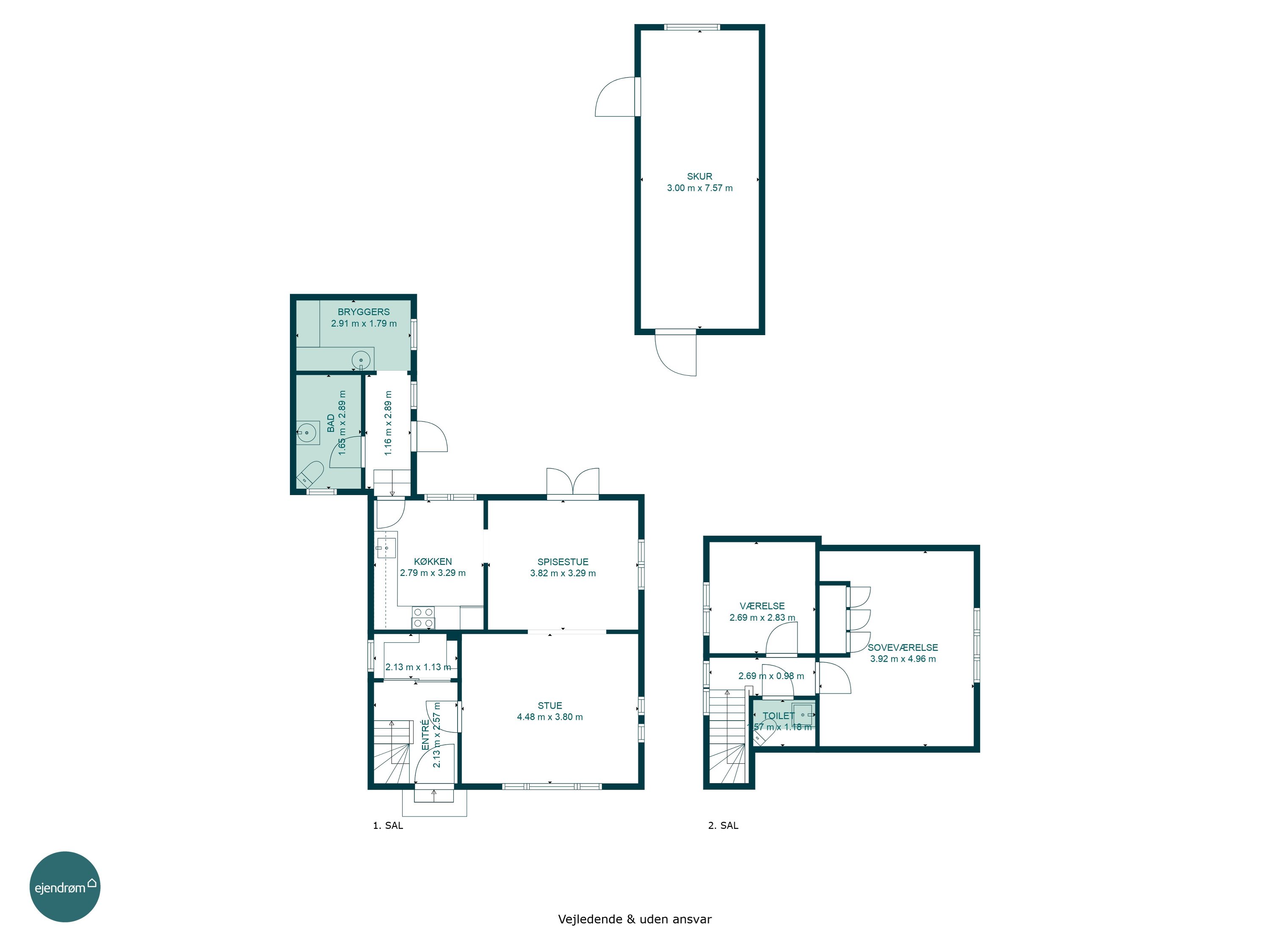Indretningen byder på: indbydende entré. Herfra finder du villaens badeværelse med bruseniche samt et praktisk bryggers. Videre er det lyse og funktionelle køkken i åben forbindelse hermed er en spisestue samt en hyggelig stue med et godt lysindfald. 1 salen byder på et soveværelse, et værelse samt et lyst toilet.
