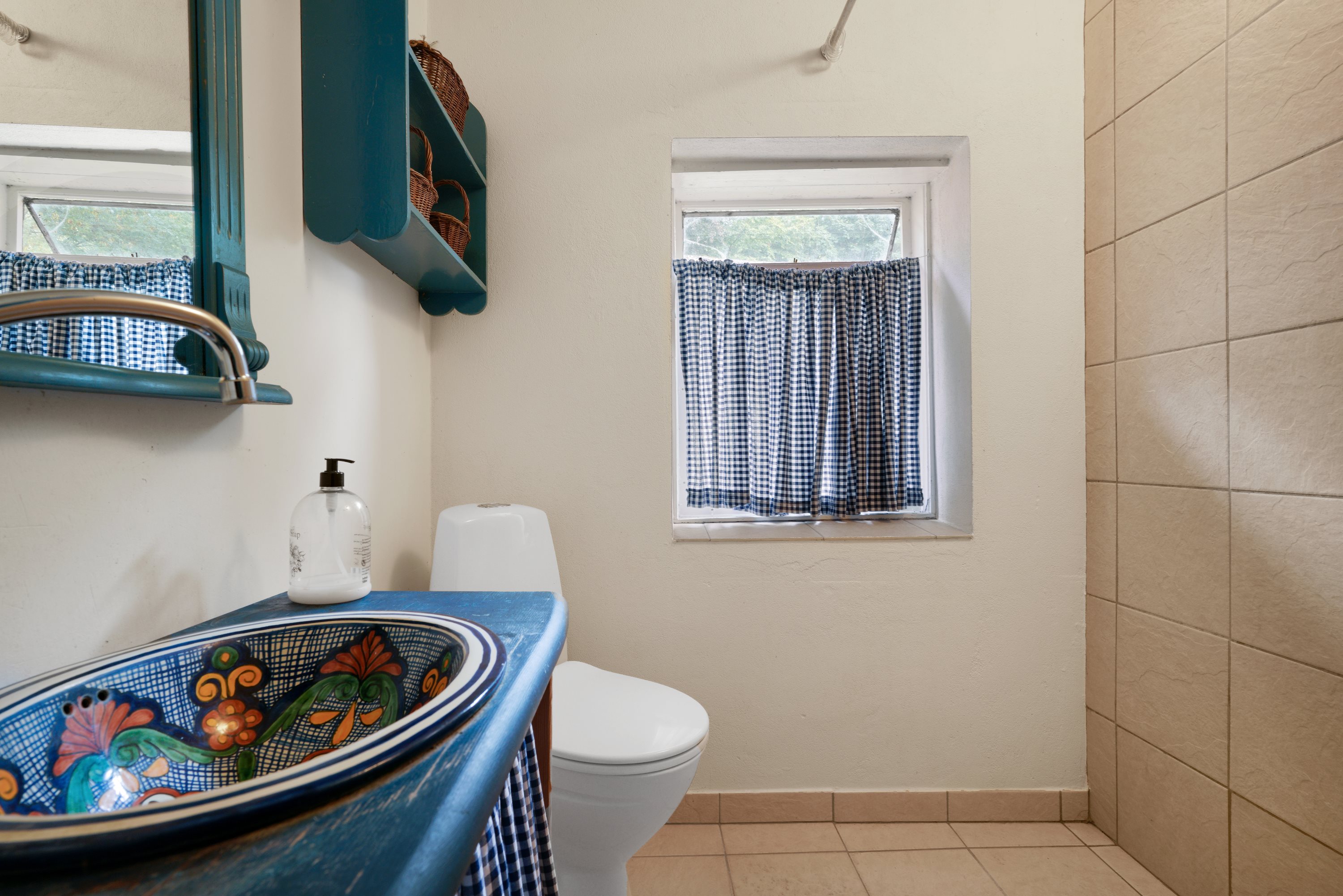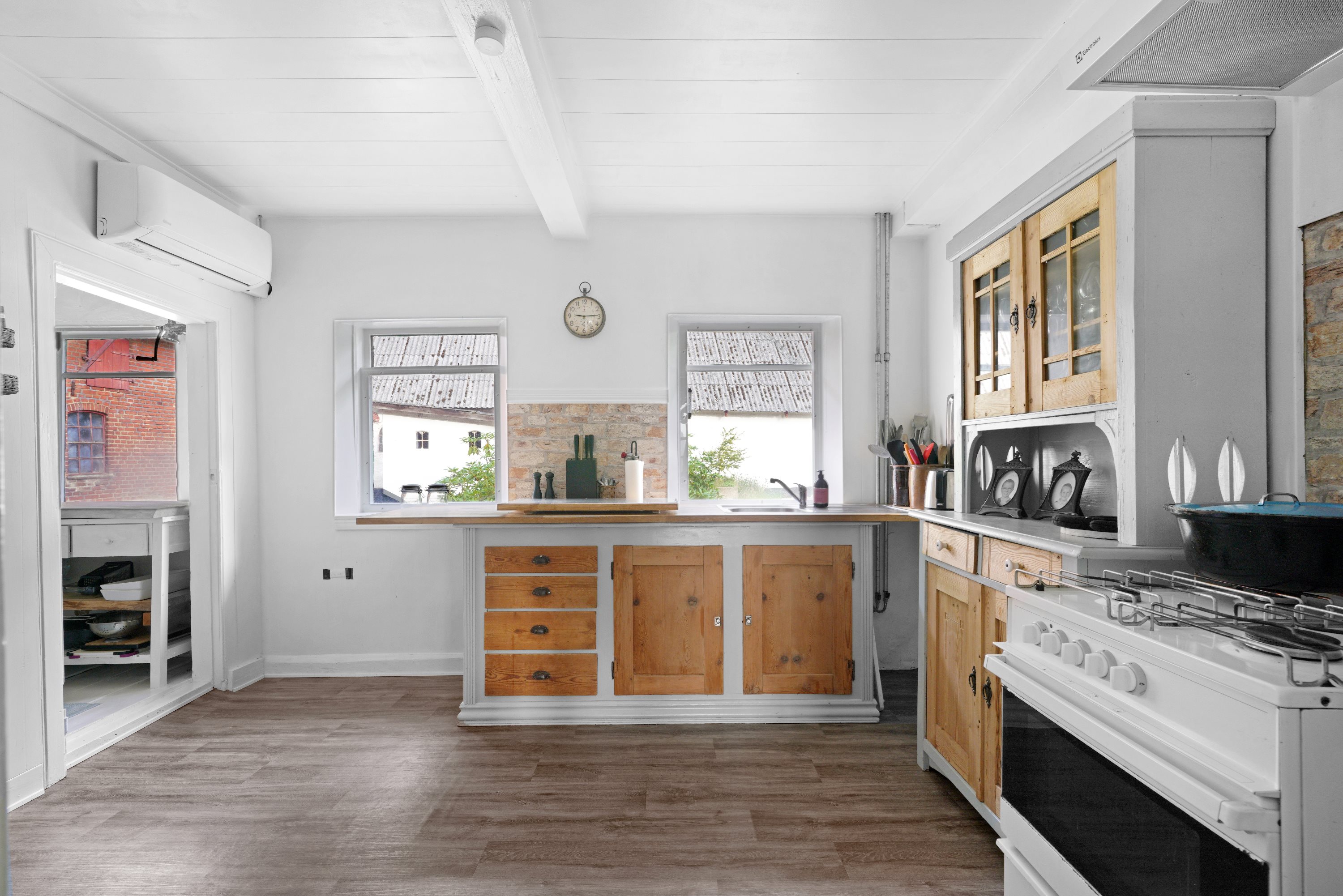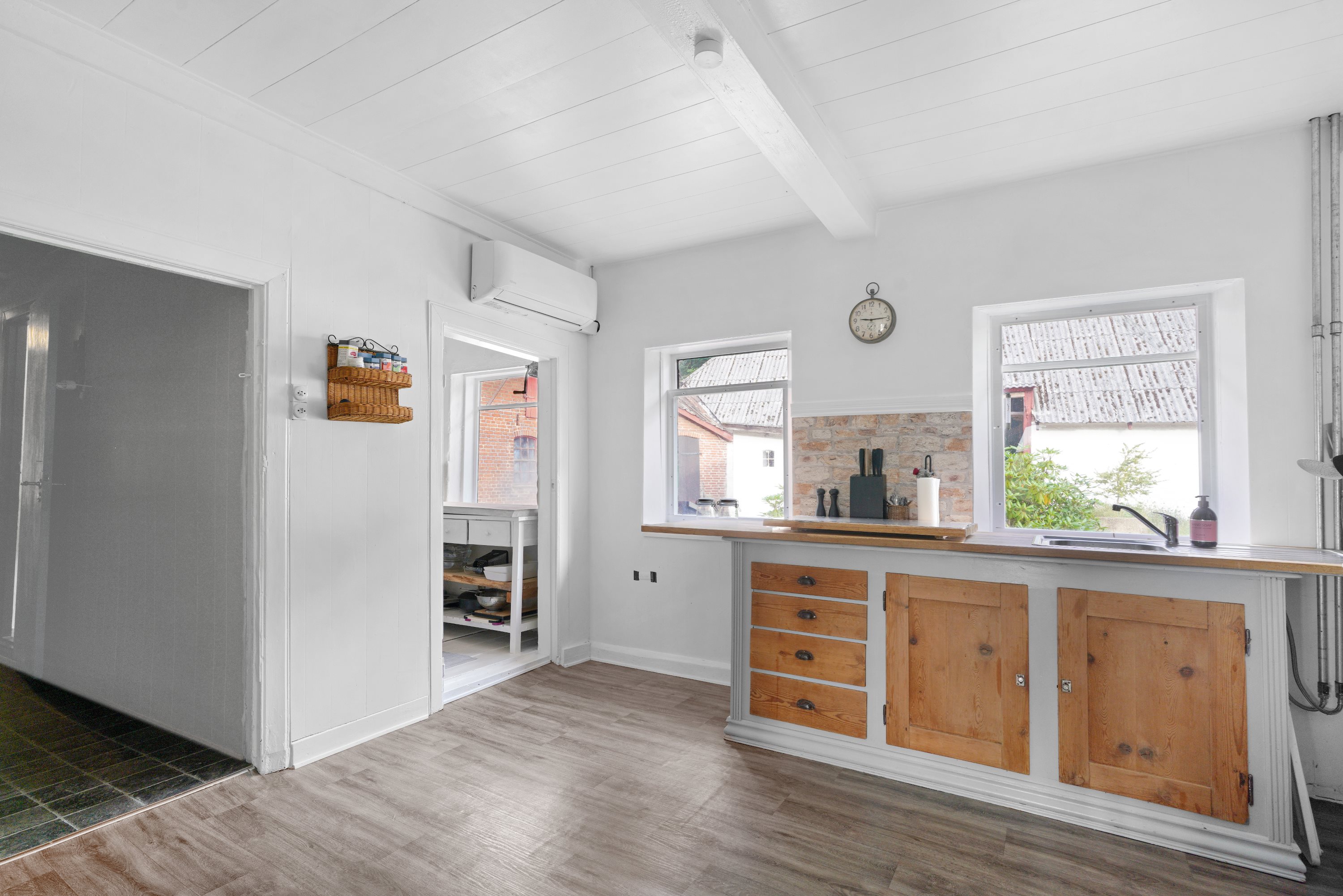Huset selv emmer af landlig charme. Indretningen byder på: Praktisk bryggers med udgang til disponibel rum og badeværelse. Videre er køkken med spisekammer. I åbent forbindelse hermed er to hyggelige stuer med udsigt til den charmende have.