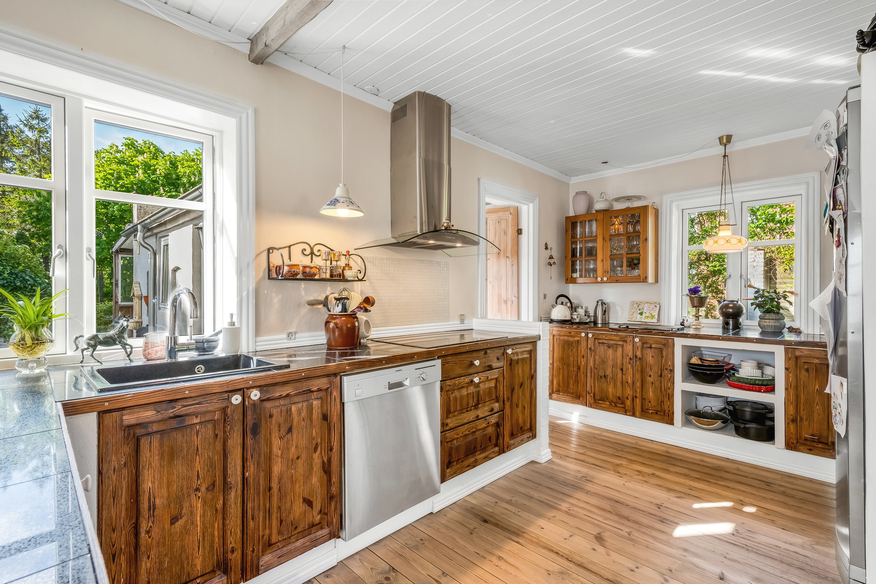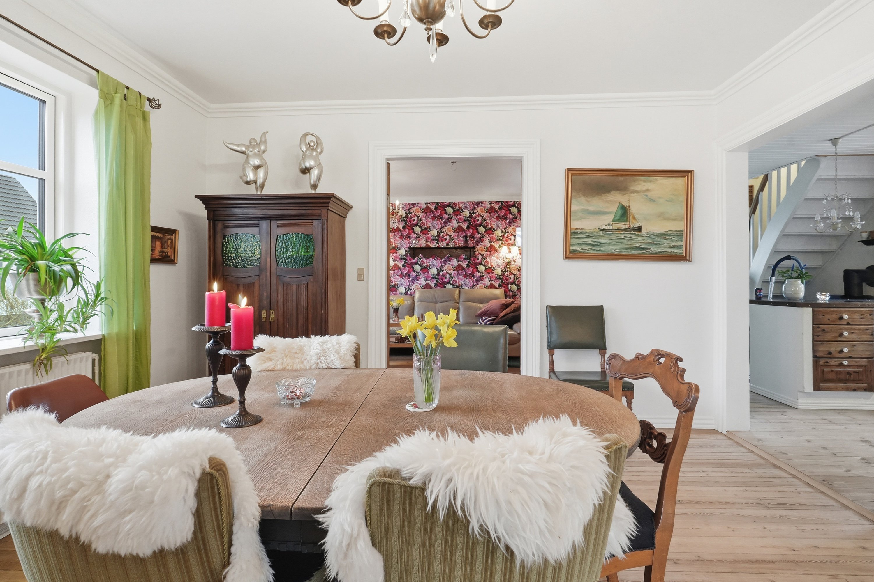 I stueplan finder du to gode værelser, som kan bruges som børneværelser, kontor eller hobbyrum. Husets naturlige samlingspunkt er det charmerende køkken, som ligger i delvis åben forbindelse med spisestuen og den tilhørende tv-stue. Rumfordelingen skaber en dejlig sammenhæng og et flot lysindfald, der giver boligen en varm og indbydende atmosfære. Her er plads til både hverdagsliv og gæster omkring bordet.